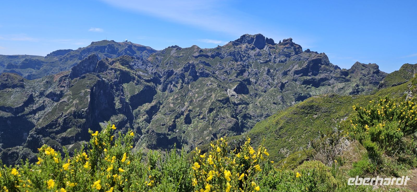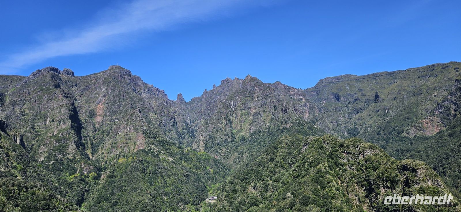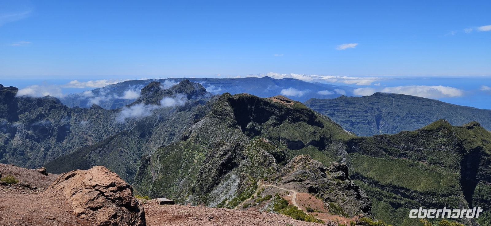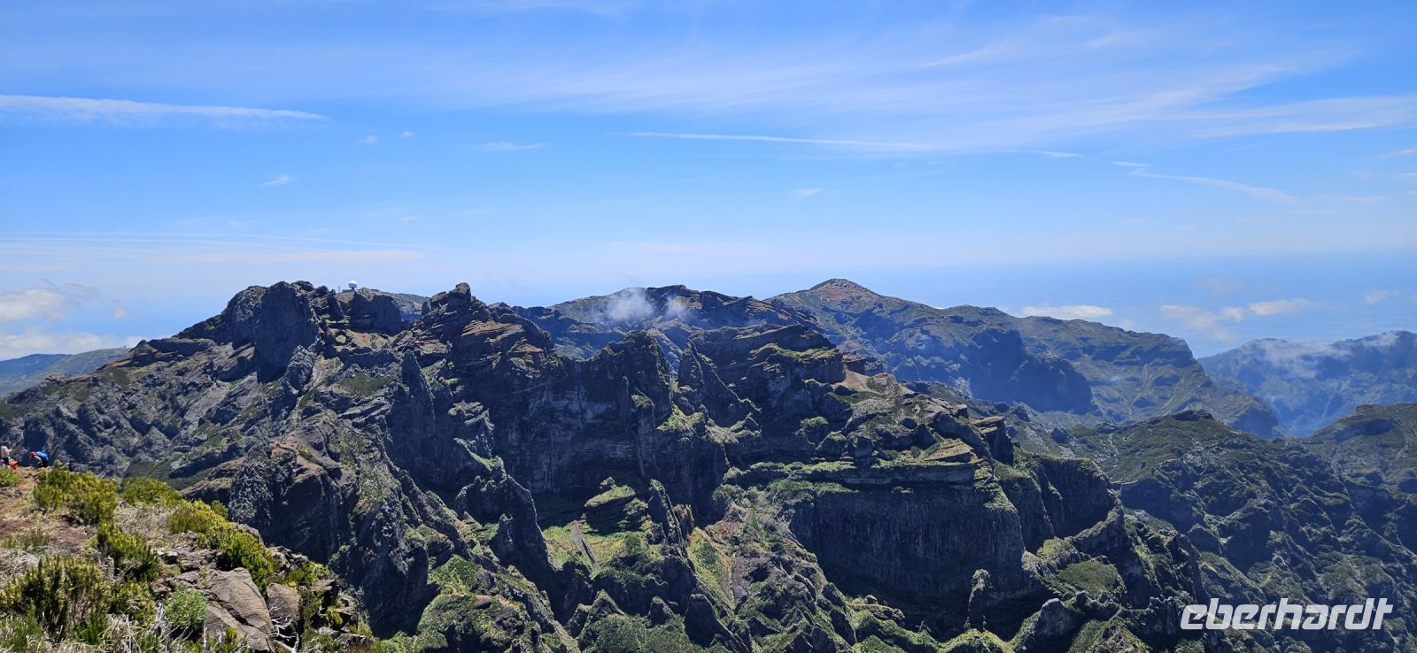 Nach dem Frühstück trafen wir wieder Berthold und unseren Fahrer Umberto. Wir fuhren über Monte hinauf zum Poiso Pass und dann weiter zu unserem ersten Ziel, dem Pico do Arieiro. Leider kamen wir nicht weit, die Strasse war völlig zugeparkt und überfüllt und so versuchte Umberto zu wenden. Das allein war schon ein Meisterwerk. Schliesslich waren wir wieder am Poiso Pass und fuhren nun talwärts nach Ribeira Frio. Dort gab es eine Forellenzucht, Souvenir Geschäfte, Restaurants usw. Wir nutzten nur die Toiletten und begannen danach unsere Wanderung auf der Levada Furada nach Balcoes - einem Aussichtsbalkon mit Blick auf die Nordküste und den Hauptkamm mit den höchsten Gipfeln Madeiras. Zurück nahmen wir den Weg ins benachbarte Tal und dort gab es in einer Bar zur Begrüßung einen Poncha und das traditionelle Knoblauchbrot Bolo do Caco. Auf der Weiterfahrt nach Santana war wieder Stau wegen einer Baustelle und so fuhren wir gleich hinauf zum Parkplatz an der Achada do Teixeira auf 1592 m Höhe. Unser Fahrer fand kaum einen Parkplatz wegen der vielen parkenden Mietwagen und da ahnten wir schon, dass wir auf dem Weg zum Pico Ruivo - dem höchsten Berg der Insel mit 1861 m Höhe - nicht allein sein würden. Wir wanderten auf einem gut ausgebauten Weg immer bergan und hatten einen fantastischen Blick hinüber zum Pico do Arieiro und zum Pico das Torres. Immer wieder mussten wir den entgegen kommenden Wanderern ausweichen und das kostete Zeit. An der Pico Ruivo Hütte auf 1800 m Höhe stärkten wir uns erst einmal und das letzte Stück hinauf zum Gipfel gingen nur noch einige wenige Singles. Der Blick vom Gipfel des Pico Ruivo war atemberaubend und reichte von der Hochebene Paul de Serra, zum Pico Grande, ins Nonnental, zu den Gipfeln von Pico das Torres und Pico do Arieiro und hinunter an die Nordküste nach Santana und Sao Jorge. Wieder zurück an der Achada gönnten wir uns noch einen Kaffee und dann fuhren wir hinunter nach Santana, um die traditionellen Schilf gedeckten Häuschen zu besuchen. Auf unserer aussichtsreichen Fahrt immer entlang der Nordküste legten wir einen Stopp in Porto da Cruz ein und besuchten die Zuckerrohr Fabrik. Die Ernte des Zuckerrohrs war in vollem Gange und so konnten wir der Verarbeitung in der Fabrik beiwohnen. Der Besuch wurde mit einem Gläschen Rum und leckeren Keksen aus Zuckerrohrmelasse abgerundet. Auf der Rückfahrt kamen wir an Machico vorbei und fuhren unter der Start- und Landebahn des Flughafens hindurch. Zum Abendessen gingen einige Singles mit mir ins nahe gelegene Restaurant Imperfeito und danach noch zu einem Spaziergang auf der Uferpromenade.