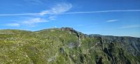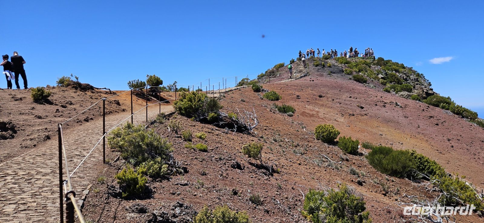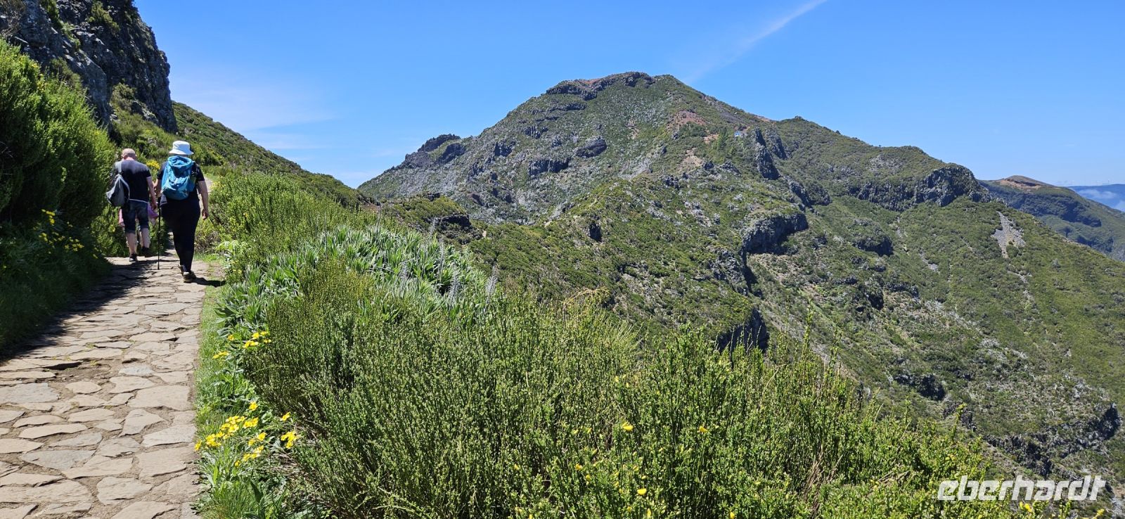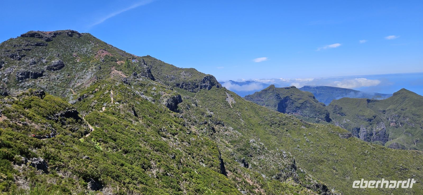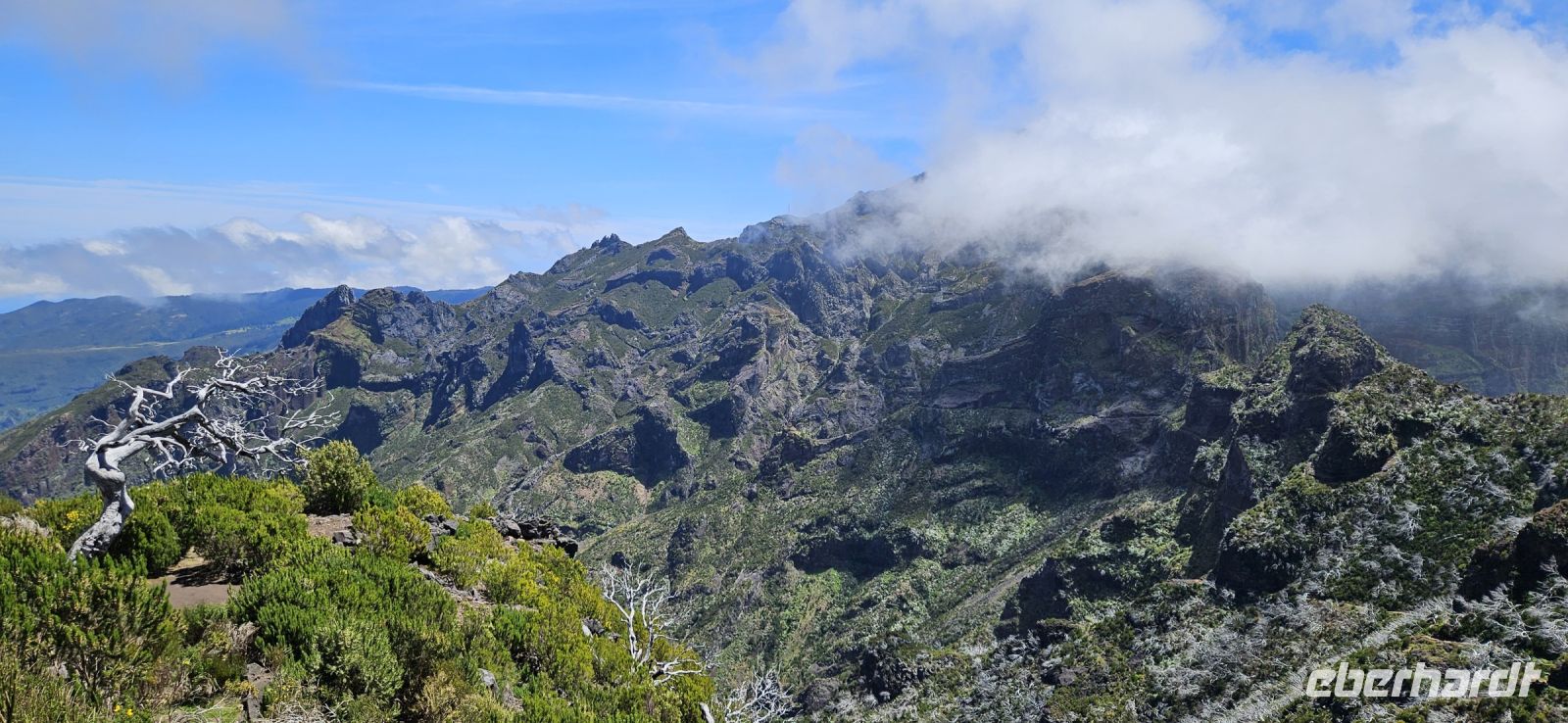Nach dem Frühstück trafen wir wieder Berthold und unseren Fahrer Umberto. Wir fuhren über Monte hinauf zum Poiso Pass und dann weiter zu unserem ersten Ziel, dem Pico do Arieiro. Leider kamen wir nicht weit, die Strasse war völlig zugeparkt und überfüllt und so versuchte Umberto zu wenden. Das allein war schon ein Meisterwerk. Schliesslich waren wir wieder am Poiso Pass und fuhren nun talwärts nach Ribeira Frio. Dort gab es eine Forellenzucht, Souvenir Geschäfte, Restaurants usw. Wir nutzten nur die Toiletten und begannen danach unsere Wanderung auf der Levada Furada nach Balcoes - einem Aussichtsbalkon mit Blick auf die Nordküste und den Hauptkamm mit den höchsten Gipfeln Madeiras. Zurück nahmen wir den Weg ins benachbarte Tal und dort gab es in einer Bar zur Begrüßung einen Poncha und das traditionelle Knoblauchbrot Bolo do Caco. Auf der Weiterfahrt nach Santana war wieder Stau wegen einer Baustelle und so fuhren wir gleich hinauf zum Parkplatz an der Achada do Teixeira auf 1592 m Höhe. Unser Fahrer fand kaum einen Parkplatz wegen der vielen parkenden Mietwagen und da ahnten wir schon, dass wir auf dem Weg zum Pico Ruivo - dem höchsten Berg der Insel mit 1861 m Höhe - nicht allein sein würden. Wir wanderten auf einem gut ausgebauten Weg immer bergan und hatten einen fantastischen Blick hinüber zum Pico do Arieiro und zum Pico das Torres. Immer wieder mussten wir den entgegen kommenden Wanderern ausweichen und das kostete Zeit. An der Pico Ruivo Hütte auf 1800 m Höhe stärkten wir uns erst einmal und das letzte Stück hinauf zum Gipfel gingen nur noch einige wenige Singles. Der Blick vom Gipfel des Pico Ruivo war atemberaubend und reichte von der Hochebene Paul de Serra, zum Pico Grande, ins Nonnental, zu den Gipfeln von Pico das Torres und Pico do Arieiro und hinunter an die Nordküste nach Santana und Sao Jorge. Wieder zurück an der Achada gönnten wir uns noch einen Kaffee und dann fuhren wir hinunter nach Santana, um die traditionellen Schilf gedeckten Häuschen zu besuchen. Auf unserer aussichtsreichen Fahrt immer entlang der Nordküste legten wir einen Stopp in Porto da Cruz ein und besuchten die Zuckerrohr Fabrik. Die Ernte des Zuckerrohrs war in vollem Gange und so konnten wir der Verarbeitung in der Fabrik beiwohnen. Der Besuch wurde mit einem Gläschen Rum und leckeren Keksen aus Zuckerrohrmelasse abgerundet. Auf der Rückfahrt kamen wir an Machico vorbei und fuhren unter der Start- und Landebahn des Flughafens hindurch. Zum Abendessen gingen einige Singles mit mir ins nahe gelegene Restaurant Imperfeito und danach noch zu einem Spaziergang auf der Uferpromenade.