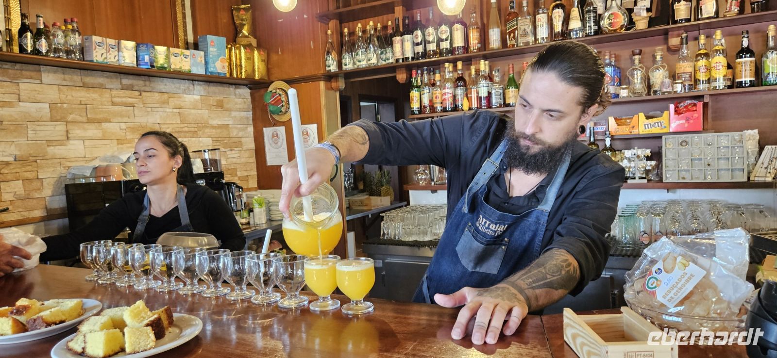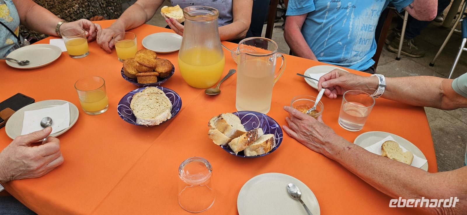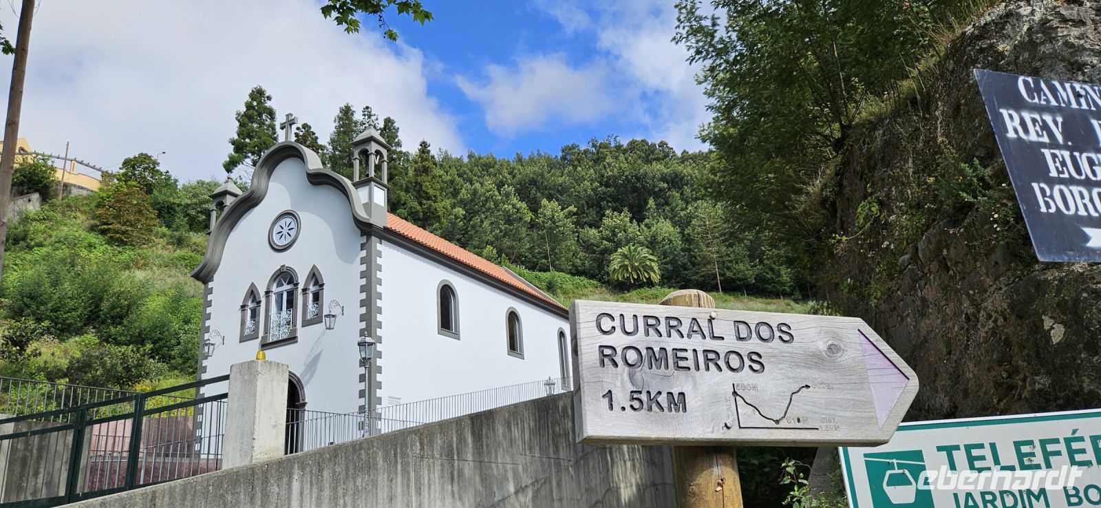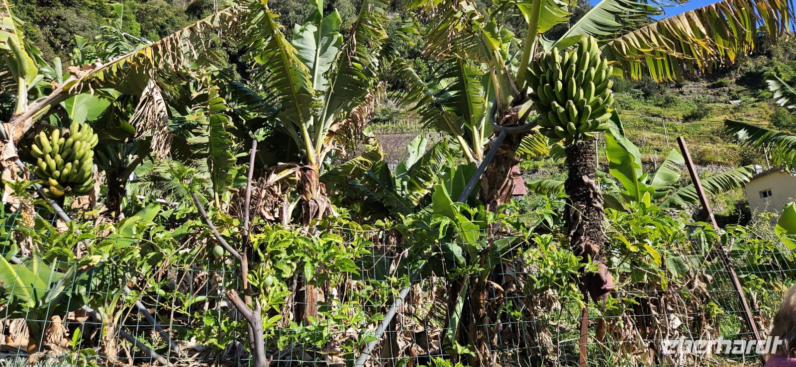 Gleich nach dem Frühstück fuhren wir mit unserem Bus hinauf nach Monte und begaben uns sogleich zum Startpunkt der Korbschlitten. Zu dritt oder zu zweit nahmen wir Platz und sausten mit den historischen Korbschlitten, gelenkt von je zwei erfahrenen Männern, die 2 km lange Strasse bergab. Bis zu 50 km/h erreichen die Korbschlitten und besonders in den Kurven machte es großen Spass. Mit dem Bus fuhren wir wieder hinauf zum Startpunkt und besuchten die Kirche Nossa Senhora do Monte mit dem Grab des letzten ösrterreichischen Kaisers. Ab dort begann unsere Wanderung zunächst hinüber zur Bergstation der Seilbahn und dann weiter auf einem alten Pilgerweg nach Curral dos Romeiros. Der Weg ging zunächst bergab, über eine Brücke und am gegenüberliegenden Hang wieder steil bergan. Wieder oben sahen wir hinüber nach Monte und hinunter nach Funchal. Es folgte ein Stück entlang der dicht bewachsenen Levada dos Tornes auf einem wildromantischen Weg. Riesige Eukalyptusbäume konnten wir unterwegs bestaunen. Umberto erwartete uns am Abstieg von der Levada und mit ihm fuhren wir zum Eira do Serrada, einem Aussichtspunkt über dem Nonnental. Dort machten wir unsere Mittagspause, spazierten hinauf zum Aussichtspunkt auf 1096 m Höhe und genossen die Aussicht hinunter ins Nonnental. Die hohen Gipfel ringsum waren in den Wolken und einzelne Wolkenfetzen zogen über den Pass am Eira do Serrado und boten so spektakuläre Fotomotive. Auf der Rückfahrt machten wir einen Fotostop am Pico do Barcelos und hatten von dort eine super Rundumsicht auf Funchal. Danach ging es weiter bergab zum Kräutergarten von Esmeralda. Sie erwartete uns schon und zeigte uns in ihrem Gartenreich die verschiedendsten Pflanzen und erklärte ihre Nutzung. Dabei gab es Überrraschendes z.B. beim Lippenstiftbaum zu erfahren. Zum Abschluss ließen wir uns selbst gebackenes Brot mit Chilligelee und verschiedene Säfte und Limonade schmecken. Für das Abendessen wählten wir wieder das Real Canoa, mussten diesmal aber drin sitzen, weil wir nicht reserviert hatten.