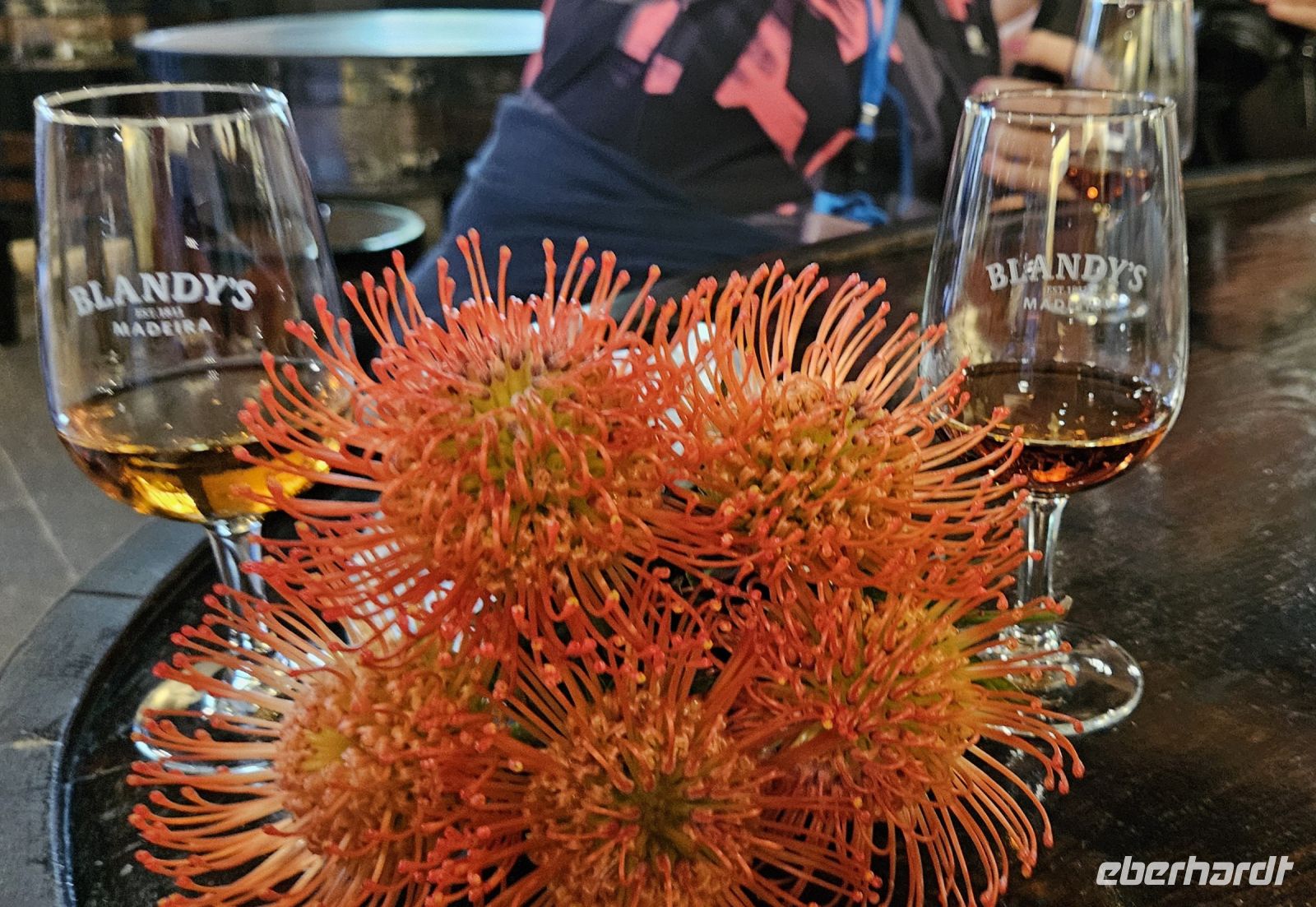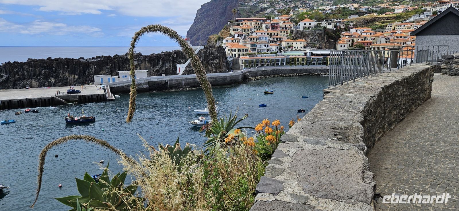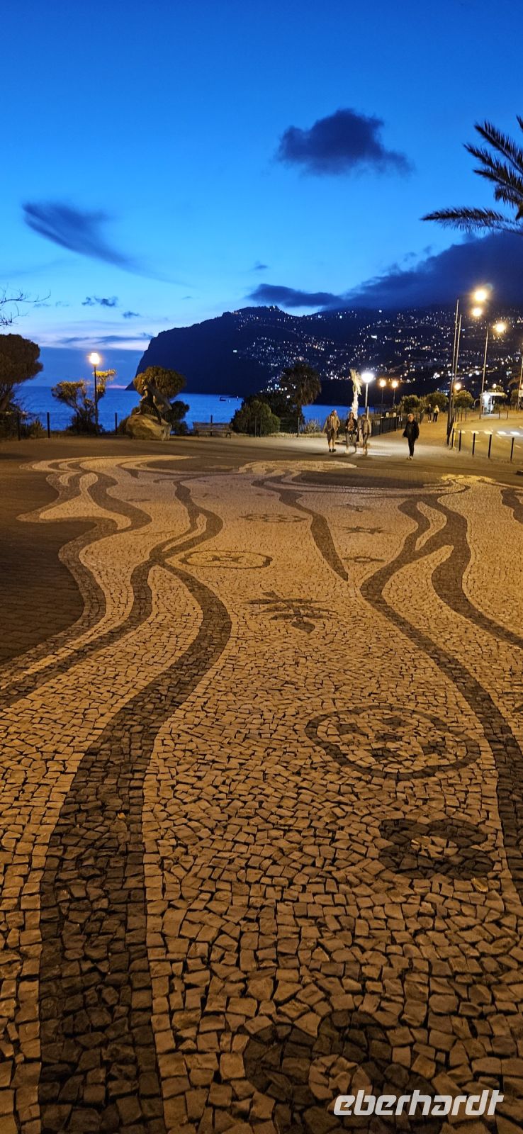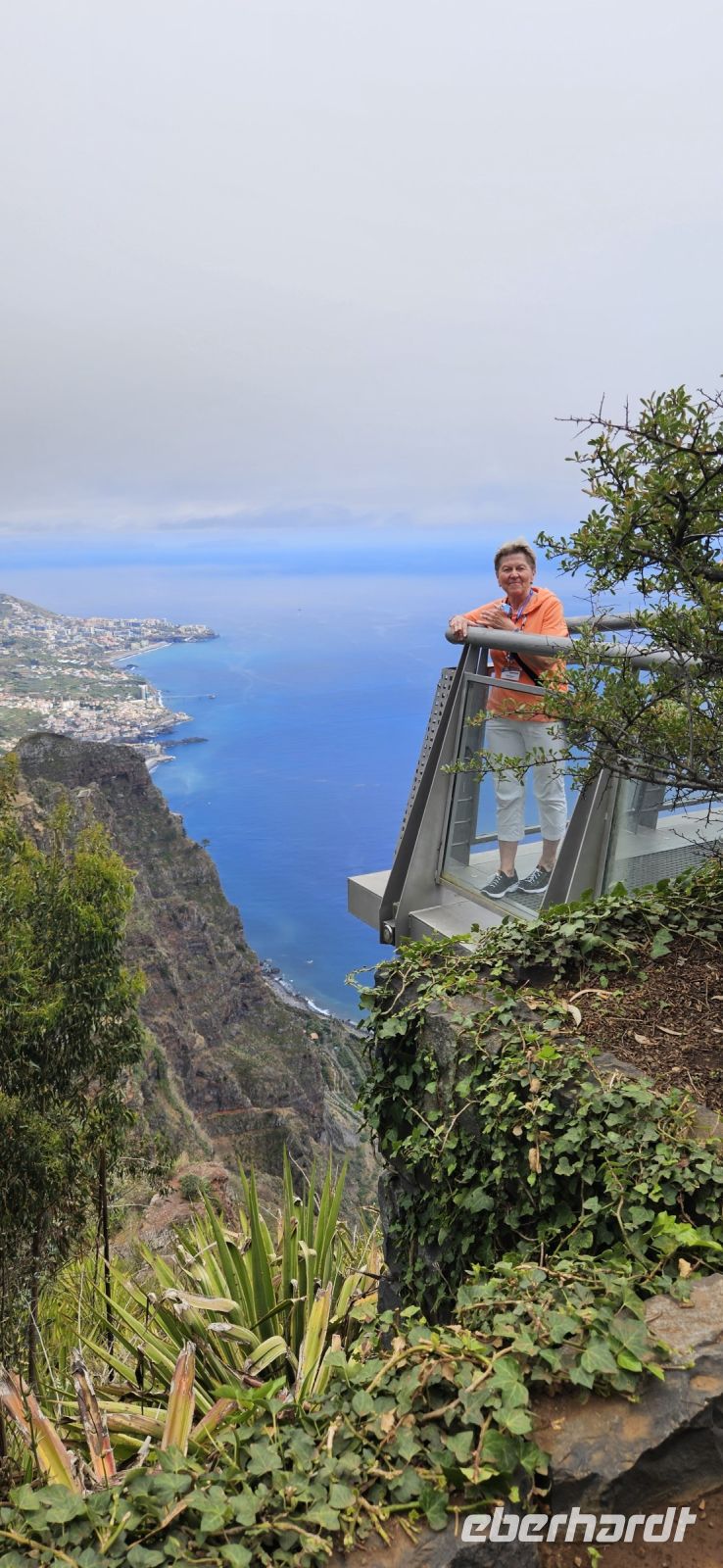Heute waren wir mit Audio Geräten unterwegs in der Hauptstadt Funchal. Wir begannen mit dem Besuch der Markthalle. Am Freitag kamen zu den üblichen Ständen noch die der Bauern aus der Umgebung hinzu. So war der ganze Innenhof der Markthalle mit frischem Gemüse und Früchten gefüllt und ich ergatterte von einem Bauern einen Strauss mit Nadelkissenproteen. In der Fischhalle bestaunten wir den schwarzen Degenfisch mit seinen großen Augen und scharfen Zänen und Berthold ging mit uns von Stand zu Stand und erzählte welch leckere Gerichte aus den einzelnen Fischen zu zaubern sind. Danach gingen wir zu Fuss durch das Stadtzentrum, besuchten die Kathedrale Se, das Denkmal von Zarco und bestaunten die Blumenteppiche auf den Strassen. In Blandy´s Weinlodge probierten wir einen süssen und einen trockenen 5 Jahre alten Madeira Wein und anschliessend besichtigten wir die Weinlager. Durch den kleinen Park daneben gingen wir zurück zum Bus und der brachte uns hinauf zum Botanischen Garten der Stadt Funchal. Berthold zeigte uns die wichtigsten Pflanzen und Bäume und zum Schluss auch den Nutzgarten des Botanischen Gartens. Er berichtete über die Verwendung der einzelnen Pflanzen und Früchte und schliesslich stibitzten wir die leckeren Früchte vom Pitangueira Baum. Im Cafe auf der Terrasse machten wir eine verspätete Mittagspause und stärkten uns für das weitere Programm. Mit unserem Bus fuhren wir zum Ende der Hotelzone in Funchal und ab da spazierten wir auf der Uferpromenade nach Camara de Lobos, weiter durch das pittoreske Fischerdorf mit dem Besuch von 2 Kirchen. Am anderen Ende wartete schon Umberto und mit ihm fuhren wir hinauf zum Cabo Girao, mit 580 m Höhe die steilste und höchste Klippe Europas. Von der neuen Glasplattform kann man gut hinunter zu den Feldern am Meer schauen und der Blick Richtung Funchal war super und darüber lag eine geschlossene Wolkendecke wie ein Deckel. Sehr imposante Fotos entstanden dadurch. Wieder zurück im Hotel beschlossen wir zum Abendessen das Restaurant Real Canoa zu testen. Und das erwies sich als absoluter Glücksgriff. Zur Begrüßung gab es einen Madeira Wein, wir konnten aus einer abwechslungsreichen Speisekarte auswählen und die Chefin empfahl uns einen wohlschmeckenden Vino Verde zum Essen. Dazu gab es Live Musik und das Essen schmeckte vorzüglich..