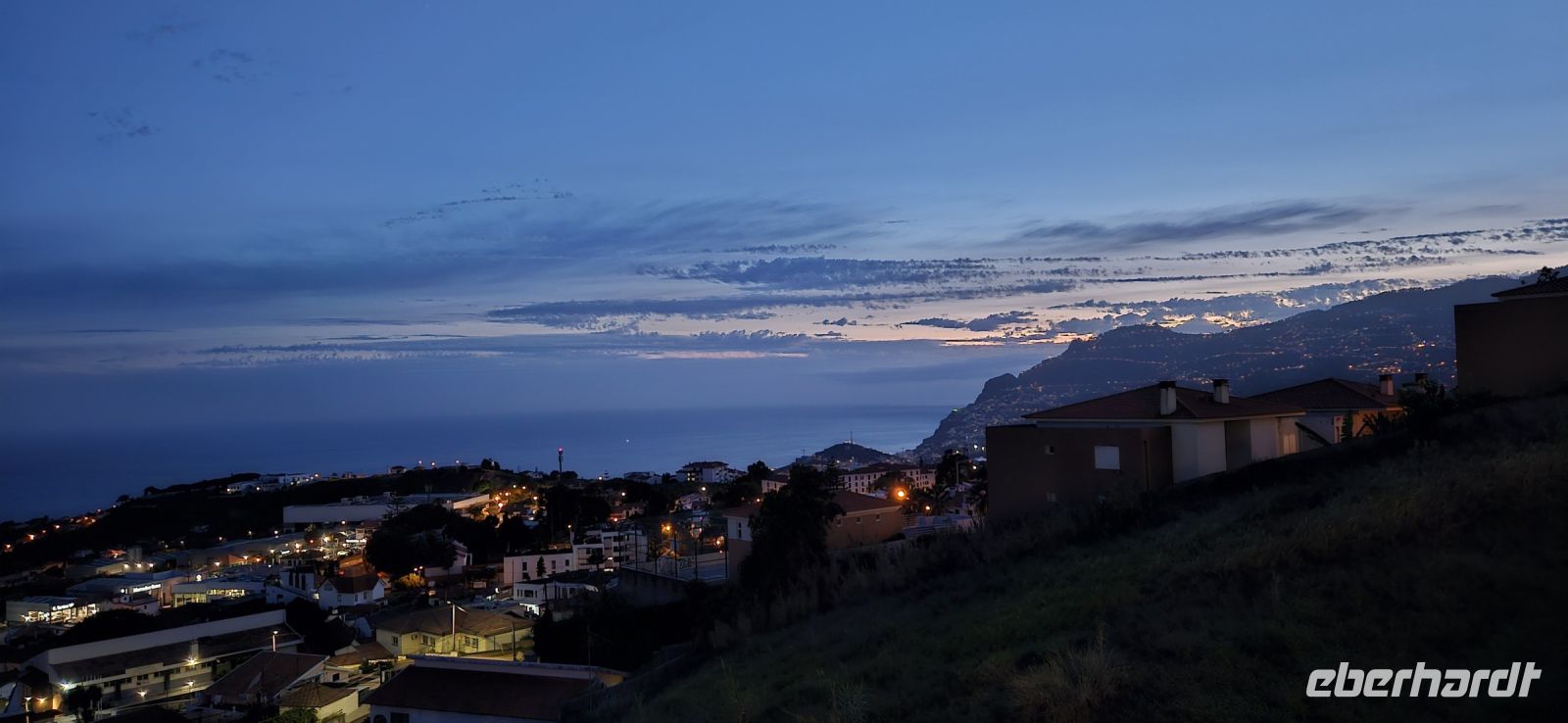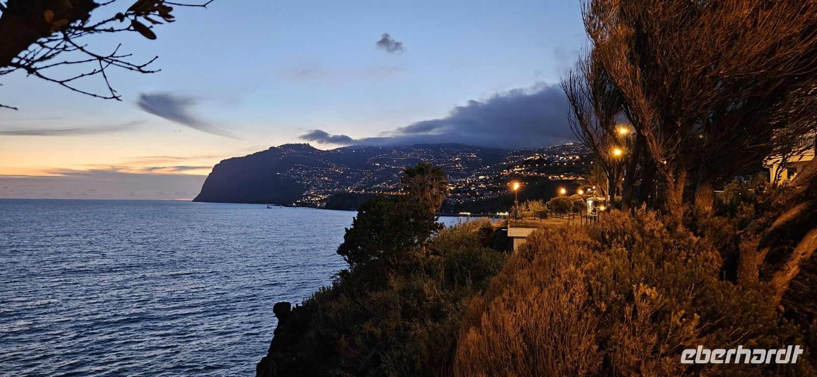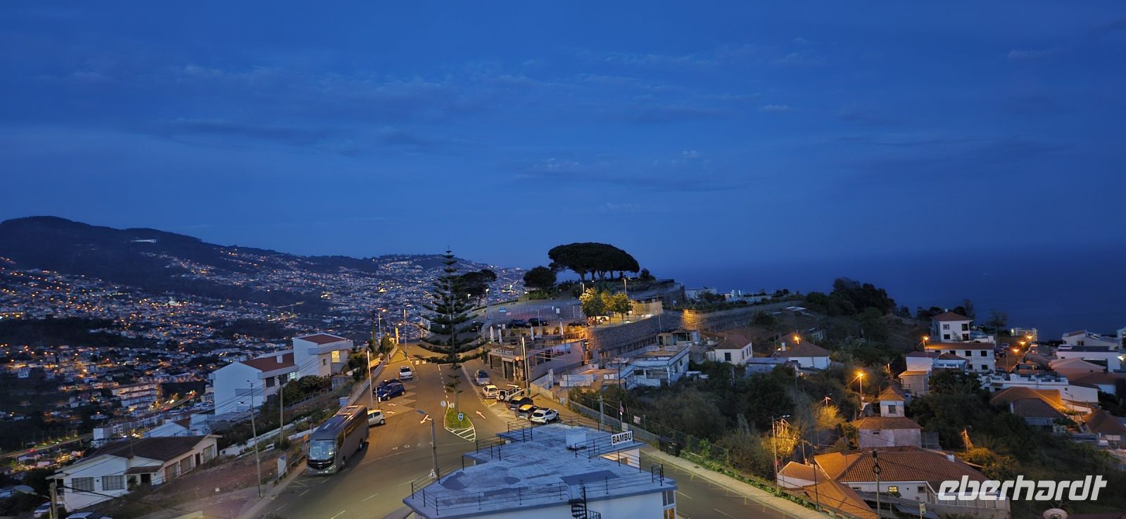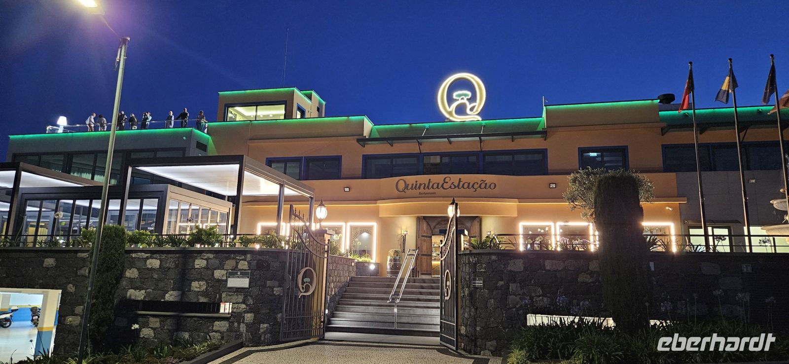 Am Abend stand das Espetata Essen auf dem Programm und dazu brachte uns ein Bus vom Hotel zur Quinta Estacao nahe dem Pico do Barcelos Aussichtspunkt. Die Quinta Estacao ist in einer ehemaligen Radiostation eingerichtet und dort hat man sich auf die Zubereitung der für Madeira so typischen Fleischspiesse spezialisiert. Schon draussen wurden wir mit einem Gläschen Madeira Wein empfangen und drinnen hatten wir einen Tisch mit Blick in die große, offene Küche und zur Feuerstelle, wo die Rindffleischspiesse gegrillt wurden. Mit einem sensationell gut schmeckenden Knoblauchbrot - von dem wir uns hätten den ganzen Abend ernähren können - begann das Menue. Es folgte eine Tomatensuppe und danach der Fleischspiess. Zum Nachtisch gab es einen Maracuja Pudding und einen Kaffee. Nach dem reichlichen Essen konnten wir den Ausblick von der Dachterrasse geniessen und Funchal bei Nacht fotografieren.