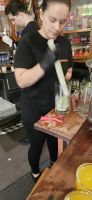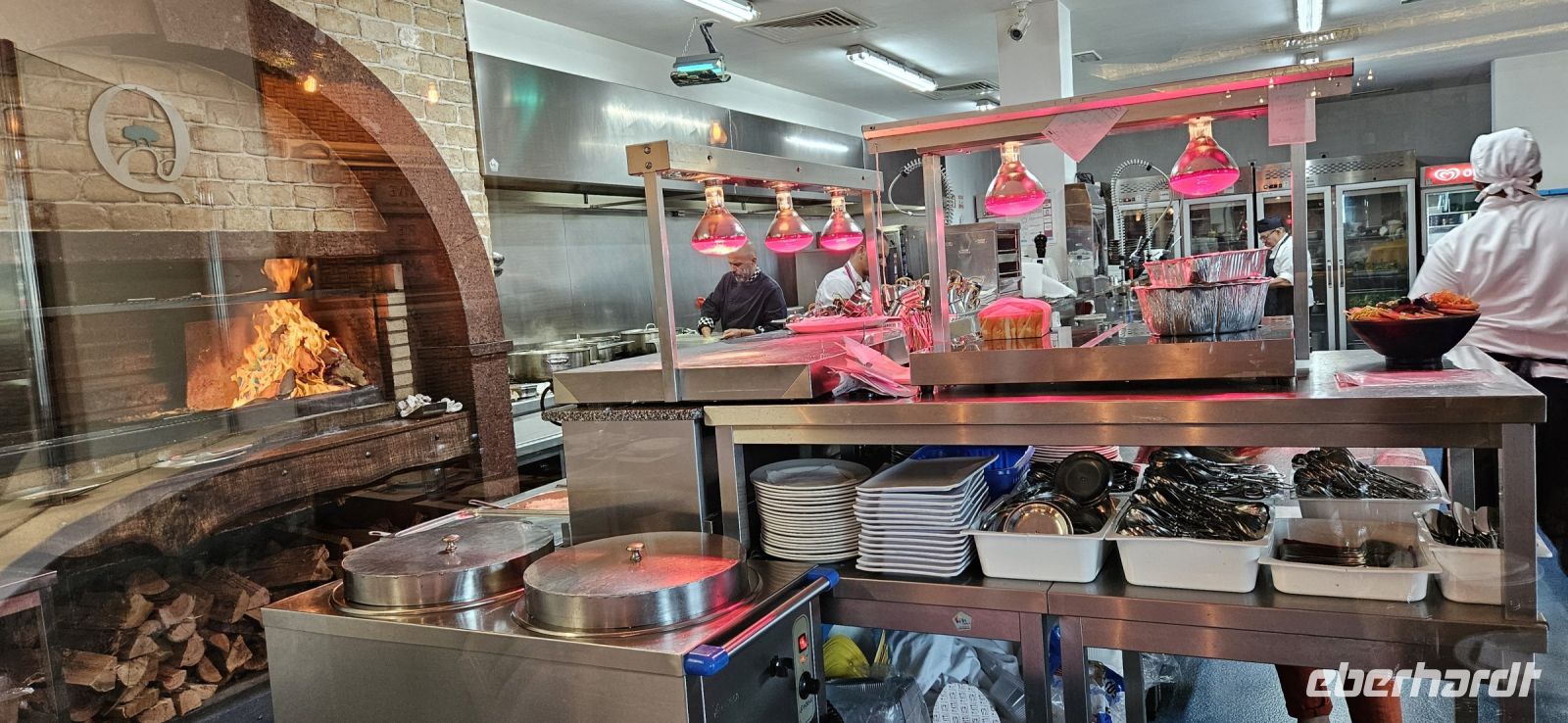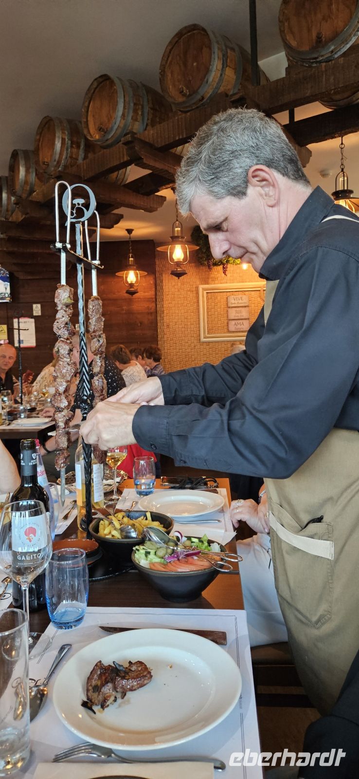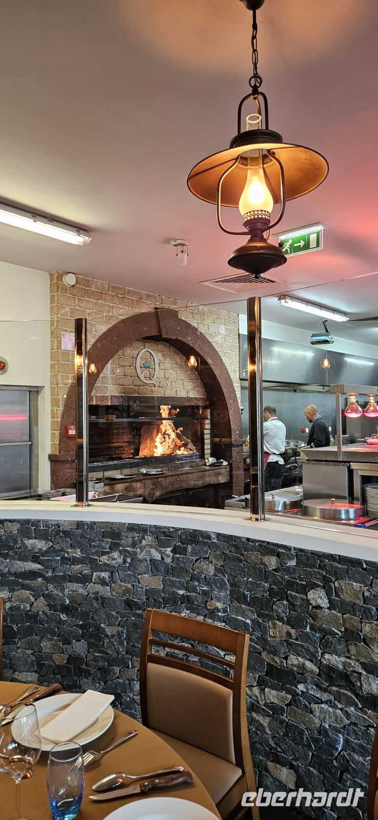 Am Abend stand das Espetata Essen auf dem Programm und dazu brachte uns ein Bus vom Hotel zur Quinta Estacao nahe dem Pico do Barcelos Aussichtspunkt. Die Quinta Estacao ist in einer ehemaligen Radiostation eingerichtet und dort hat man sich auf die Zubereitung der für Madeira so typischen Fleischspiesse spezialisiert. Schon draussen wurden wir mit einem Gläschen Madeira Wein empfangen und drinnen hatten wir einen Tisch mit Blick in die große, offene Küche und zur Feuerstelle, wo die Rindffleischspiesse gegrillt wurden. Mit einem sensationell gut schmeckenden Knoblauchbrot - von dem wir uns hätten den ganzen Abend ernähren können - begann das Menue. Es folgte eine Tomatensuppe und danach der Fleischspiess. Zum Nachtisch gab es einen Maracuja Pudding und einen Kaffee. Nach dem reichlichen Essen konnten wir den Ausblick von der Dachterrasse geniessen und Funchal bei Nacht fotografieren.