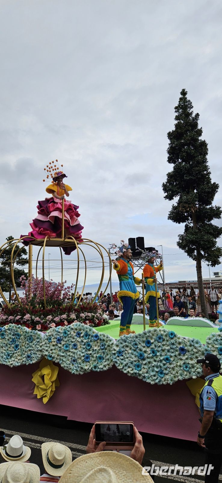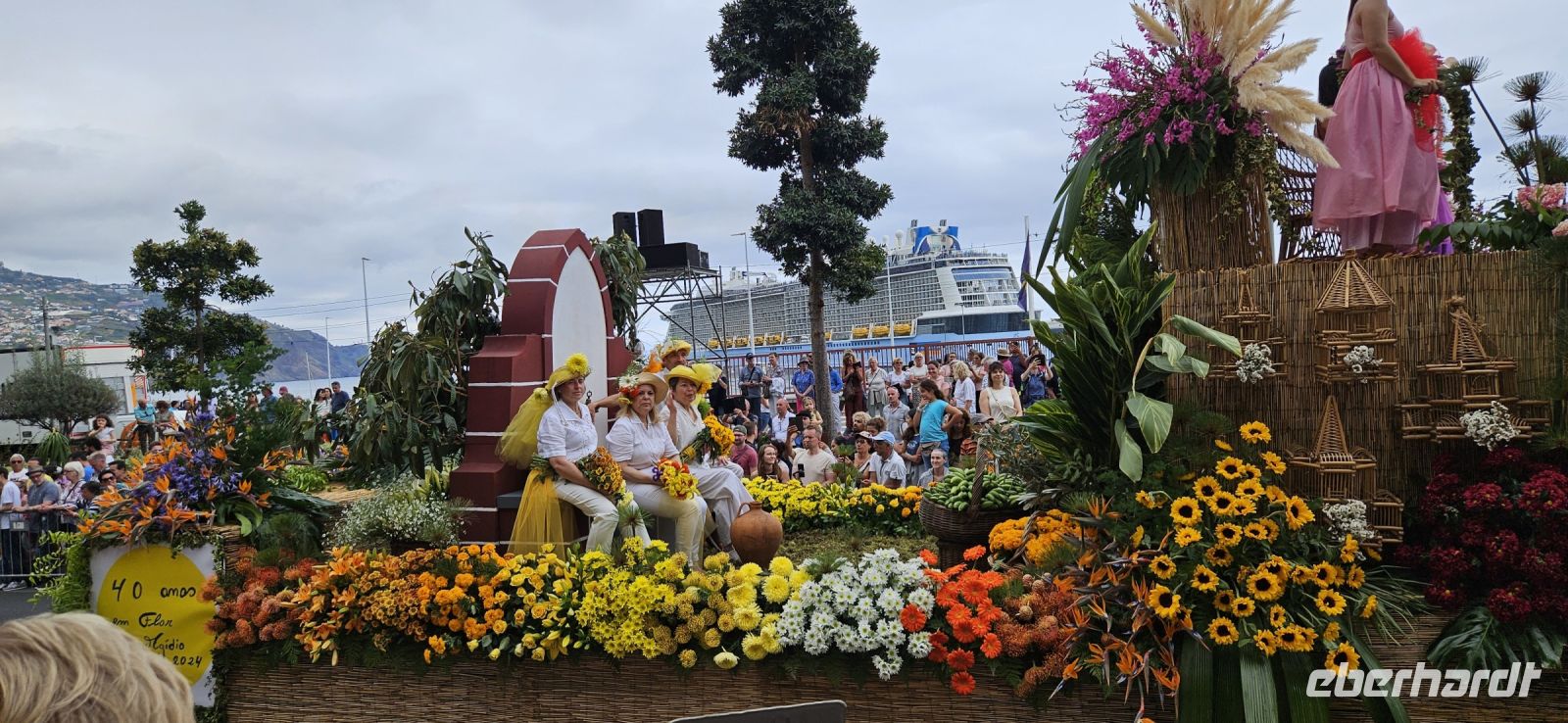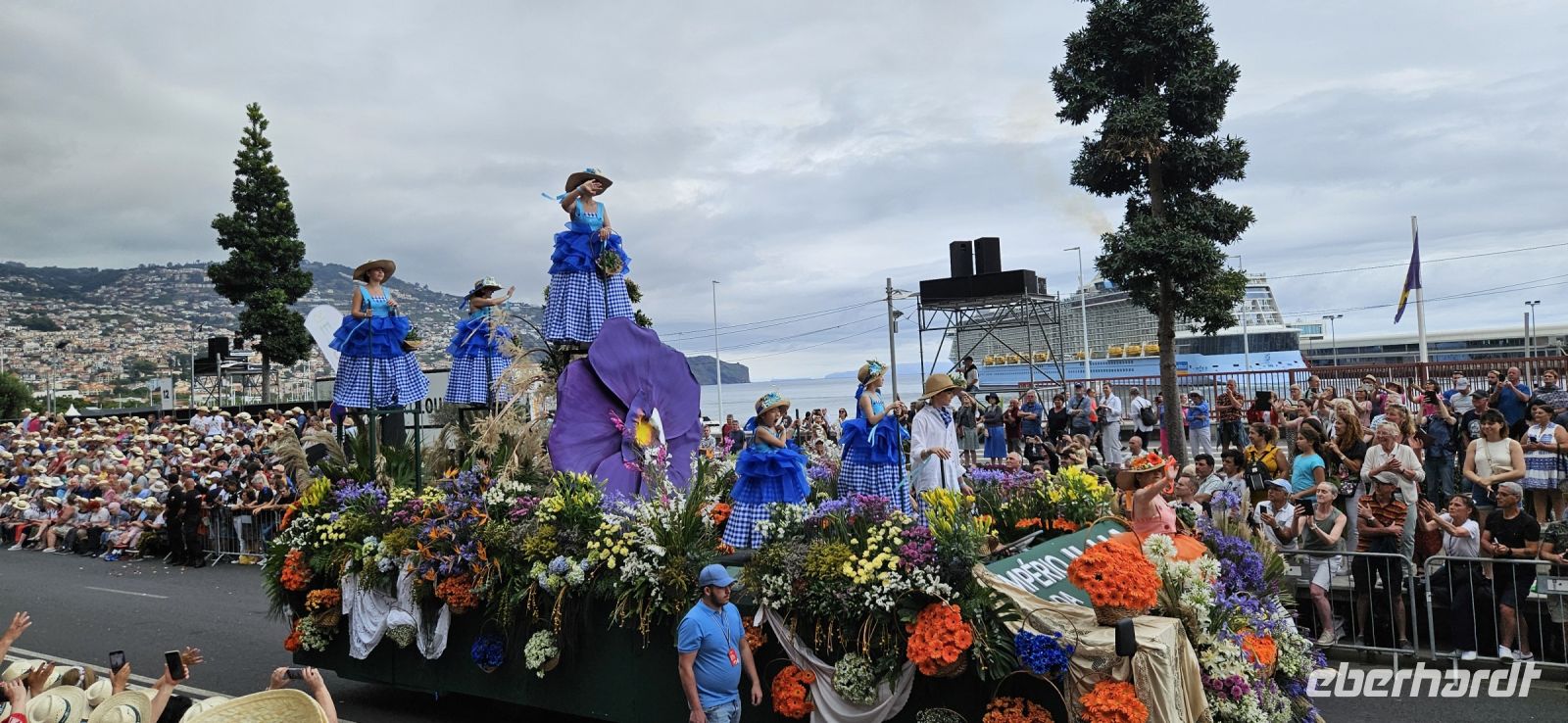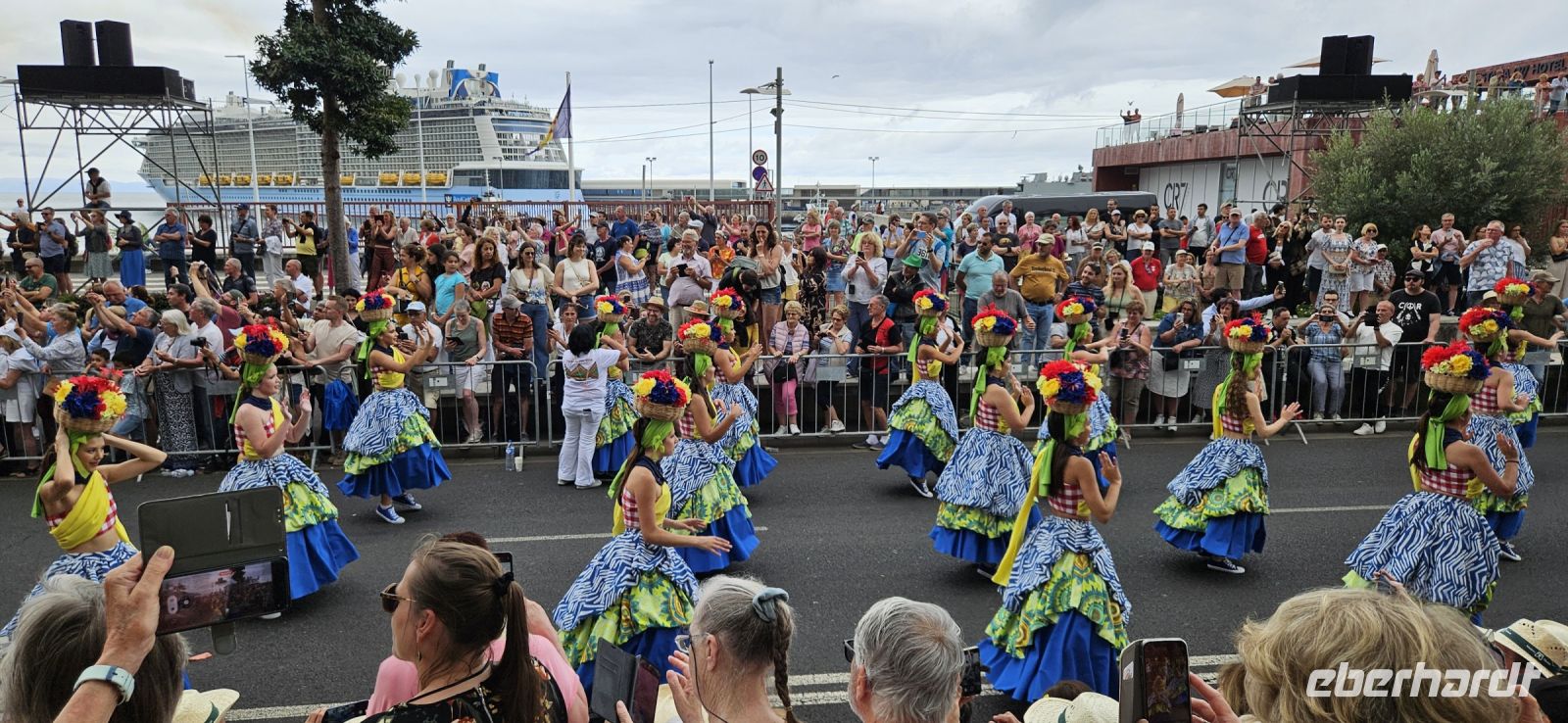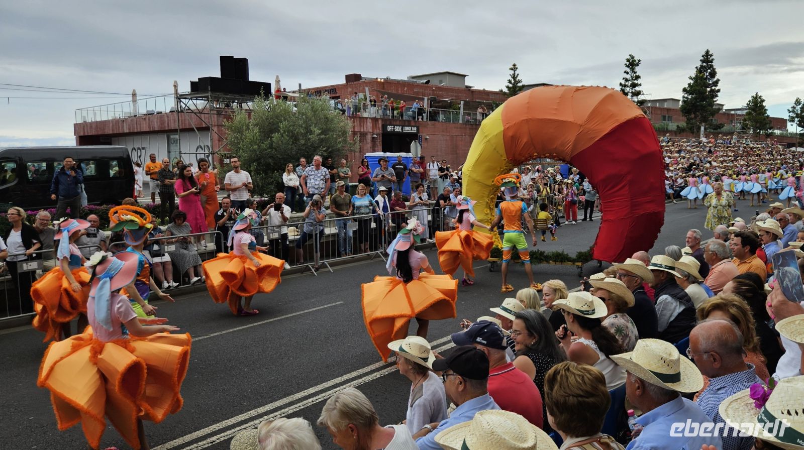 Die Levada Wanderung war fakultativ, aber der Großteil unserer Gruppe beteiligte sich. Wir wanderten bei herrlichem Sonnenschein immer am Wasserkanal entlang, sahen viele Pflanzen ganz aus der Nähe und Berthold erzählte viel über das Leben auf dem Lande und die Bearbeitung der kleinen Flächen. Unterwegs gab es immer mal frische Früchte mit einer Kasse des Vertrauens. Zum Ende der Wanderung führte der Weg durch einen Wald aus Mimosenakazien. An einer Bar endete die Wanderung und von dort ging es steil bergab bis zu unserem Bus. Am Nachmittag fuhren wir zusammen mit den Teilnehmern der Rundreisegruppe von Eberhardt Travel ins Stadtzentrum von Funchal. Dort war schon alles für den großen Festumzug vorbereitet und wir spazierten zunächst am Meer entlang in Richtung Seilbahn, wo sich der Festumzug formierte. Untwerwegs gönnten wir uns ein Eis und machten mit 2 jungen Teilnehmern am Festumzug ein Fotos. Gemütlich gingen wir zurück zu unserer Tribüne 16 und nahmen unsere Plätze ein. Es gab für jeden einen Strohhut und eine Flasche Wasser und dann hiess es Warten, Warten...Gegen 17 Uhr erreichte der Festumzug unsere Tribüne und er dauerte bis 19.30 Uhr. Wunderschön geschmückte Festwagen und 15 Tanzformationen, die ihre Choreographie immer wieder darboten, zogen an uns vorbei. Es war ein unvergesslicher Augen- und Ohrenschmaus und am Ende waren auch wie ganz schön ausgepowert vom Klatschen, Jubeln und Winken. Wir verliessen ganz gemütlich unsere Tribüne und begaben uns in Richtung SANTA Maria Viertel zum Abendessen im Restaurant Cidade Velha. Dort hatte man für unsere Gruppe einen großen Tisch im Freien hergerichtet und nun konnten wir unser Abendessen mit Knoblauchbrot, Gemüsesuppe, Espada mit Banane und Maracuja Sose sowie zum Nachtisch einen Maracuja Käsekuchen und einen Cafe geniessen. Über dem Meer ging die Sonne unter und für uns ein erlebnisreicher Tag zu Ende. Carlos erwartete uns schon und brachte uns mit dem Bus zurück ins Hotel.