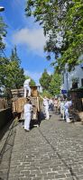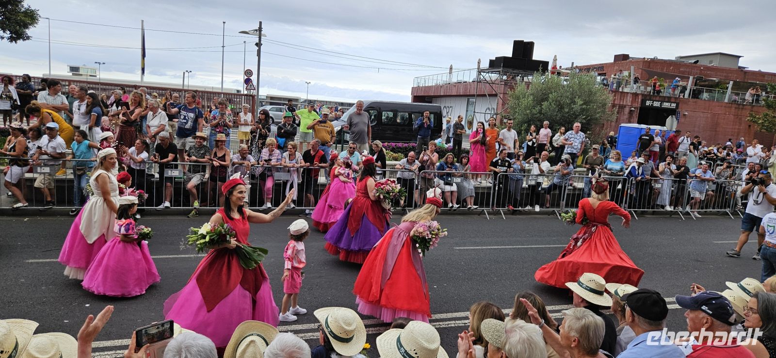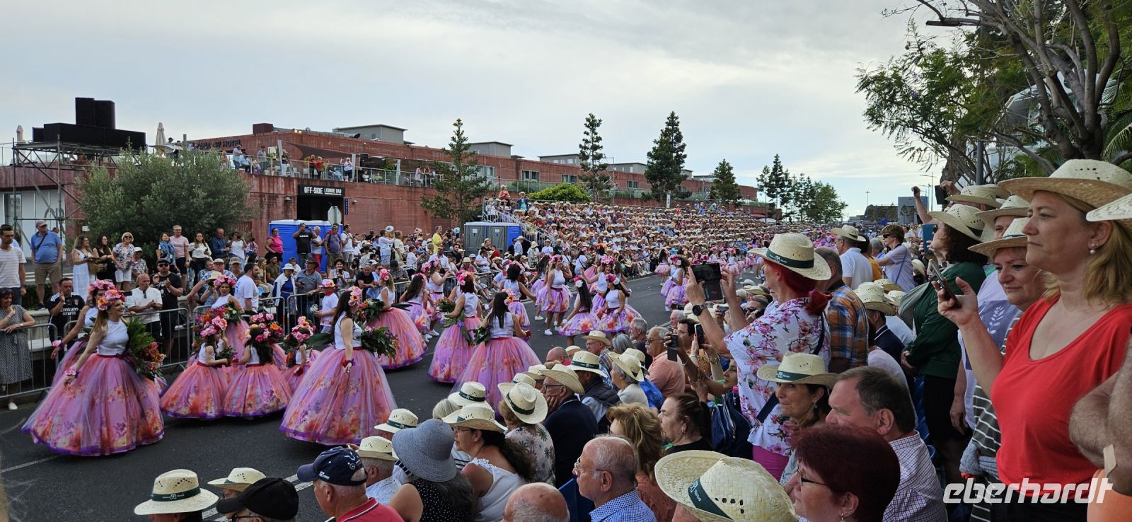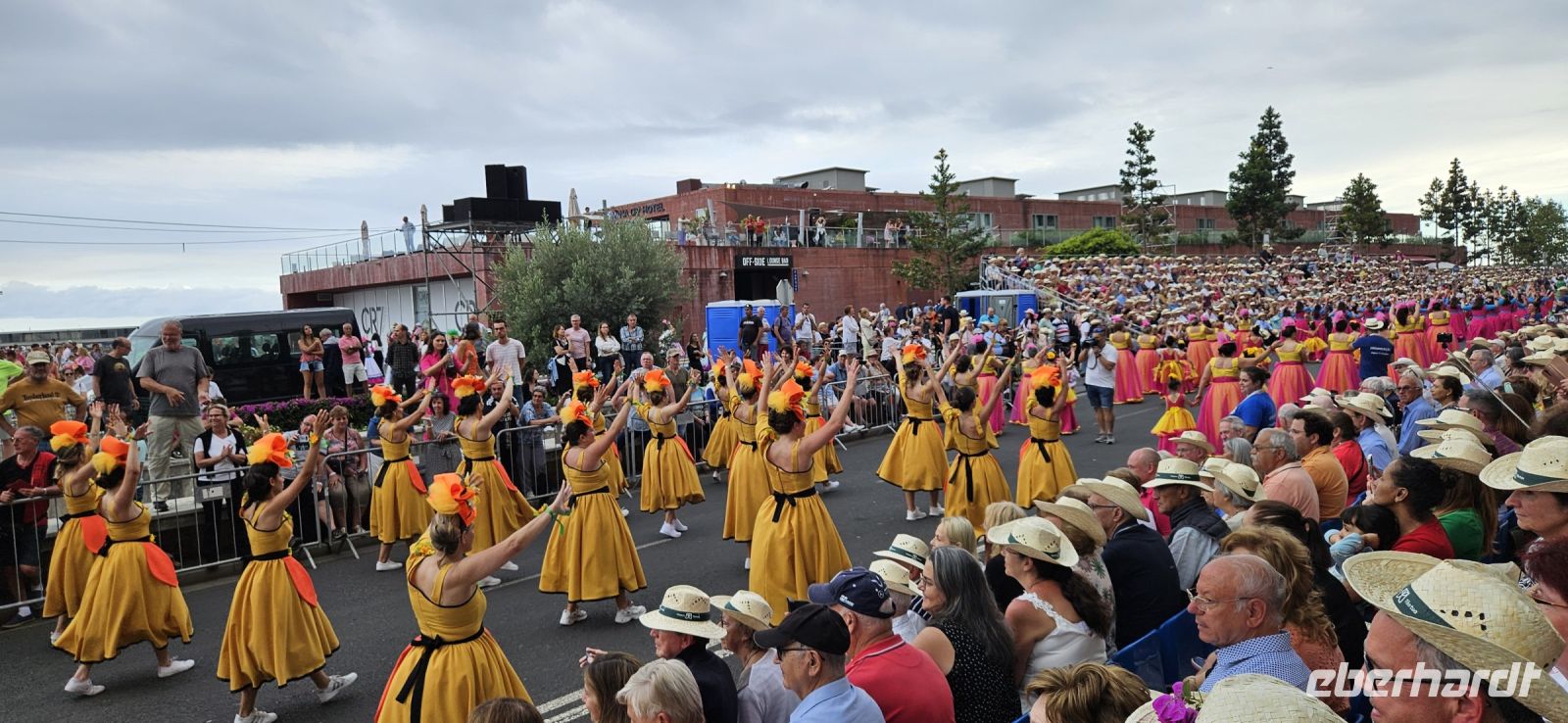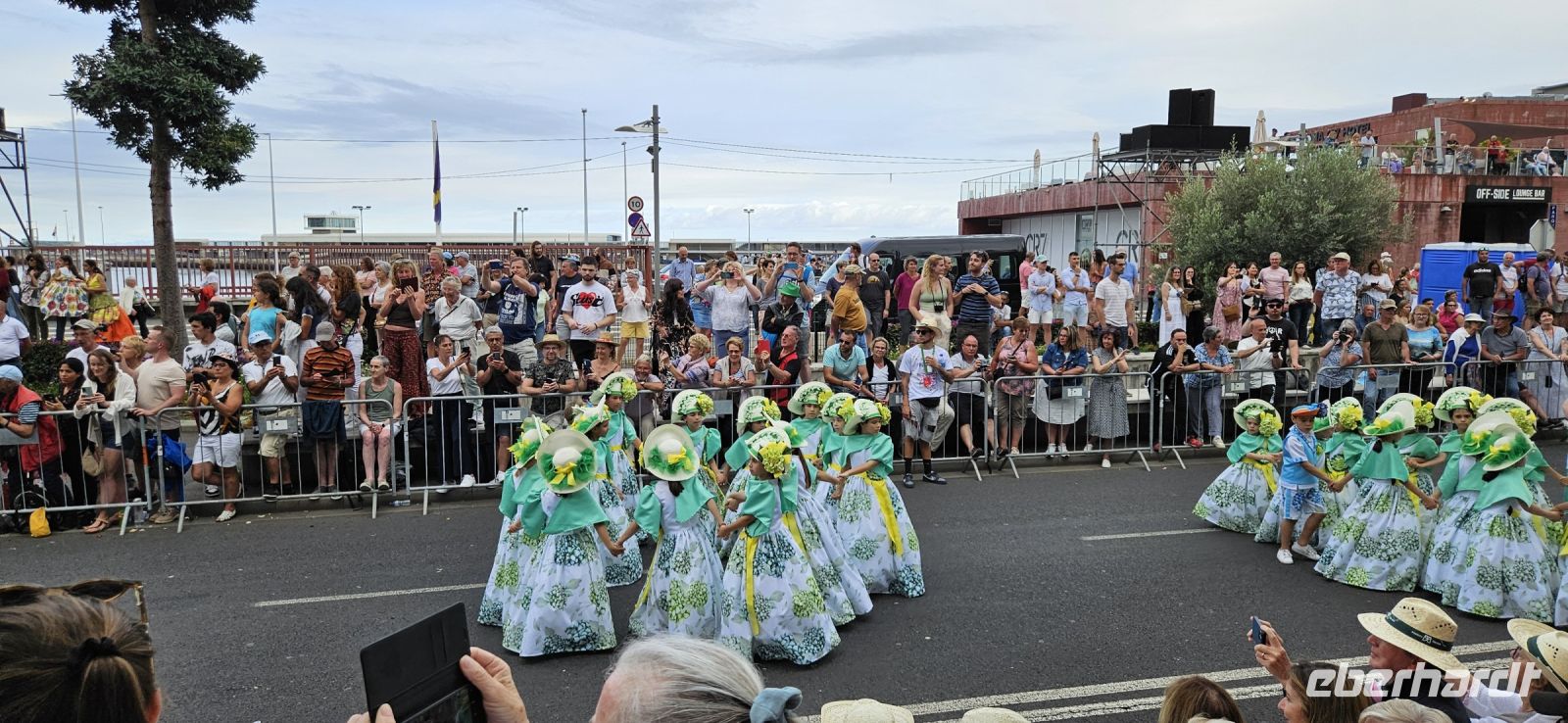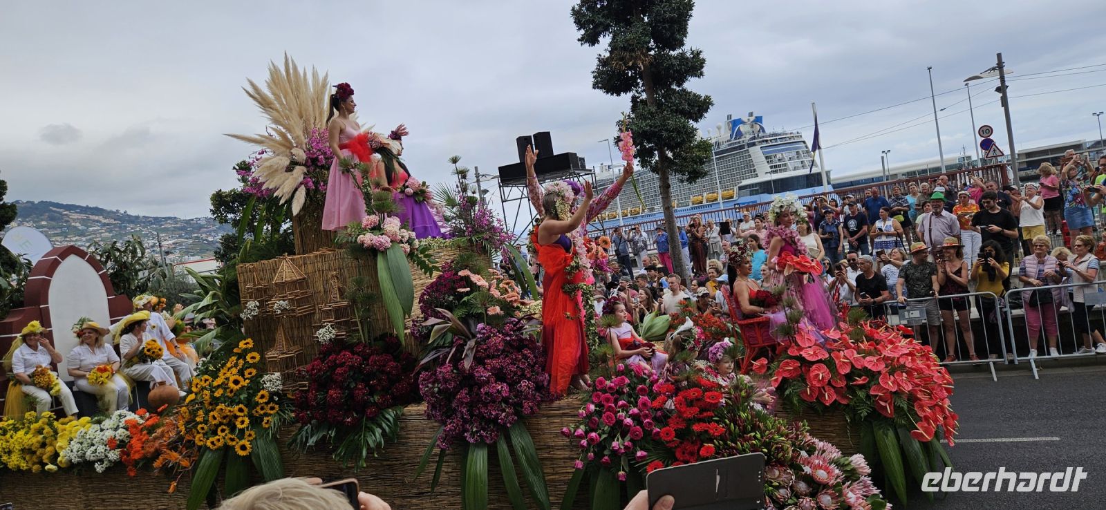 Die Levada Wanderung war fakultativ, aber der Großteil unserer Gruppe beteiligte sich. Wir wanderten bei herrlichem Sonnenschein immer am Wasserkanal entlang, sahen viele Pflanzen ganz aus der Nähe und Berthold erzählte viel über das Leben auf dem Lande und die Bearbeitung der kleinen Flächen. Unterwegs gab es immer mal frische Früchte mit einer Kasse des Vertrauens. Zum Ende der Wanderung führte der Weg durch einen Wald aus Mimosenakazien. An einer Bar endete die Wanderung und von dort ging es steil bergab bis zu unserem Bus. Am Nachmittag fuhren wir zusammen mit den Teilnehmern der Rundreisegruppe von Eberhardt Travel ins Stadtzentrum von Funchal. Dort war schon alles für den großen Festumzug vorbereitet und wir spazierten zunächst am Meer entlang in Richtung Seilbahn, wo sich der Festumzug formierte. Untwerwegs gönnten wir uns ein Eis und machten mit 2 jungen Teilnehmern am Festumzug ein Fotos. Gemütlich gingen wir zurück zu unserer Tribüne 16 und nahmen unsere Plätze ein. Es gab für jeden einen Strohhut und eine Flasche Wasser und dann hiess es Warten, Warten...Gegen 17 Uhr erreichte der Festumzug unsere Tribüne und er dauerte bis 19.30 Uhr. Wunderschön geschmückte Festwagen und 15 Tanzformationen, die ihre Choreographie immer wieder darboten, zogen an uns vorbei. Es war ein unvergesslicher Augen- und Ohrenschmaus und am Ende waren auch wie ganz schön ausgepowert vom Klatschen, Jubeln und Winken. Wir verliessen ganz gemütlich unsere Tribüne und begaben uns in Richtung SANTA Maria Viertel zum Abendessen im Restaurant Cidade Velha. Dort hatte man für unsere Gruppe einen großen Tisch im Freien hergerichtet und nun konnten wir unser Abendessen mit Knoblauchbrot, Gemüsesuppe, Espada mit Banane und Maracuja Sose sowie zum Nachtisch einen Maracuja Käsekuchen und einen Cafe geniessen. Über dem Meer ging die Sonne unter und für uns ein erlebnisreicher Tag zu Ende. Carlos erwartete uns schon und brachte uns mit dem Bus zurück ins Hotel.