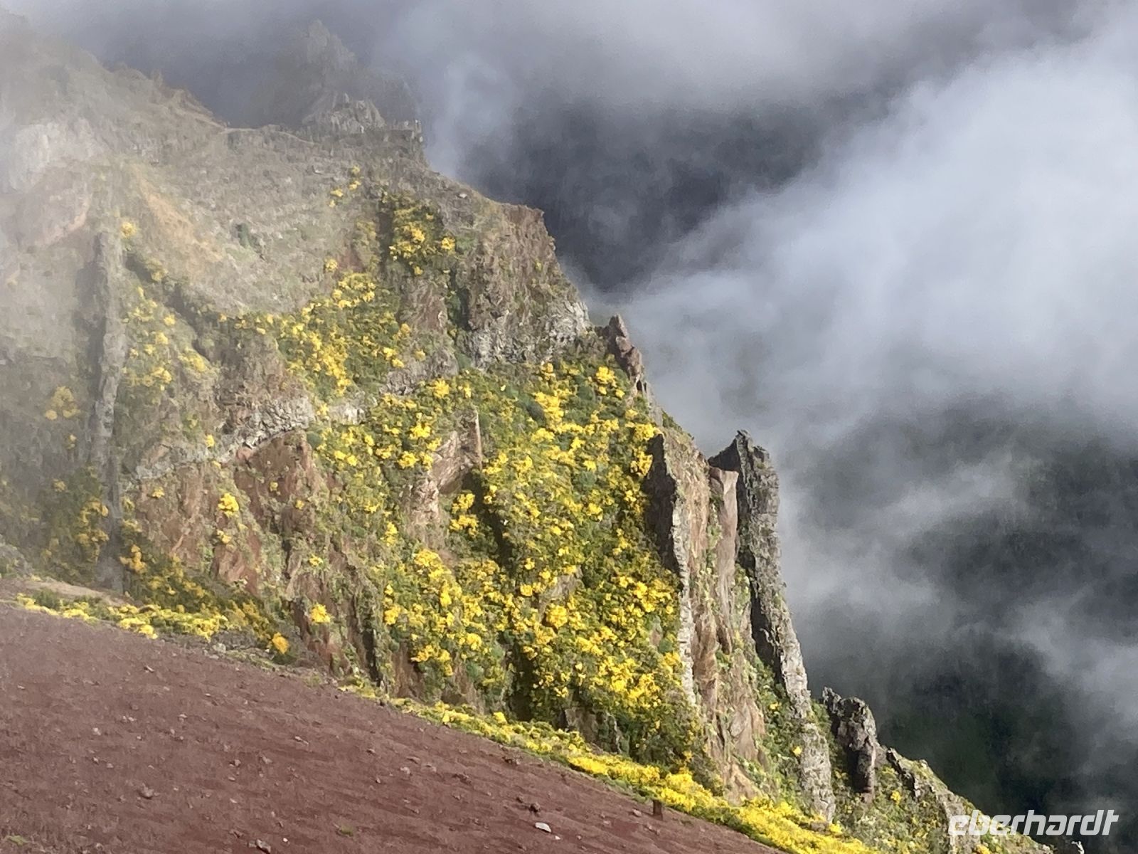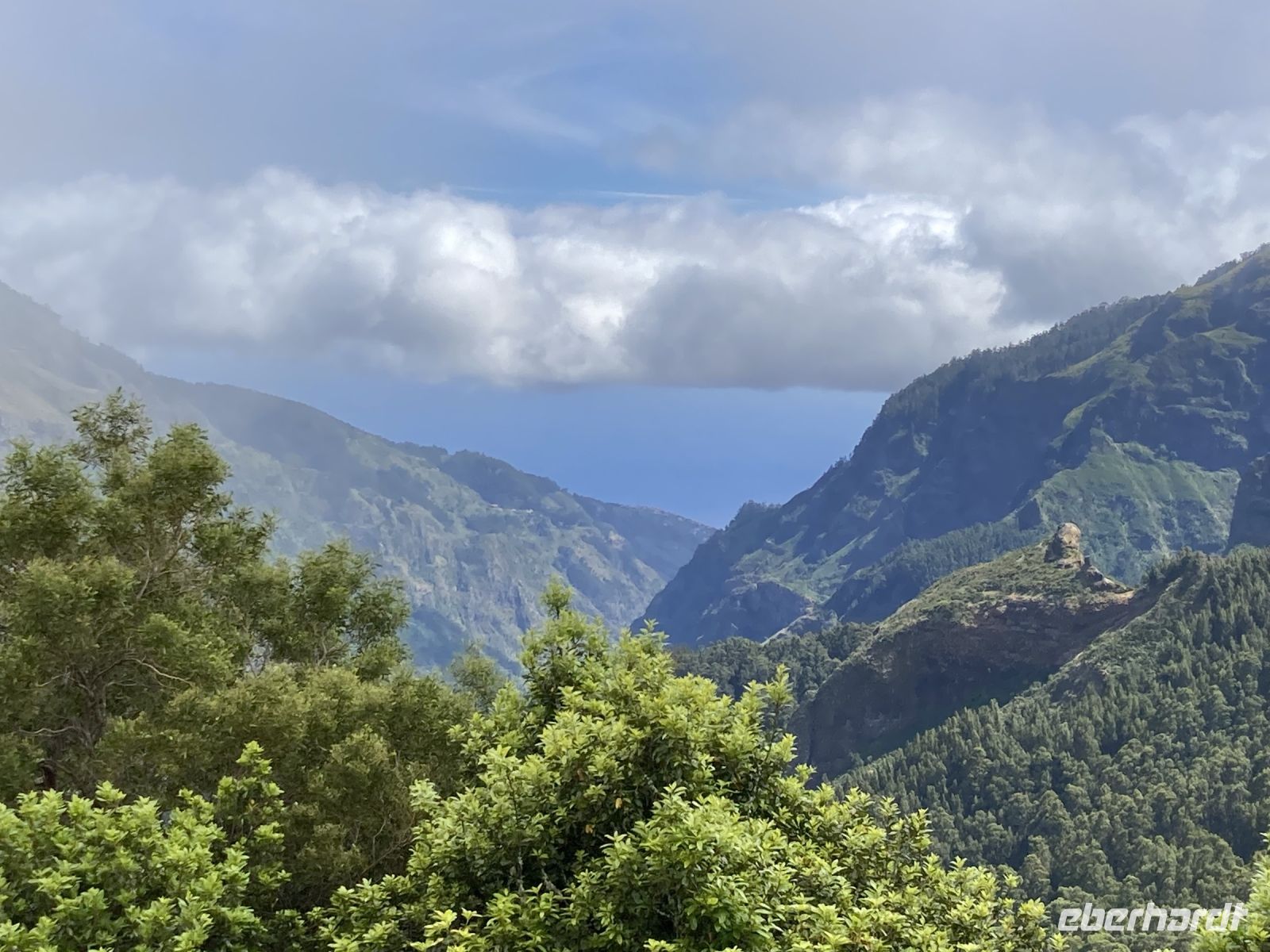 … und der hat es in sich, den er führt uns heute auf den höchsten Berg der Insel. Bestens gelaunt und gut gefrühstückt geht es mit unserem komfortablen Bus los mit Richtung Inselinneres. Zuerst fahren wir durch die zahlreichen Wälder( oft Lorbeer, auch Eukalyptus) und passieren den Ort Camacha, dem Zentrum des Korbflechtens zum Aussichtspunkt Pico do Areeoro (1.818 m hoch). Mystisch ist der Ausblick bei dem Wechselspiel von Wolken und kurzen Ausblicken, garniert mit etwas Sonne.