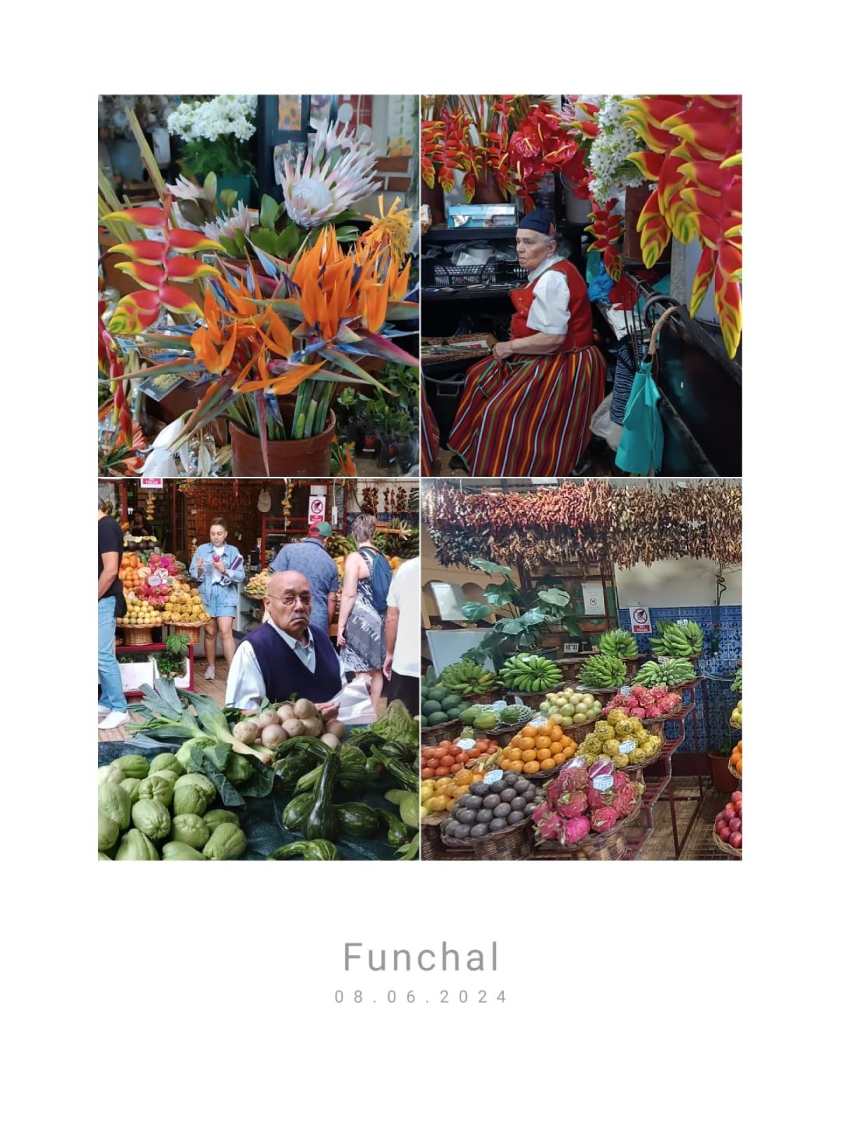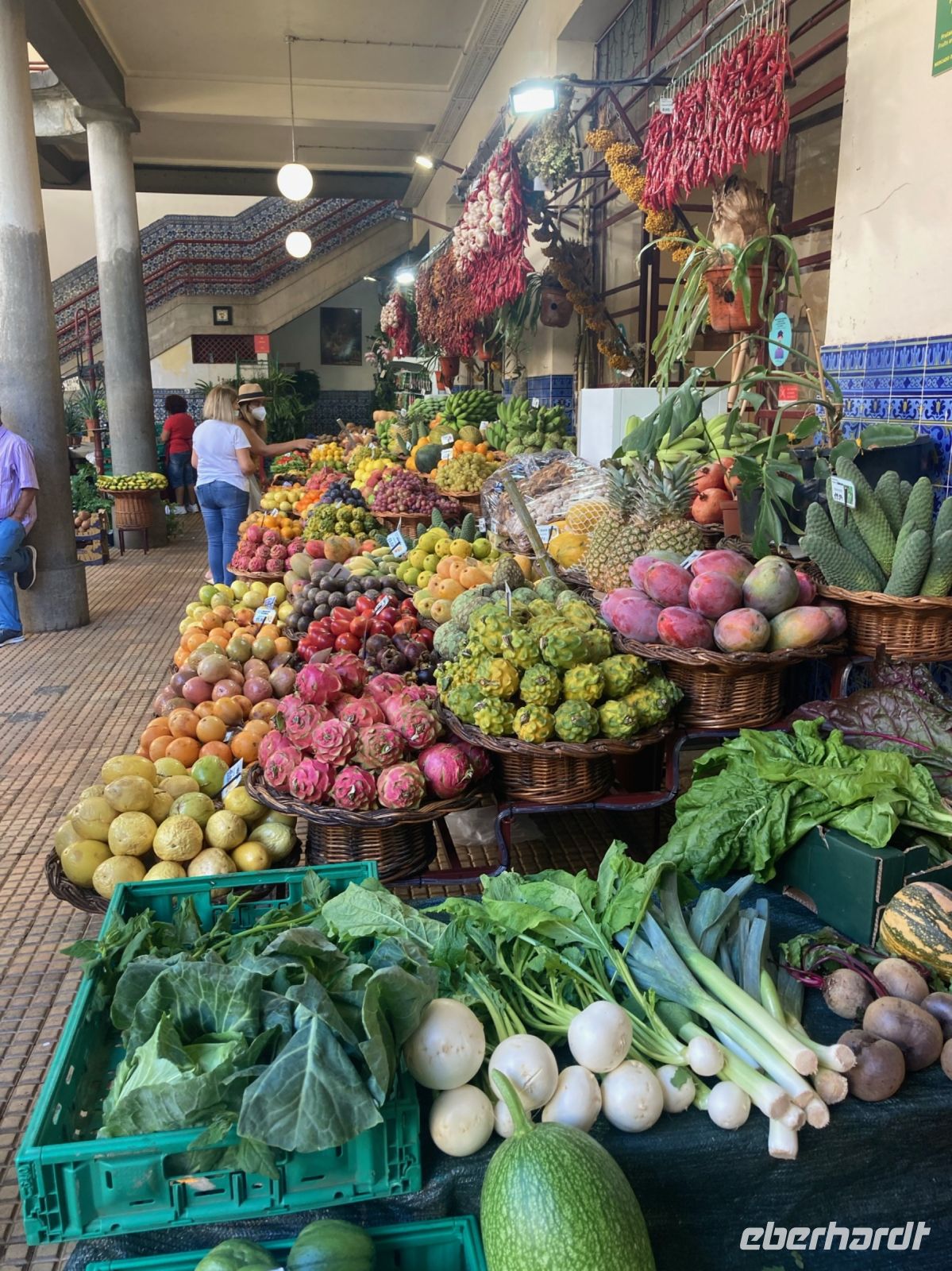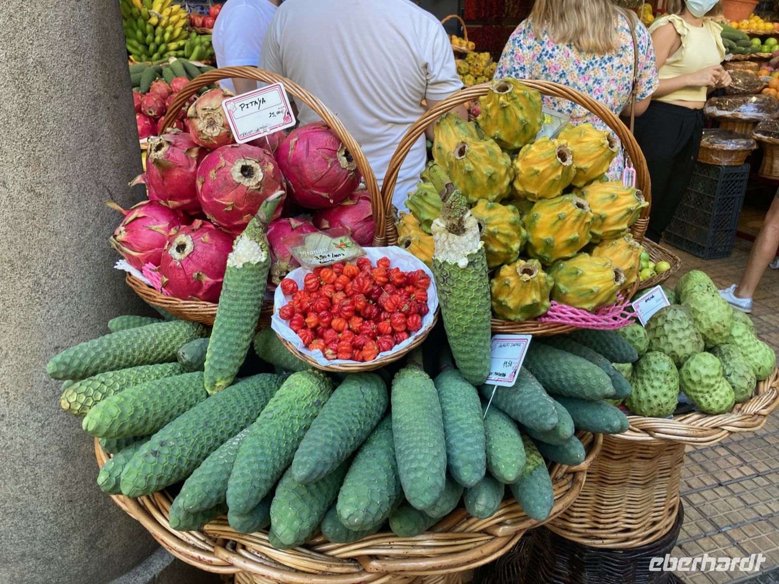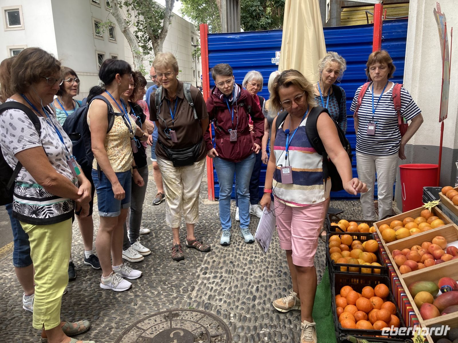 Wir lernen bei einem Stadtrundgang Funchal die Hauptstadt der Insel Madeiras näher kennen. Die farbenfrohe Markthalle von Funchal zieht uns an, aber zuvor laufen wir durch die Gasse mit den vielen bemalten Türen. Diese sind am Besten früh am Morgen zu besichtigen, da diese noch geschlossen sind, wenn die Gastronomie noch ruht.vermittelt. 9.600 qm ist die Markthalle groß und bis zu 120 Stände haben darin Platz.In der Markthalle (1940 eröffnet) beginnen wir mit dem Fischmarkt. Die vielfältigsten Tiere werden offeriert, vor allem der Degenfisch. Dieses typische madeirische Produkt wird mit sehr langen Leinen (bis zu 1500 m lang), an denen bis zu 50 Köder befestigt sind. Seine schwarze Farbe bekommt er erst, wenn er aus der Tiefe nach oben gezogen wird, infolge der starken Druckveränderung. Da heute Sonnabend ist haben wir Glück, denn es sind nicht nur die professionellen Obst- und Gemüsehändler vor Ort, sondern auch viele Bauern.