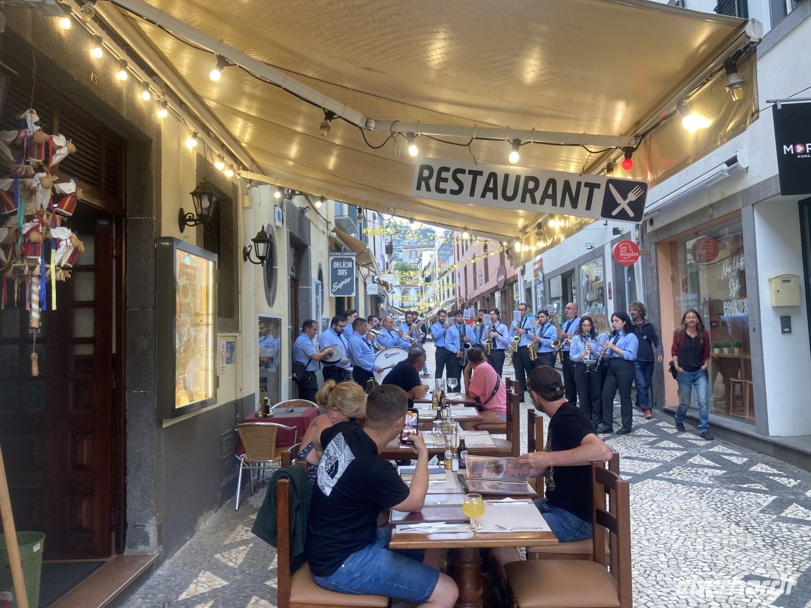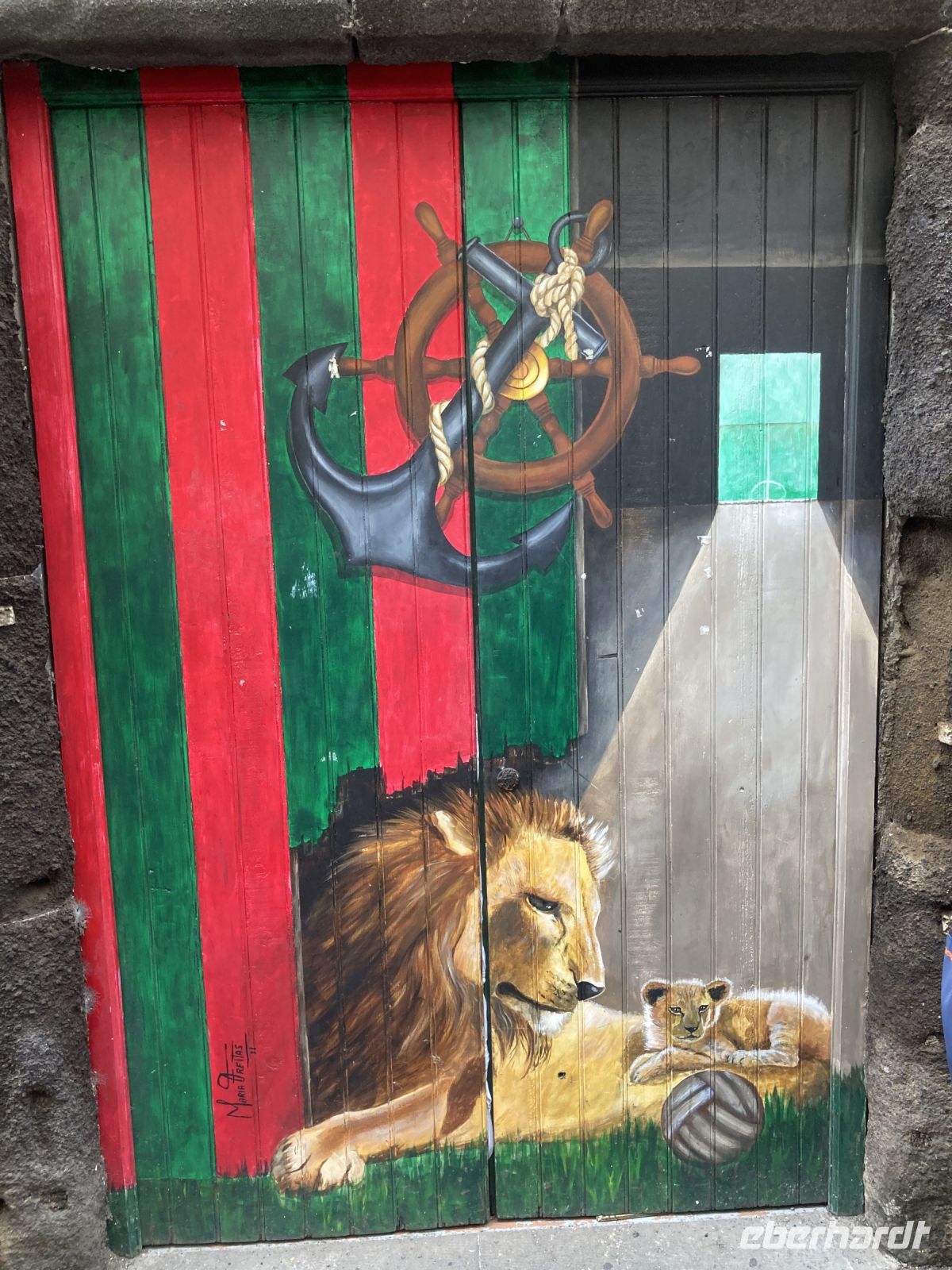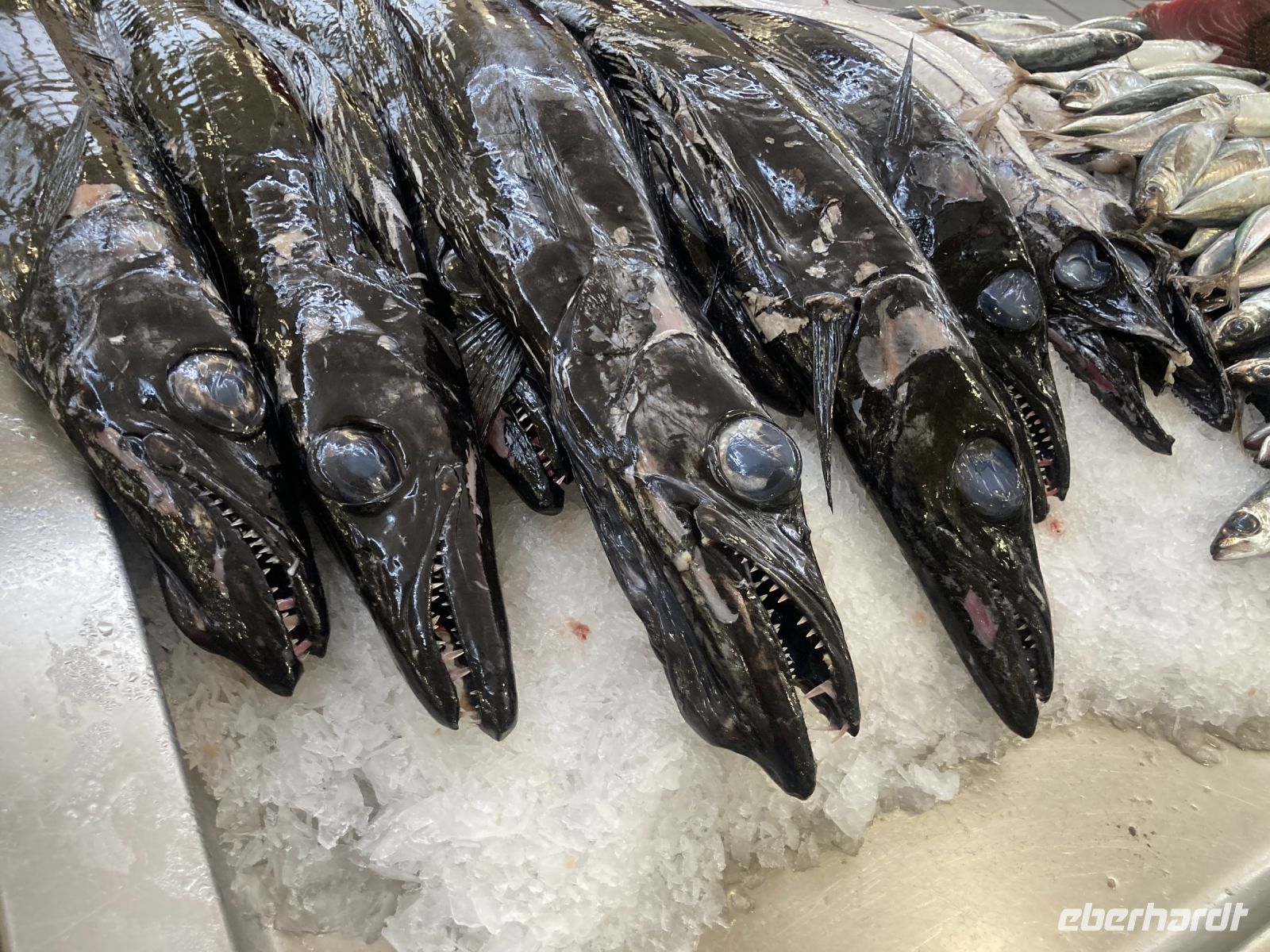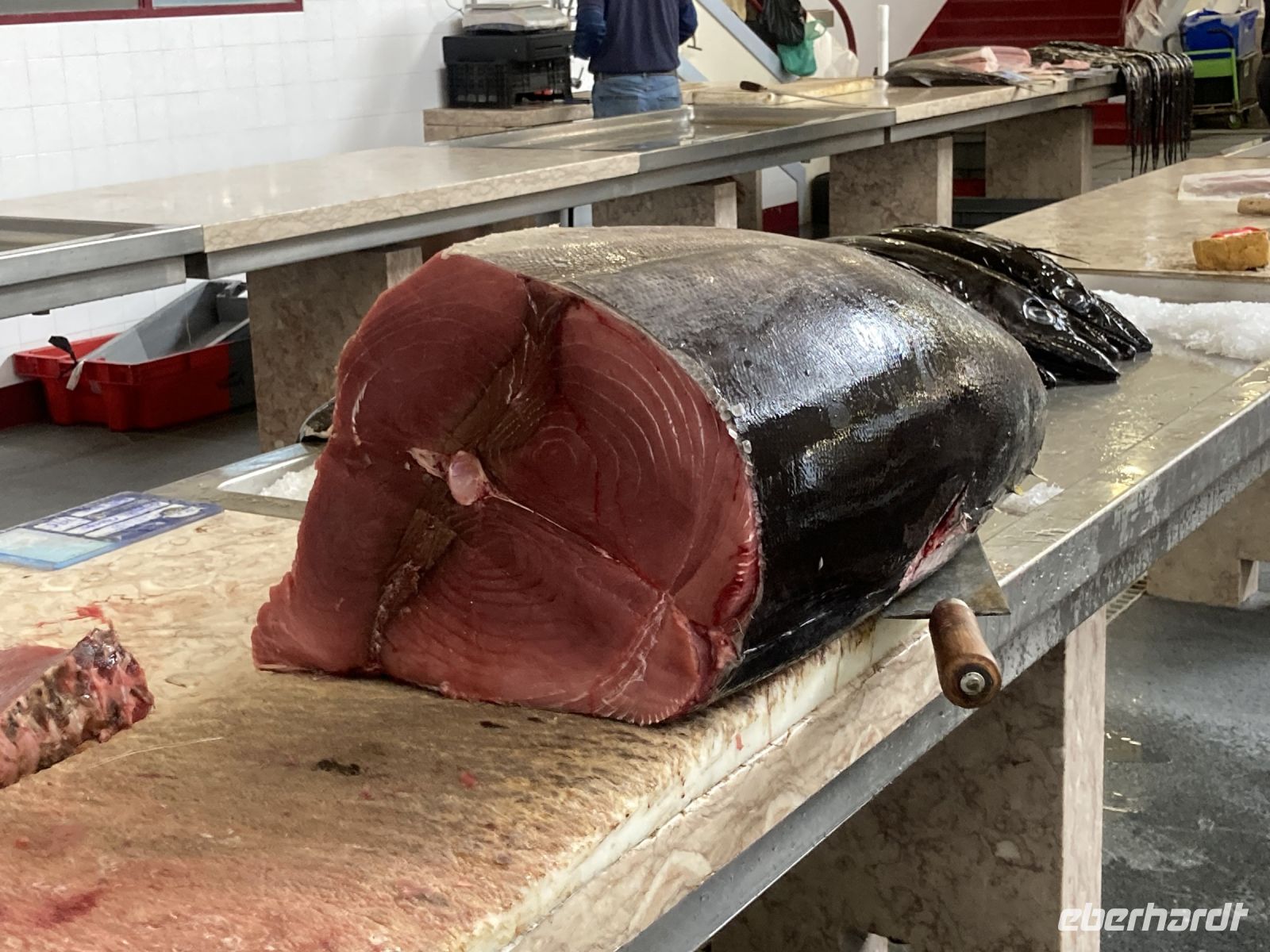 Wir lernen bei einem Stadtrundgang Funchal die Hauptstadt der Insel Madeiras näher kennen. Die farbenfrohe Markthalle von Funchal zieht uns an, aber zuvor laufen wir durch die Gasse mit den vielen bemalten Türen. Diese sind am Besten früh am Morgen zu besichtigen, da diese noch geschlossen sind, wenn die Gastronomie noch ruht.vermittelt. 9.600 qm ist die Markthalle groß und bis zu 120 Stände haben darin Platz.In der Markthalle (1940 eröffnet) beginnen wir mit dem Fischmarkt. Die vielfältigsten Tiere werden offeriert, vor allem der Degenfisch. Dieses typische madeirische Produkt wird mit sehr langen Leinen (bis zu 1500 m lang), an denen bis zu 50 Köder befestigt sind. Seine schwarze Farbe bekommt er erst, wenn er aus der Tiefe nach oben gezogen wird, infolge der starken Druckveränderung. Da heute Sonnabend ist haben wir Glück, denn es sind nicht nur die professionellen Obst- und Gemüsehändler vor Ort, sondern auch viele Bauern.