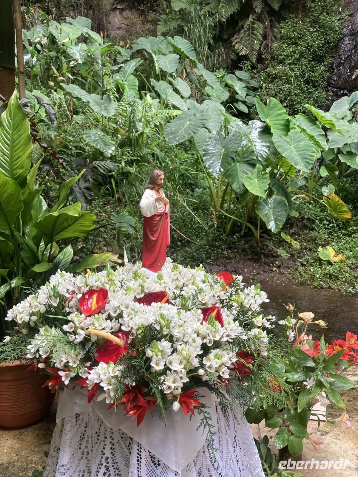 Zuerst werden wir uns mit einer kurzen Wanderung in Schwung bringen. Der Bus bringt uns in die Höhe und wir steigen in dem kleinen Ort Curral dos Romeiros aus um nach Monte zu laufen. Nachdem wir ein Tal durchschritten hatten und die Höhenmeter wieder zurück geholt haben, erreichen wir Monte. Zuerst geht es in die katholische Wallfahrtskirche Nossa Senhora do Monte, wo der 2004 seliggesprochene Kaiser Karl von Österreich Ungarn bestattet ist.