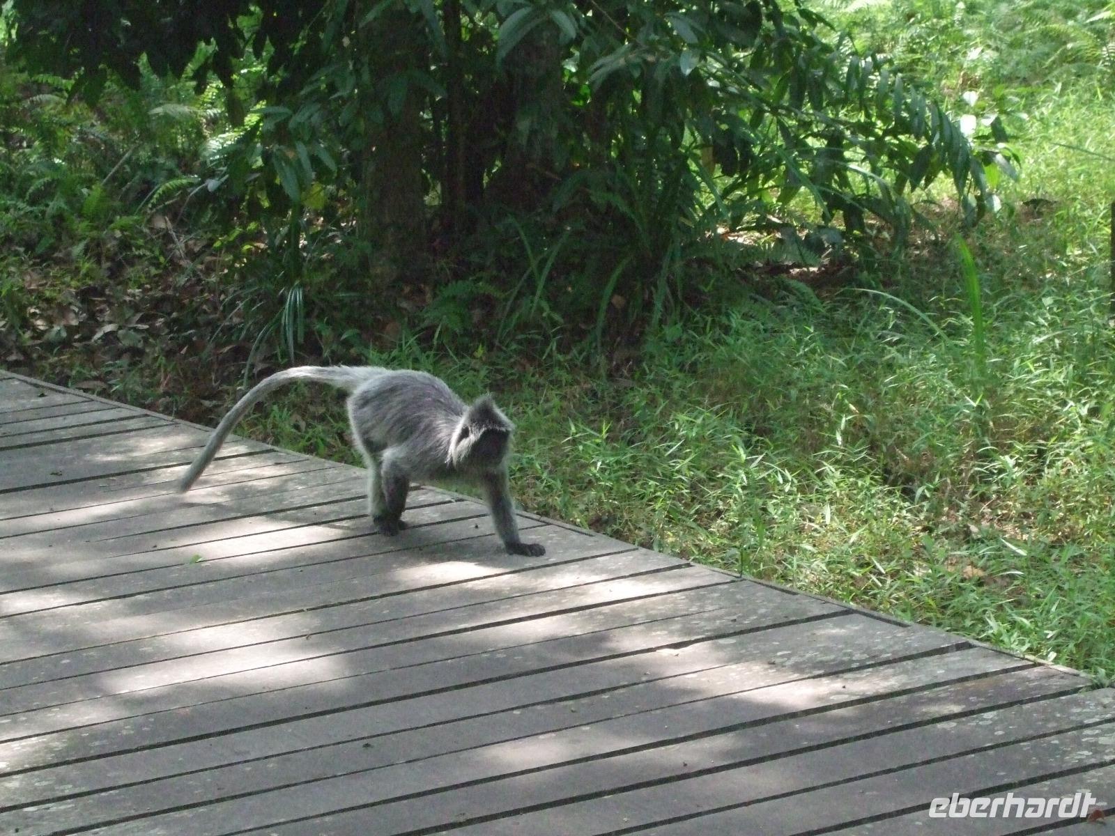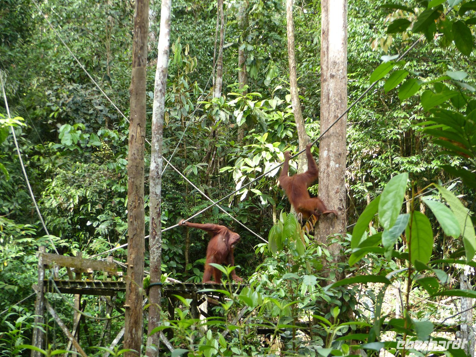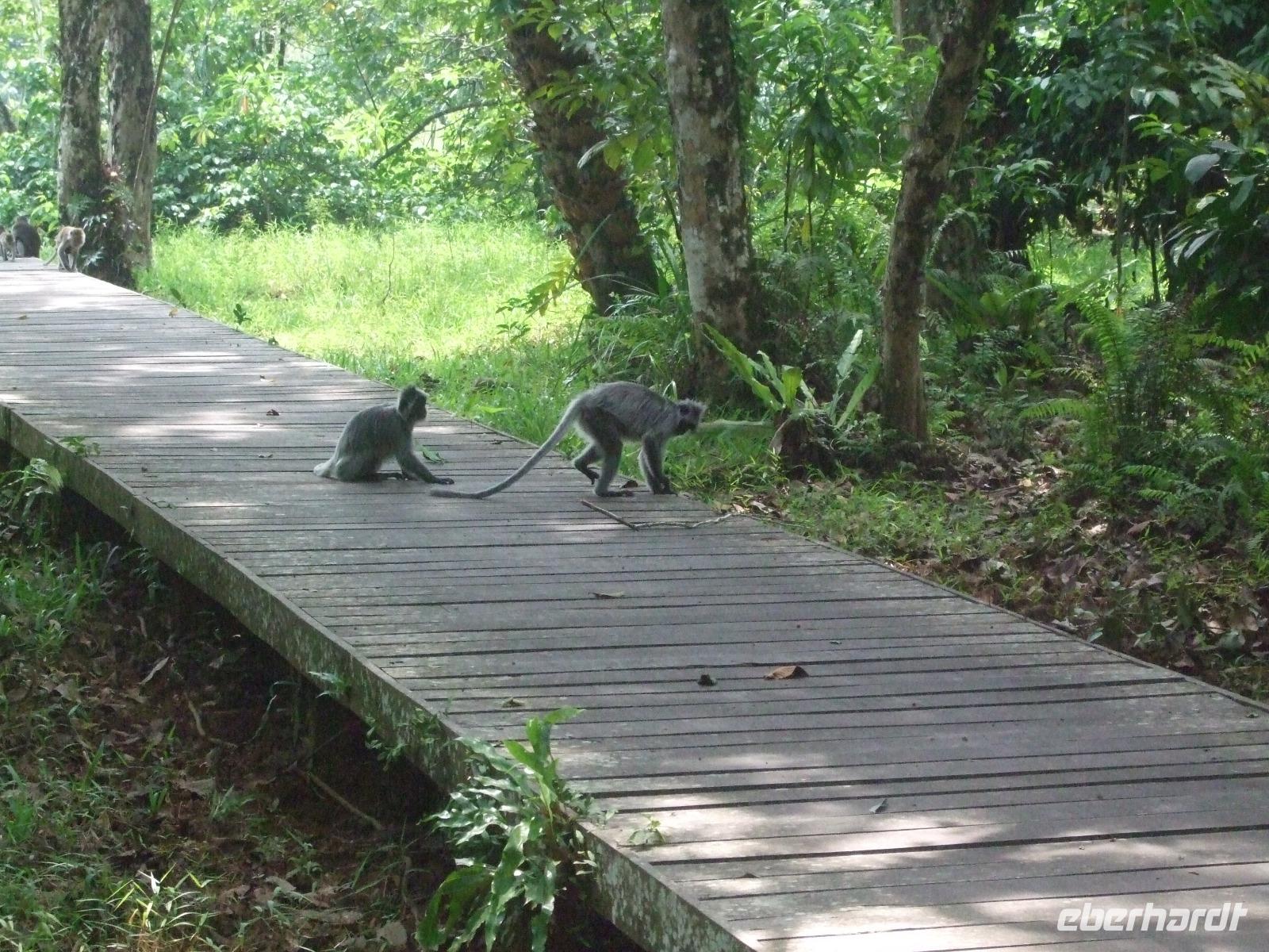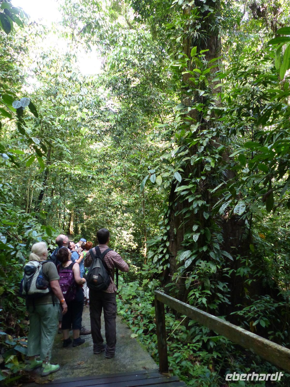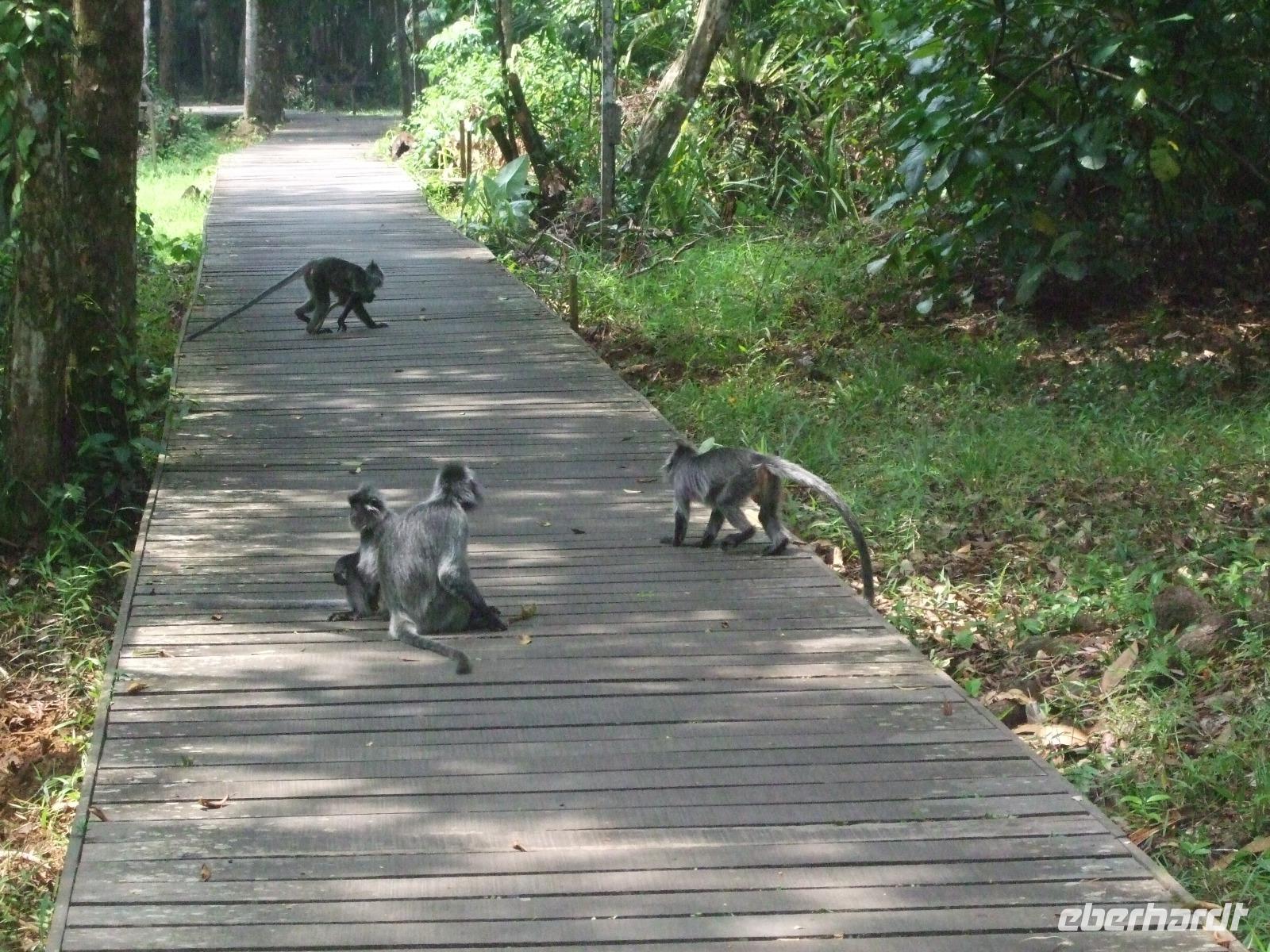 Nach einer erholsamen Nacht und einem leckeren Frühstück steht heute bereits ein erster Höhepunkt auf dem Programm- der Besuch von Semenggoh. Schon während der Fahrt erfahren wir von Nicki allerhand wissenswertes über die Menschen des Waldes, was Orang Utan vom malaiischen übersetzt bedeutet. Alle 26 in Semenggoh lebenden Orang Utans haben bereits einen langen Rehabilationsweg hinter sich und befinden sich nun in ihrer letzten Phase auf dem Weg zurück in die Wildnis. Dies heißt wiederrum für uns, dass die Affen hier halb wild sind und nur mit Glück zur Fütterungsstation kommen. Doch wir haben das Glück auf unserer Seite und können insgesamt 4 der uns zu 96,4% in der DNA gleichen Tiere beobachten. Überraschend und fast geräuschlos kommen Sie durch den dichten Dschungel. Mit vielen Fotos im Gepäck, fahren wir zurück nach Kuching, der Hauptstadt Sarawaks und unternehmen eine Rundfahrt. Wir beginnen im Südteil der Stadt, wo wir das hiesige Bürgerhaus besuchen und anhand von Fotoaufnahmen und Nickis Erklärungen viel Wissenswertes über diesen Teilstatt von Malaysia erfahren. Weiter geht es zur Katzenstatue und durch Chinatown, wo wir nach dem Besuch des taoistischen Tempels Tua Pek Kong, welcher übersetzt Tempel des mächtigen Großvaters bedeutet, auf einheimische Art und Weise einen Mittagsimbiss zu uns nehmen. Leckere, einfache Speisen erwarten uns in einer der vielen Coffeeshops. Laksa, Kolok Mee oder eine Kleinigkeit vom Buffet- für jeden ist etwas dabei. Da es ganz nach Regen aussieht, entschließen wir uns bereits jetzt die Führung durch Borneos ältestes Museum zu unternehmen. Mit zum Teil noch originalen Ausstellungsmöbeln aus England besticht dieses Museum nicht durch neuste Technik sondern eher durch seine Exponate, hinter welchen viele interessante Erklärungen schlummern. Dank Nicki bekommen wir so einen guten Überblick in die Natur-, Tier- und Kulturvielfalt Borneos. Da es nun immer noch gewittert, entschließen wir uns den letzten Teil der Stadtbesichtigung auf einen anderen Tag zu verlegen und vorerst ins Hotel zurück zu fahren. Nach etwas Zeit zum Frisch machen, treffen wir uns zu einem ersten gemeinsamen Abendessen. In unmittelbarer Nähe zum Hotel befindet sich das Top Spot Seafood Center. Hier haben wir einen der vielen großen runden Tische für uns und probieren leckere einheimische Kost- Mangofisch, Okrabohnen oder Midin, ein essbares Farn zusammen mit Knoblauch in der Pfanne angeschwitzt.