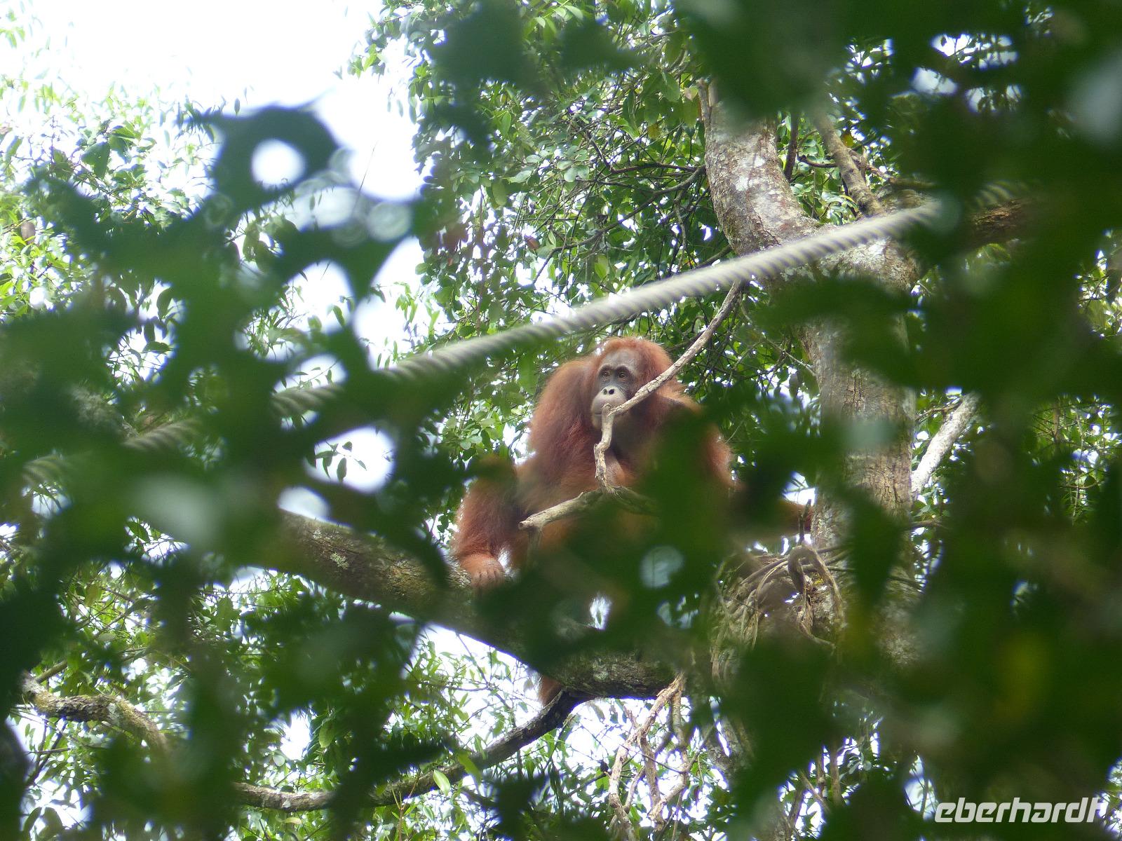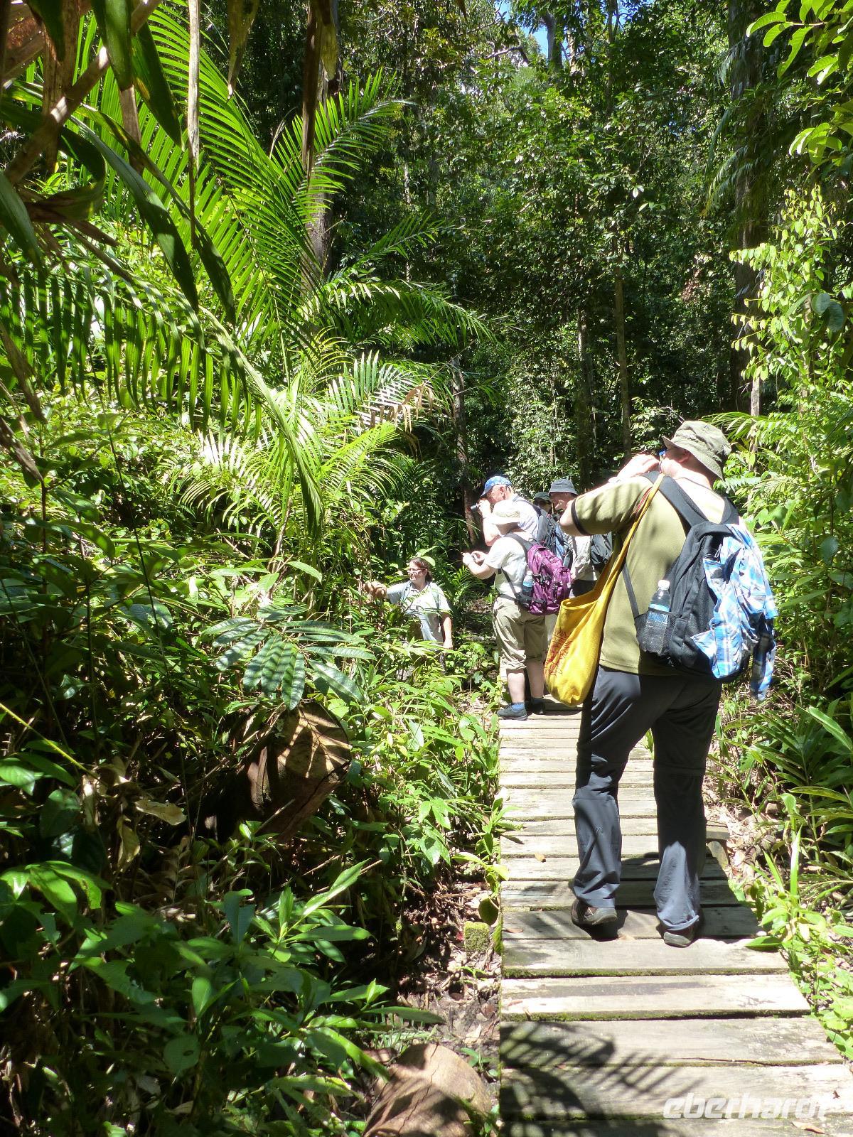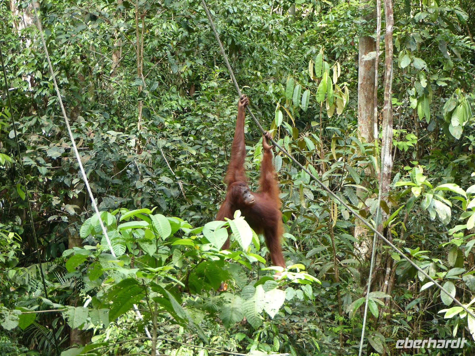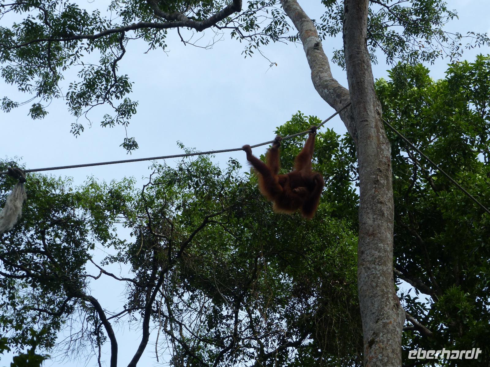 Nach einer erholsamen Nacht und einem leckeren Frühstück steht heute bereits ein erster Höhepunkt auf dem Programm- der Besuch von Semenggoh. Schon während der Fahrt erfahren wir von Nicki allerhand wissenswertes über die Menschen des Waldes, was Orang Utan vom malaiischen übersetzt bedeutet. Alle 26 in Semenggoh lebenden Orang Utans haben bereits einen langen Rehabilationsweg hinter sich und befinden sich nun in ihrer letzten Phase auf dem Weg zurück in die Wildnis. Dies heißt wiederrum für uns, dass die Affen hier halb wild sind und nur mit Glück zur Fütterungsstation kommen. Doch wir haben das Glück auf unserer Seite und können insgesamt 4 der uns zu 96,4% in der DNA gleichen Tiere beobachten. Überraschend und fast geräuschlos kommen Sie durch den dichten Dschungel. Mit vielen Fotos im Gepäck, fahren wir zurück nach Kuching, der Hauptstadt Sarawaks und unternehmen eine Rundfahrt. Wir beginnen im Südteil der Stadt, wo wir das hiesige Bürgerhaus besuchen und anhand von Fotoaufnahmen und Nickis Erklärungen viel Wissenswertes über diesen Teilstatt von Malaysia erfahren. Weiter geht es zur Katzenstatue und durch Chinatown, wo wir nach dem Besuch des taoistischen Tempels Tua Pek Kong, welcher übersetzt Tempel des mächtigen Großvaters bedeutet, auf einheimische Art und Weise einen Mittagsimbiss zu uns nehmen. Leckere, einfache Speisen erwarten uns in einer der vielen Coffeeshops. Laksa, Kolok Mee oder eine Kleinigkeit vom Buffet- für jeden ist etwas dabei. Da es ganz nach Regen aussieht, entschließen wir uns bereits jetzt die Führung durch Borneos ältestes Museum zu unternehmen. Mit zum Teil noch originalen Ausstellungsmöbeln aus England besticht dieses Museum nicht durch neuste Technik sondern eher durch seine Exponate, hinter welchen viele interessante Erklärungen schlummern. Dank Nicki bekommen wir so einen guten Überblick in die Natur-, Tier- und Kulturvielfalt Borneos. Da es nun immer noch gewittert, entschließen wir uns den letzten Teil der Stadtbesichtigung auf einen anderen Tag zu verlegen und vorerst ins Hotel zurück zu fahren. Nach etwas Zeit zum Frisch machen, treffen wir uns zu einem ersten gemeinsamen Abendessen. In unmittelbarer Nähe zum Hotel befindet sich das Top Spot Seafood Center. Hier haben wir einen der vielen großen runden Tische für uns und probieren leckere einheimische Kost- Mangofisch, Okrabohnen oder Midin, ein essbares Farn zusammen mit Knoblauch in der Pfanne angeschwitzt.