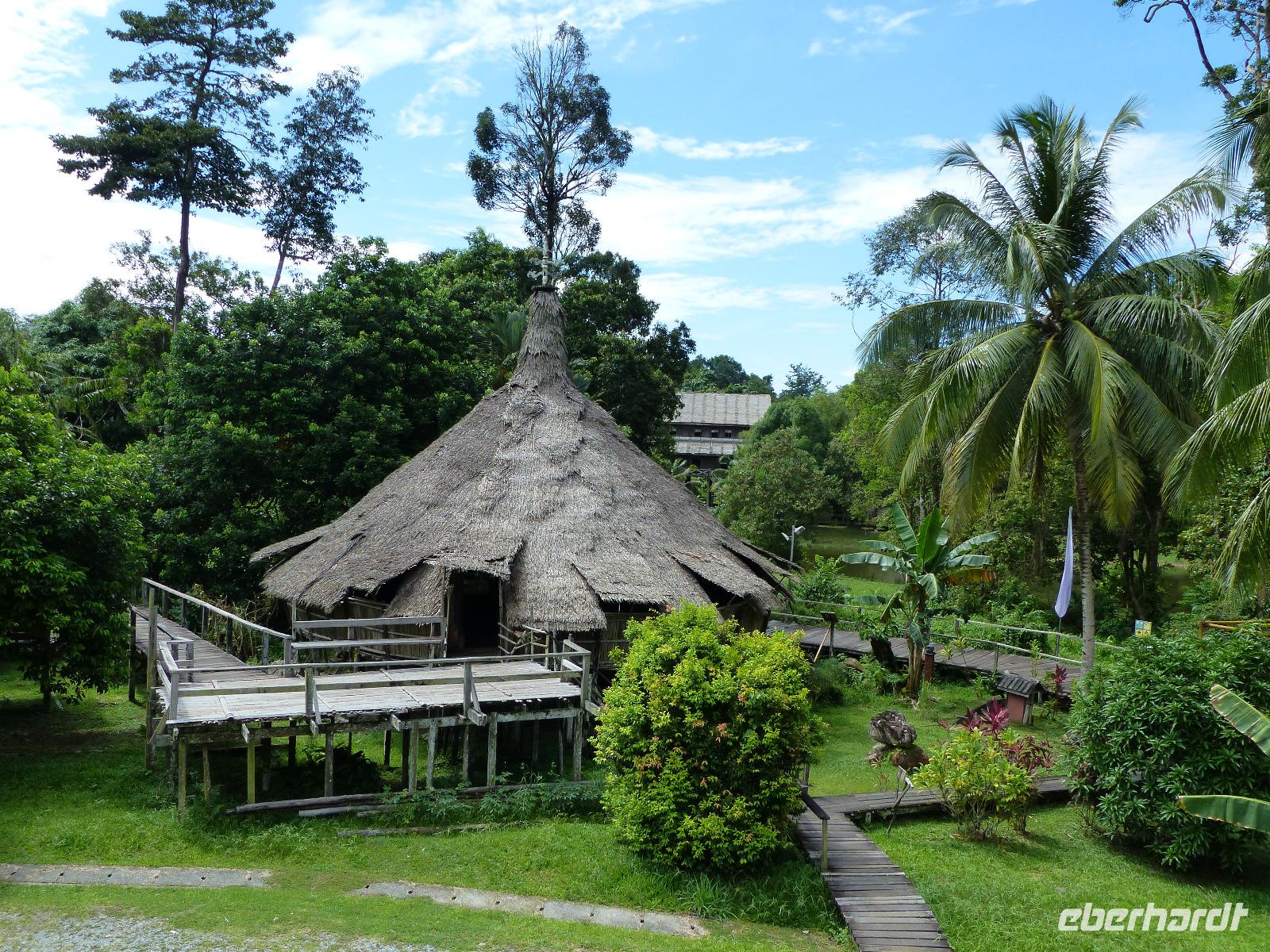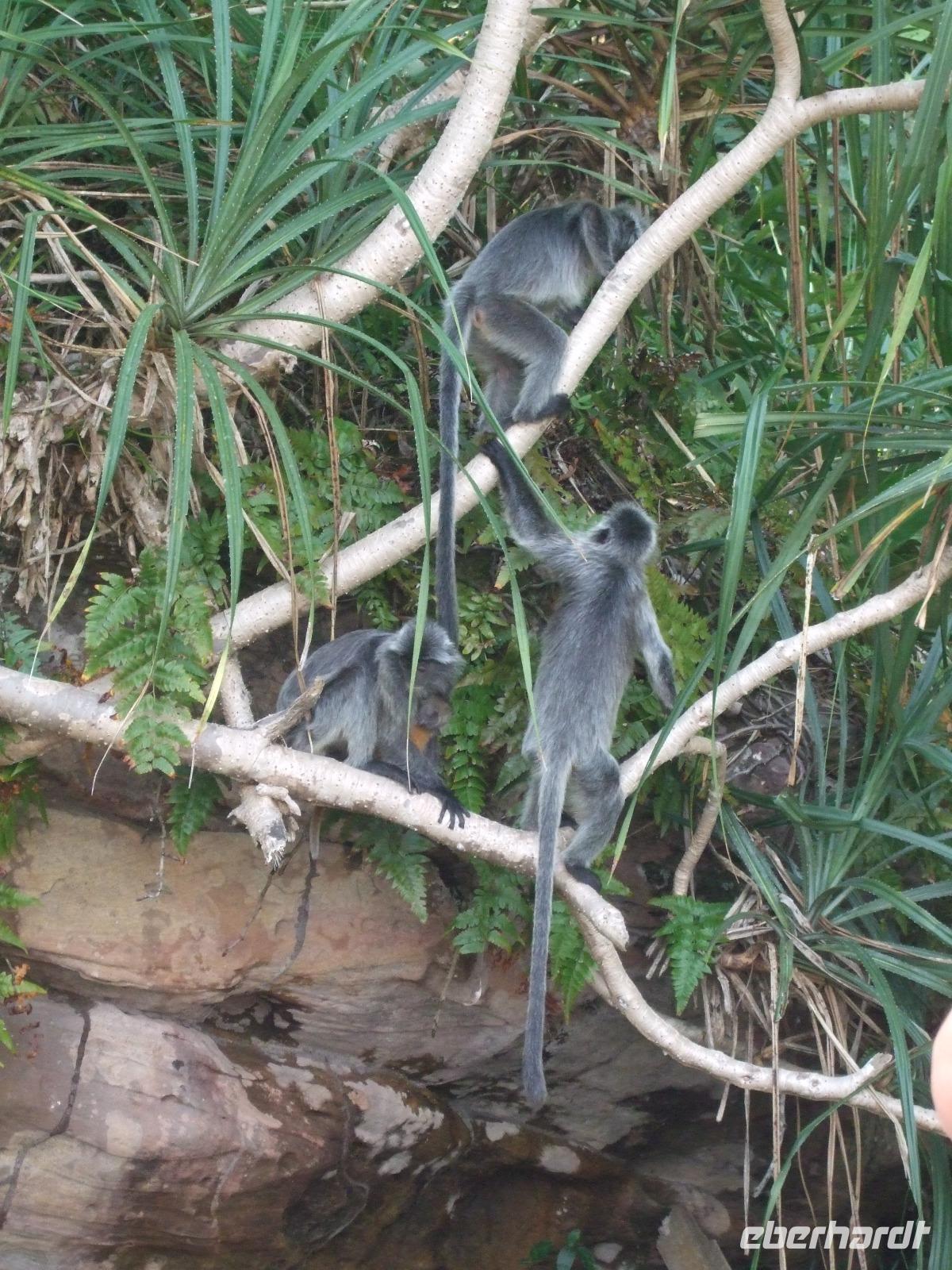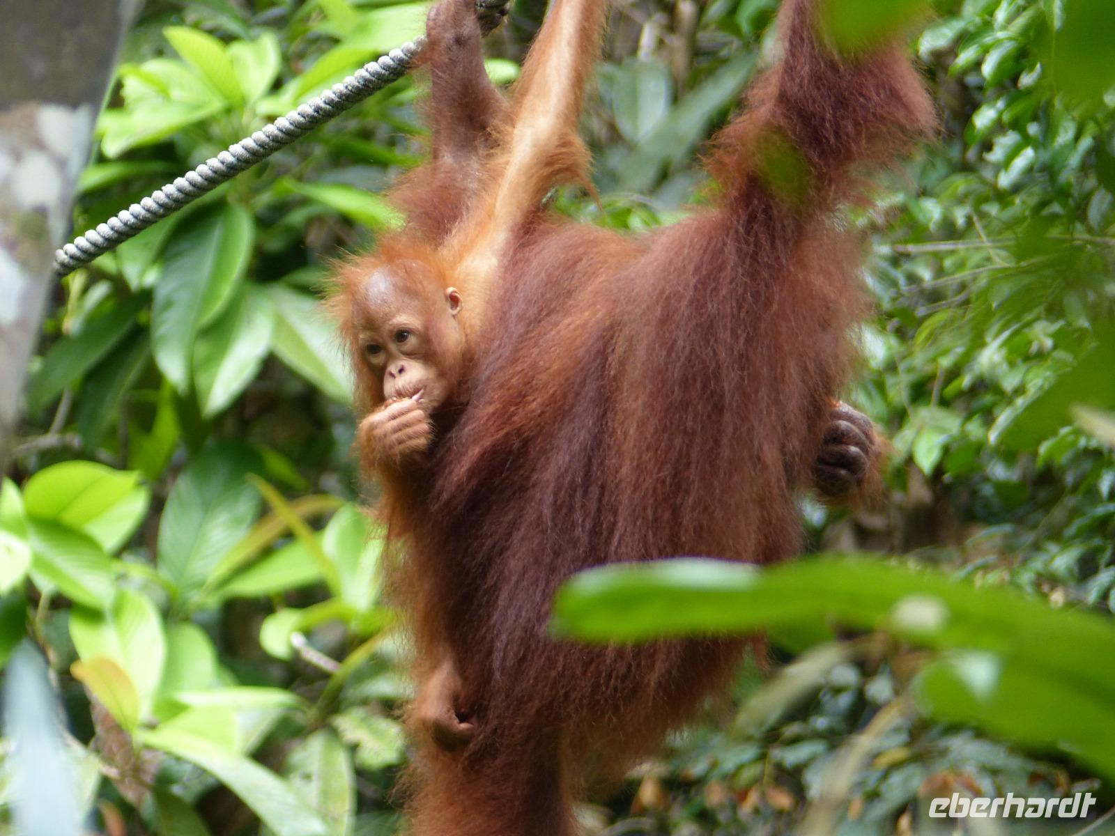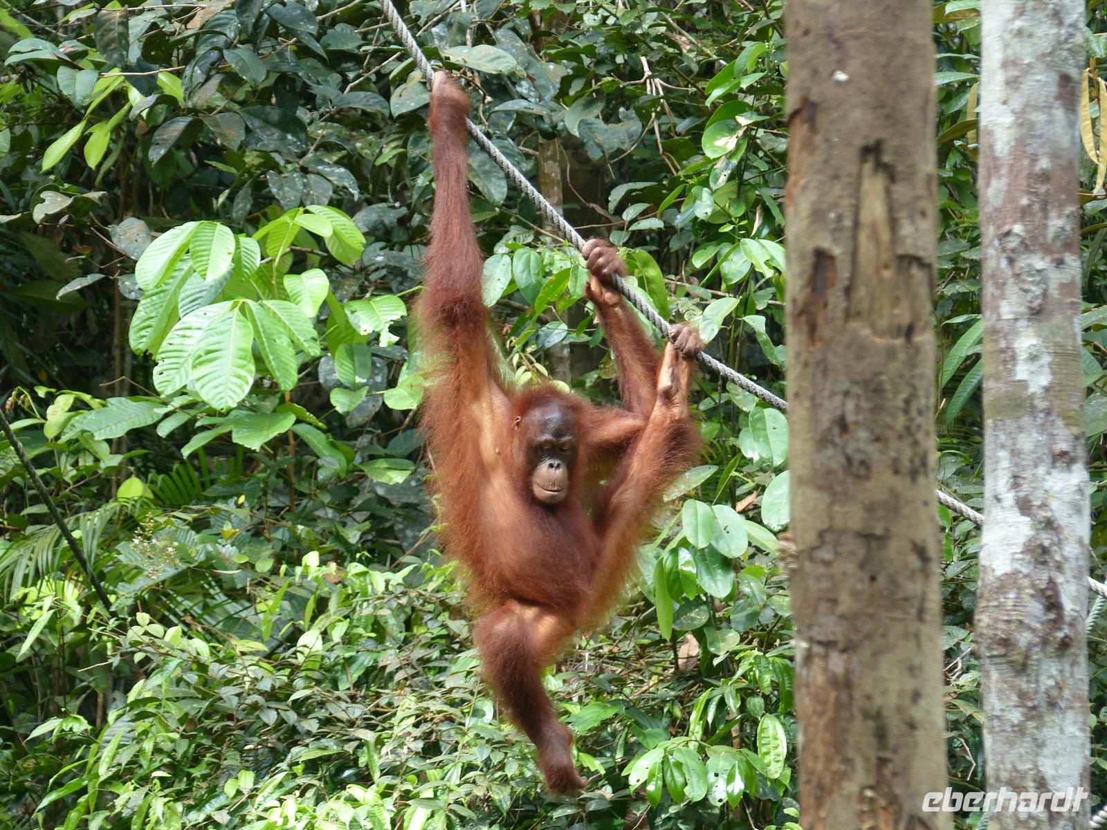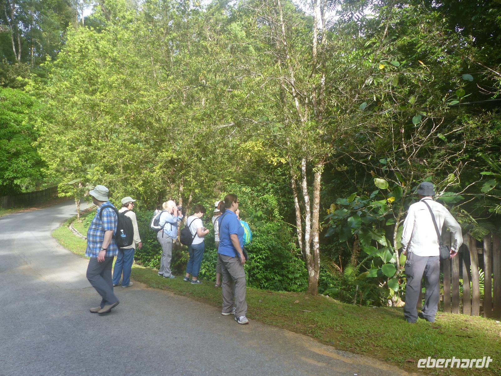 Nach einer erholsamen Nacht und einem leckeren Frühstück steht heute bereits ein erster Höhepunkt auf dem Programm- der Besuch von Semenggoh. Schon während der Fahrt erfahren wir von Nicki allerhand wissenswertes über die Menschen des Waldes, was Orang Utan vom malaiischen übersetzt bedeutet. Alle 26 in Semenggoh lebenden Orang Utans haben bereits einen langen Rehabilationsweg hinter sich und befinden sich nun in ihrer letzten Phase auf dem Weg zurück in die Wildnis. Dies heißt wiederrum für uns, dass die Affen hier halb wild sind und nur mit Glück zur Fütterungsstation kommen. Doch wir haben das Glück auf unserer Seite und können insgesamt 4 der uns zu 96,4% in der DNA gleichen Tiere beobachten. Überraschend und fast geräuschlos kommen Sie durch den dichten Dschungel. Mit vielen Fotos im Gepäck, fahren wir zurück nach Kuching, der Hauptstadt Sarawaks und unternehmen eine Rundfahrt. Wir beginnen im Südteil der Stadt, wo wir das hiesige Bürgerhaus besuchen und anhand von Fotoaufnahmen und Nickis Erklärungen viel Wissenswertes über diesen Teilstatt von Malaysia erfahren. Weiter geht es zur Katzenstatue und durch Chinatown, wo wir nach dem Besuch des taoistischen Tempels Tua Pek Kong, welcher übersetzt Tempel des mächtigen Großvaters bedeutet, auf einheimische Art und Weise einen Mittagsimbiss zu uns nehmen. Leckere, einfache Speisen erwarten uns in einer der vielen Coffeeshops. Laksa, Kolok Mee oder eine Kleinigkeit vom Buffet- für jeden ist etwas dabei. Da es ganz nach Regen aussieht, entschließen wir uns bereits jetzt die Führung durch Borneos ältestes Museum zu unternehmen. Mit zum Teil noch originalen Ausstellungsmöbeln aus England besticht dieses Museum nicht durch neuste Technik sondern eher durch seine Exponate, hinter welchen viele interessante Erklärungen schlummern. Dank Nicki bekommen wir so einen guten Überblick in die Natur-, Tier- und Kulturvielfalt Borneos. Da es nun immer noch gewittert, entschließen wir uns den letzten Teil der Stadtbesichtigung auf einen anderen Tag zu verlegen und vorerst ins Hotel zurück zu fahren. Nach etwas Zeit zum Frisch machen, treffen wir uns zu einem ersten gemeinsamen Abendessen. In unmittelbarer Nähe zum Hotel befindet sich das Top Spot Seafood Center. Hier haben wir einen der vielen großen runden Tische für uns und probieren leckere einheimische Kost- Mangofisch, Okrabohnen oder Midin, ein essbares Farn zusammen mit Knoblauch in der Pfanne angeschwitzt.