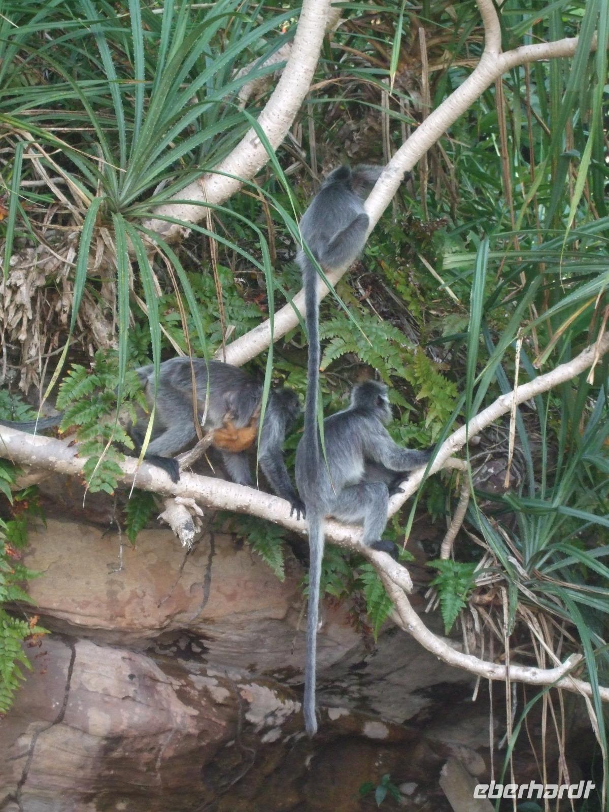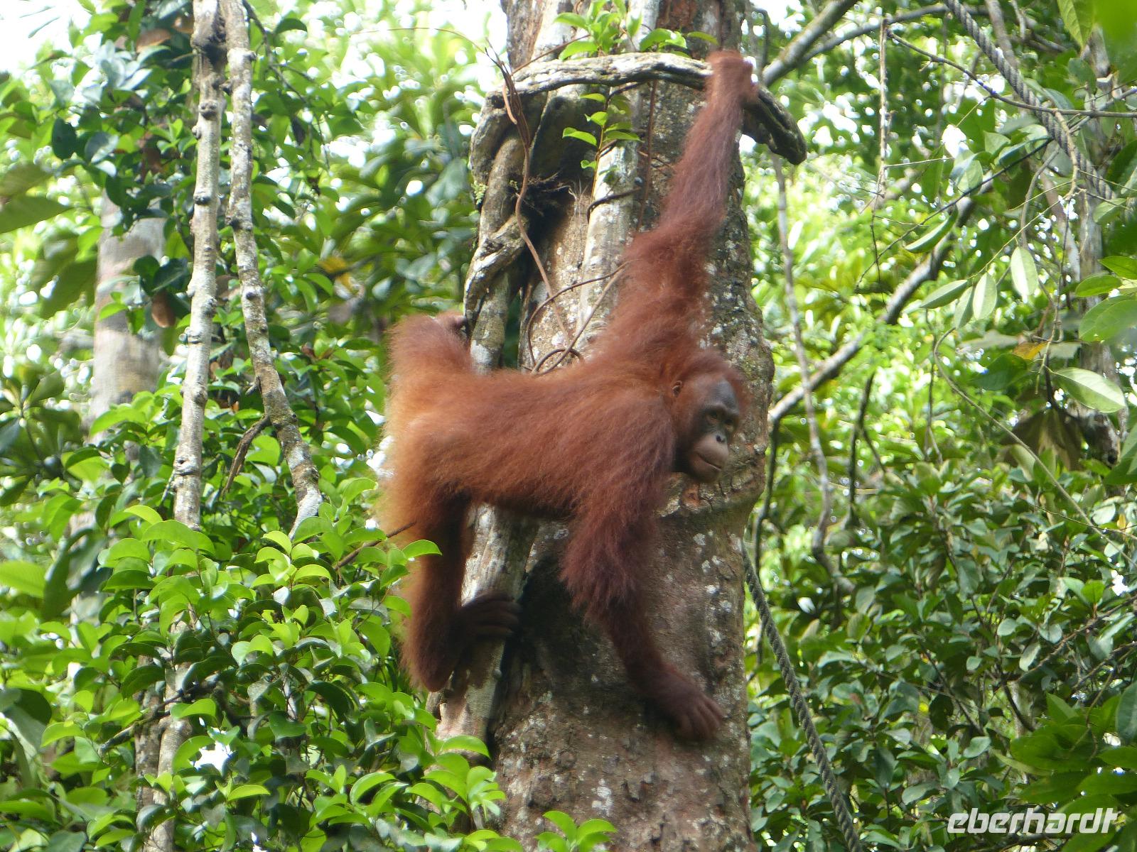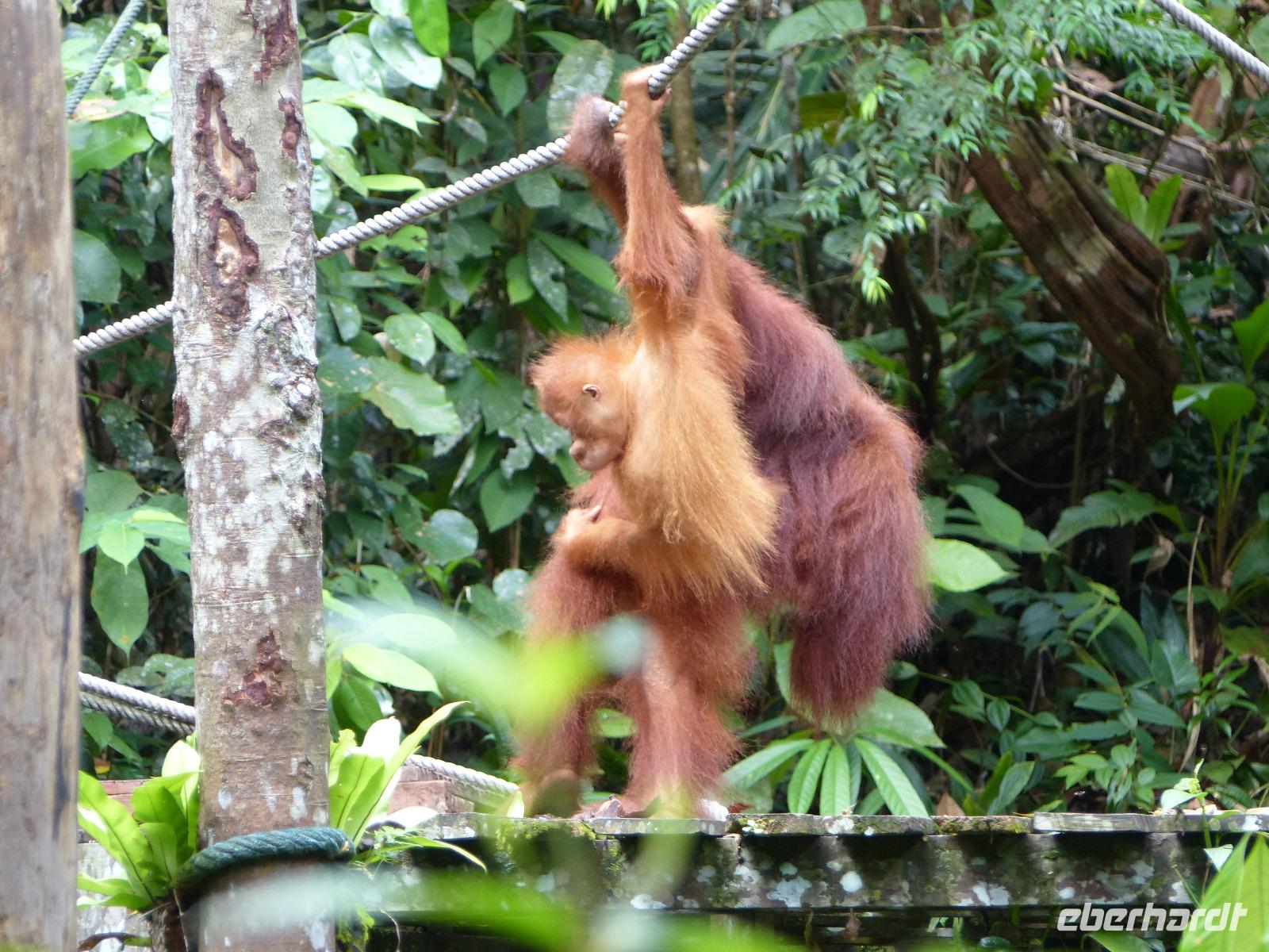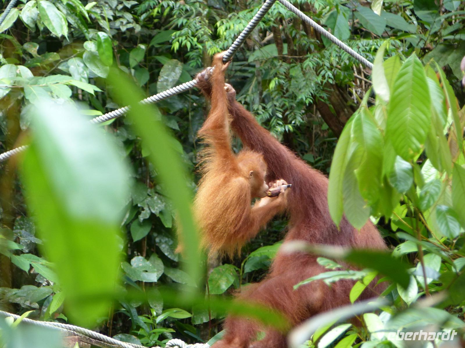 Nach einer erholsamen Nacht und einem leckeren Frühstück steht heute bereits ein erster Höhepunkt auf dem Programm- der Besuch von Semenggoh. Schon während der Fahrt erfahren wir von Nicki allerhand wissenswertes über die Menschen des Waldes, was Orang Utan vom malaiischen übersetzt bedeutet. Alle 26 in Semenggoh lebenden Orang Utans haben bereits einen langen Rehabilationsweg hinter sich und befinden sich nun in ihrer letzten Phase auf dem Weg zurück in die Wildnis. Dies heißt wiederrum für uns, dass die Affen hier halb wild sind und nur mit Glück zur Fütterungsstation kommen. Doch wir haben das Glück auf unserer Seite und können insgesamt 4 der uns zu 96,4% in der DNA gleichen Tiere beobachten. Überraschend und fast geräuschlos kommen Sie durch den dichten Dschungel. Mit vielen Fotos im Gepäck, fahren wir zurück nach Kuching, der Hauptstadt Sarawaks und unternehmen eine Rundfahrt. Wir beginnen im Südteil der Stadt, wo wir das hiesige Bürgerhaus besuchen und anhand von Fotoaufnahmen und Nickis Erklärungen viel Wissenswertes über diesen Teilstatt von Malaysia erfahren. Weiter geht es zur Katzenstatue und durch Chinatown, wo wir nach dem Besuch des taoistischen Tempels Tua Pek Kong, welcher übersetzt Tempel des mächtigen Großvaters bedeutet, auf einheimische Art und Weise einen Mittagsimbiss zu uns nehmen. Leckere, einfache Speisen erwarten uns in einer der vielen Coffeeshops. Laksa, Kolok Mee oder eine Kleinigkeit vom Buffet- für jeden ist etwas dabei. Da es ganz nach Regen aussieht, entschließen wir uns bereits jetzt die Führung durch Borneos ältestes Museum zu unternehmen. Mit zum Teil noch originalen Ausstellungsmöbeln aus England besticht dieses Museum nicht durch neuste Technik sondern eher durch seine Exponate, hinter welchen viele interessante Erklärungen schlummern. Dank Nicki bekommen wir so einen guten Überblick in die Natur-, Tier- und Kulturvielfalt Borneos. Da es nun immer noch gewittert, entschließen wir uns den letzten Teil der Stadtbesichtigung auf einen anderen Tag zu verlegen und vorerst ins Hotel zurück zu fahren. Nach etwas Zeit zum Frisch machen, treffen wir uns zu einem ersten gemeinsamen Abendessen. In unmittelbarer Nähe zum Hotel befindet sich das Top Spot Seafood Center. Hier haben wir einen der vielen großen runden Tische für uns und probieren leckere einheimische Kost- Mangofisch, Okrabohnen oder Midin, ein essbares Farn zusammen mit Knoblauch in der Pfanne angeschwitzt.