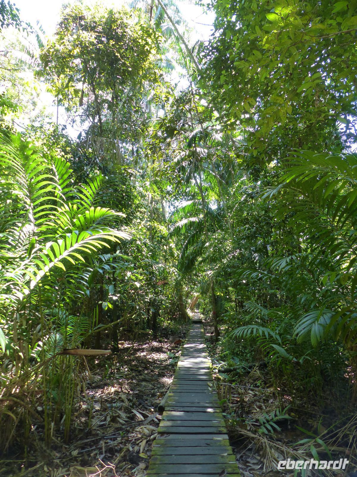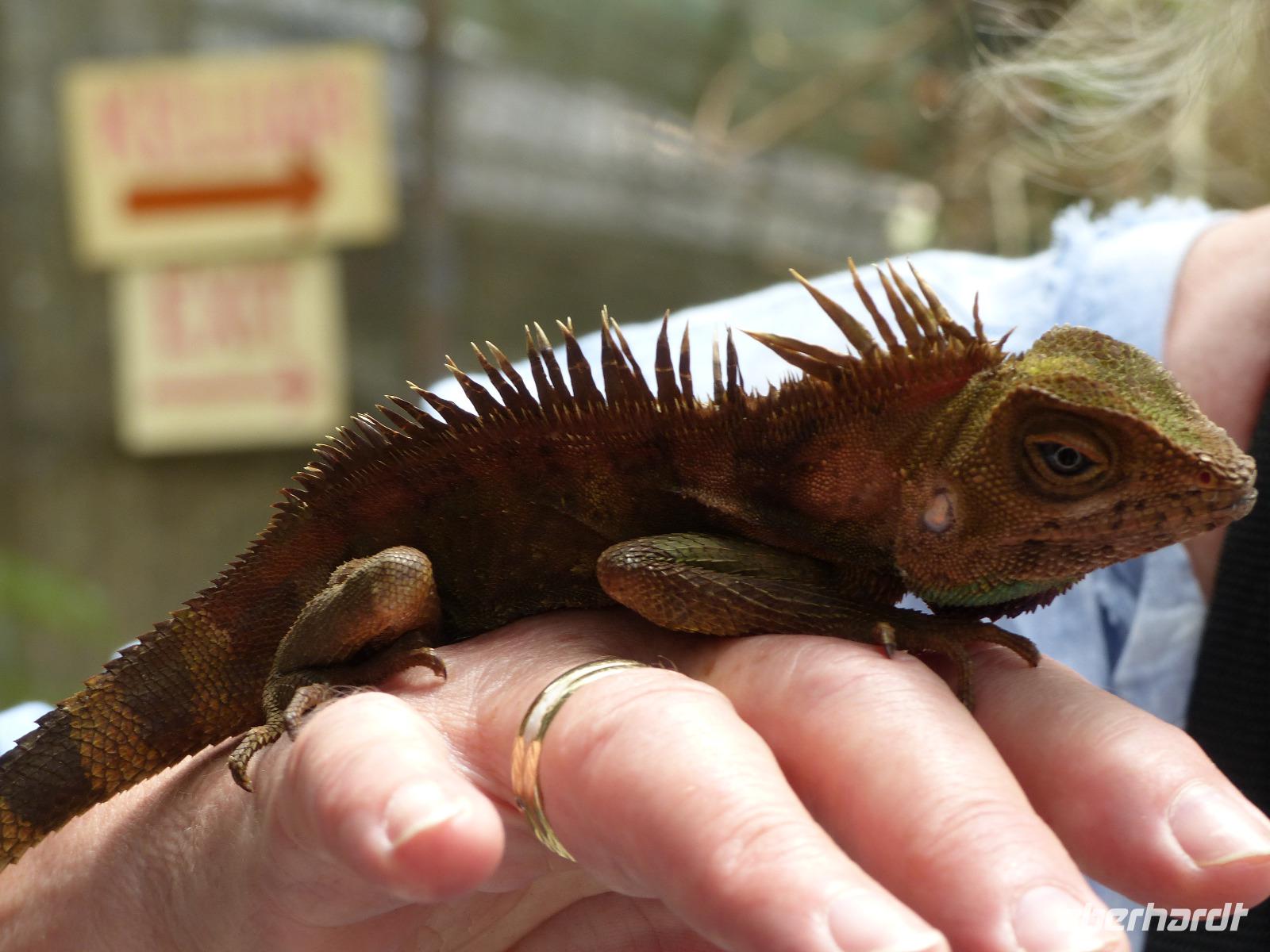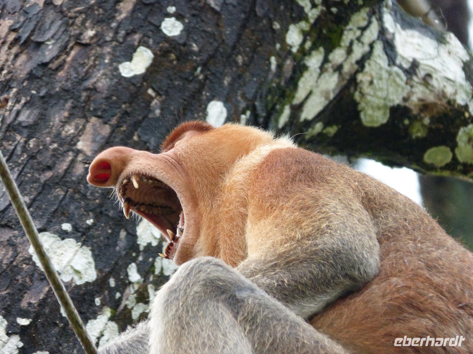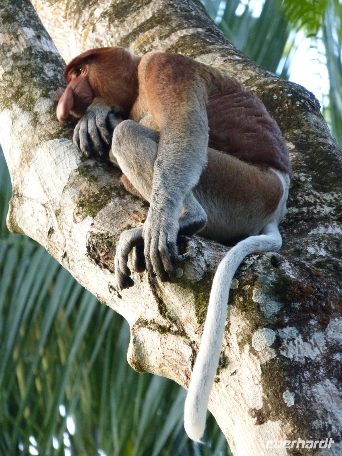 Nach einer erholsamen Nacht und einem leckeren Frühstück steht heute bereits ein erster Höhepunkt auf dem Programm- der Besuch von Semenggoh. Schon während der Fahrt erfahren wir von Nicki allerhand wissenswertes über die Menschen des Waldes, was Orang Utan vom malaiischen übersetzt bedeutet. Alle 26 in Semenggoh lebenden Orang Utans haben bereits einen langen Rehabilationsweg hinter sich und befinden sich nun in ihrer letzten Phase auf dem Weg zurück in die Wildnis. Dies heißt wiederrum für uns, dass die Affen hier halb wild sind und nur mit Glück zur Fütterungsstation kommen. Doch wir haben das Glück auf unserer Seite und können insgesamt 4 der uns zu 96,4% in der DNA gleichen Tiere beobachten. Überraschend und fast geräuschlos kommen Sie durch den dichten Dschungel. Mit vielen Fotos im Gepäck, fahren wir zurück nach Kuching, der Hauptstadt Sarawaks und unternehmen eine Rundfahrt. Wir beginnen im Südteil der Stadt, wo wir das hiesige Bürgerhaus besuchen und anhand von Fotoaufnahmen und Nickis Erklärungen viel Wissenswertes über diesen Teilstatt von Malaysia erfahren. Weiter geht es zur Katzenstatue und durch Chinatown, wo wir nach dem Besuch des taoistischen Tempels Tua Pek Kong, welcher übersetzt Tempel des mächtigen Großvaters bedeutet, auf einheimische Art und Weise einen Mittagsimbiss zu uns nehmen. Leckere, einfache Speisen erwarten uns in einer der vielen Coffeeshops. Laksa, Kolok Mee oder eine Kleinigkeit vom Buffet- für jeden ist etwas dabei. Da es ganz nach Regen aussieht, entschließen wir uns bereits jetzt die Führung durch Borneos ältestes Museum zu unternehmen. Mit zum Teil noch originalen Ausstellungsmöbeln aus England besticht dieses Museum nicht durch neuste Technik sondern eher durch seine Exponate, hinter welchen viele interessante Erklärungen schlummern. Dank Nicki bekommen wir so einen guten Überblick in die Natur-, Tier- und Kulturvielfalt Borneos. Da es nun immer noch gewittert, entschließen wir uns den letzten Teil der Stadtbesichtigung auf einen anderen Tag zu verlegen und vorerst ins Hotel zurück zu fahren. Nach etwas Zeit zum Frisch machen, treffen wir uns zu einem ersten gemeinsamen Abendessen. In unmittelbarer Nähe zum Hotel befindet sich das Top Spot Seafood Center. Hier haben wir einen der vielen großen runden Tische für uns und probieren leckere einheimische Kost- Mangofisch, Okrabohnen oder Midin, ein essbares Farn zusammen mit Knoblauch in der Pfanne angeschwitzt.