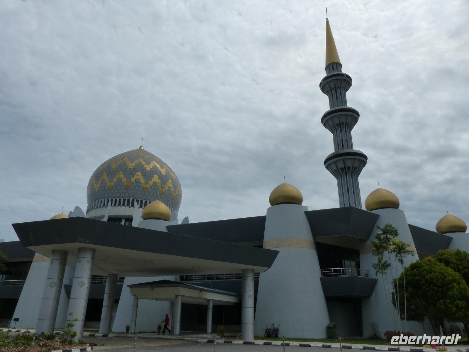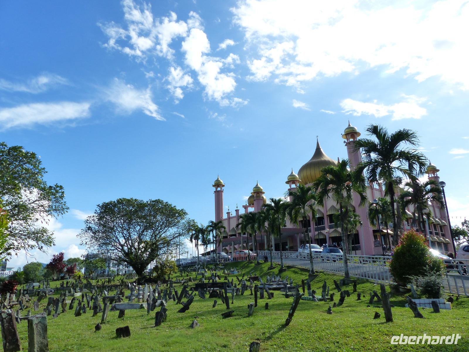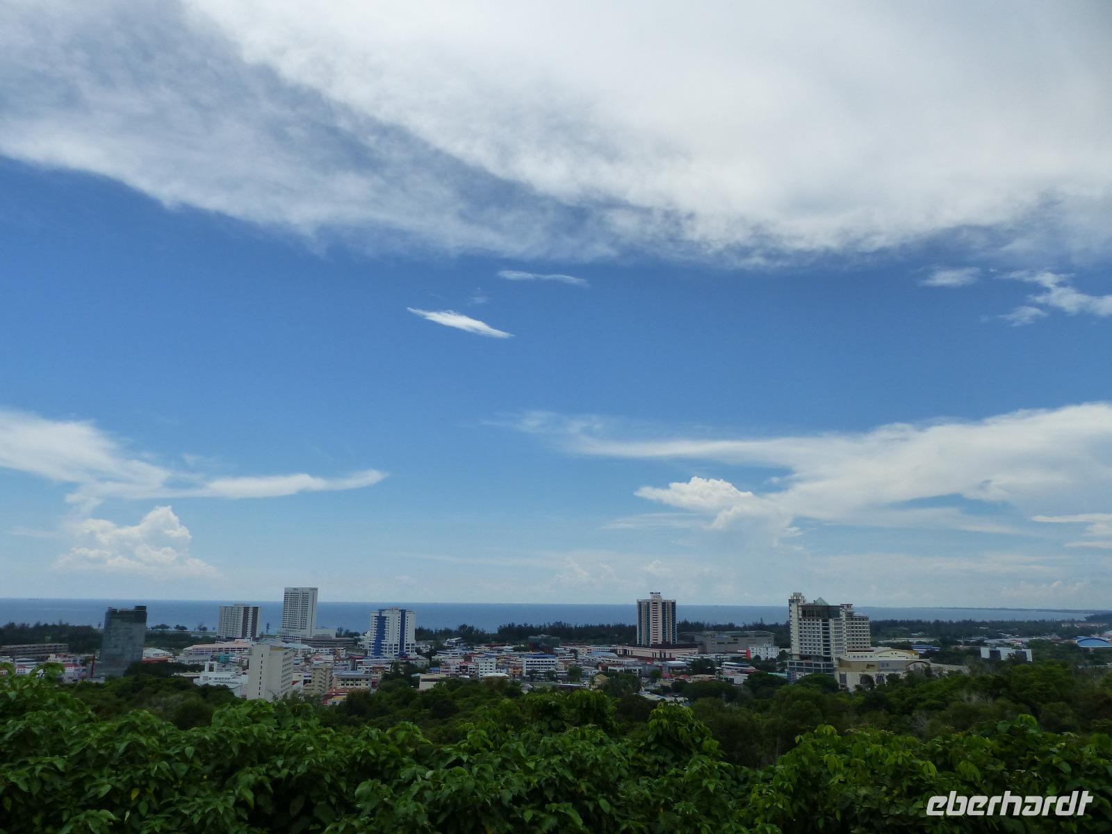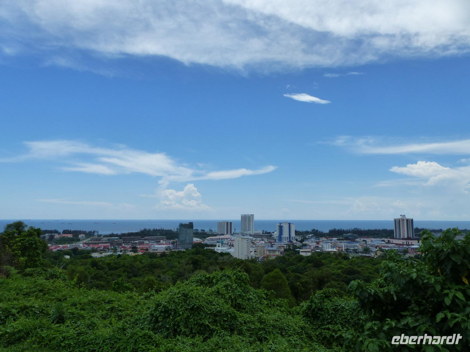 Mit gepackten Koffern im Gepäck heißt es heute Abschied nehmen vom Gunung Mulu Nationalpark. Anders als ursprünglich geplant, fliegen wir heute nicht direkt nach Kota Kinabalu, sondern über Miri, der zweit größten Stadt in Sarawak. Da wir hier einen längeren Aufenthalt haben, nutzen wir die Zeit um auch diese Stadt etwas näher kennen zu lernen. 1910 wurde in Miri die erste Ölquelle Sarawaks entdeckt, was die anfangs unscheinbare Küstenstadt stark expandieren lies. Noch heute erinnert ein Denkmal auf dem Canada Hill, welches liebevoll Grand Old Lady genannt wird, an den ersten Bohrturm der Stadt. Kurz nach dem Mittagessen steht selbstverständlich auch ein Besuch dessen an, wo wir zugleich einen tollen Ausblick über die Stadt genießen können. Doch bevor es soweit ist, fahren wir erst einmal in das Zentrum der Stadt, wo wir auf dem Weg den größten taoistischen Tempel in ganz Südostasien besuchen. Der Lian Hua San Tempel beeindruckt vor allem durch sein gigantisches Eingangstor und seinen reichverzierten Bau. Da heute zugleich ein Feiertag ist und die Buddhisten den Geburtstag Buddhas feiern, besuchen wir die buddhistische Gemeinde der Stadt. Mit einem freundlichen Lächeln werden wir herzlich begrüßt und in Empfang genommen. Eine reichliche halbe Stunde verbringen wir hier, da die Atmosphäre so einmalig ist. Bevor wir dann erneut in den Flieger steigen, halten wir auch an einem einheimischen Obst- und Gemüsemarkt, bei dem wir mit offenen Ohren Nickis Erklärungen ein letztes Mal lauschen. Dann heißt es Abschied nehmen und auf nach Kota Kinabalu, der Hauptstadt des ebenso auf Borneo gelegenen Bundesstaates Sabah. Auf dem Flughafen werden wir von unserem neuen Reiseleiter Gordon in Empfang genommen. Schon auf dem Weg zum Hotel erfahren wir einige Informationen über die Stadt, welche wir dann am Abend gemeinsam in der Gruppe zu Fuß entdecken.