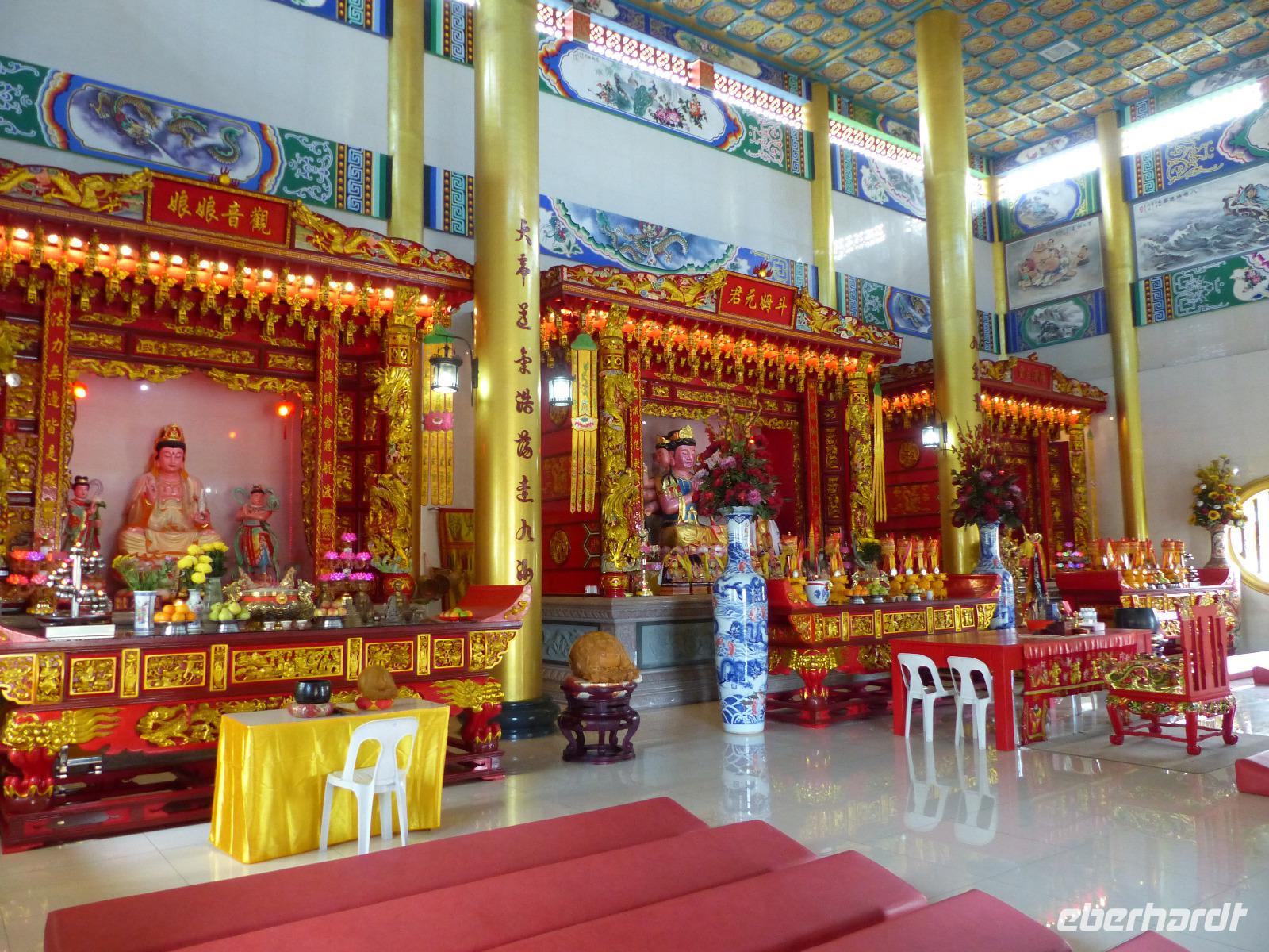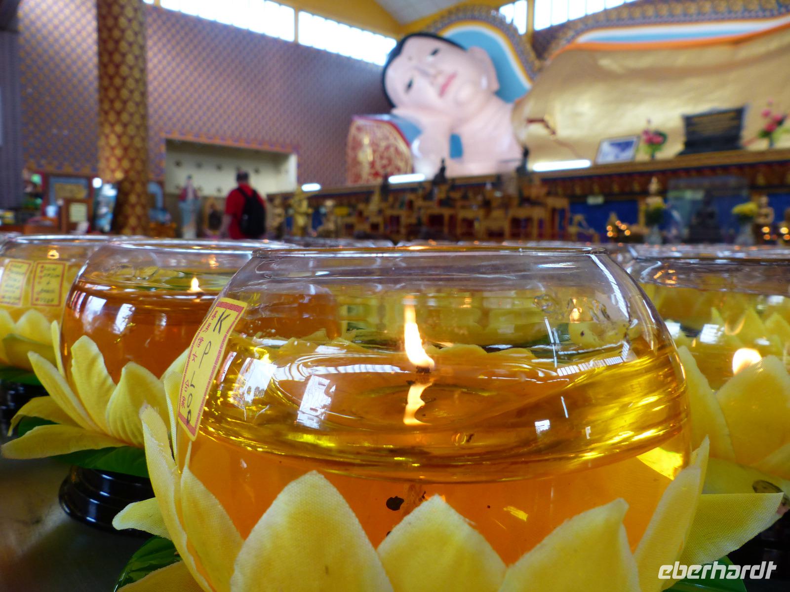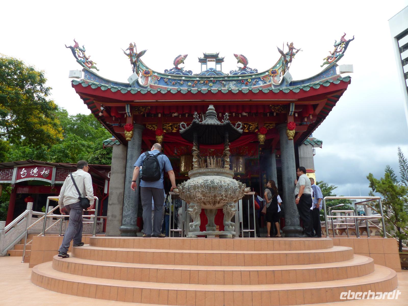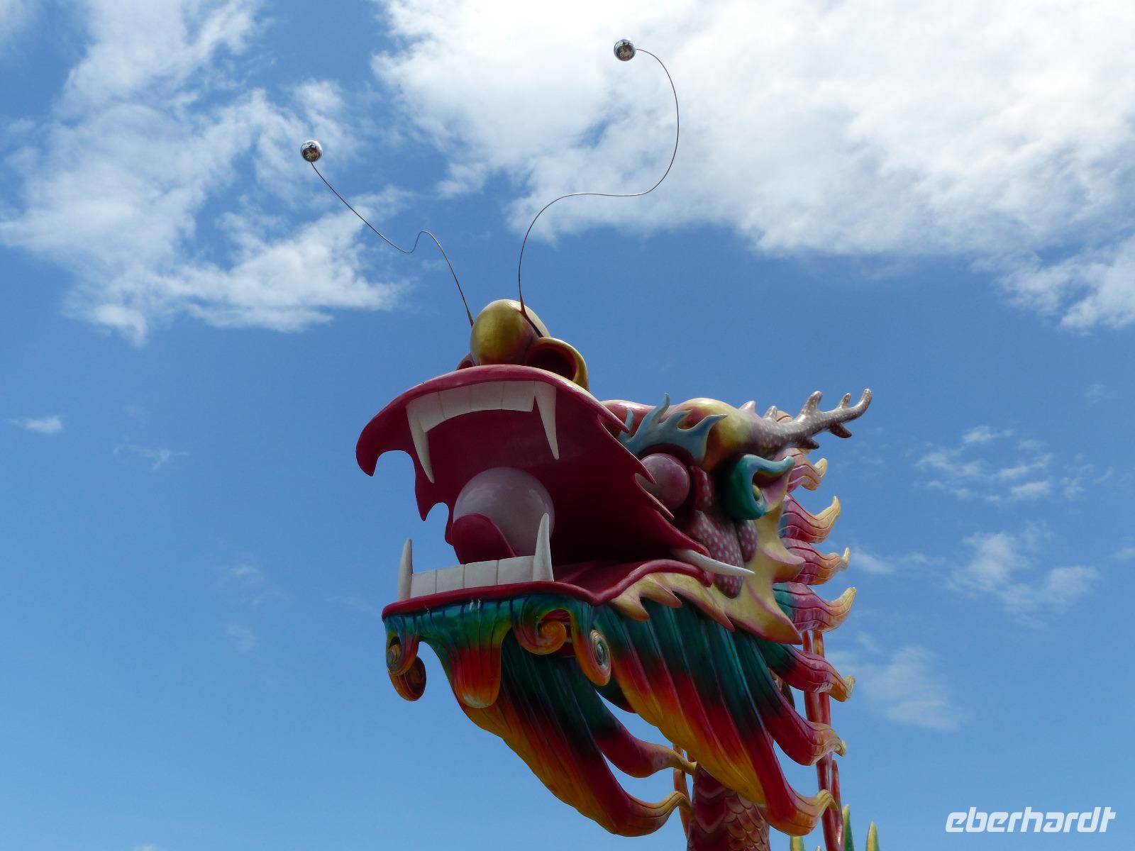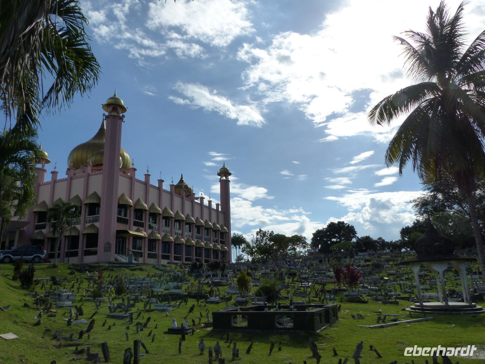 Mit gepackten Koffern im Gepäck heißt es heute Abschied nehmen vom Gunung Mulu Nationalpark. Anders als ursprünglich geplant, fliegen wir heute nicht direkt nach Kota Kinabalu, sondern über Miri, der zweit größten Stadt in Sarawak. Da wir hier einen längeren Aufenthalt haben, nutzen wir die Zeit um auch diese Stadt etwas näher kennen zu lernen. 1910 wurde in Miri die erste Ölquelle Sarawaks entdeckt, was die anfangs unscheinbare Küstenstadt stark expandieren lies. Noch heute erinnert ein Denkmal auf dem Canada Hill, welches liebevoll Grand Old Lady genannt wird, an den ersten Bohrturm der Stadt. Kurz nach dem Mittagessen steht selbstverständlich auch ein Besuch dessen an, wo wir zugleich einen tollen Ausblick über die Stadt genießen können. Doch bevor es soweit ist, fahren wir erst einmal in das Zentrum der Stadt, wo wir auf dem Weg den größten taoistischen Tempel in ganz Südostasien besuchen. Der Lian Hua San Tempel beeindruckt vor allem durch sein gigantisches Eingangstor und seinen reichverzierten Bau. Da heute zugleich ein Feiertag ist und die Buddhisten den Geburtstag Buddhas feiern, besuchen wir die buddhistische Gemeinde der Stadt. Mit einem freundlichen Lächeln werden wir herzlich begrüßt und in Empfang genommen. Eine reichliche halbe Stunde verbringen wir hier, da die Atmosphäre so einmalig ist. Bevor wir dann erneut in den Flieger steigen, halten wir auch an einem einheimischen Obst- und Gemüsemarkt, bei dem wir mit offenen Ohren Nickis Erklärungen ein letztes Mal lauschen. Dann heißt es Abschied nehmen und auf nach Kota Kinabalu, der Hauptstadt des ebenso auf Borneo gelegenen Bundesstaates Sabah. Auf dem Flughafen werden wir von unserem neuen Reiseleiter Gordon in Empfang genommen. Schon auf dem Weg zum Hotel erfahren wir einige Informationen über die Stadt, welche wir dann am Abend gemeinsam in der Gruppe zu Fuß entdecken.
