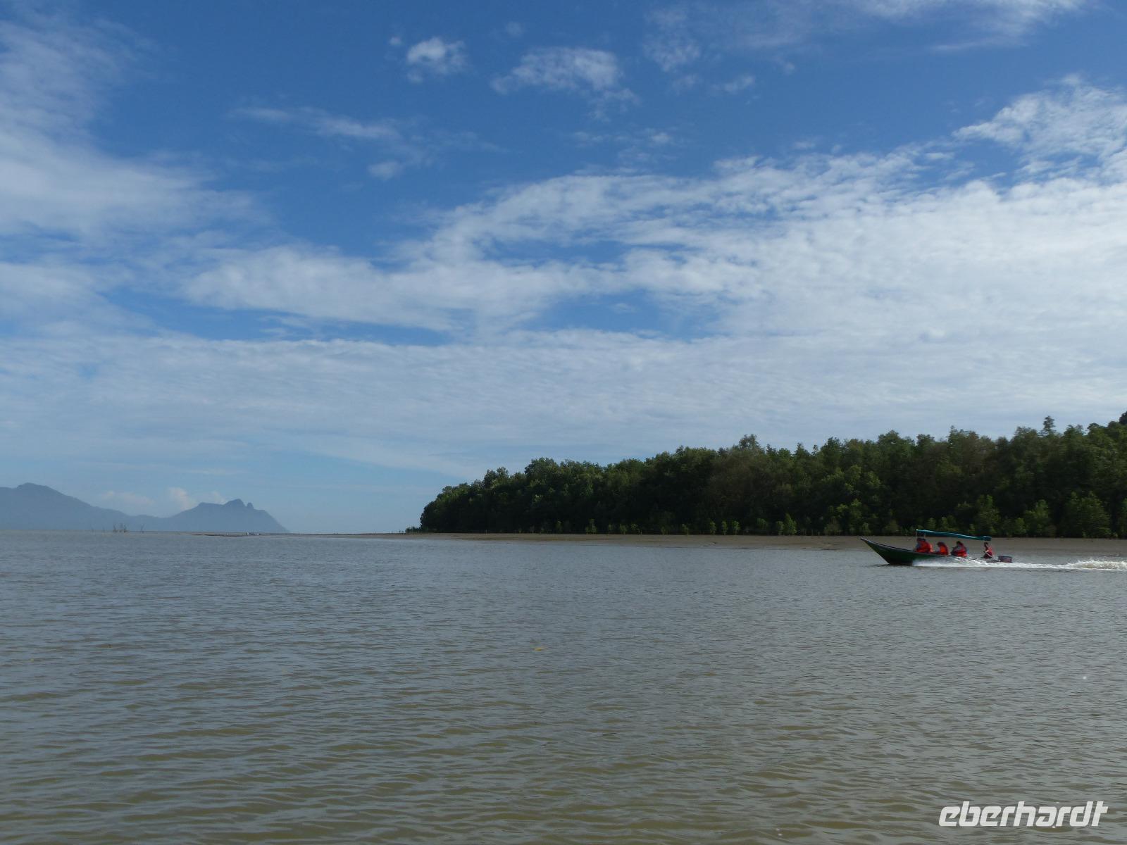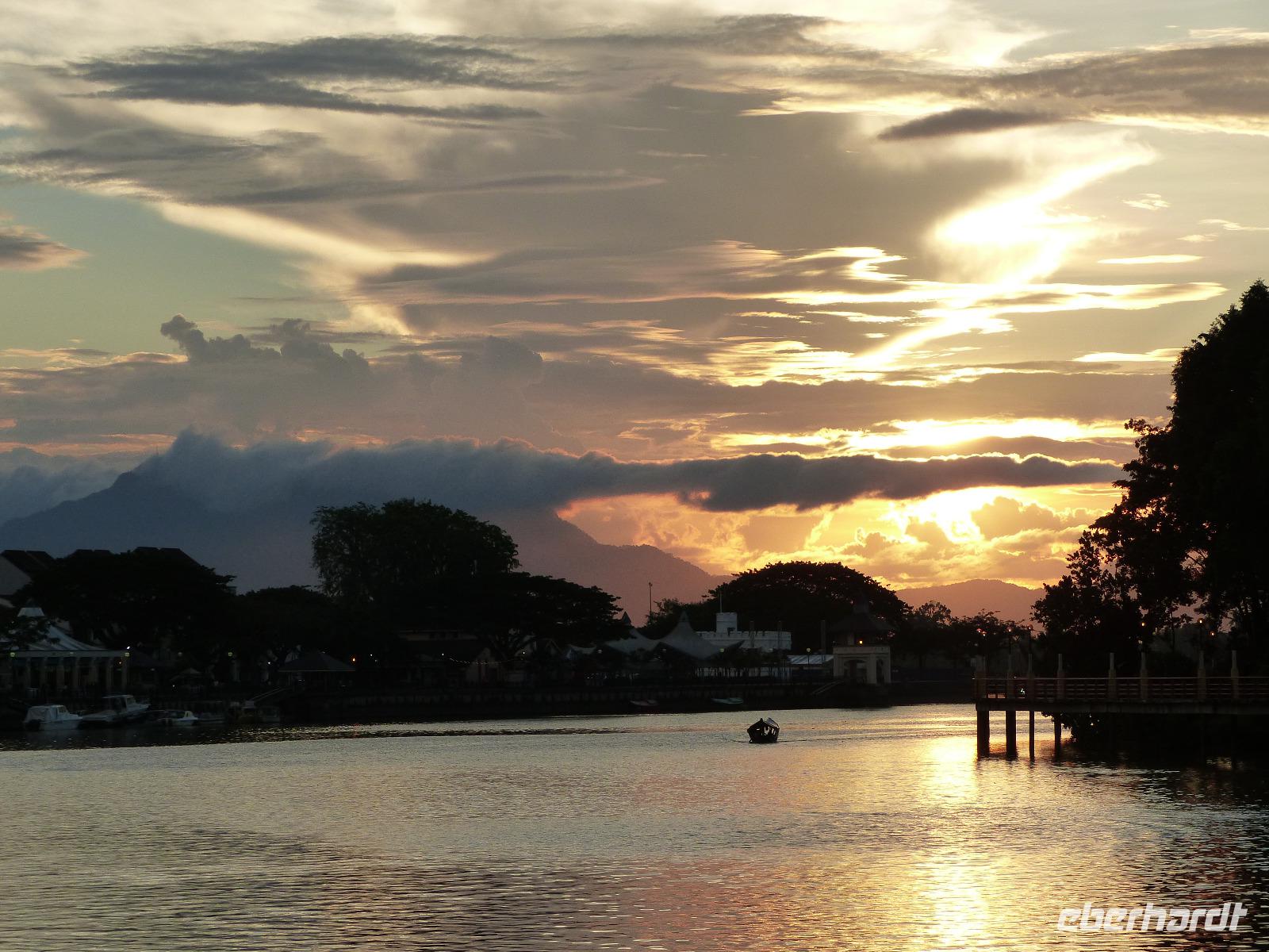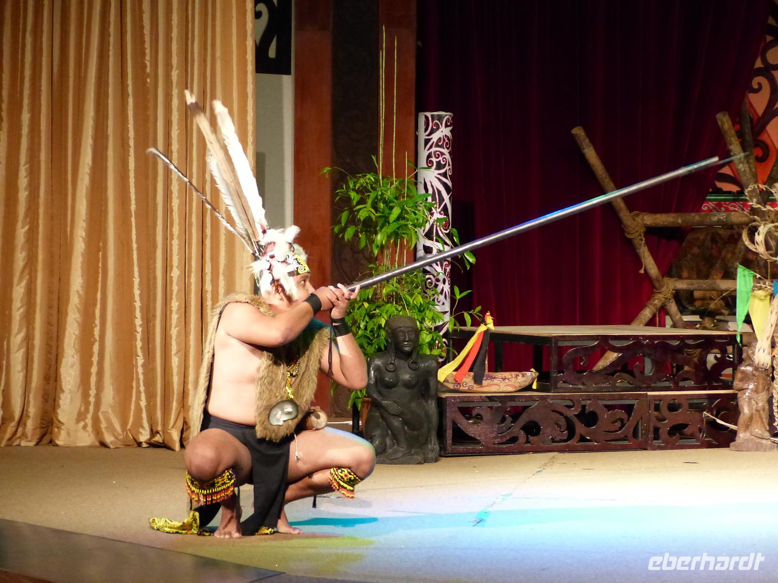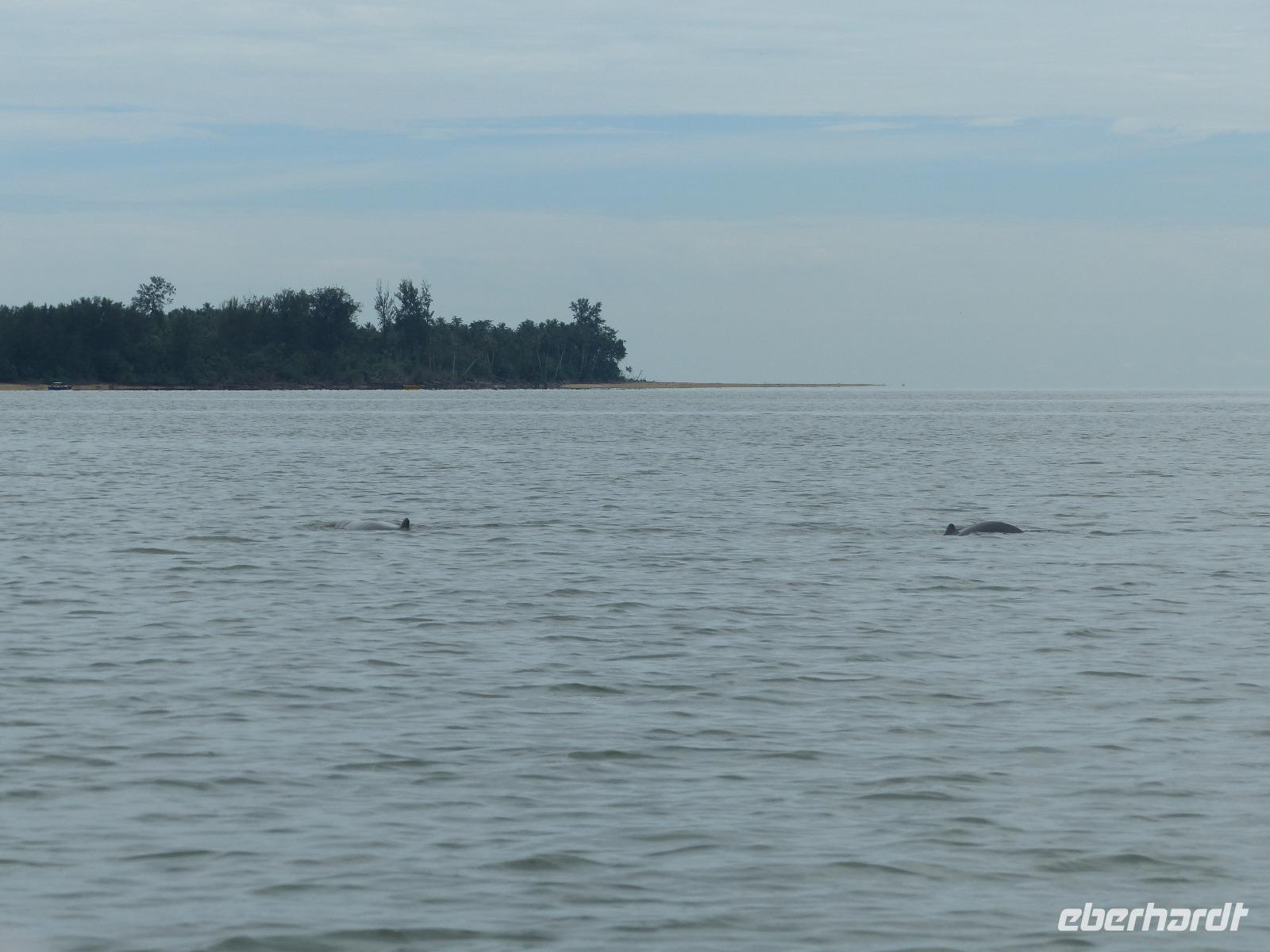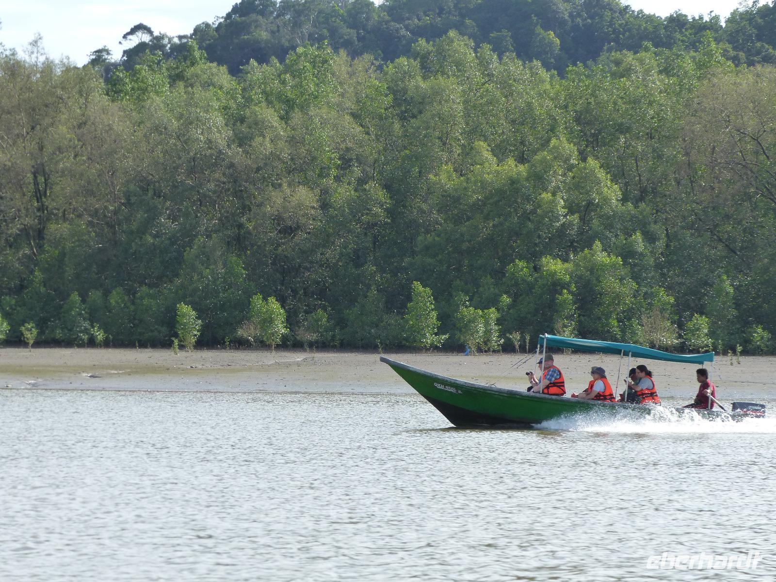 Gegen 9 Uhr starten wir heute unsere Tour in Richtung Santubong Halbinsel. Wir verlassen Kuching und fahren ca. eine halbe Stunde mit dem Bus bevor wir diesen gegen ein Boot eintauschen. Das Wetter ist heute ideal für Tierbeobachtungen, denn es regnet nicht und zugleich ist es nicht zu heiß, da Wolken eine direkte Sonneneinstrahlung verhindern. Unsere Bootsfahrt führt uns Flussabwärts in den Mündungsbereich des Santubong-Flusses. Hier halten wir nun besonders unsere Augen offen, denn die seltenen Irrawaddy Delfine sind hier mit etwas Glück im Wasser zu entdecken. Eine wulstige Stirn, eine auffallend kurze Schnautze und eine Körperlänge von 2,8 Meter sind charakteristisch für diese stark bedrohte Tierart. Dann wird das Boot auf einmal langsamer und etwas rosanes taucht kurz an der Wasseroberfläche auf- mit staunen stellen wir fest, so eben eine andere Delfinart gesehen zu haben- einen Indopazifischen Buckeldelfin. Mit wachsamen Augen beobachten wir weiter und es dauert nicht lange, und auch der erste Irrawaddy Delfin zeigt sich- ein wunderschönes und einmaliges Erlebnis! Während unserer Fahrt in den Kuching Wetlands Nationalpark, können wir nun immer wieder an verschiedenen Stellen Irrawaddy Delfine entdecken. Aber auch ein Krokodil zeigt sich uns am Ufer während wir durch die Mangroven fahren. Bevor es dann zurück zur Bootsanlegestelle geht, steigen wir noch in einem malaiischen Fischerdorf aus und unternehmen einen kleinen Spaziergang. Passend zur Mittagszeit begeben wir uns weiter nach Damai, wo wir im Cultural Village zuerst einige leckere einheimische Speisen, wie Hühnchen im Bambusrohr, probieren und dann eine Führung gemeinsam mit unserer Reiseleiterin Nicki durch die Anlage unternehmen. Wir besichtigen die unterschiedlichen Behausungen der Dayak, Malaiien und Chinesen und lernen somit viel über deren unterschiedliche Kultur und Lebensweise kennen. Bei einer anschließenden Tanzvorführung lauschen wir einheimischer Musik und schauen den traditionellen Tänzen der verschiedenen Gruppen zu. Nach der Rückkehr in Kuching am späten Nachmittag, lassen wir uns das Abendessen in einem gemütlichen Restaurant direkt an der Wasserfront schmecken.