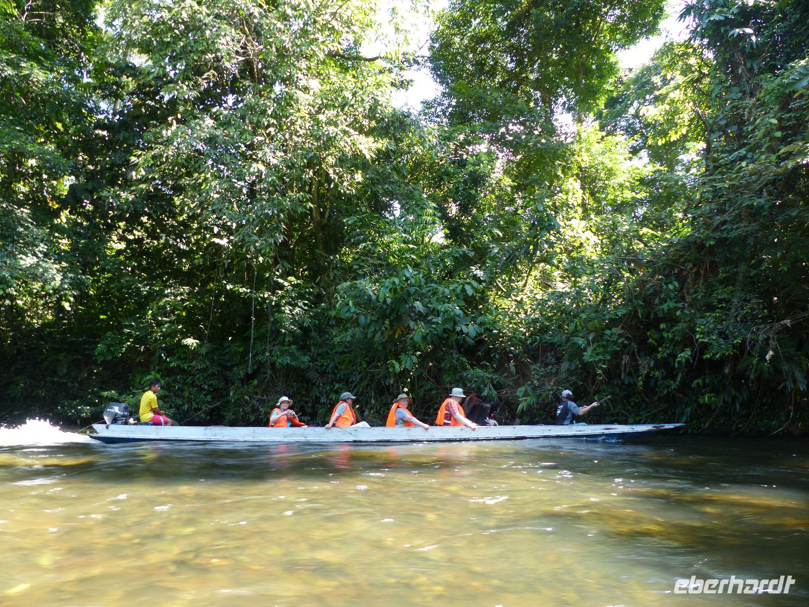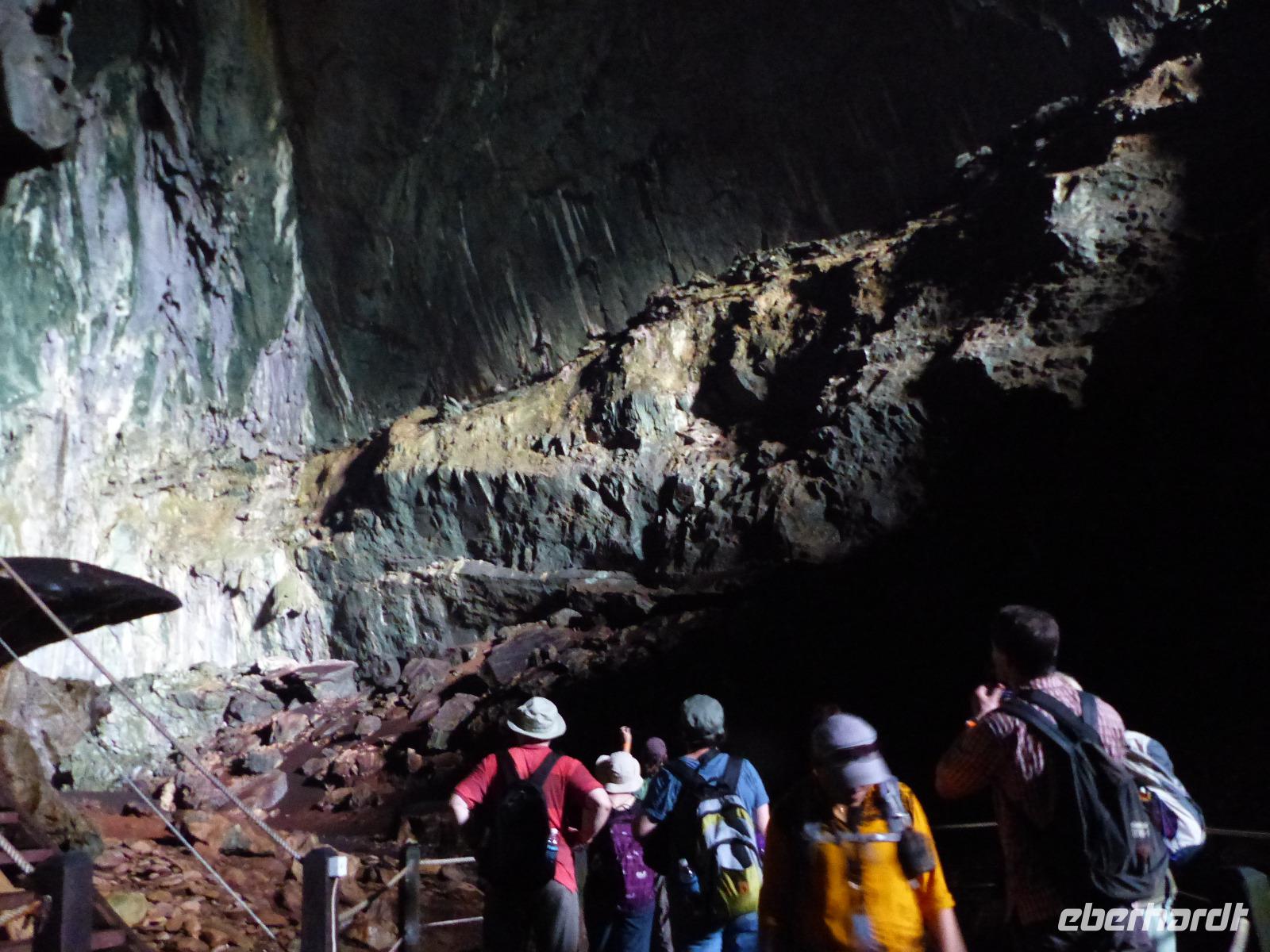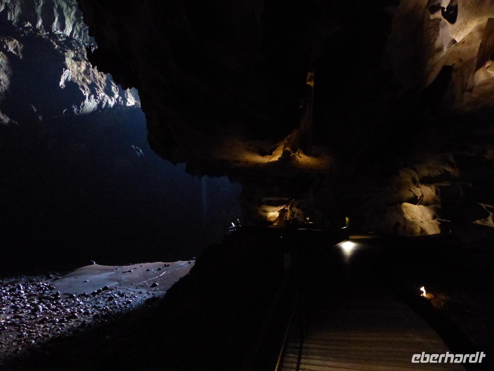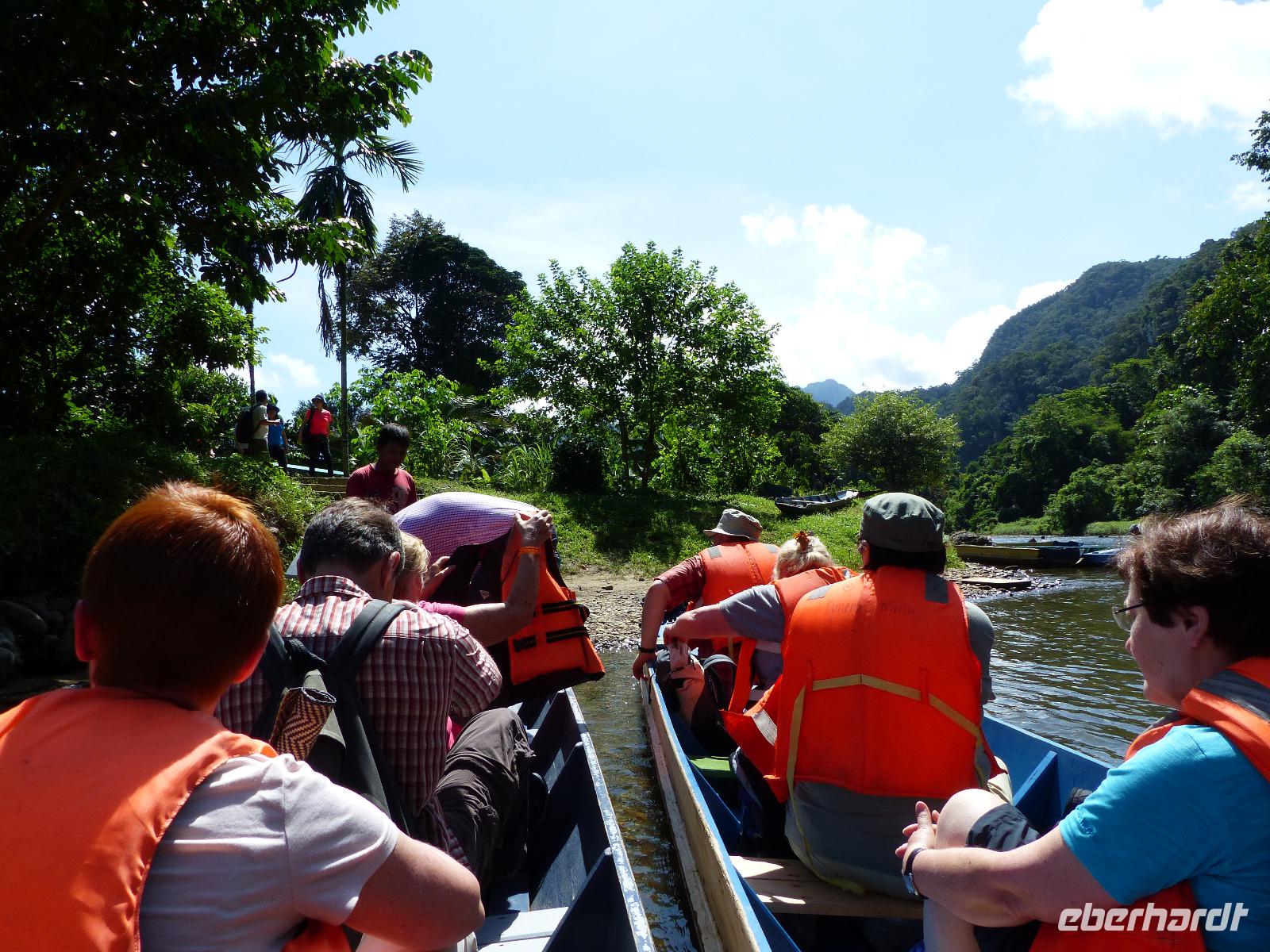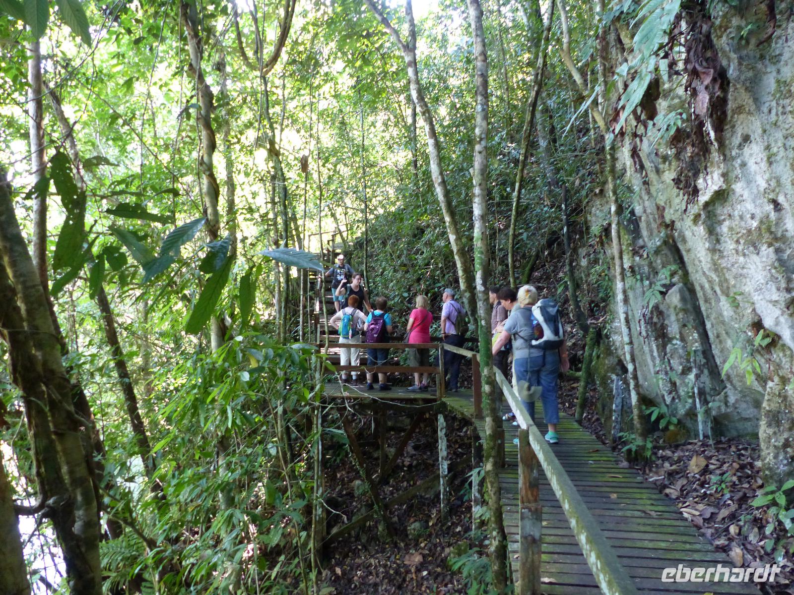 Nach einem ausgedehnten Frühstück begeben wir uns heute erneut auf Höhlentour. Diesmal bewegen wir uns aber nicht nur zu Fuß, sondern auch mit einem traditionellen Langboot fort. Direkt vom Bootssteg des Hotels fahren wir auf dem Fluss entlang bis wir zu einer kleinen Siedlung kommen. Hier steigen wir aus und besuchen den hiesigen Markt, wo verschiedene Handwerksarbeiten zum Kauf angeboten werden. Die sonst als Nomaden lebenden Penan haben sich hier niedergelassen und leben nun von und mit dem Park, durch dessen Besucher sie unteranderem ihr Einkommen erzielen. So wird zum Beispiel das Blasrohrschießen demonstriert, wo sich der ein oder andere von uns auch selbst daran versucht. Im Anschluss geht es für uns weiter zur ersten Höhle des Tages - der Wind Cave. Nach einem kurzen Anstieg haben wir den Eingang der Höhle erreicht und begeben uns in deren Inneres. Besonders fasziniert natürlich die Königskammer, welche mit ihren verschiedenen Stalagtiten und Stalagmiten erneut wunderschöne Gebilde in unseren Köpfen entstehen lässt. Auf einem kleinen Plankenweg spazieren wir im Anschluss weiter zur Clear Water Cave, welche sich nur durch eine Vielzahl an Stufen besuchen lässt. Doch für all diejenigen, die diese Anstrengung nicht in Kauf nehmen möchten, bietet ein klarer natürlicher Pool Erfrischung und ein kleiner Rastplatz Erholung. Für alle anderen heißt es noch einmal schwitzen, und nach ca.200 Stufen bergauf können wir eines der längsten Höhlensysteme der Welt bewundern. Um allerdings die Höhle etwas entdecken zu können, muss man im Inneren erneut diverse Stufen in Kauf nehmen. Eine Treppe führt hinab in ein Labyrinth aus Passagen und Höhlen, welches vom gleichnamigen Clearwater-Fluss durchflossen wird. Als wir wieder bei unserem Picknick-Platz ankommen, hat Kate bereits den Tisch gedeckt und wir können direkt das von ihr selbst gekochte Essen probieren. Nach einer kleinen Pause geht es dann langsam wieder mit dem Boot zurück in Richtung Hotel, wo der ein oder andere die freie Zeit nutzt etwas am Pool zu entspannen oder im Park eine Wanderung durch die Baumwipfel zu unternehmen. Zum Abendessen sind wir dann alle wieder gemeinsam im Restaurant und lassen uns leckere Speisen schmecken. Auch der in Sarawak bekannte Kek Lapis (Schichtkuchen) wird heute als Geburtstagskuchen probiert.