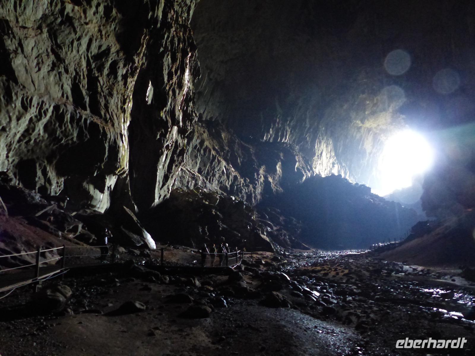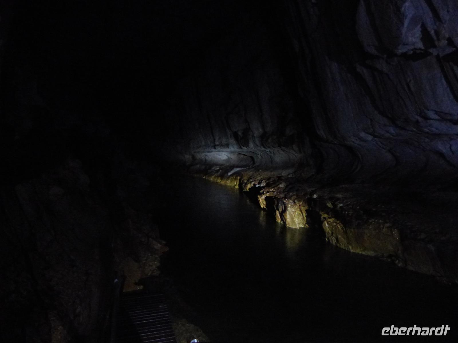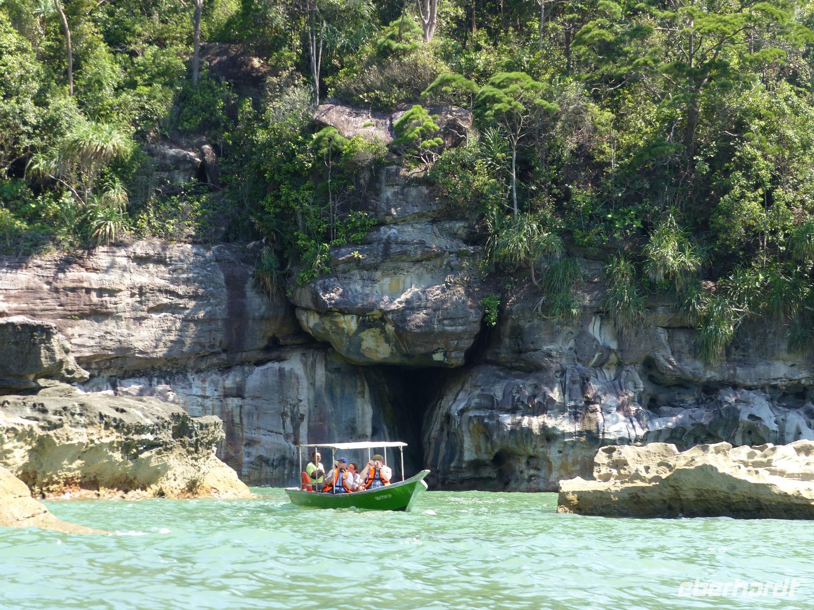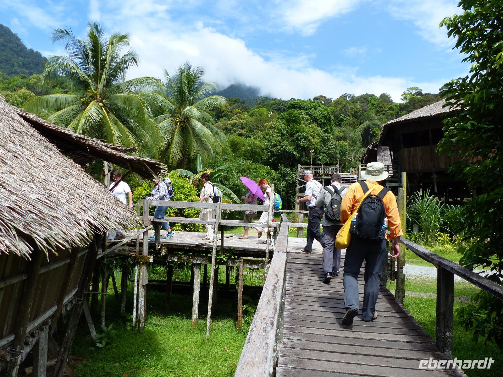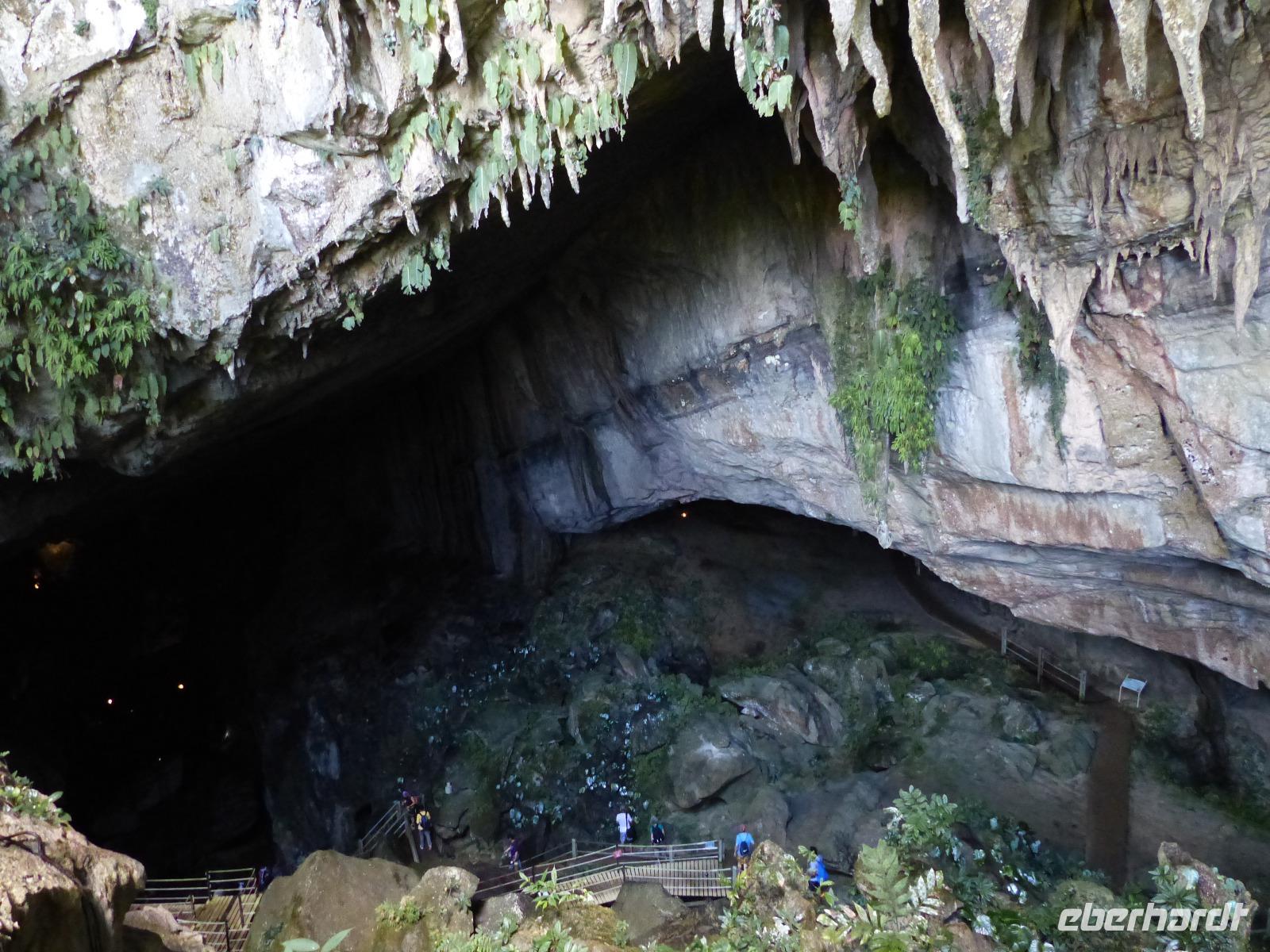 Nach einem ausgedehnten Frühstück begeben wir uns heute erneut auf Höhlentour. Diesmal bewegen wir uns aber nicht nur zu Fuß, sondern auch mit einem traditionellen Langboot fort. Direkt vom Bootssteg des Hotels fahren wir auf dem Fluss entlang bis wir zu einer kleinen Siedlung kommen. Hier steigen wir aus und besuchen den hiesigen Markt, wo verschiedene Handwerksarbeiten zum Kauf angeboten werden. Die sonst als Nomaden lebenden Penan haben sich hier niedergelassen und leben nun von und mit dem Park, durch dessen Besucher sie unteranderem ihr Einkommen erzielen. So wird zum Beispiel das Blasrohrschießen demonstriert, wo sich der ein oder andere von uns auch selbst daran versucht. Im Anschluss geht es für uns weiter zur ersten Höhle des Tages - der Wind Cave. Nach einem kurzen Anstieg haben wir den Eingang der Höhle erreicht und begeben uns in deren Inneres. Besonders fasziniert natürlich die Königskammer, welche mit ihren verschiedenen Stalagtiten und Stalagmiten erneut wunderschöne Gebilde in unseren Köpfen entstehen lässt. Auf einem kleinen Plankenweg spazieren wir im Anschluss weiter zur Clear Water Cave, welche sich nur durch eine Vielzahl an Stufen besuchen lässt. Doch für all diejenigen, die diese Anstrengung nicht in Kauf nehmen möchten, bietet ein klarer natürlicher Pool Erfrischung und ein kleiner Rastplatz Erholung. Für alle anderen heißt es noch einmal schwitzen, und nach ca.200 Stufen bergauf können wir eines der längsten Höhlensysteme der Welt bewundern. Um allerdings die Höhle etwas entdecken zu können, muss man im Inneren erneut diverse Stufen in Kauf nehmen. Eine Treppe führt hinab in ein Labyrinth aus Passagen und Höhlen, welches vom gleichnamigen Clearwater-Fluss durchflossen wird. Als wir wieder bei unserem Picknick-Platz ankommen, hat Kate bereits den Tisch gedeckt und wir können direkt das von ihr selbst gekochte Essen probieren. Nach einer kleinen Pause geht es dann langsam wieder mit dem Boot zurück in Richtung Hotel, wo der ein oder andere die freie Zeit nutzt etwas am Pool zu entspannen oder im Park eine Wanderung durch die Baumwipfel zu unternehmen. Zum Abendessen sind wir dann alle wieder gemeinsam im Restaurant und lassen uns leckere Speisen schmecken. Auch der in Sarawak bekannte Kek Lapis (Schichtkuchen) wird heute als Geburtstagskuchen probiert.