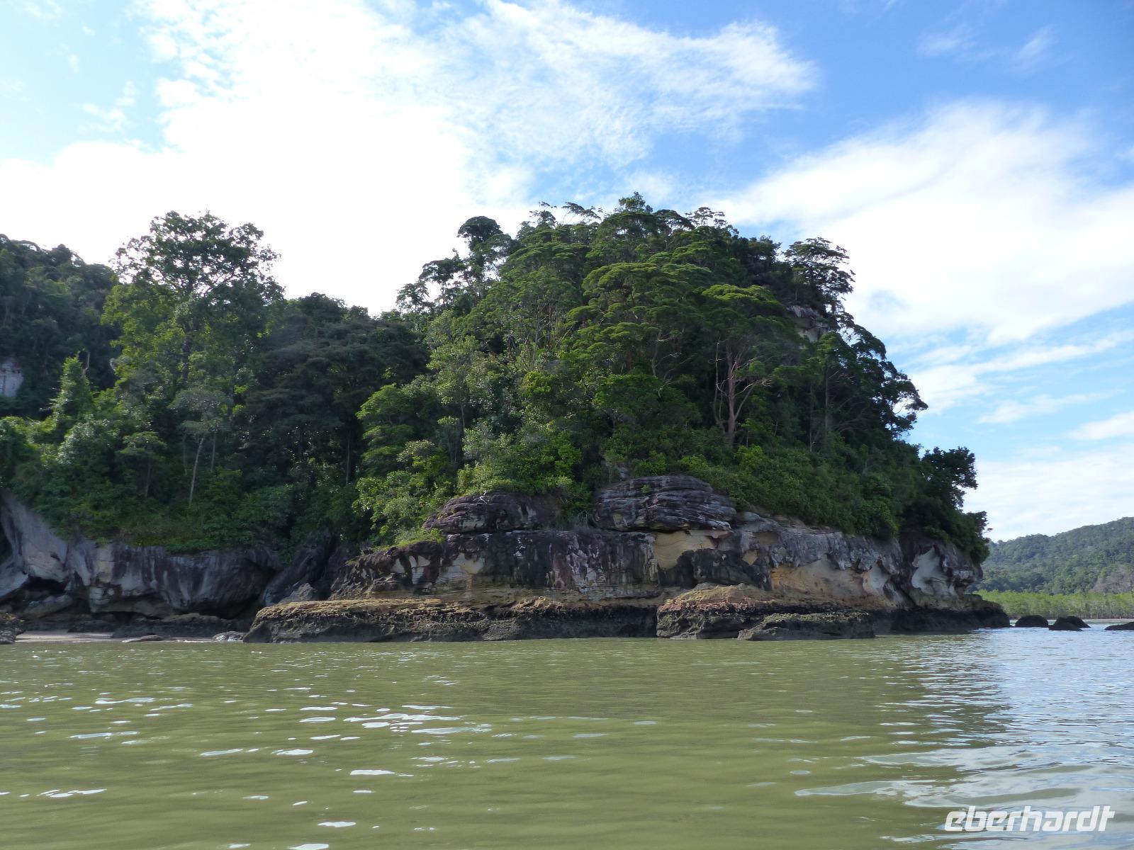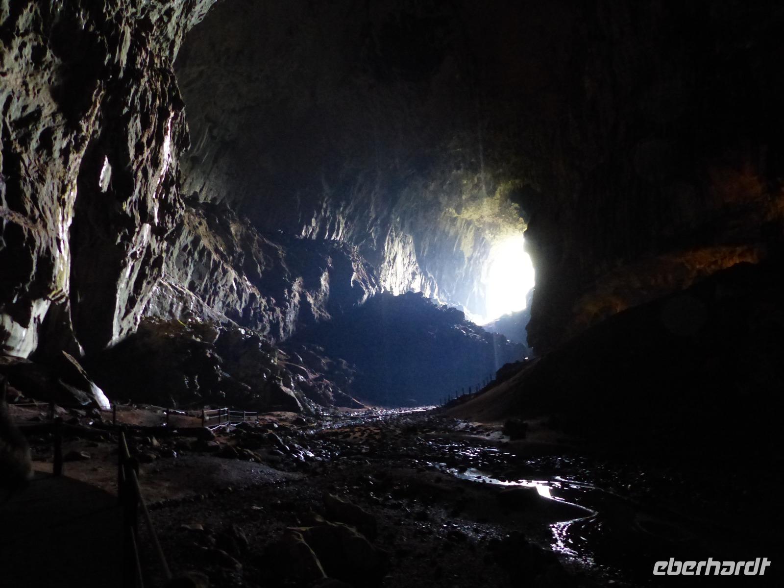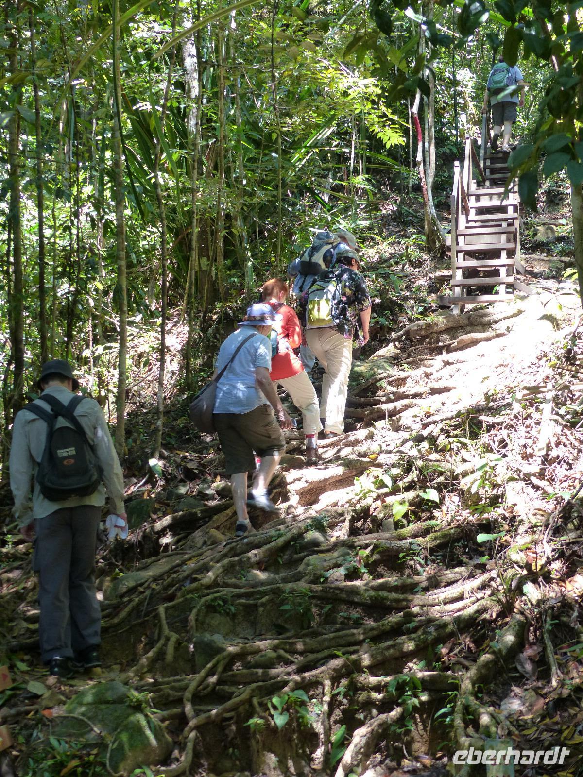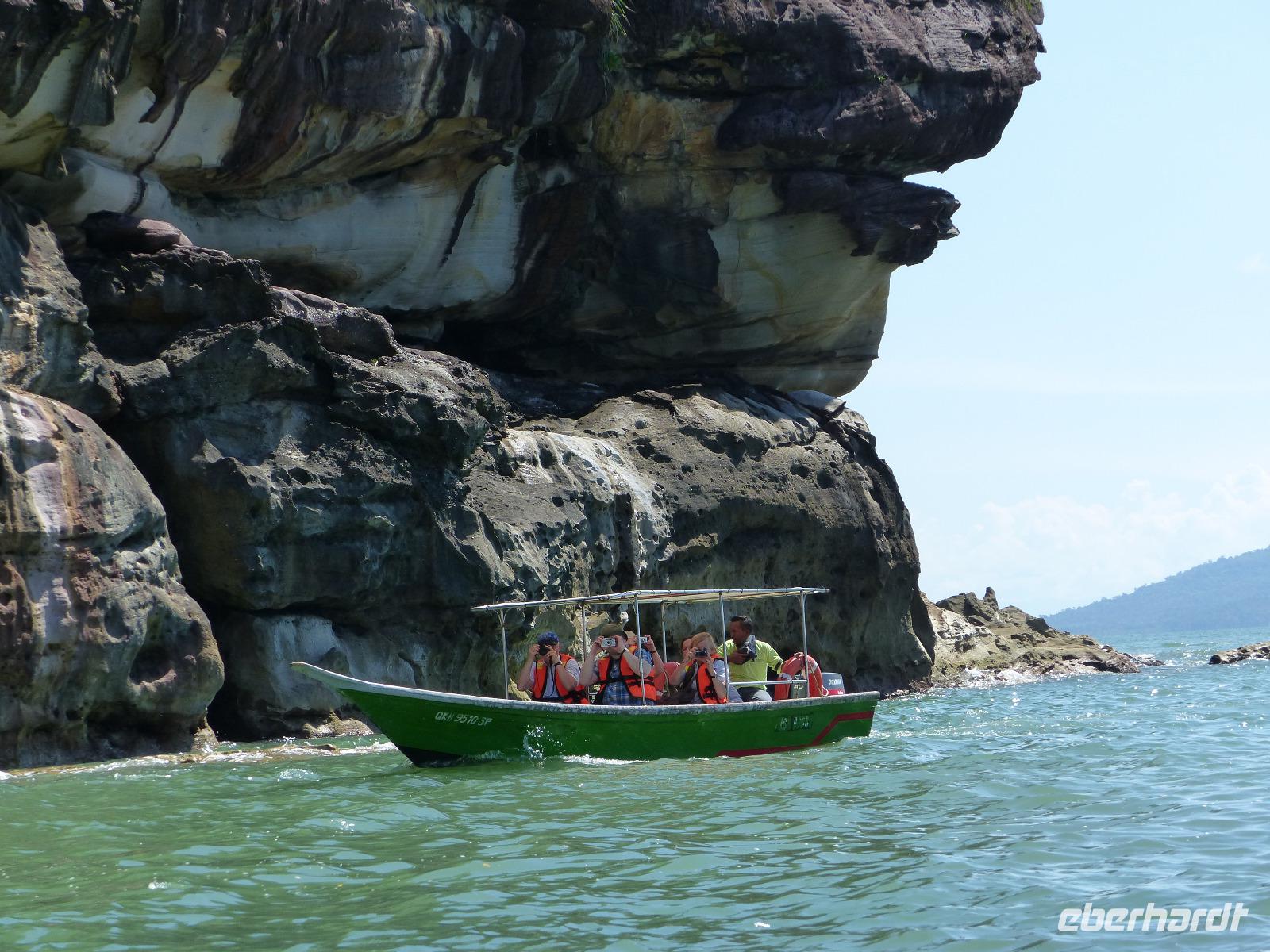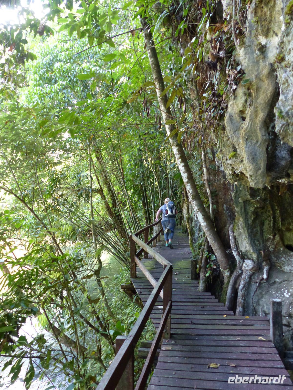 Nach einem ausgedehnten Frühstück begeben wir uns heute erneut auf Höhlentour. Diesmal bewegen wir uns aber nicht nur zu Fuß, sondern auch mit einem traditionellen Langboot fort. Direkt vom Bootssteg des Hotels fahren wir auf dem Fluss entlang bis wir zu einer kleinen Siedlung kommen. Hier steigen wir aus und besuchen den hiesigen Markt, wo verschiedene Handwerksarbeiten zum Kauf angeboten werden. Die sonst als Nomaden lebenden Penan haben sich hier niedergelassen und leben nun von und mit dem Park, durch dessen Besucher sie unteranderem ihr Einkommen erzielen. So wird zum Beispiel das Blasrohrschießen demonstriert, wo sich der ein oder andere von uns auch selbst daran versucht. Im Anschluss geht es für uns weiter zur ersten Höhle des Tages - der Wind Cave. Nach einem kurzen Anstieg haben wir den Eingang der Höhle erreicht und begeben uns in deren Inneres. Besonders fasziniert natürlich die Königskammer, welche mit ihren verschiedenen Stalagtiten und Stalagmiten erneut wunderschöne Gebilde in unseren Köpfen entstehen lässt. Auf einem kleinen Plankenweg spazieren wir im Anschluss weiter zur Clear Water Cave, welche sich nur durch eine Vielzahl an Stufen besuchen lässt. Doch für all diejenigen, die diese Anstrengung nicht in Kauf nehmen möchten, bietet ein klarer natürlicher Pool Erfrischung und ein kleiner Rastplatz Erholung. Für alle anderen heißt es noch einmal schwitzen, und nach ca.200 Stufen bergauf können wir eines der längsten Höhlensysteme der Welt bewundern. Um allerdings die Höhle etwas entdecken zu können, muss man im Inneren erneut diverse Stufen in Kauf nehmen. Eine Treppe führt hinab in ein Labyrinth aus Passagen und Höhlen, welches vom gleichnamigen Clearwater-Fluss durchflossen wird. Als wir wieder bei unserem Picknick-Platz ankommen, hat Kate bereits den Tisch gedeckt und wir können direkt das von ihr selbst gekochte Essen probieren. Nach einer kleinen Pause geht es dann langsam wieder mit dem Boot zurück in Richtung Hotel, wo der ein oder andere die freie Zeit nutzt etwas am Pool zu entspannen oder im Park eine Wanderung durch die Baumwipfel zu unternehmen. Zum Abendessen sind wir dann alle wieder gemeinsam im Restaurant und lassen uns leckere Speisen schmecken. Auch der in Sarawak bekannte Kek Lapis (Schichtkuchen) wird heute als Geburtstagskuchen probiert.