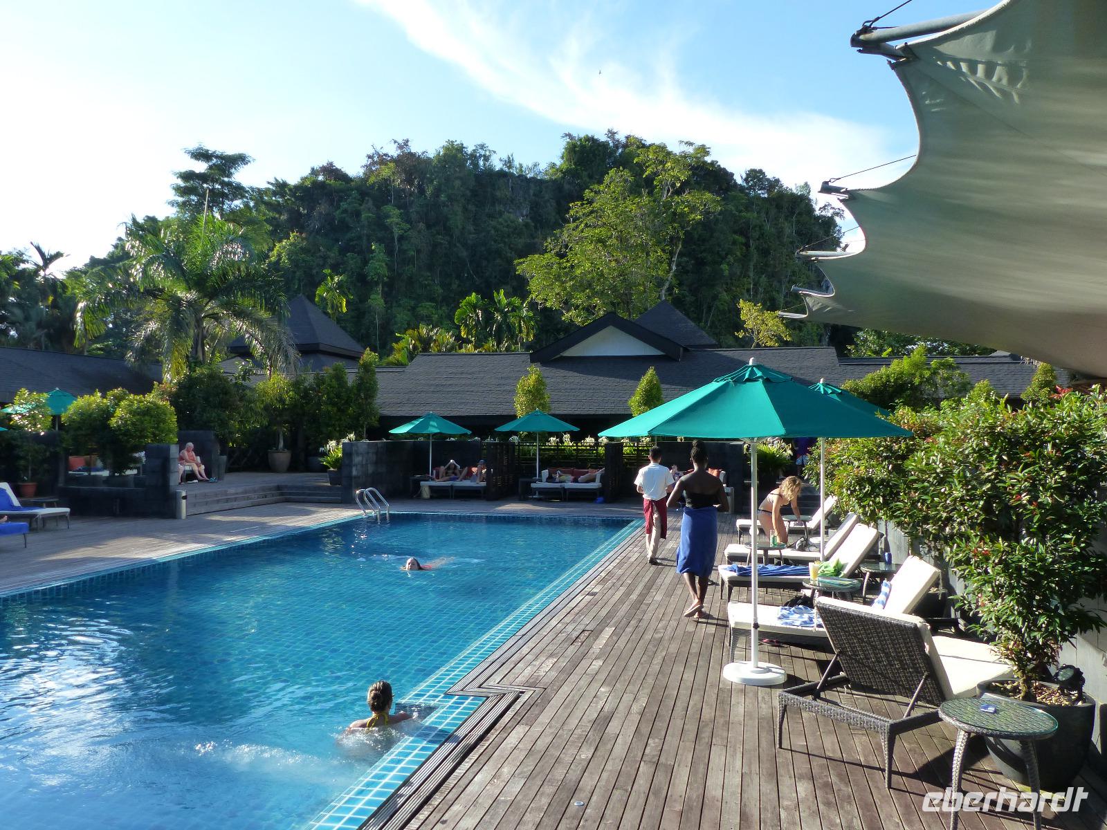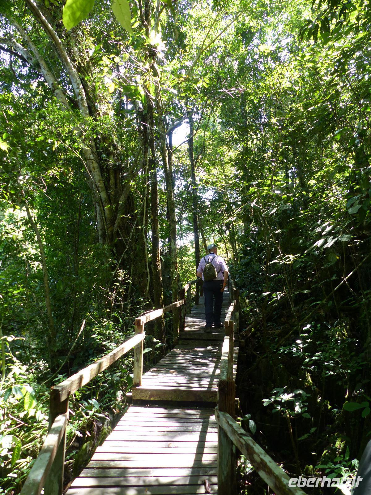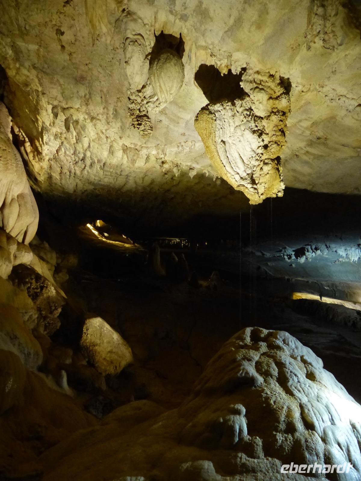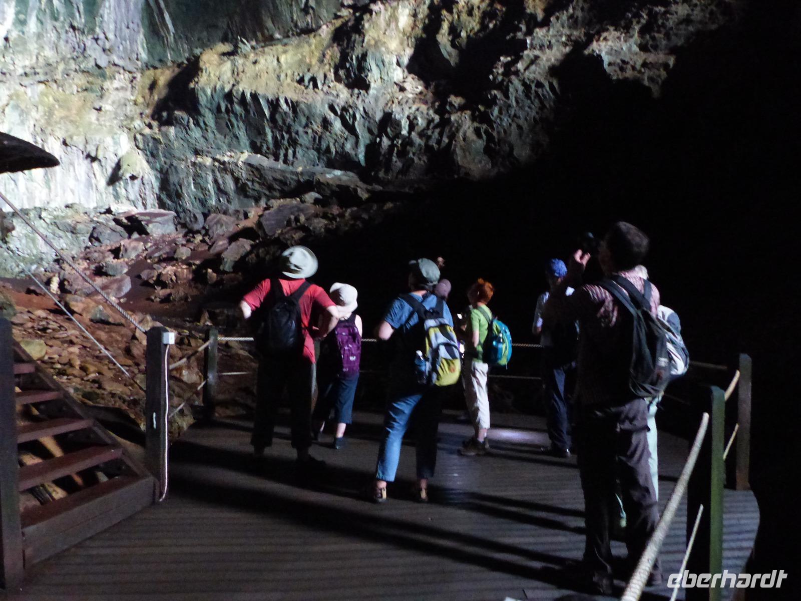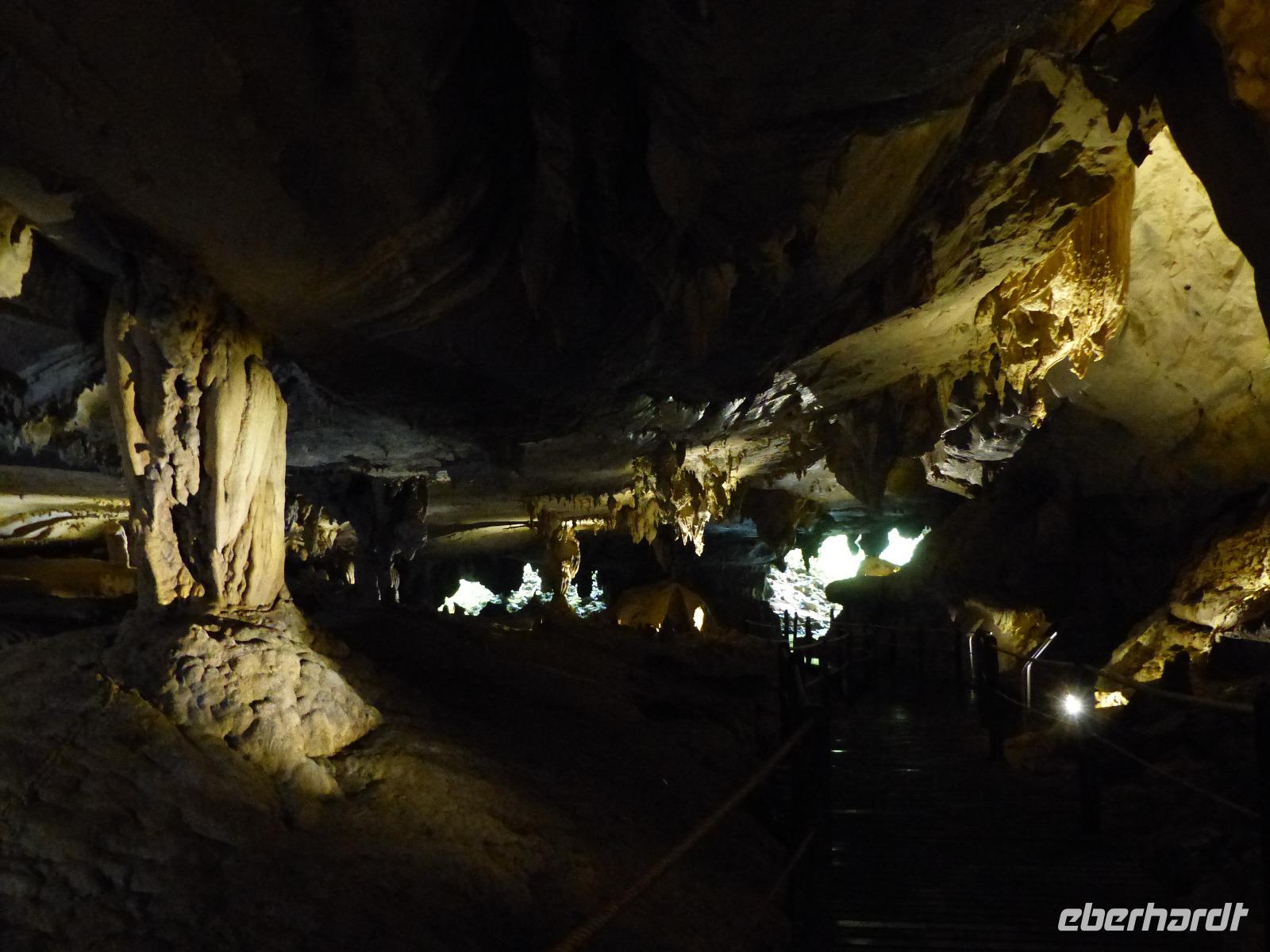 Nach einem ausgedehnten Frühstück begeben wir uns heute erneut auf Höhlentour. Diesmal bewegen wir uns aber nicht nur zu Fuß, sondern auch mit einem traditionellen Langboot fort. Direkt vom Bootssteg des Hotels fahren wir auf dem Fluss entlang bis wir zu einer kleinen Siedlung kommen. Hier steigen wir aus und besuchen den hiesigen Markt, wo verschiedene Handwerksarbeiten zum Kauf angeboten werden. Die sonst als Nomaden lebenden Penan haben sich hier niedergelassen und leben nun von und mit dem Park, durch dessen Besucher sie unteranderem ihr Einkommen erzielen. So wird zum Beispiel das Blasrohrschießen demonstriert, wo sich der ein oder andere von uns auch selbst daran versucht. Im Anschluss geht es für uns weiter zur ersten Höhle des Tages - der Wind Cave. Nach einem kurzen Anstieg haben wir den Eingang der Höhle erreicht und begeben uns in deren Inneres. Besonders fasziniert natürlich die Königskammer, welche mit ihren verschiedenen Stalagtiten und Stalagmiten erneut wunderschöne Gebilde in unseren Köpfen entstehen lässt. Auf einem kleinen Plankenweg spazieren wir im Anschluss weiter zur Clear Water Cave, welche sich nur durch eine Vielzahl an Stufen besuchen lässt. Doch für all diejenigen, die diese Anstrengung nicht in Kauf nehmen möchten, bietet ein klarer natürlicher Pool Erfrischung und ein kleiner Rastplatz Erholung. Für alle anderen heißt es noch einmal schwitzen, und nach ca.200 Stufen bergauf können wir eines der längsten Höhlensysteme der Welt bewundern. Um allerdings die Höhle etwas entdecken zu können, muss man im Inneren erneut diverse Stufen in Kauf nehmen. Eine Treppe führt hinab in ein Labyrinth aus Passagen und Höhlen, welches vom gleichnamigen Clearwater-Fluss durchflossen wird. Als wir wieder bei unserem Picknick-Platz ankommen, hat Kate bereits den Tisch gedeckt und wir können direkt das von ihr selbst gekochte Essen probieren. Nach einer kleinen Pause geht es dann langsam wieder mit dem Boot zurück in Richtung Hotel, wo der ein oder andere die freie Zeit nutzt etwas am Pool zu entspannen oder im Park eine Wanderung durch die Baumwipfel zu unternehmen. Zum Abendessen sind wir dann alle wieder gemeinsam im Restaurant und lassen uns leckere Speisen schmecken. Auch der in Sarawak bekannte Kek Lapis (Schichtkuchen) wird heute als Geburtstagskuchen probiert.