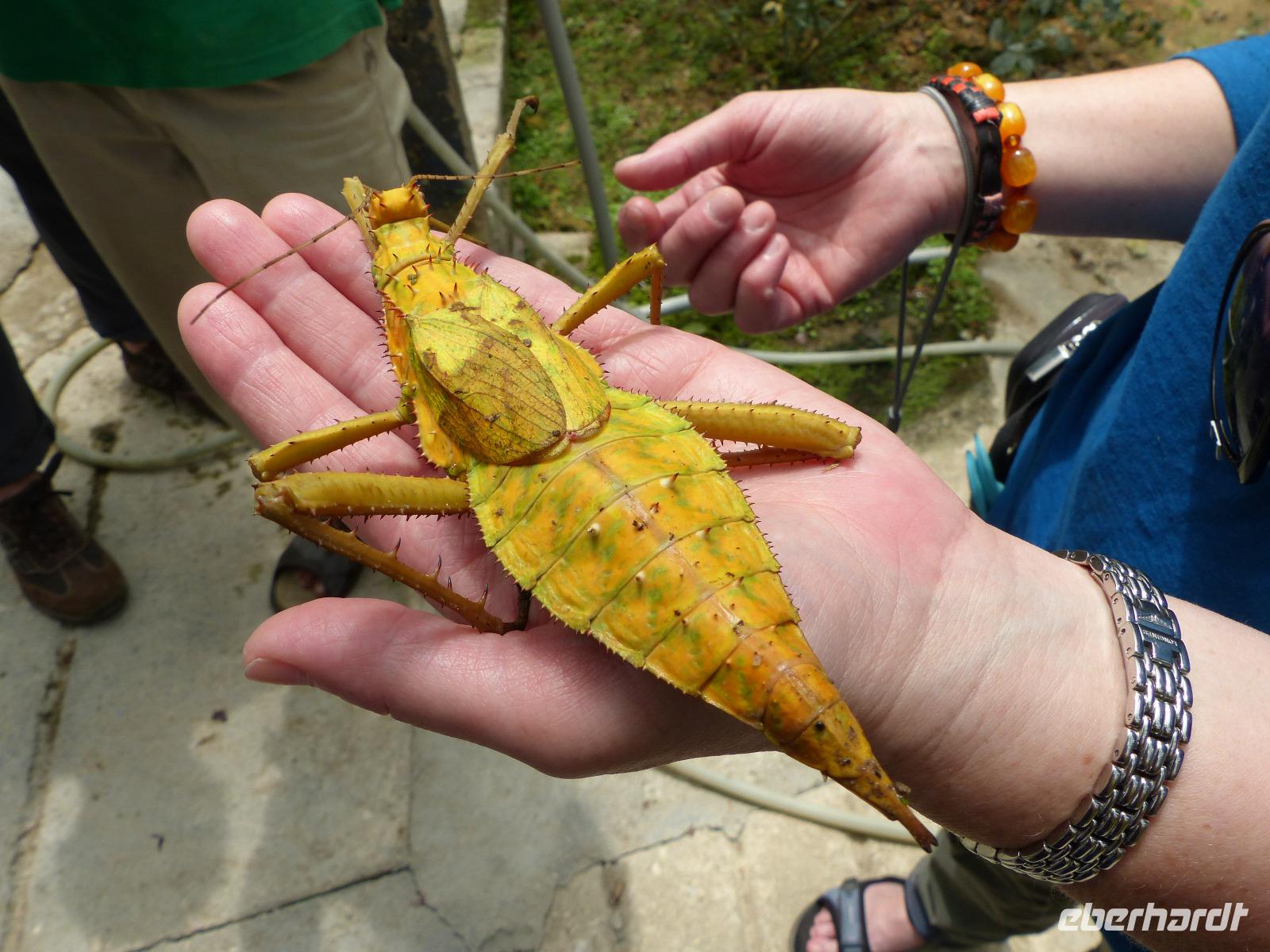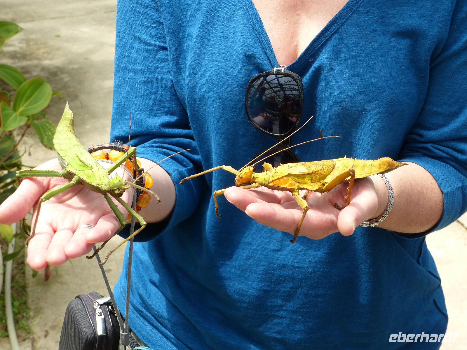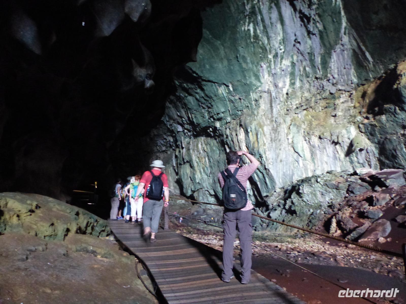 Nach dem alle Koffer gepackt sind, geht es für uns heute weiter in die dschungelbedeckte Bergwelt Borneos. Mulu wartet mit seinen einzigartigen Höhlen auf uns. Mit einer Propellermaschine verlassen wir Kuching und landen gegen Mittag in unserer neuen Destination. Um keine Zeit zu verlieren, begeben wir uns direkt in den Park und essen hier eine Kleinigkeit zu Mittag. Dann machen wir uns fertig und unser Ausflug zur Lang und Deer Cave beginnt. Über einen Plankenweg begeben wir uns zu den beiden Höhlen und staunen schon gleich zu Beginn wieder über diese wunderschöne Natur- und Pflanzenwelt. Nicki und Kate halten beide die Augen und Ohren offen, sodass wir erneut neue kleine Tierchen und Pflanzen entdecken können. So zeigt sich zum Beispiel ein Laternenkäfer, welcher besonders durch seine auffällige „Nase" begeistert. Nach rund 4 Kilometern entspanntem Laufen, kommen wir bei den beiden Höhlen an und beginnen unmittelbar mit der Besichtigung. Zuerst geht es für uns in die Lang Cave, welche direkt nach ihrem Entdecker Lang Belarek benannt wurde. Sie ist nicht die größte, aber wohl mit einer der schönsten die der Gunung Mulu Nationalpark zu bieten hat. Viele in unterschiedlichsten Formen vorkommende Stalagmiten, Stalagtiten und Vorhänge erwarten uns hier. Im Anschluss geht es dann in die wohl beeindruckendste Höhle im Park, wenn nicht sogar weltweit- der Deer Cave, der längsten Höhlenpassage der Welt. Nach dem Verlassen der Höhle nehmen wir außerhalb Platz und warten auf ein Naturschauspiel der Extraklasse. Wenn alle Bedingungen passen, verlassen hier Millionen von Fledermäusen zur Dämmerung die Höhlen und schwärmen zur Futtersuche aus. Und nach etwas Geduld können wir tatsächlich die unterschiedlichsten Formationen am Himmel entdecken. Verschwitzt aber begeistert, begeben wir uns im Dunklen auf unseren Rückweg und kommen am Abend in unseren Resort an. Bei einem leckeren Abendessen lassen wir den Tag ausklingen.