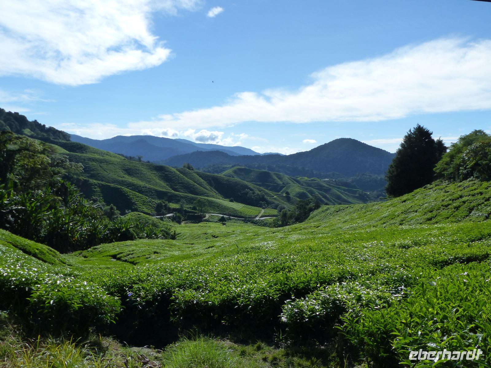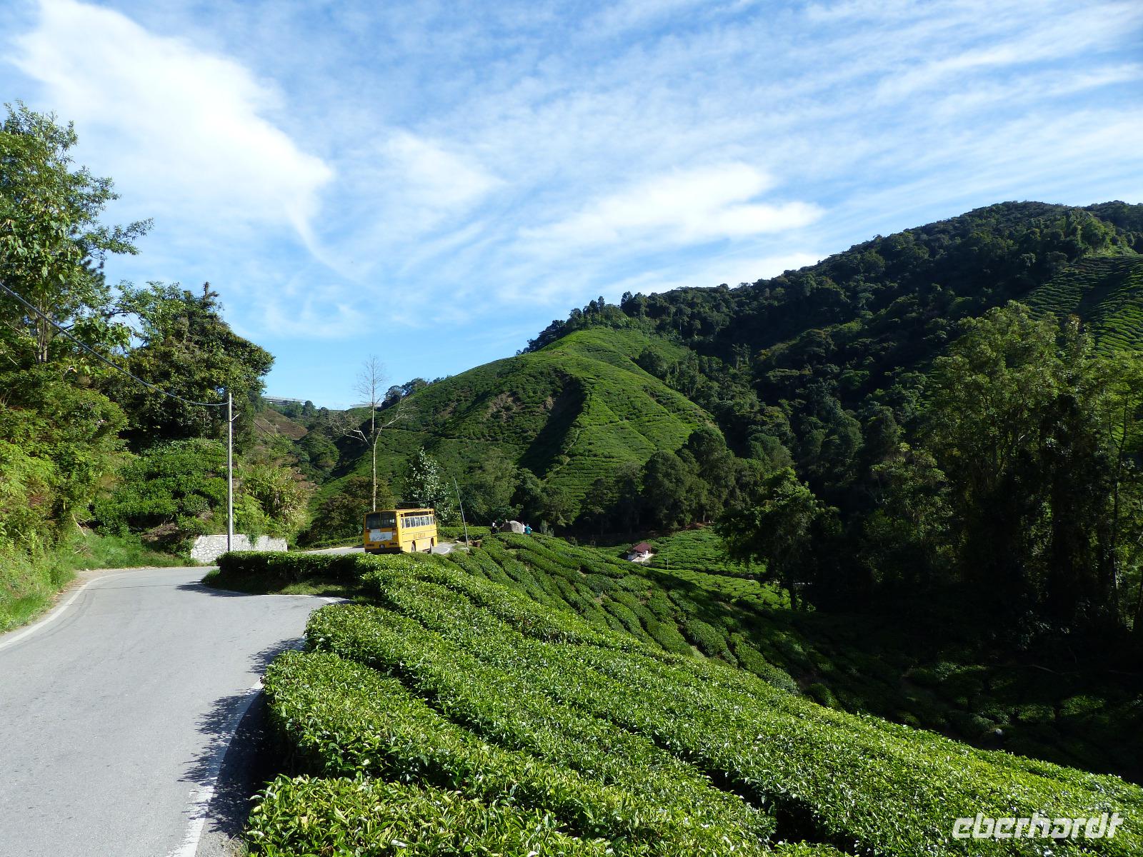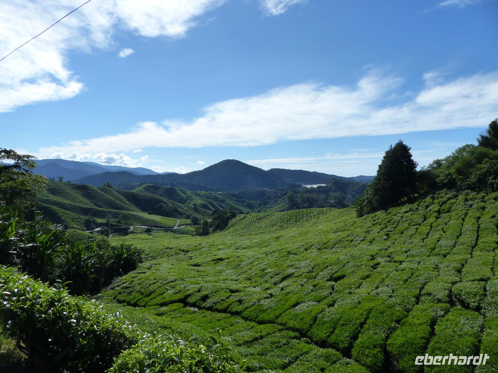 Mit herrlichem Sonnenschein und wunderbar angenehmen Temperaturen beginnen wir heute unseren Tag. Nach einem ausgedehnten Frühstück fahren wir zuerst mit unserem Bus und später mit einem alten Schulbus in das Teeanbaugebiet der Firma BOH - Best of Highlands. Über 4000 Hektar gehören zu der im Jahre 1929 gegründeten Plantage. Nach einem kleinen Spaziergang entlang der Teesträucher führt uns Eddie in die Fabrik, sodass wir auch einen Einblick über den Tee-Verarbeitungsprozess erhalten. Natürlich darf im Anschluss eine Tasse Tee nicht fehlen. Im angrenzenden Café nehmen wir uns daher die Zeit und genießen einen frischen schwarzen Tee. Dann geht es für uns weiter und der Besuch einer Schmetterlingsfarm steht auf dem Programm. Doch was wir hier erleben, steigt über unsere Vorstellung hinaus. Nicht nur Schmetterlinge sind hier zu Hause, sondern noch viele andere kleine Tiere und das in regelrechter Tuchfühlung mit uns. So krabbelt bei einem die Gottesanbeterin auf der Hand, wobei bei einem anderen das Stabinsekt auf der Brust sitzt. Natürlich darf der auf dem Kopf nieder gelassene Rajah Brook nicht außer Acht gelassen werden! Gegen Mittag spazieren wir dann noch über einen einheimischen Markt und lassen die Vergangenheit der Cameron Highlands in einer Art kleinem Museum an uns vorbei ziehen. Unser Mittagessen oder diesmal fast schon Kaffeetrinken, lassen wir uns in einem Lokal in Tanah Rata schmecken. Hier haben wir auf ca. 1500m im Anschluss etwas Freizeit, sodass jeder den kleinen Ort individuell entdecken kann. Wieder im Hotel, wartet in nicht allzu großer Ferne unser heutiges Abendessen auf uns. Steamboat- für fast alle eine neue Form asiatisch zu essen!
