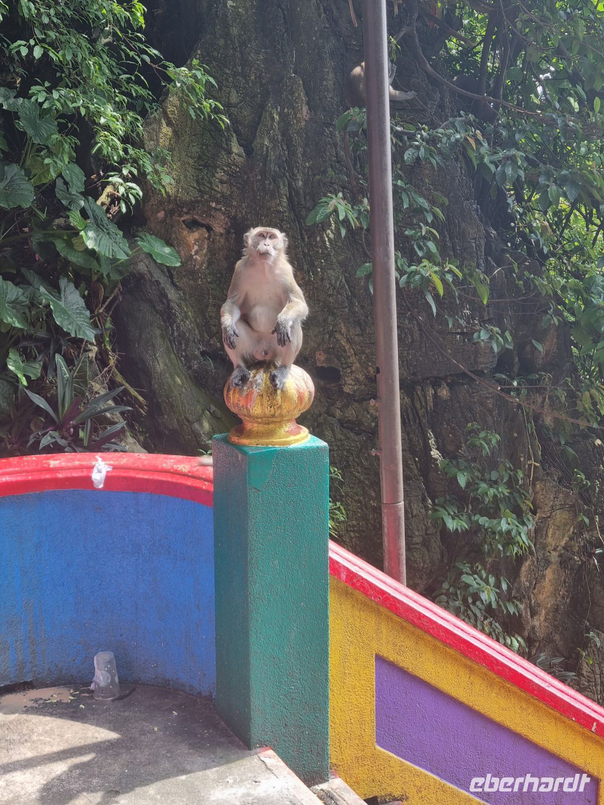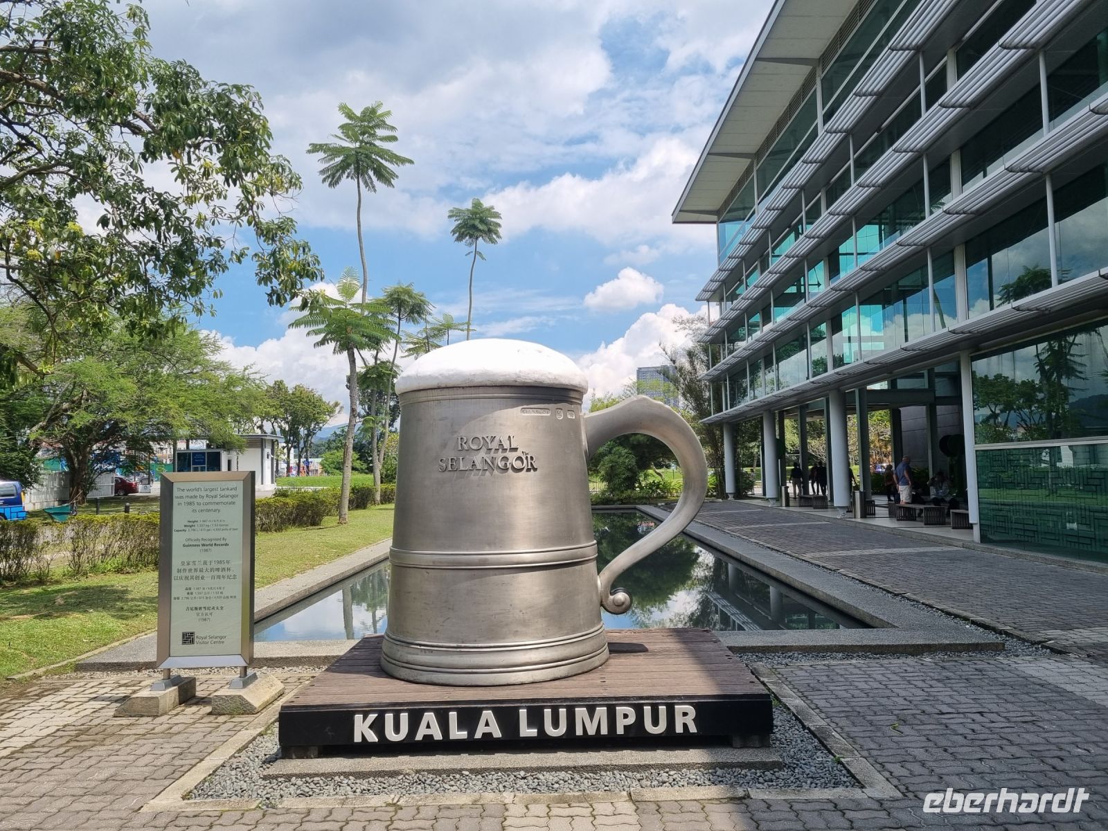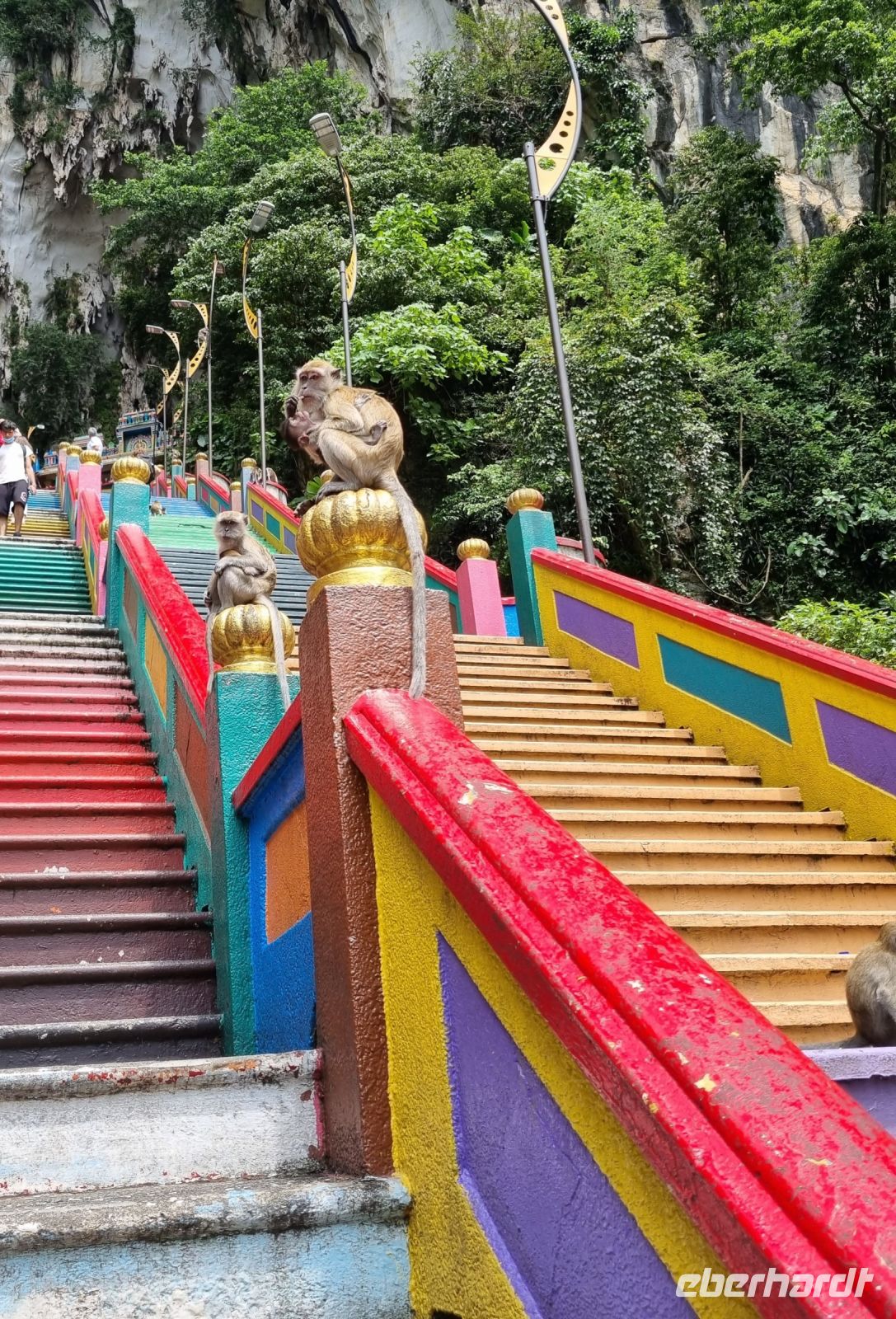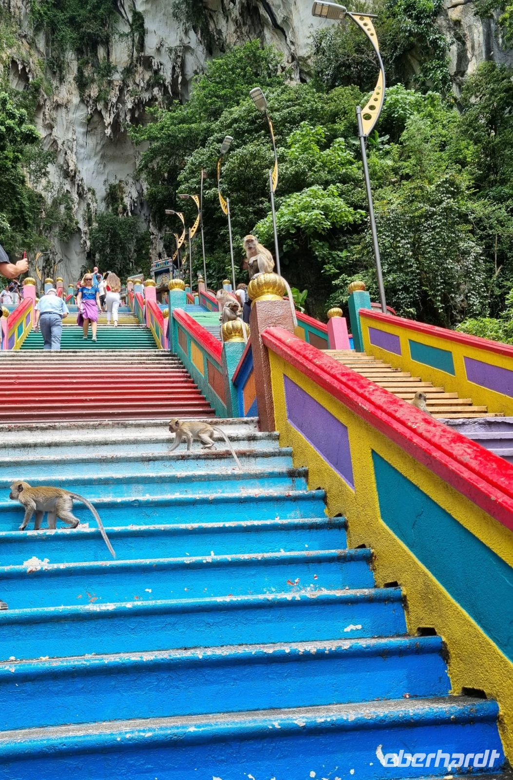 Den ersten Stopp unserer heutigen Rundfahrt legten wir an der Zinnfabrik Royal Sengalor ein. Malaysia ist immerhin sehr stolz auf seine Zinnvorkommen und die langjährige Geschichte der Zinnverarbeitung. In dieser Fabrik wurde uns auf beeindruckende Weise sowohl die Geschichte als auch die Verarbeitung von Zinn anschaulich dargestellt. Zinn ist nach wie vor eines der wichtigsten Exportgüter des Landes und wurde früher sogar als Zahlungsmittel verwendet. Figuren, Teller, Vasen, Schmuck, Dosen, Bilderrahmen usw. mit stilvollen oder modernen Ornamenten werden hier in mühevoller Handarbeit hergestellt... Danach fuhren wir weiter zu den Heiligen Grotten von Batu, riesigen Höhlen in Kalksteinfelsen, in denen sich Tempel und Schreine befinden. Sie sind eine beliebte Pilgerstätte für die Hindus in Malaysia. Uns amüsierten die kleinen Affen, die uns dabei zusahen, wie wir die 280 Stufen hinaufstiegen. Von oben konnte man einen großen Teil von Kuala Lumpur sehen. In der Grotte selbst tropft es ununterbrochen und Affen, Tauben bzw. Fledermäuse haben hier oben ihr zuhause. Nach diesem eindrucksvollen Besuch stoppten wir am Königspalast, welchen wir durch das Haupttor bewundern konnten, denn eine Innenbesichtigung war leider nicht möglich. Später spazieren wir vorbei am architektonisch beeindruckenden Alten Bahnhof und der Nationalmoschee und gelangten ins Unabhängigkeitsviertel, wo 1957 zum ersten Mal die malayische Flagge gehisste wurde. Hier besuchten wir auch die Kuala Lumpur City Gallery, wo wir Simons Erläuterungen noch einmal verbildlicht sahen. Eine kleine Kaffeepause mit süßen Leckereien gehörte ebenso dazu. Danach durfte allerdings ein kurzer Abstecher an den Zusammenfluss von Gombak und Klang nicht fehlen, denn genau diese beiden Flüsse gaben der Stadt, die 1857 an deren Zusammenfluss gegründet wurde, ihren Namen, der übersetzt "Schlammige Flussmündung" bedeutet. Ihre Gründer waren Bergleute bzw. Zinnsucher, die sie unter Führung des malayischen Rajas Abdullah mitten im Urwald anlegten. Aufgrund des anwachsenden Zinnhandels wuchs der Ort stetig von einer verschlafenen Siedlung zur großen Stadt an. Damit schloss sich der Kreis zur Stadtgeschichte für uns und wir gelangten nochmals zu den Petronas Twin Towers, um in einer der dortigen Malls unser heutiges Abendessen einzunehmen.