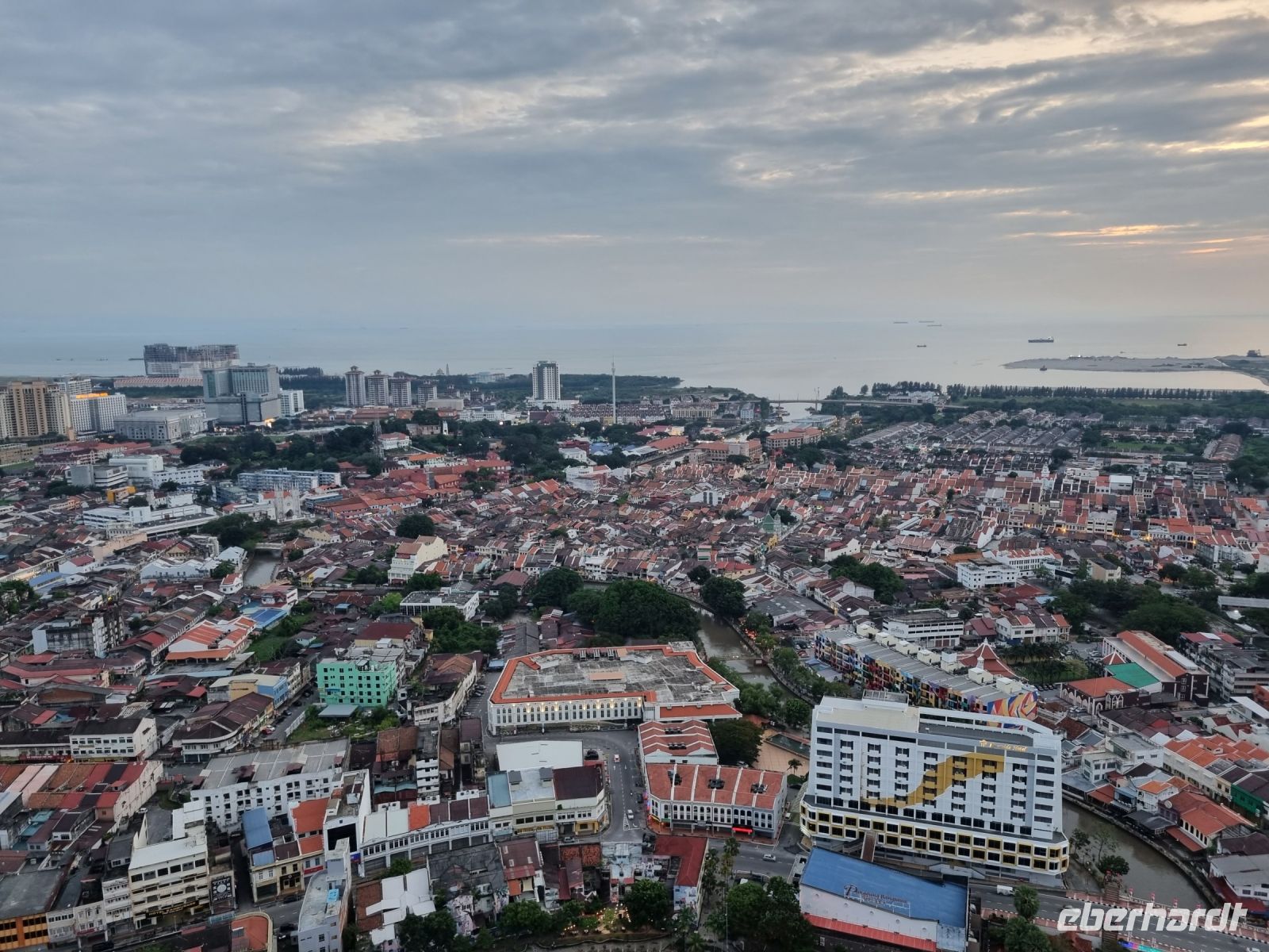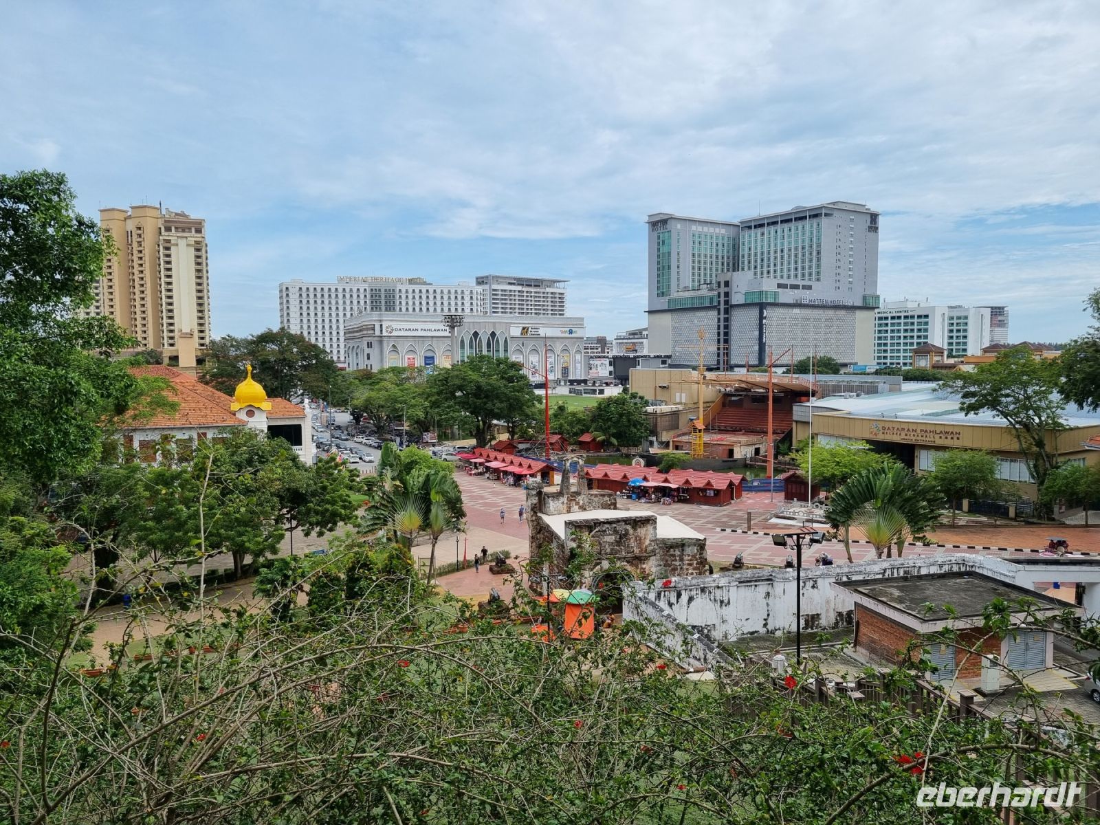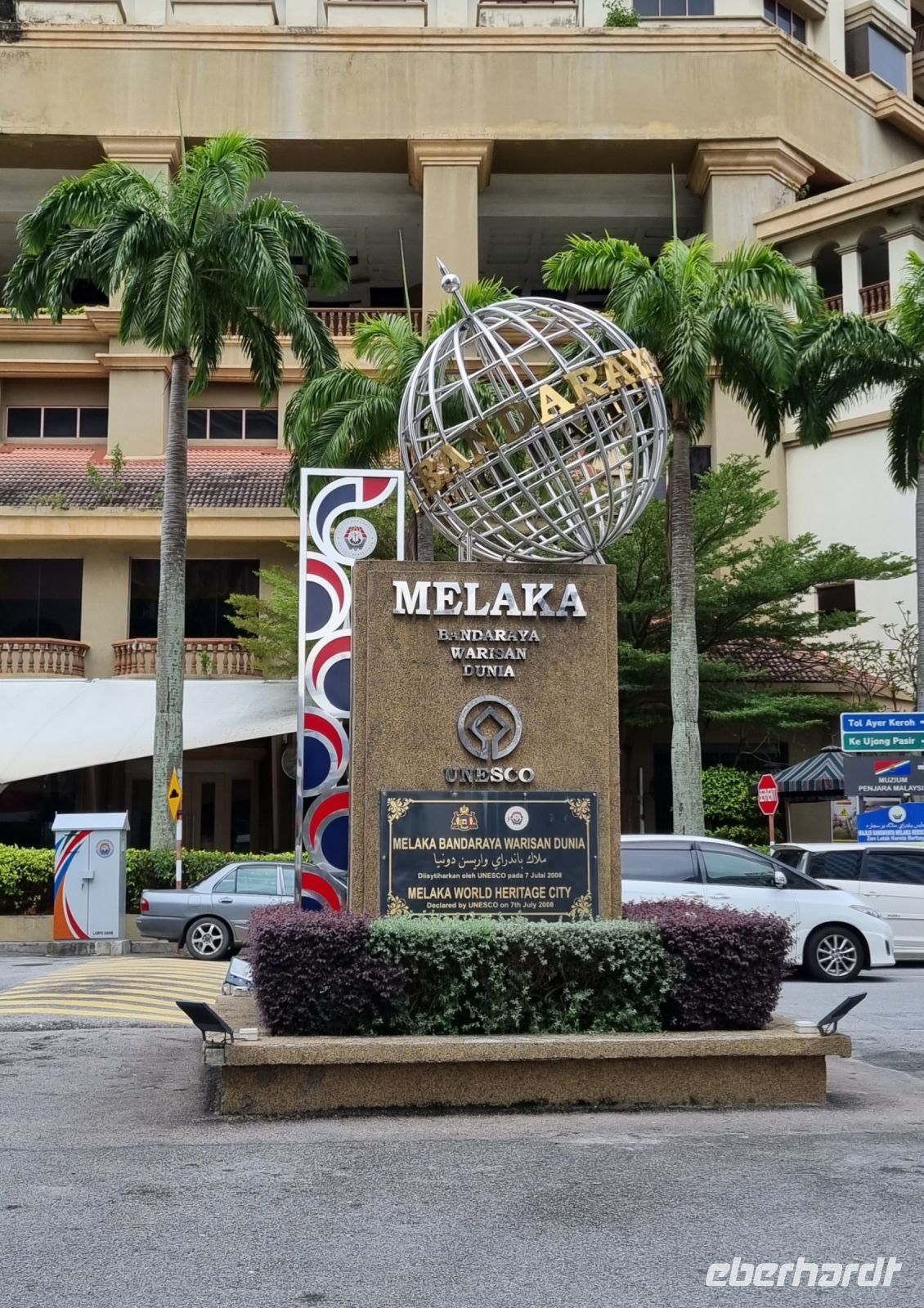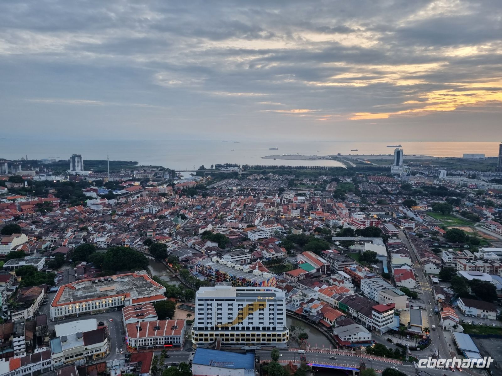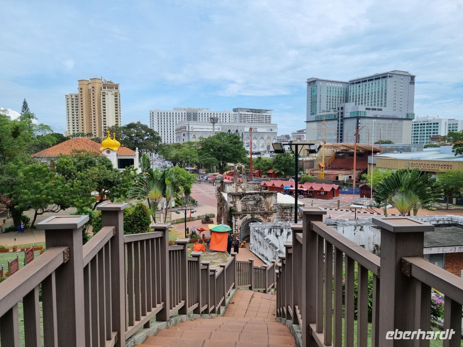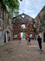 Gemeinsam mit Berit machten wir uns heute früh zum Grenzübergang von Singapur nach Malaysia auf. Leider mussten wir uns kurz vor der Grenze von unserer sympathischen örtlichen Reiseleiterin Berit verabschieden, der ich an dieser Stelle nochmals ganz herzlich für ihre liebevolle und gleichzeitig professionelle Art bedanken möchte. Schnell waren die Ausreiseformalitäten für Singapur erledigt und bei der Einreise nach Malaysia war dann unsere Geduld gefragt. Eine reichlich 2-stündige Wartezeit und wir hatten es schließlich geschafft und waren in Malaysia angekommen, wo wir bereits kurz nach der Zollkontrolle von unserem örtlichen Reiseleiter Simon in Empfang genommen wurden. Erstes Geld wurde umgetauscht und schließlich konnte es mit dem neuen malaysischen Bus nach Malakka weitergehen. Simon gab uns bereits unterwegs viele Informationen zu Land und Leuten. In Malakka angekommen, unternahmen wir einen Stadtrundgang. Wir besuchten die Ruinen der St Paul's Church, welche hoch auf einem Hügel gelegen sind und konnten von hier aus über einen großen Teil von Malakka blicken. Weiter gelangten wir durch das berühmte Holländerviertel und über die Einkaufsstraße Jonker Street in China Town zu einigen Tempelanlagen der Stadt. Am frühen Abend checkten wir schließlich in unserem komfortablen Hotel ein, wo wir den Abend bei einem gemeinsamen schmackhaften Abendessen im Panorama-Restaurant des Hotels hoch über den Dächern der Stadt ausklingen ließen. Wir hatten außerdem das große Glück, die Aussichtsplattform im 43. Stock des Sky-Towers, des höchsten Gebäudes in Malakka zu besuchen. Hier standen wir nun auf 163 Metern über dem Straßenniveau und erfreuten uns an einem herrlichen 360-Grad-Panoramablick auf diese historische Stadt und dessen Umgebung, bevor die Sonne langsam unterging...