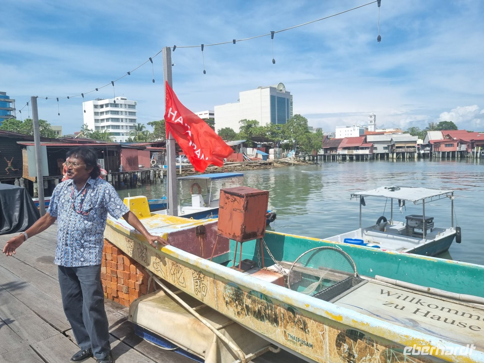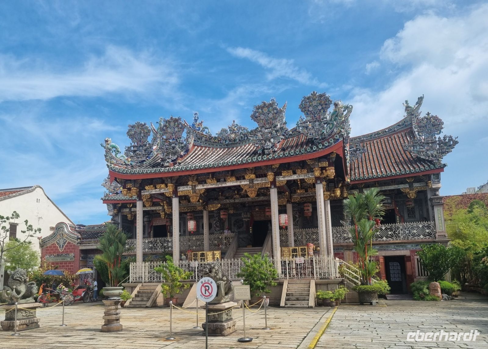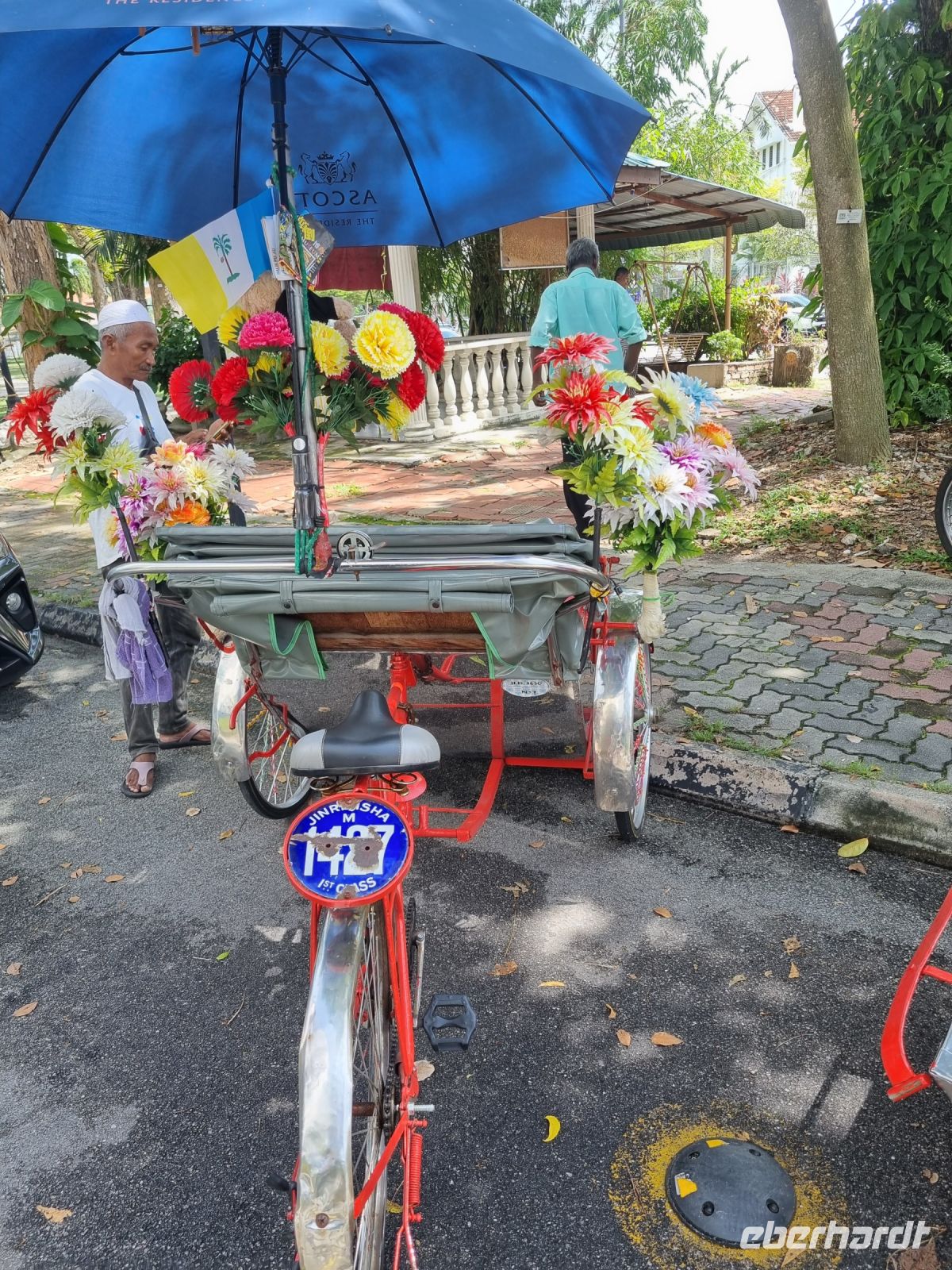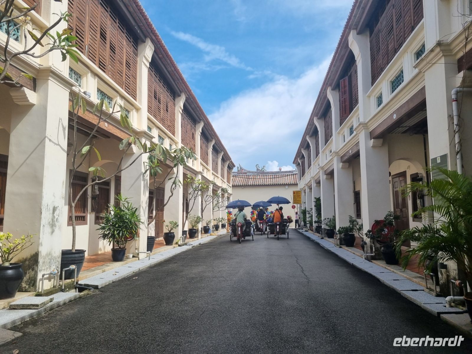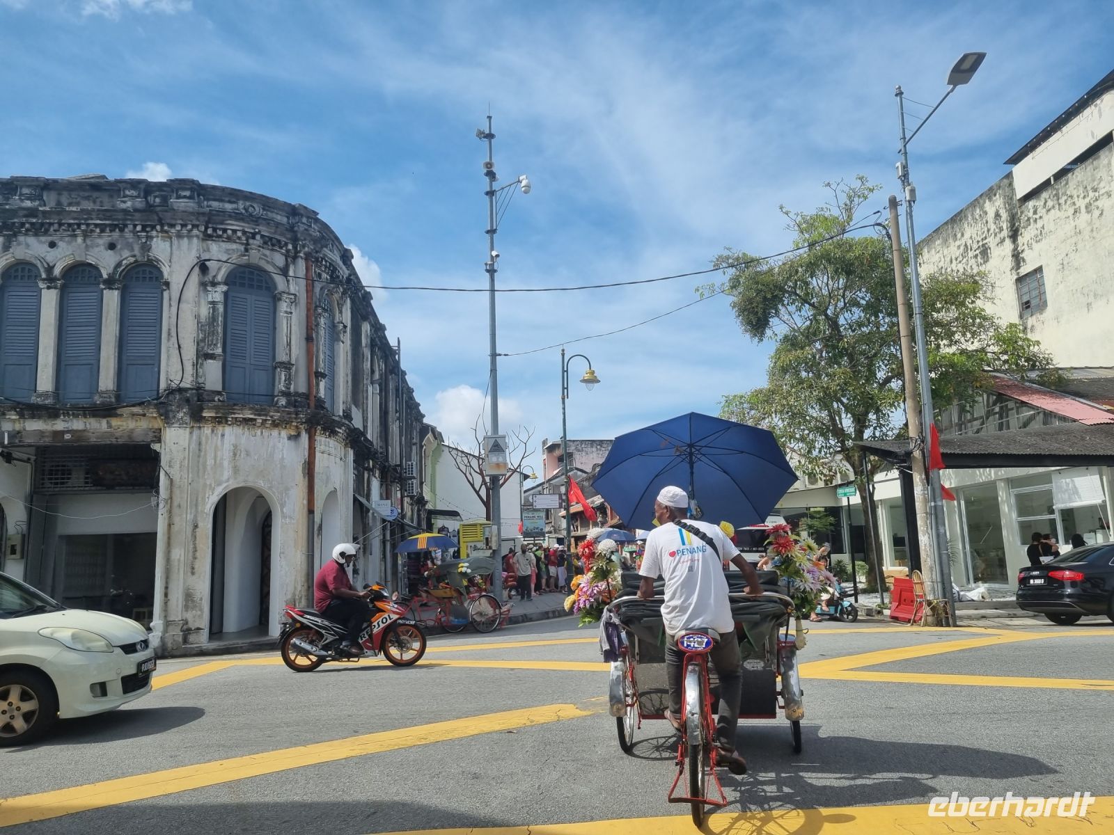 Unsere Stadtrundfahrt durch Georgetown startete mit dem Bus. Der Vormittag stand ganz im Zeichen der handwerklichen Traditionen. Auf dem lokalen Markt konnten wir zunächst einige Köstlichkeiten verkosten und in einer kleinen Seitenstraße besuchten wir einen der ältesten Räucherstäbchen-Macher des Landes. Hier konnten wir uns die Herstellung der verschiedenen Produkte ansehen und bekamen sogar ein kleines Geschenk mit auf den Weg. Das Mittagessen nahmen wir in einem netten indischen Lokal mit einer sehr guter Küche ein, wo wir sogar von Bananenblättern essen konnten. Nach einer kleinen Pause im Hotel wurden wir am Nachmittag von Rikschas abgeholt und setzten damit unsere Stadtrundfahrt fort. Neben dem Rathaus besichtigten wir auch den Hafen von Georgetown und bewunderten die berühmte Straßenkunst von Penang. Weiter ging es zum Khoo Kongsi, einem chinesischen Klanhaus, welches mit viel Gold verziert ist. Mit den Rikschas legten wir abschließend noch einen kleinen Stopp in Little India ein, um ggfs. Gewürze oder andere Spezialitäten einzukaufen.