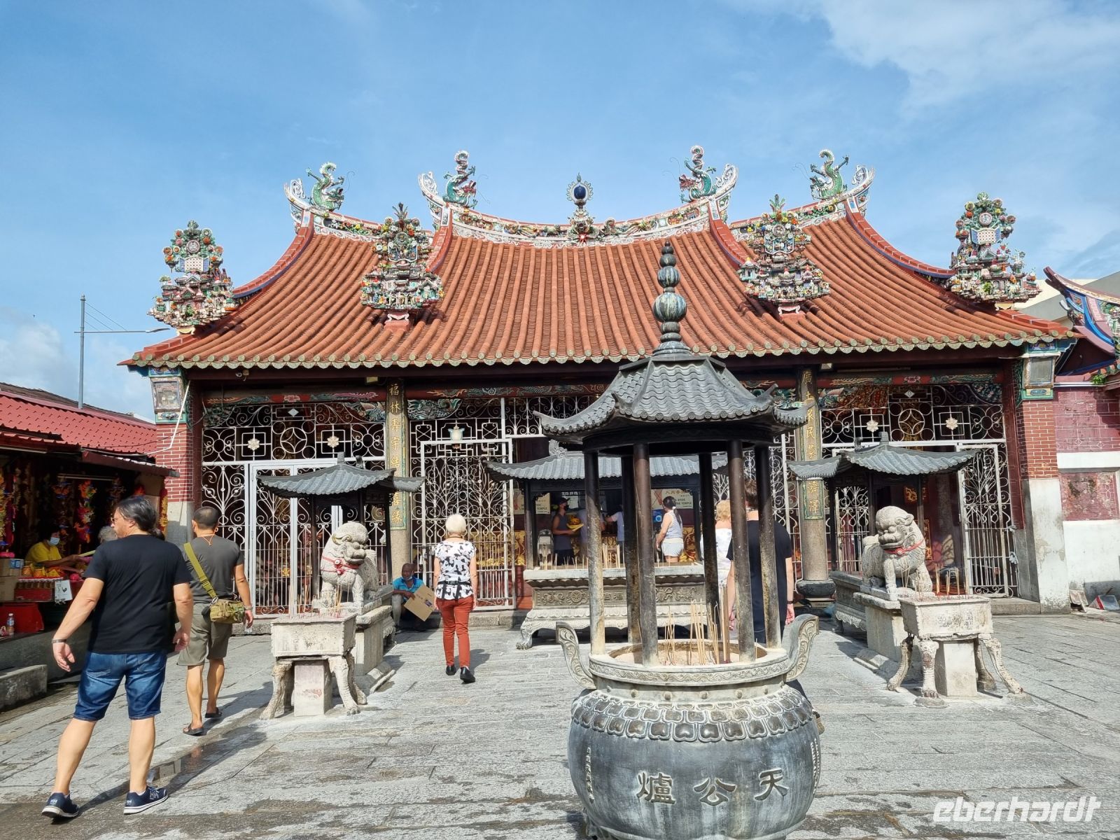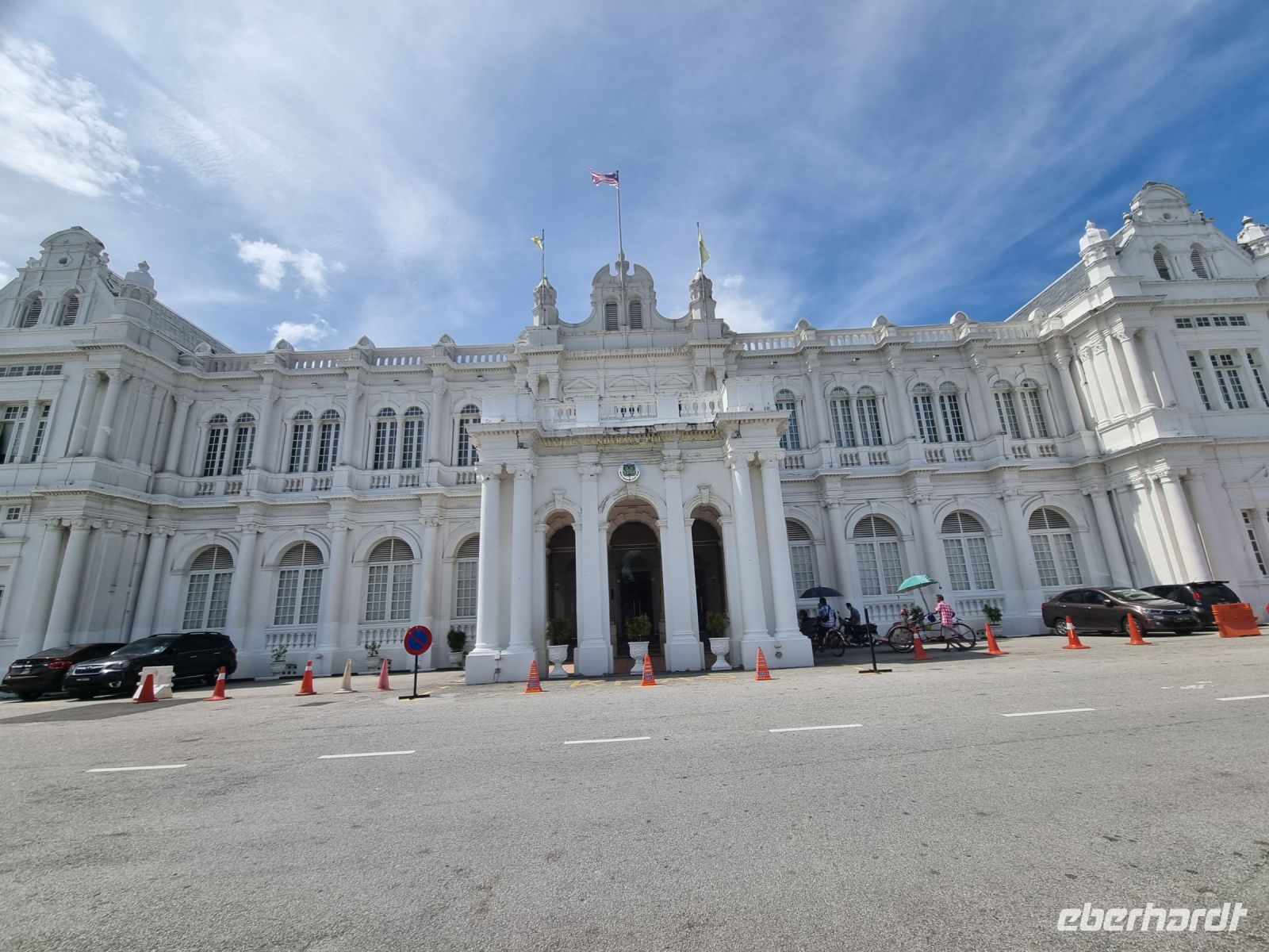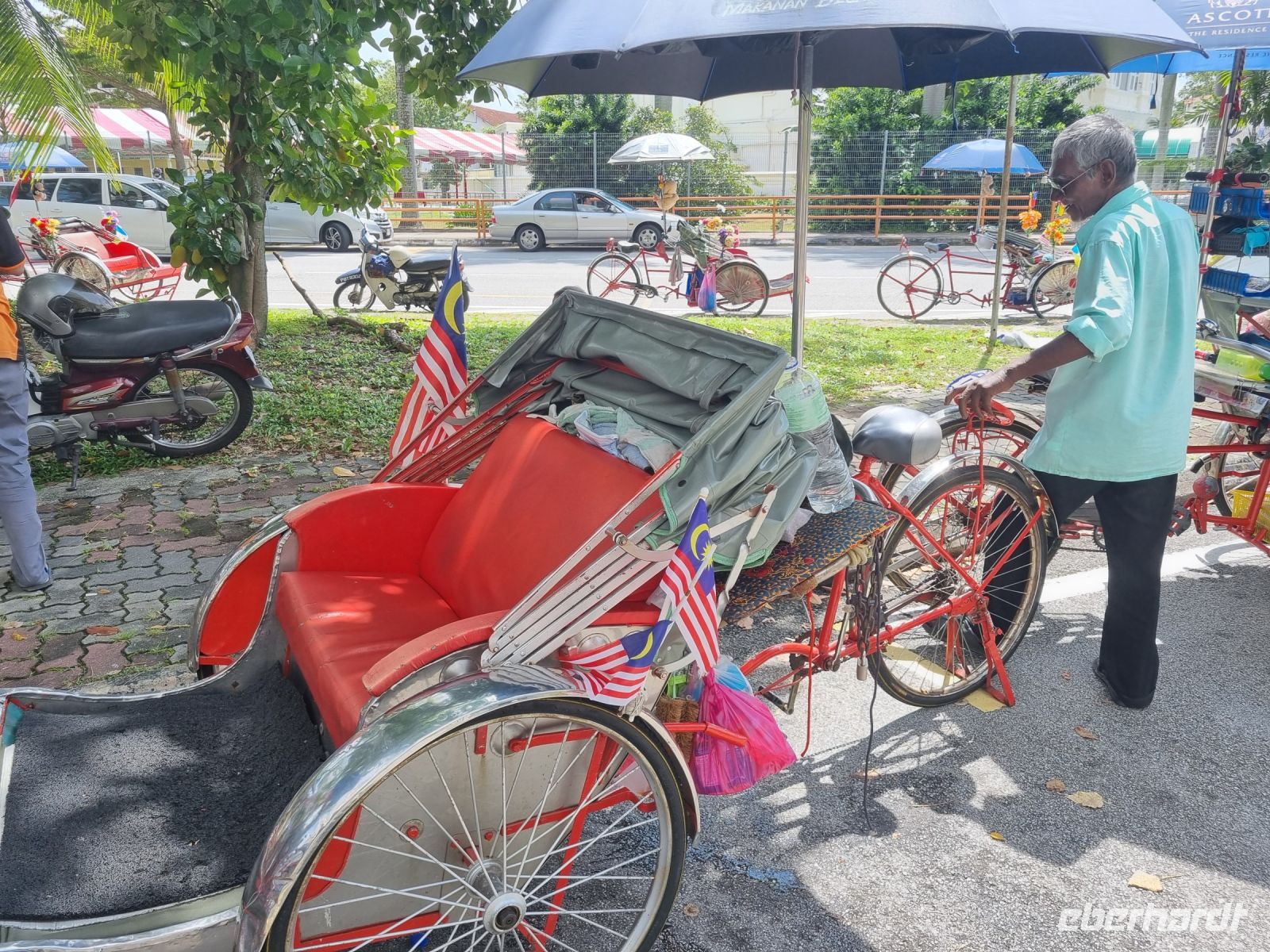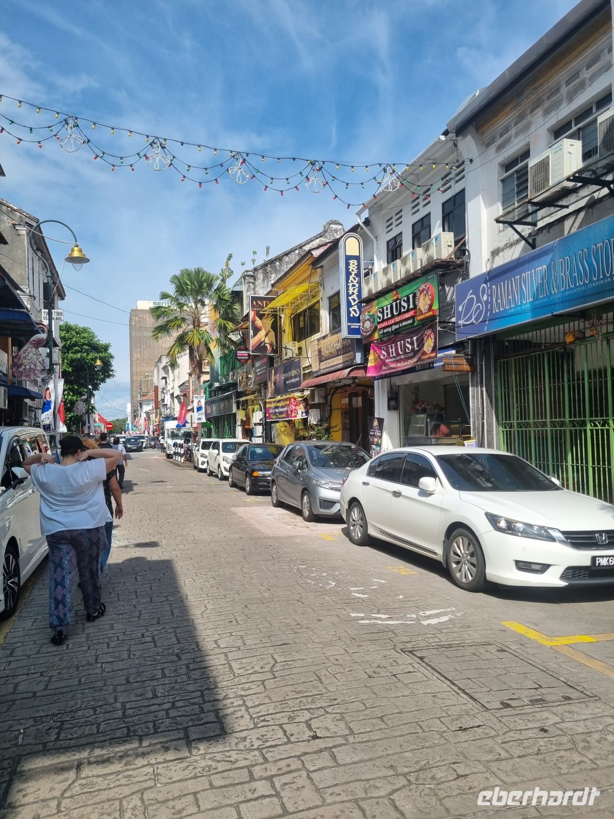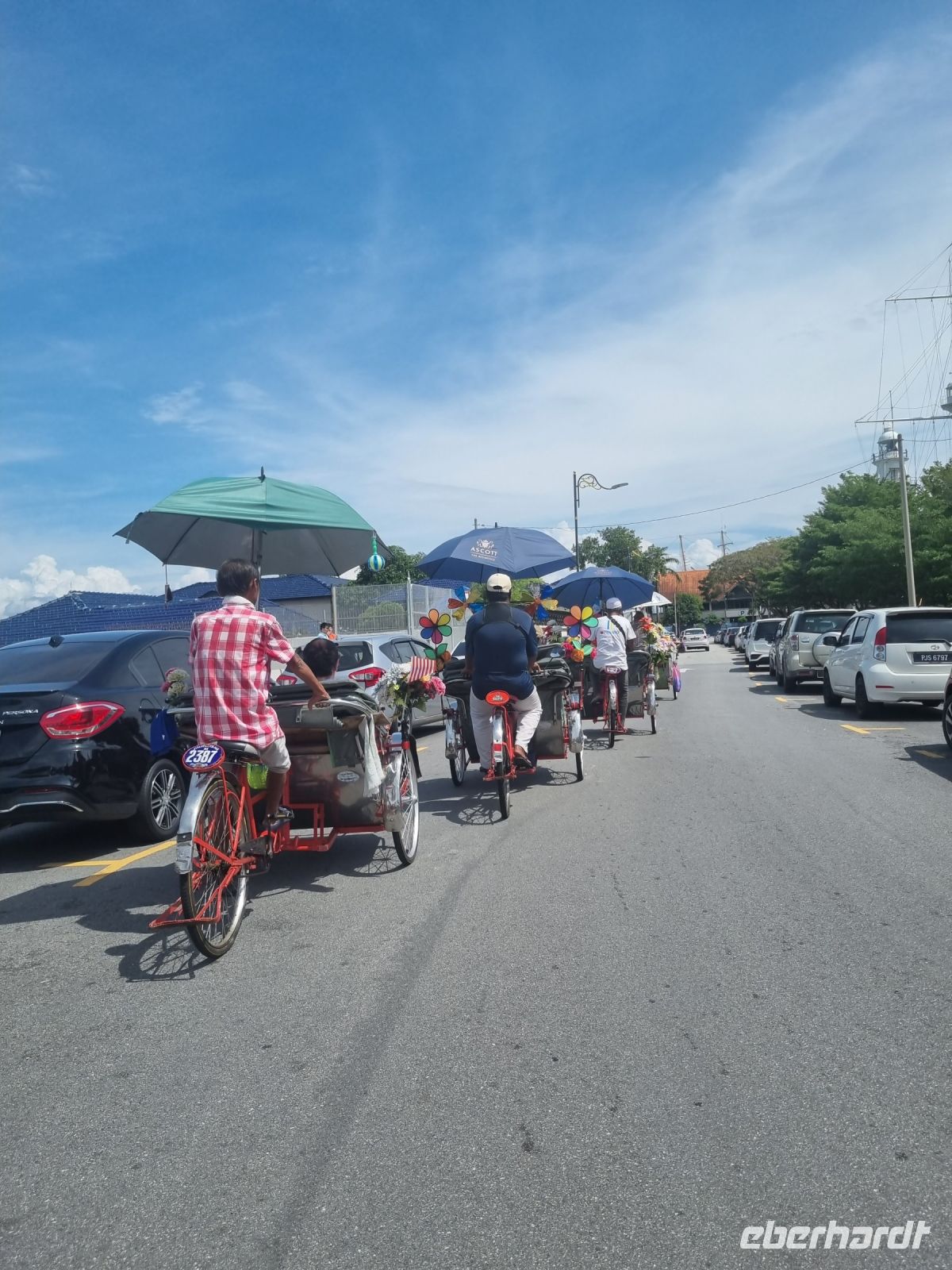 Unsere Stadtrundfahrt durch Georgetown startete mit dem Bus. Der Vormittag stand ganz im Zeichen der handwerklichen Traditionen. Auf dem lokalen Markt konnten wir zunächst einige Köstlichkeiten verkosten und in einer kleinen Seitenstraße besuchten wir einen der ältesten Räucherstäbchen-Macher des Landes. Hier konnten wir uns die Herstellung der verschiedenen Produkte ansehen und bekamen sogar ein kleines Geschenk mit auf den Weg. Das Mittagessen nahmen wir in einem netten indischen Lokal mit einer sehr guter Küche ein, wo wir sogar von Bananenblättern essen konnten. Nach einer kleinen Pause im Hotel wurden wir am Nachmittag von Rikschas abgeholt und setzten damit unsere Stadtrundfahrt fort. Neben dem Rathaus besichtigten wir auch den Hafen von Georgetown und bewunderten die berühmte Straßenkunst von Penang. Weiter ging es zum Khoo Kongsi, einem chinesischen Klanhaus, welches mit viel Gold verziert ist. Mit den Rikschas legten wir abschließend noch einen kleinen Stopp in Little India ein, um ggfs. Gewürze oder andere Spezialitäten einzukaufen.