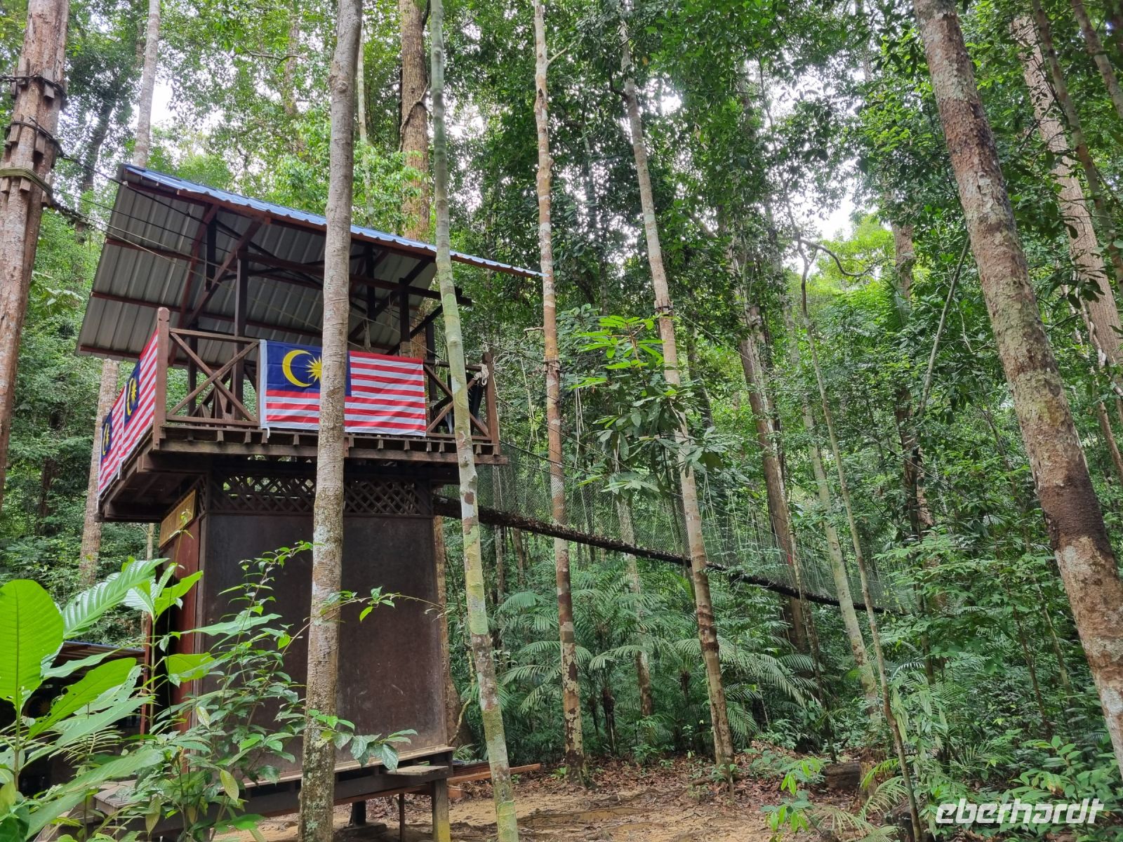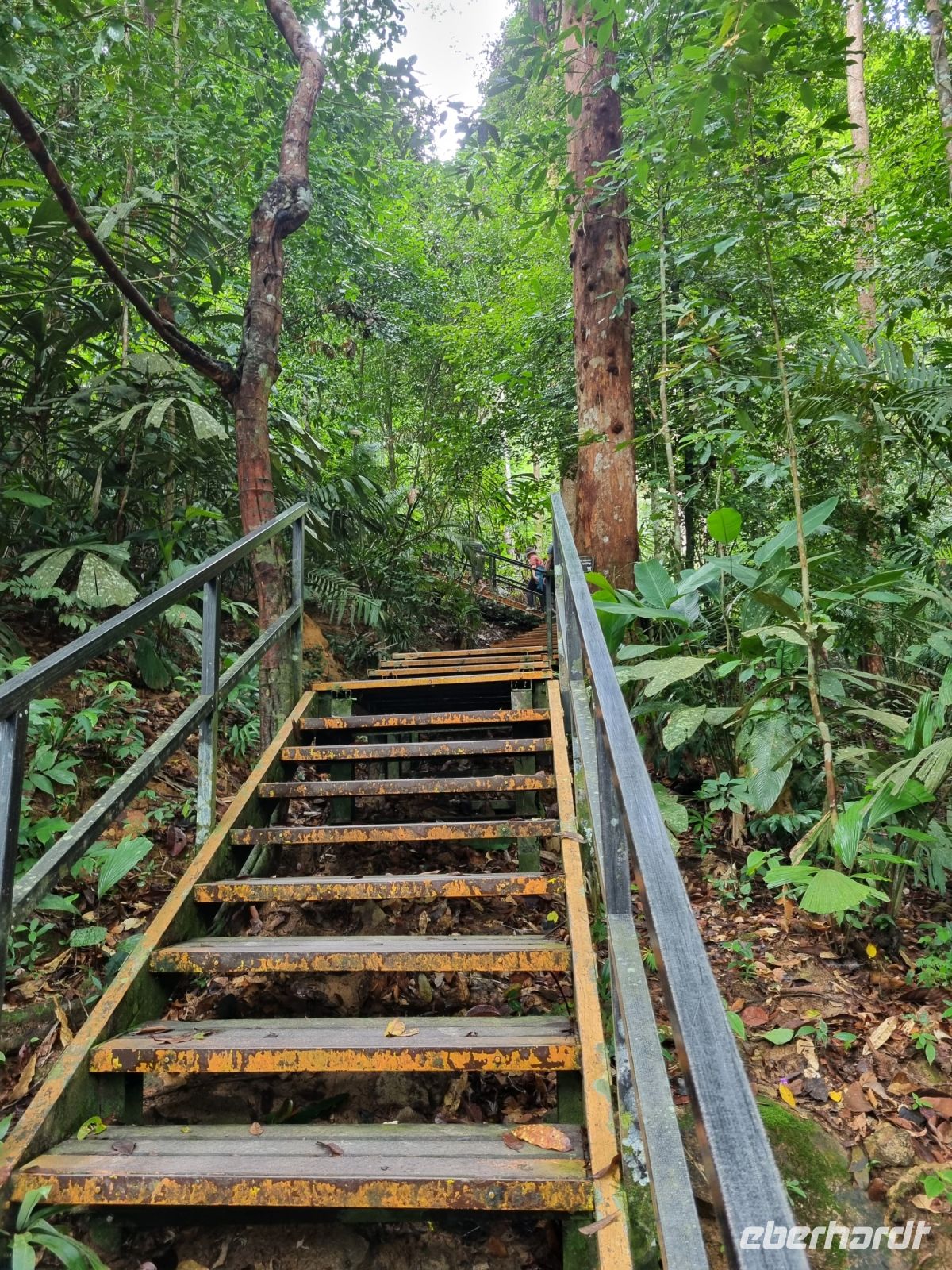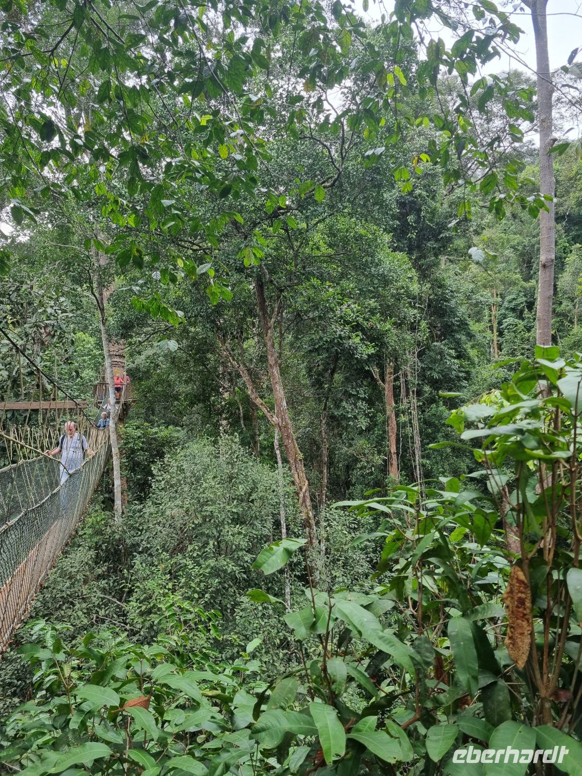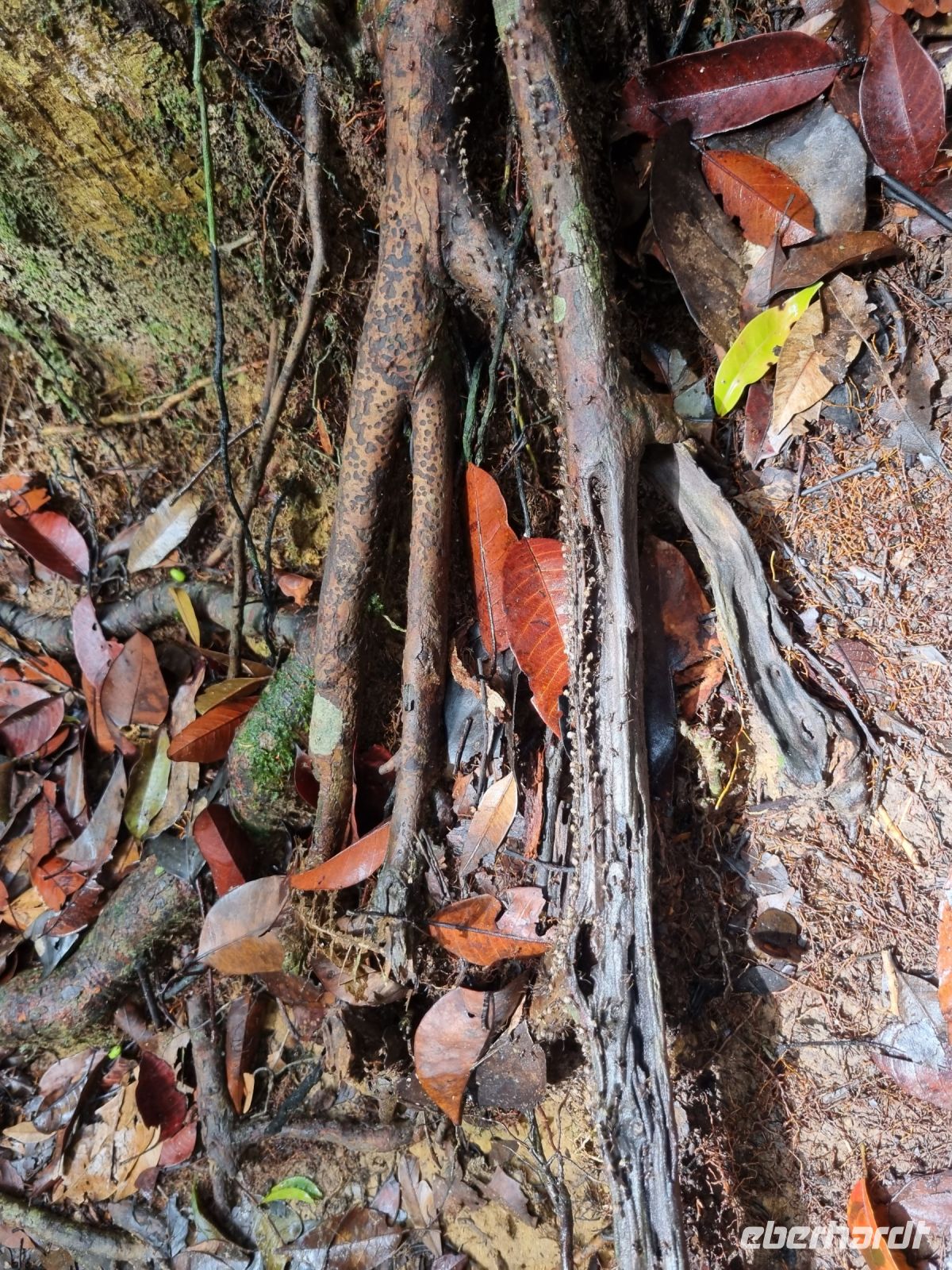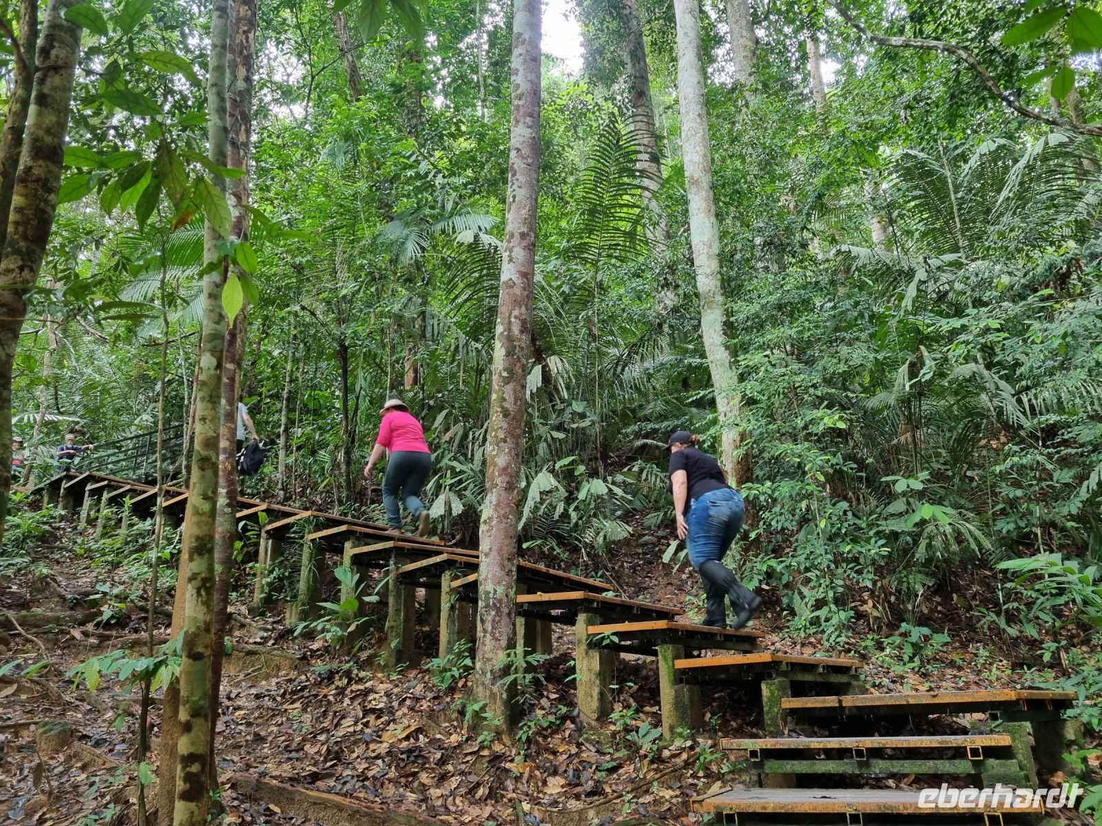 Da es die gesamte Nacht geregnet hatte, starteten wir die Wanderung zum Bukit Teresek bei einer extrem hohen Luftfeuchtigkeit. Wir begannen von der Seite des Canopy Walkway mit dem Aufstieg und der Weg führte uns über unzählige Treppen bzw. Holzstege hinauf zu zwei Aussichtspunkten, wobei es 270 Höhenunterschied zu überwinden galt, was im tropischen Dschungel ziemlich schweißtreibend war! Wir waren erleichtert, als wir letztendlich auf dem 344 Meter hohen Bukit Teresek angekommen waren und schon ein wenig stolz auf uns. Nach einer insgesamt etwa 3-stündigen Wanderung hatten wir uns das Mittagessen im Resort redlich verdient. Gut gestärkt konnte es dann am Nachmittag mit weiteren Aktivitäten weitergehen... Auf uns warteten mehrere kleine Boote, mit denen wir etwa 30 Minuten gemütlich den Fluss entlang schipperten, ein Genuss diese Stille und einzigartige Natur...! Wir wussten zu diesem Zeitpunkt jedoch noch nicht, dass uns eine weitere recht anspruchsvolle kurze Wanderung zu einer Badestelle bevorstand. Durch die Regenfälle der letzten Tage war der Boden ziemlich aufgeweicht und es bestand vielerorts extreme Rutschgefahr, so dass oberste Vorsicht geboten war. Zum Glück verlief alles reibungslos, aber es war immerhin sehr abenteuerlich! Am späten Nachmittag fuhren wir zu guter Letzt noch mit dem Boot zu einer Siedlung der Ureinwohner Malaysias, den Orang Asli. Diese leben in kleinen Dörfern entlang des Flusses. Ein Programmpunkt, der mir selbst allerdings nicht so gut gefiel. Das Ganze hat etwas von "Freiluftkino" mit den Einwohnern als Darsteller. Tag für Tag laden Boote Touristen ab, die dann zwischen den Wohnhäusern der Menschen hin und her laufen und wild Fotos machen. Trotzdem konnten wir hier viel über das Leben des Orang Aslis erfahren. Die Jagdtechniken waren ebenso beeindruckend wie die Fähigkeit, mit einfachen Methoden ein Feuer zu entfachen.