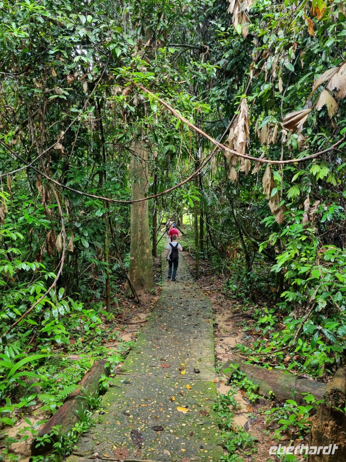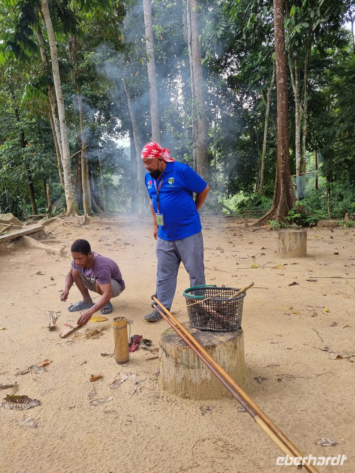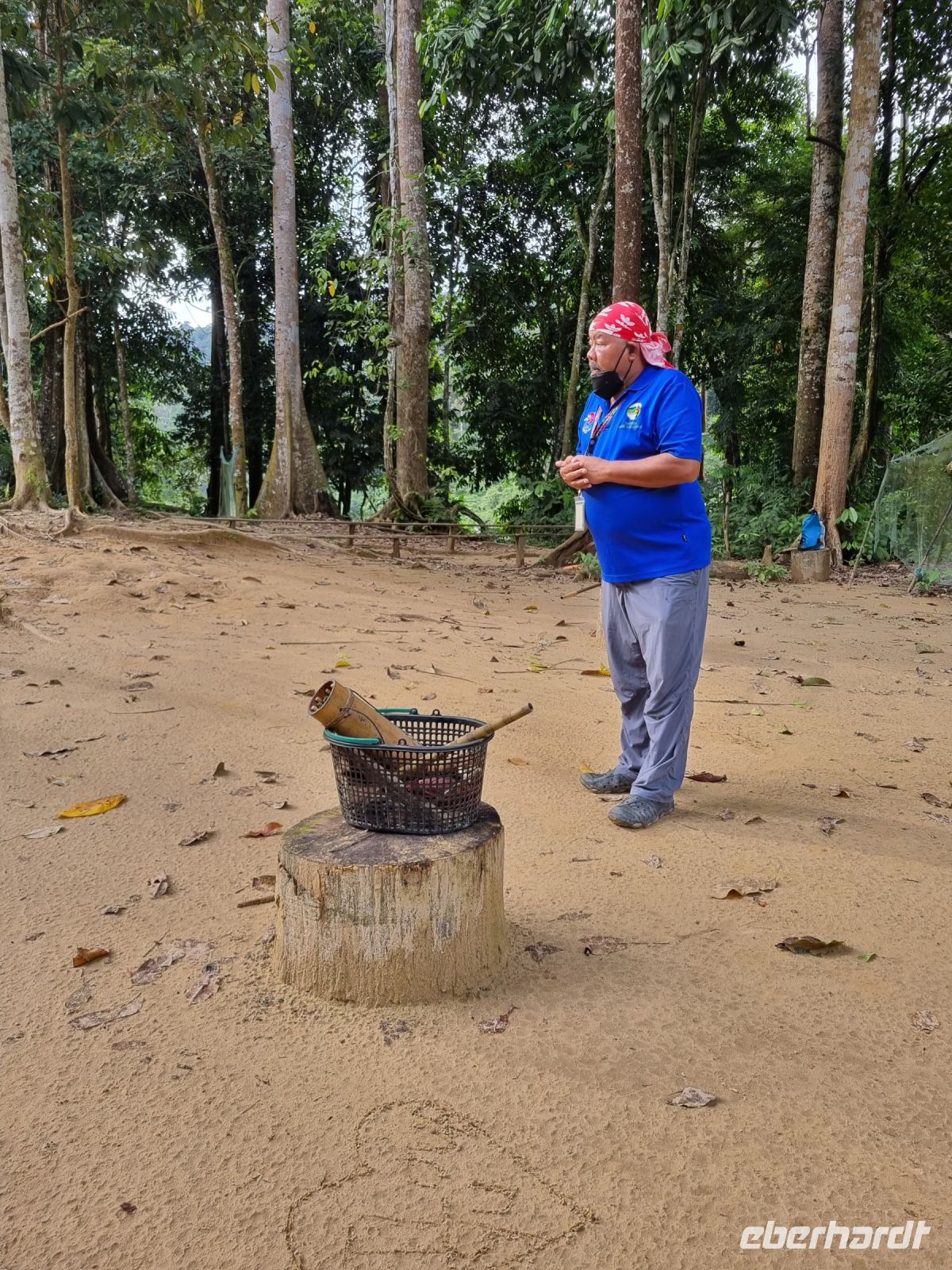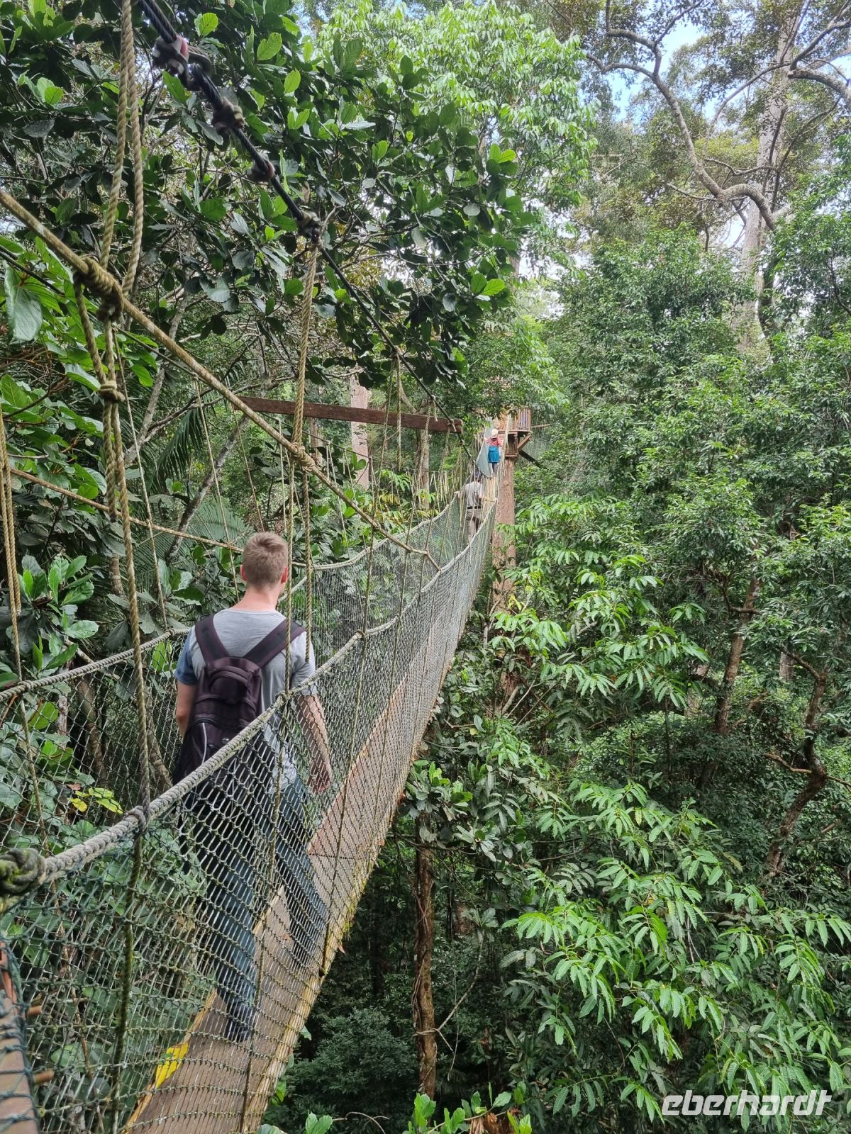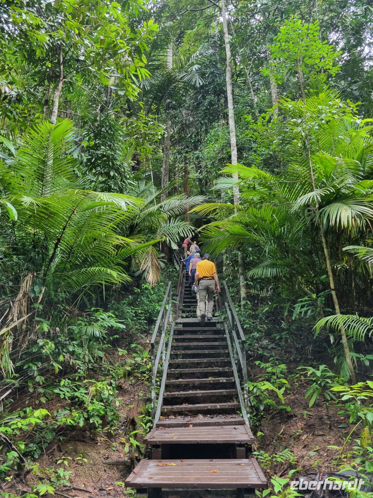 Da es die gesamte Nacht geregnet hatte, starteten wir die Wanderung zum Bukit Teresek bei einer extrem hohen Luftfeuchtigkeit. Wir begannen von der Seite des Canopy Walkway mit dem Aufstieg und der Weg führte uns über unzählige Treppen bzw. Holzstege hinauf zu zwei Aussichtspunkten, wobei es 270 Höhenunterschied zu überwinden galt, was im tropischen Dschungel ziemlich schweißtreibend war! Wir waren erleichtert, als wir letztendlich auf dem 344 Meter hohen Bukit Teresek angekommen waren und schon ein wenig stolz auf uns. Nach einer insgesamt etwa 3-stündigen Wanderung hatten wir uns das Mittagessen im Resort redlich verdient. Gut gestärkt konnte es dann am Nachmittag mit weiteren Aktivitäten weitergehen... Auf uns warteten mehrere kleine Boote, mit denen wir etwa 30 Minuten gemütlich den Fluss entlang schipperten, ein Genuss diese Stille und einzigartige Natur...! Wir wussten zu diesem Zeitpunkt jedoch noch nicht, dass uns eine weitere recht anspruchsvolle kurze Wanderung zu einer Badestelle bevorstand. Durch die Regenfälle der letzten Tage war der Boden ziemlich aufgeweicht und es bestand vielerorts extreme Rutschgefahr, so dass oberste Vorsicht geboten war. Zum Glück verlief alles reibungslos, aber es war immerhin sehr abenteuerlich! Am späten Nachmittag fuhren wir zu guter Letzt noch mit dem Boot zu einer Siedlung der Ureinwohner Malaysias, den Orang Asli. Diese leben in kleinen Dörfern entlang des Flusses. Ein Programmpunkt, der mir selbst allerdings nicht so gut gefiel. Das Ganze hat etwas von "Freiluftkino" mit den Einwohnern als Darsteller. Tag für Tag laden Boote Touristen ab, die dann zwischen den Wohnhäusern der Menschen hin und her laufen und wild Fotos machen. Trotzdem konnten wir hier viel über das Leben des Orang Aslis erfahren. Die Jagdtechniken waren ebenso beeindruckend wie die Fähigkeit, mit einfachen Methoden ein Feuer zu entfachen.