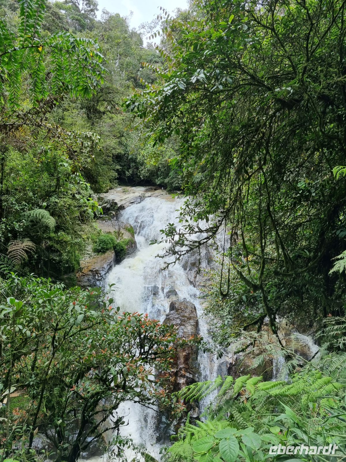 Die Tage im Dschungel waren vorüber und erneut setzten wir über den Fluss über, um zum Bus zu gelangen und die Fahrt gen Westen in Richtung Cameron Highlands fortzusetzen. Die Temperaturen waren hier in dieser Gegend bei 20 Grad sehr angenehm und von der hohen Luftfeuchtigkeit war auch nichts mehr zu spüren. Für uns eine Wohltat! Am frühen Nachmittag wurden wir in Tanah Rata von zwei Jeeps abgeholt und starteten wenig später eine Wanderung der etwas anderen Art, die wir aus sicherheitstechnischen Gründen jedoch nach einer gewissen Zeit abbrechen mussten... Zumindest konnten wir einen der Höhepunkte dieser Wanderung erleben und zwar den Robinson-Wasserfall. Er war zwar nicht sonderlich spektakulär, aber immerhin gab es etwas zu sehen... Nun fing es auch noch zu regnen an und wir checkten sogleich im Strawberry Park Hotel ein. Das Abendessen war heute ebenso besonders. Wir bekamen "Steamboat", eine Art chinesisches Fondue, bei dem rohes Fleisch, Fisch und Gemüse in einer kochenden Brühe an unserem Tisch von uns selbst zubereitet werden musste. Allgemeiner ist es auch als Hot-Pot bekannt, wobei Malaysia und Singapur es ausschließlich "Steamboat" taufen. Das Essen wird in einem Dampfschiffkocher gekocht, der die Brühe für die Dauer sanft erhitzt. Normalerweise wird das Gericht im Winter gegessen, da es der Höhepunkt der wärmenden Hausmannskost ist, aber aufgrund seiner steigenden Beliebtheit genießen die Menschen es das ganze Jahr über. Beliebte Steamboat-Zutaten sind Fleisch, Fisch, Meeresfrüchte, Gemüse, Nudeln, Eier, Pilze und Tofu. Es war super und unser selbst zubereitetes Essen schmeckte vorzüglich!