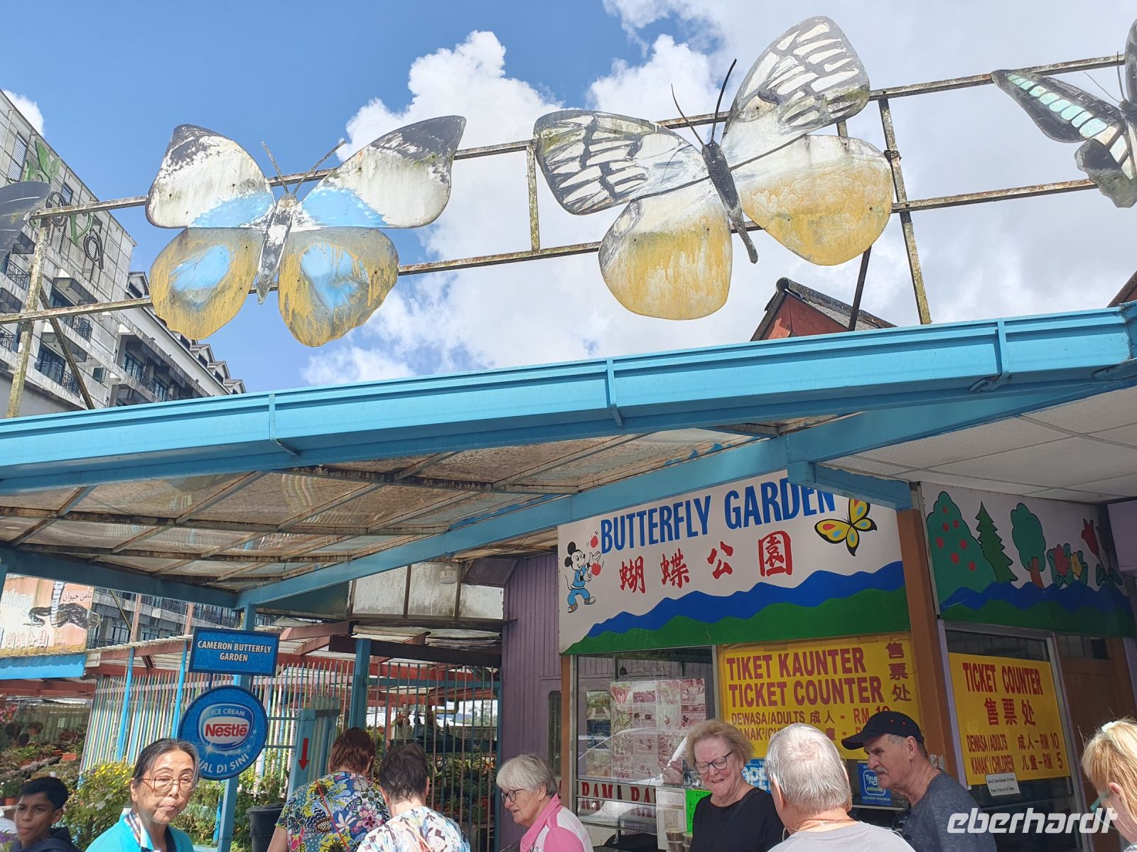 Die Cameron Highlands sind aber auch bekannt für ihre Schmetterlings- und Erdbeerfarmen. Die Schmetterlingsfarm war mit ihren bunten Blumen und farbenfrohen Malereien farbenfroh gestaltet. Die Schmetterlinge leben leider nur zwei Wochen lang – sahen mit ihren unterschiedlichen Farben und Musterungen aber wunderschön aus und kamen uns auch sehr nah.