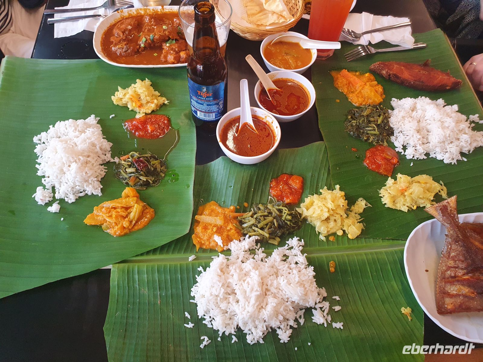 Heute stand uns auch noch ein ganz besonderes Abendessen bevor: Wir aßen in einem indischen Restaurant direkt von Bananenblättern. Hier sollte man versuchen nur mit den Händen zu essen – und nur mit der rechten, da die linke Hand als unrein gilt. Aus riesigen Töpfen wurden uns Reis und andere Beilagen und Saucen auf das Bananenblatt gehäuft. Dazu gab es wieder große Platten mit Fleisch und Fisch, von denen wir uns wieder bedienen konnten.