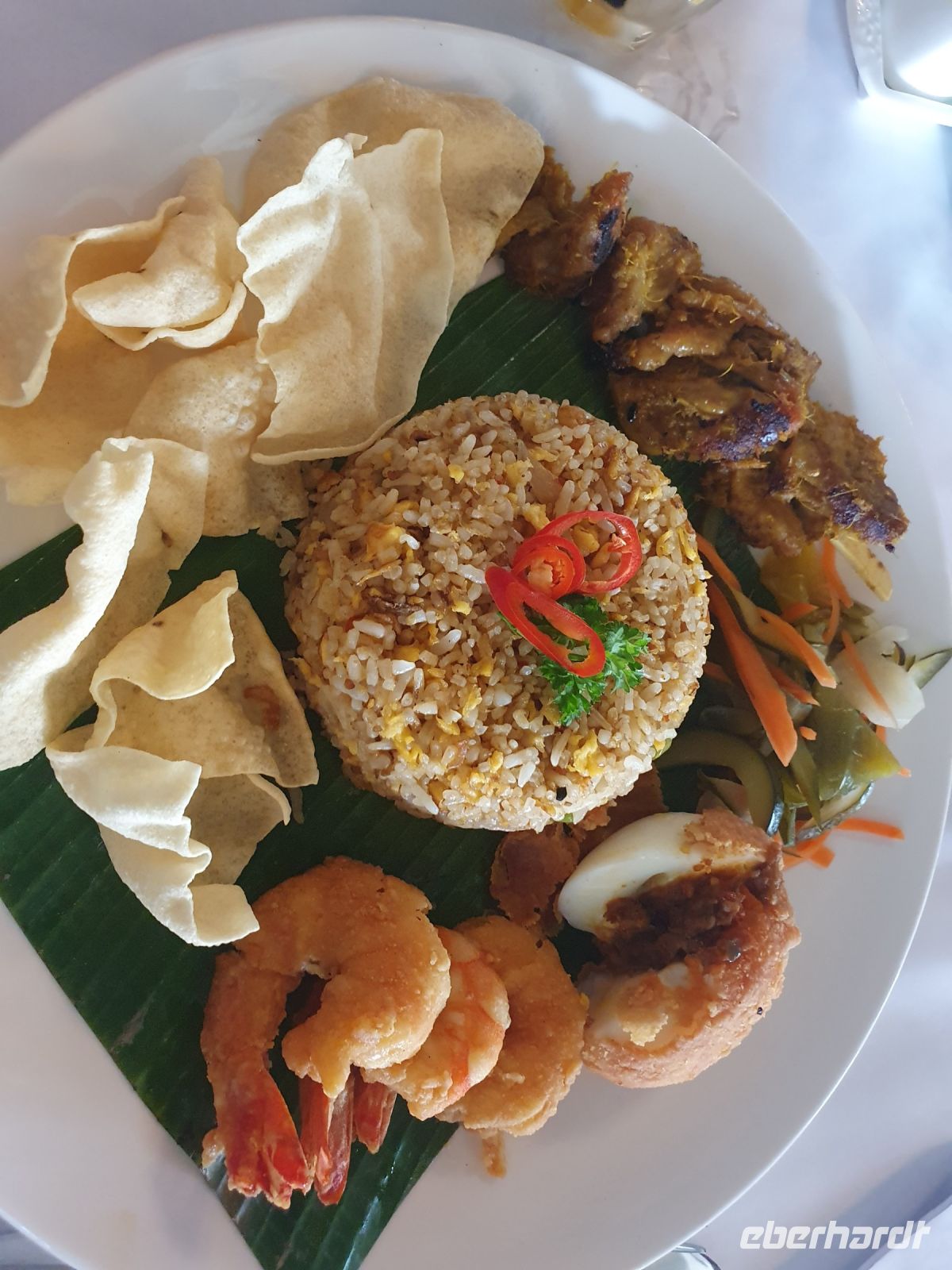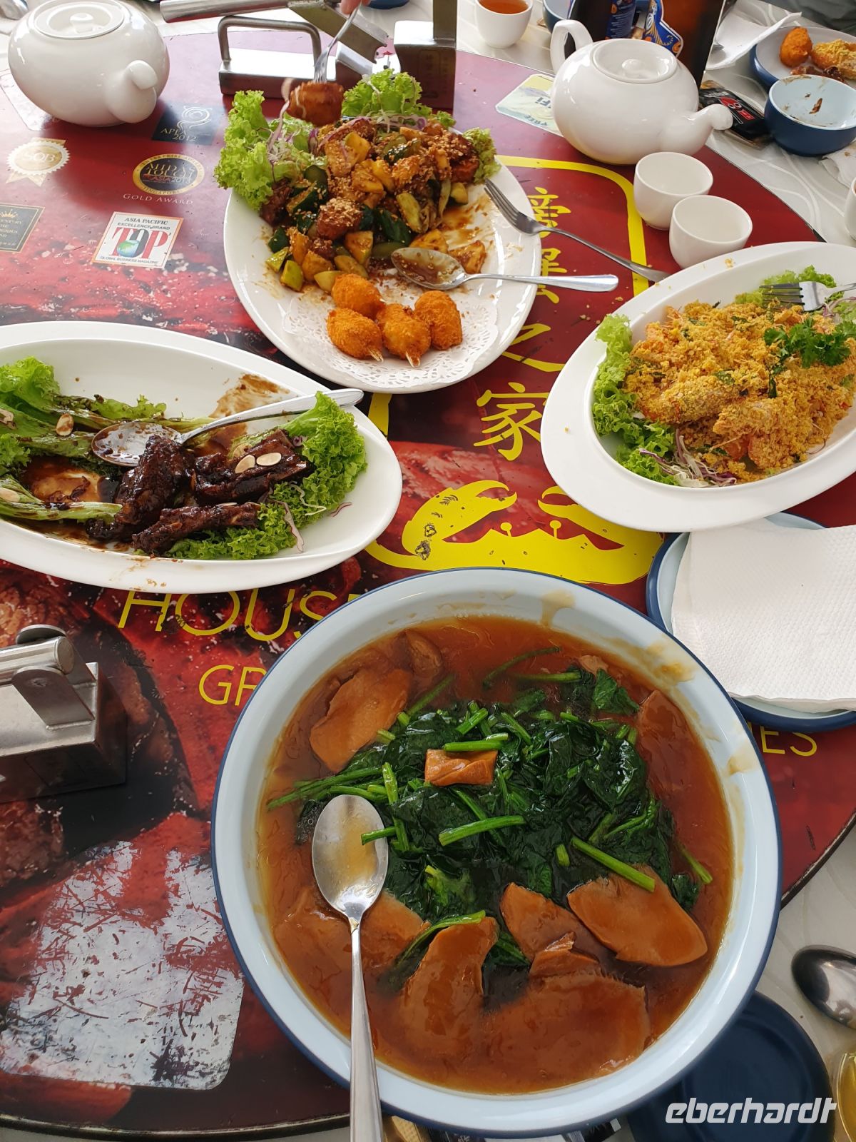 Zu Abend aßen wir wieder in einem lokalen Restaurant. Das Essen wird hier zumeist auf einer Drehscheibe serviert, auf die nach und nach Platten mit verschiedenen Beilagen, Fleischsorten und Fischspezialitäten gestellt werden. So hat jeder die Möglichkeit alles zu probieren und man sitzt sehr gesellig an einem Tisch.