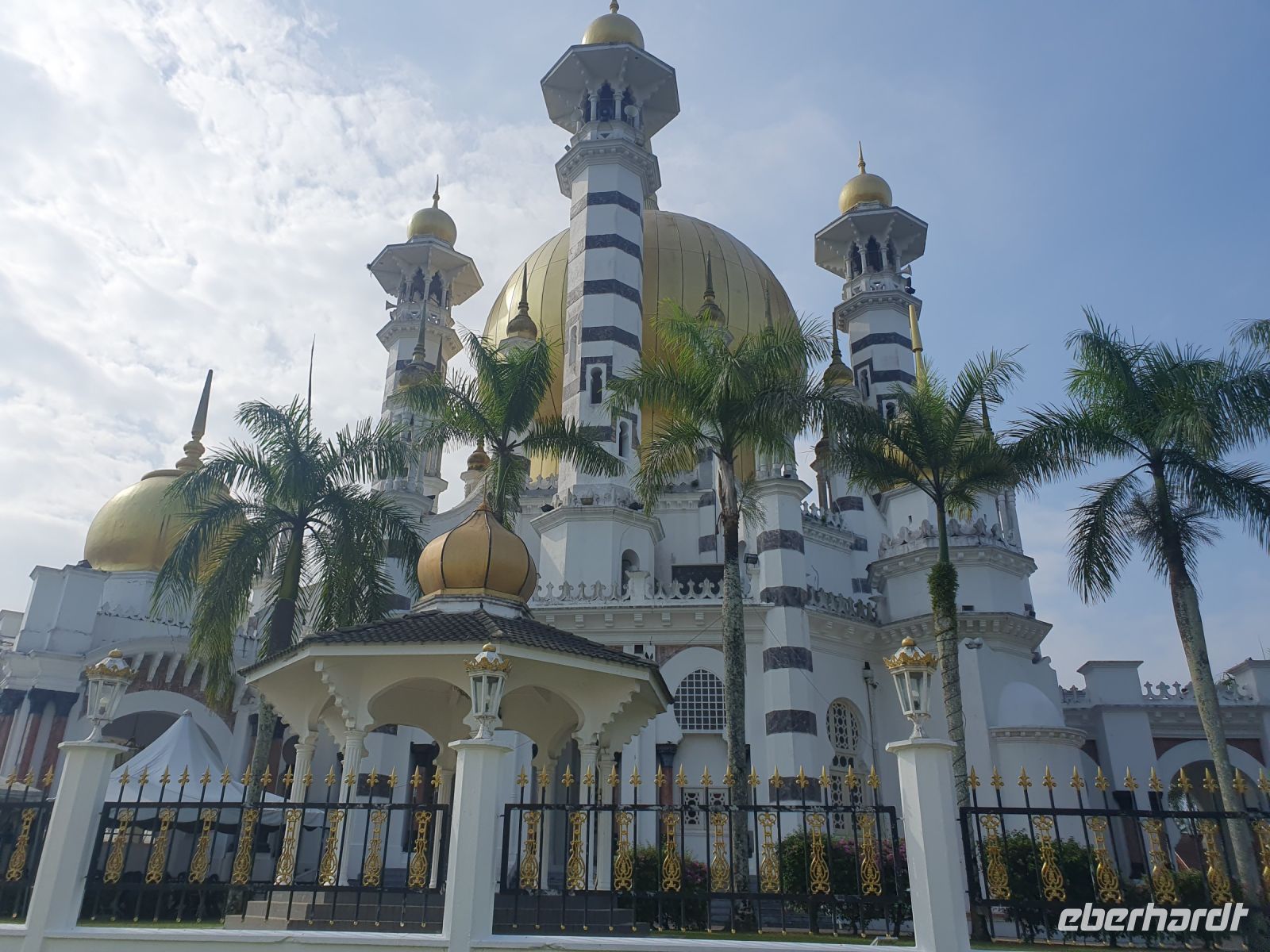 In der Nacht wurden wir alle schon von einem kräftigen Gewitter aufgeschreckt und machten uns nach einem frühen Frühstück auf den etwa 350 Kilometer langen weg nach Kuala Lumpur. Unterwegs hielten wir in der königlichen Stadt Kuala Kangsar, die zum Bezirk Perak gehört. Heute begann der erste Tag des Ramadan und wir dachten, dass es uns deswegen nicht möglich sei Ubudiah-Moschee mit ihrer goldenen Kuppel von innen zu besichtigen. Wir wurden auf dem Gelände jedoch sehr herzlich begrüßt und durften die Moschee besichtigen, obwohl hinter Wänden Frauen und Kinder beteten. Wir machten hier auch einen kleinen Abstecher am Iskandariah-Palast, der aus Bambus besteht und am Fluss Perak.