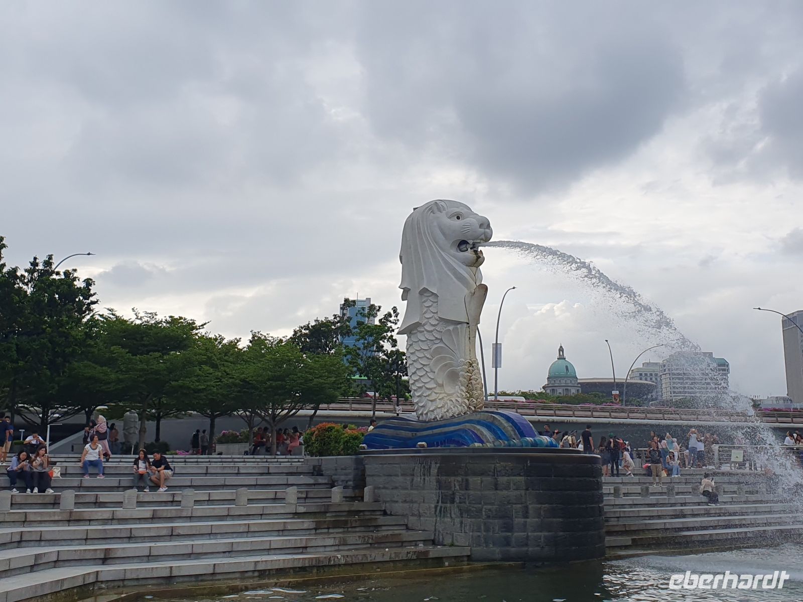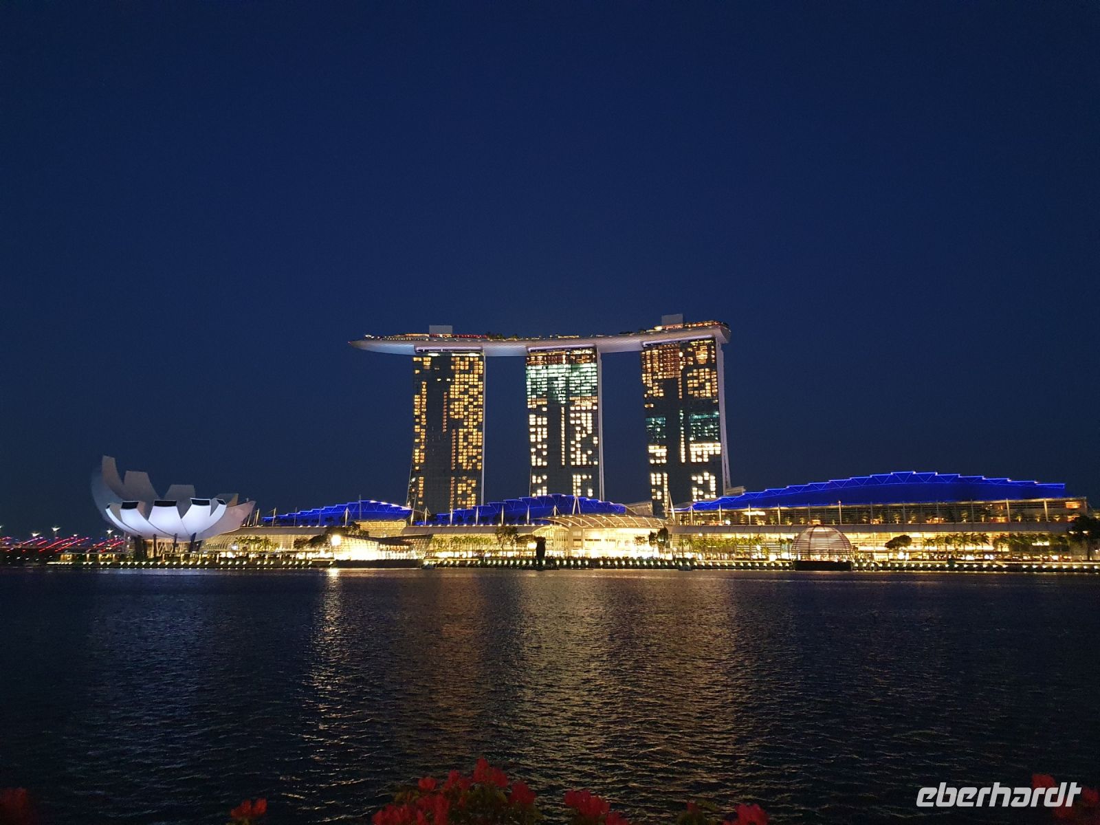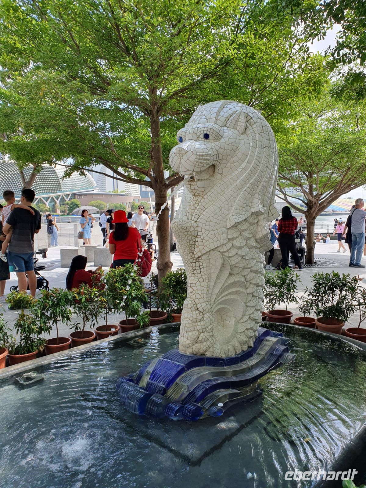 Martine führte uns diesmal durch das 6-Sterne-Hotel Fullerton, in dessen Mitte sich ebenfalls ein Wasserfall in einem Becken ergoss, in dem 23 Jahre alte Kois schwammen, von denen jeder Einzelne mehrere Tausend Singapur Dollar wert ist. Nachdem wir das Hotel verlassen hatte, erwartete uns ein traumhaftes Fotomotiv auf das am meisten fotografierte Hotel weltweit – das Marina Bay Sands. Die Aussichtsplattform, die sich über die drei Türme erstreckt, steht in den kommenden Tagen auch noch bei uns auf dem Programm. In den drei Türmen sind neben dem Hotel auch eine Galerie, eine Shopping-Mall, Büros und Galerien untergebracht und insgesamt arbeiten in diesem Komplex über 10.000 Menschen.