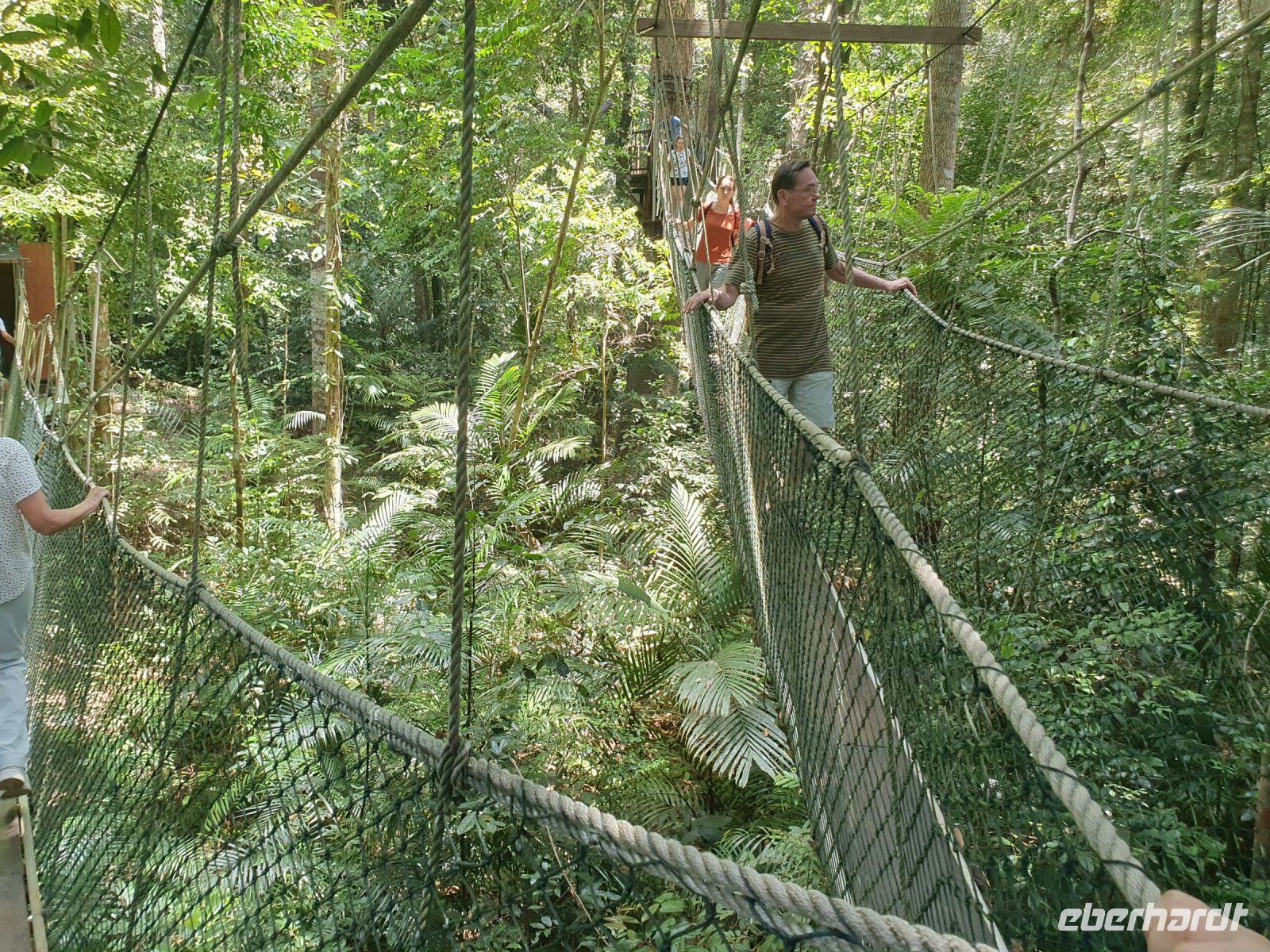 Heute erwarteten uns nach dem Frühstück Aktivitäten im Taman Negara Nationalpark. Zuerst ging unsere gesamte Gruppe in Richtung Canopy Walk. Dieser ist 700 Meter lang und an der höchsten Stele 45 Meter hoch. Zu dem Baumwipfelpfad gehören 7 Hängebrücken, die man überschreiten muss und dazwischen 6 Aussichtsplattformen, von denen aus man Fotos machen kann.
