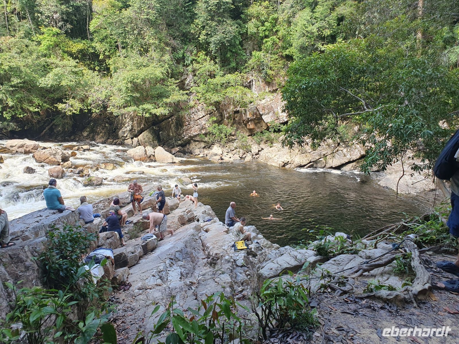 Davor konnten wir noch auf den Teresek Hill wandern, von dem aus man bei klarem Wetter den Gunung Tahan – den höchsten Berg Malaysias sehen kann. Aufgrund der schwülen Wärme war dieser Aufstieg jedoch nicht ganz ohne. Nach dem Mittagessen brachten und Motorboote mit Stop an einem 600 Jahre alten Baum und einer Fischfutterstation nach Lata Berkoh. Hier mussten wir wieder ca. eine halbe Stunde laufen, bis sich vor uns eine kleine Wasserkaskade eröffnete, bei der man in einer Art natürlichem Jacuzzi schwimmen konnte. Dieser Ausflugspunkt war für viele eine willkommene Erfrischung und ein tolles Highlight. Somit ging unser Aufenthalt im Taman Negara Nationalpark - der uns wieder eine völlig andere Facette von Malaysia gezeigt hat – bereits langsam zu Ende.
