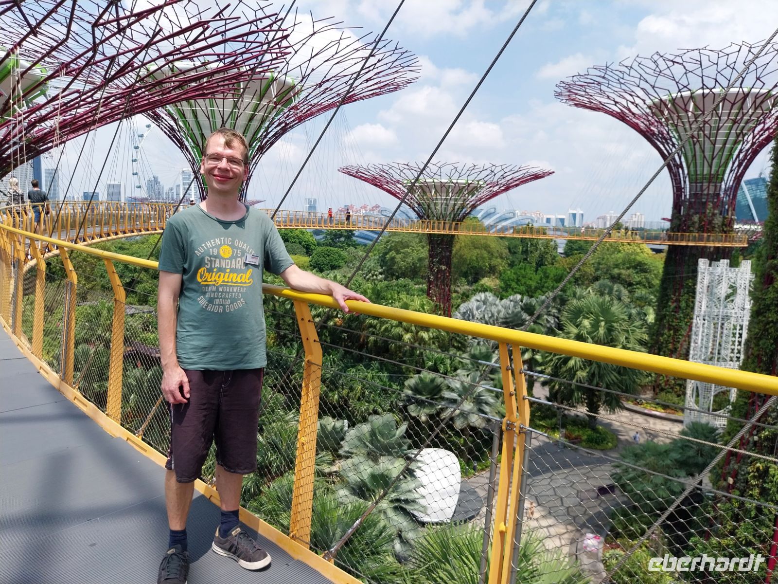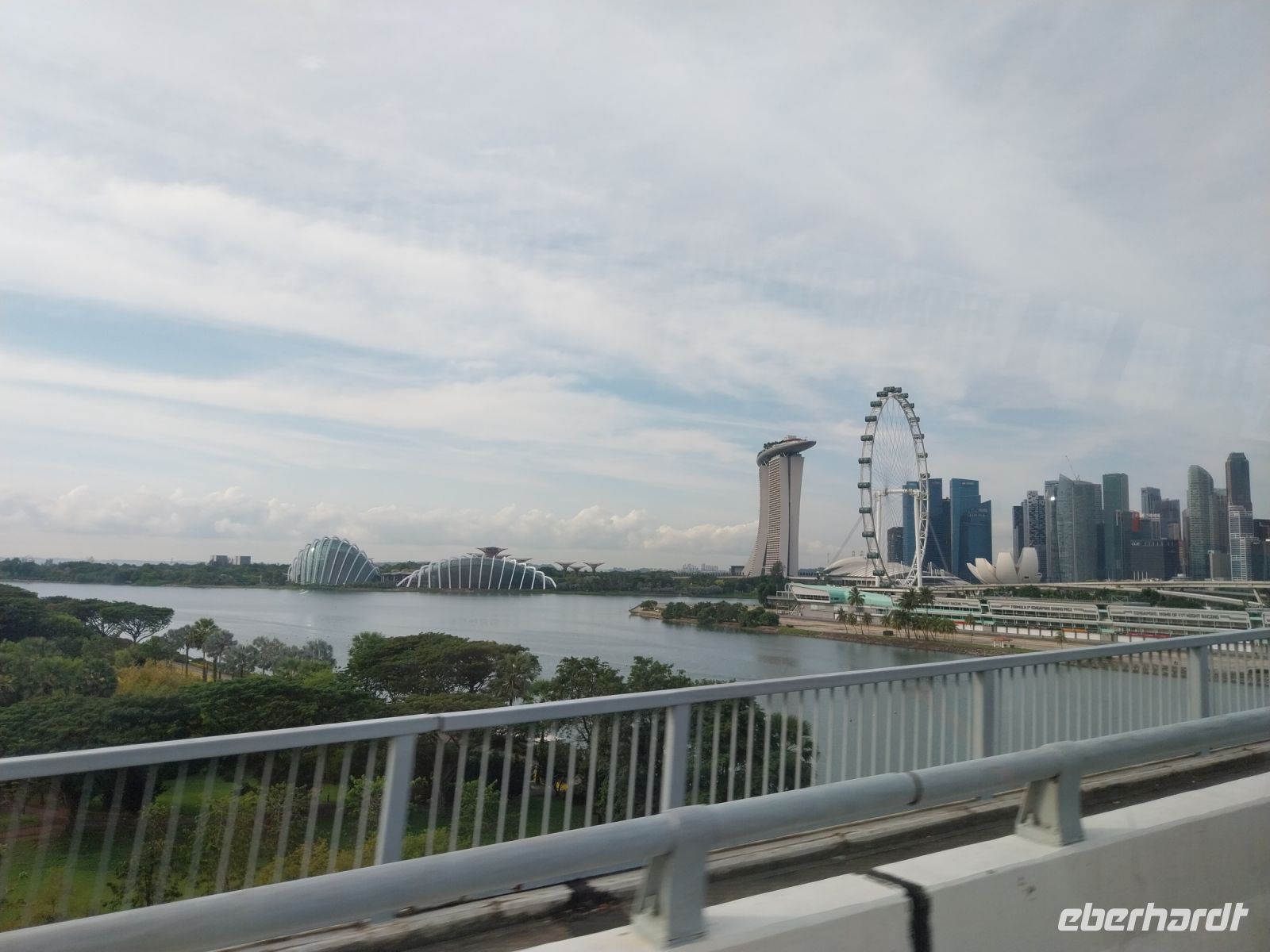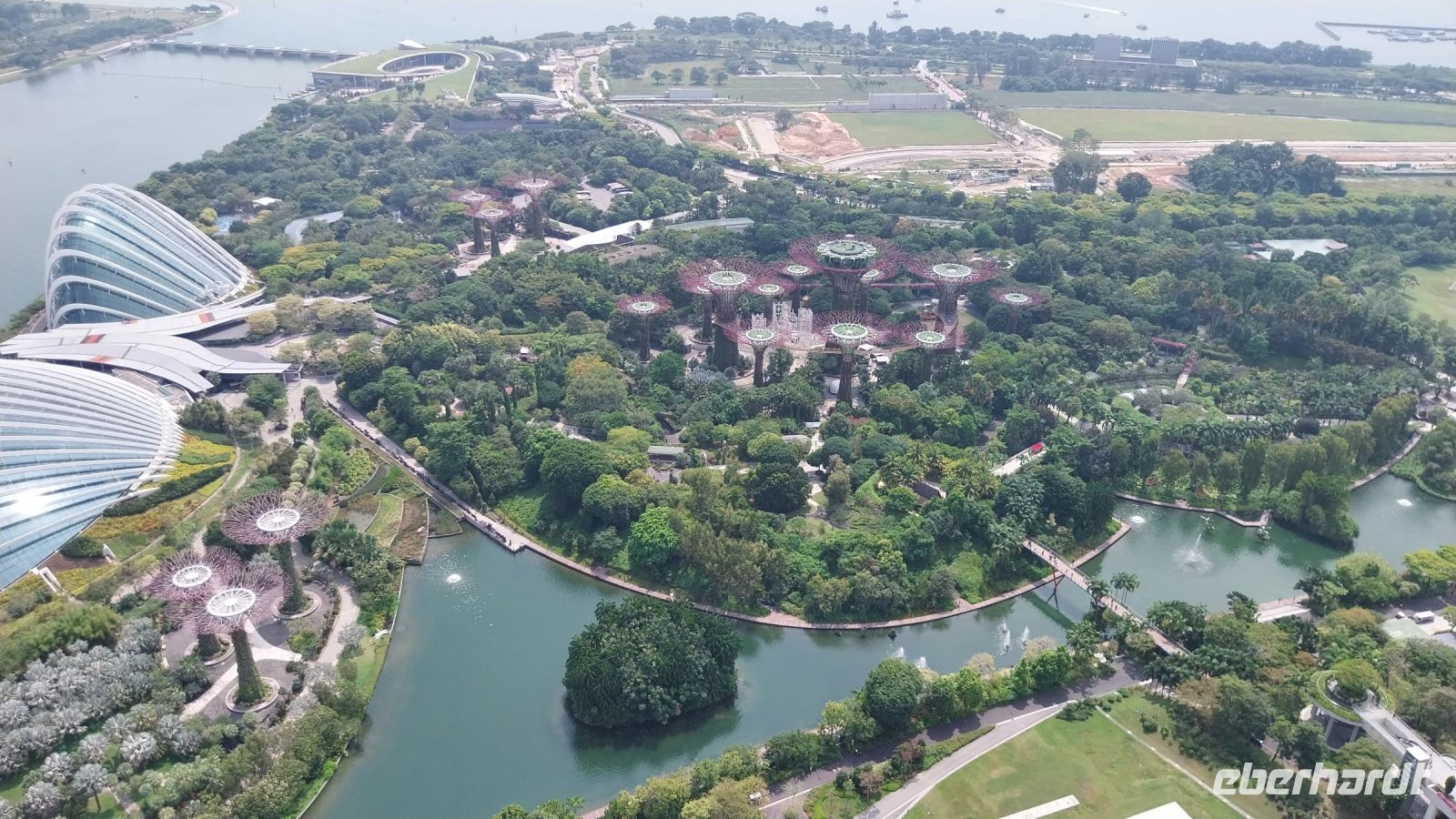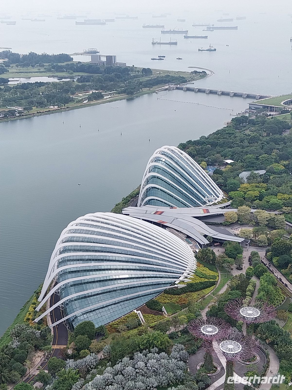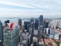 Pünktlich zur Öffnung um 11 Uhr fahren wir zur Aussichtsplattform. Es ist zwar noch etwas diesig. Wir genießen jedoch trotzdem die Aussicht und sehen u. a. auch den Gardens by the Bay, die riesigen Hallen des Flower Domes und Cloud Forests, welche wir im Anschluss noch besuchen.