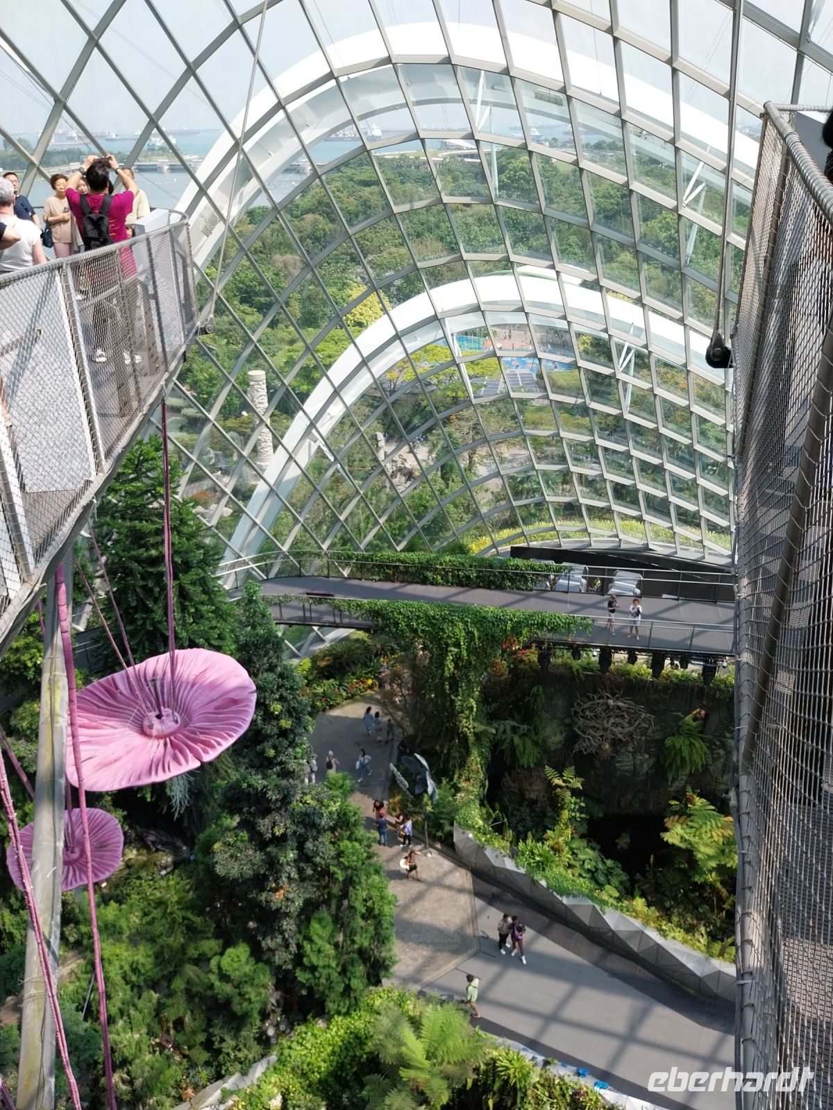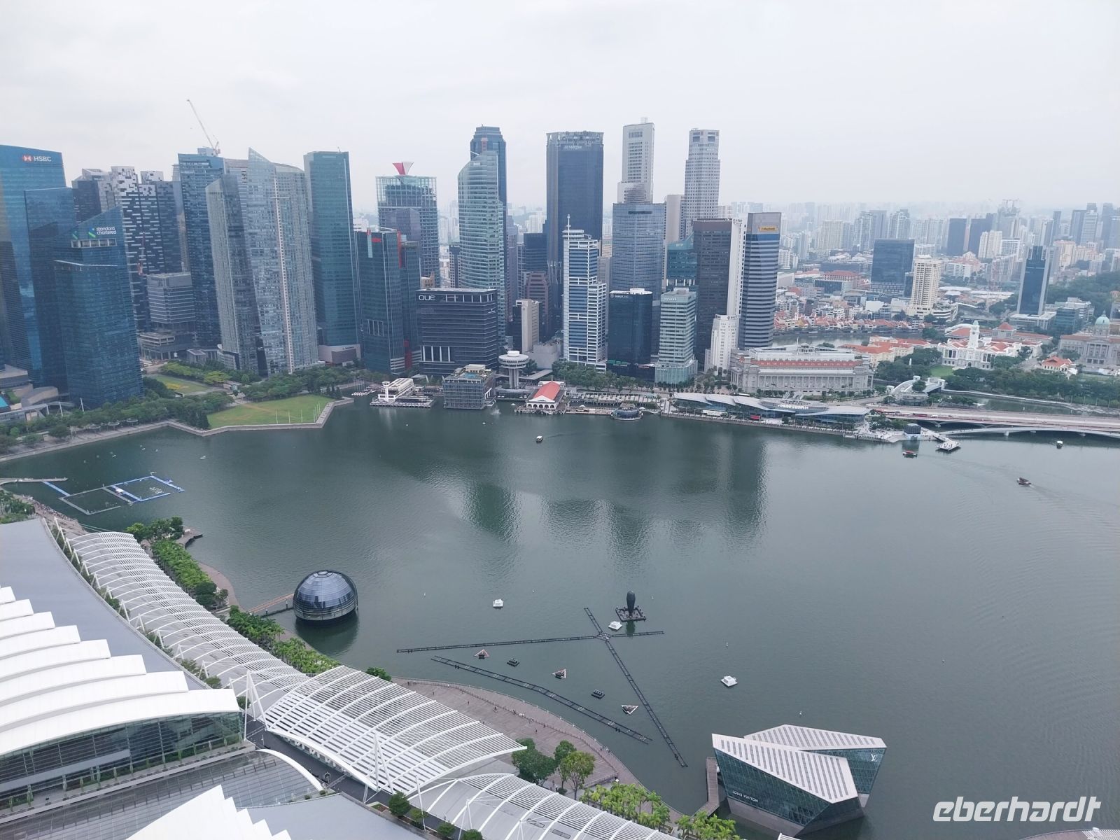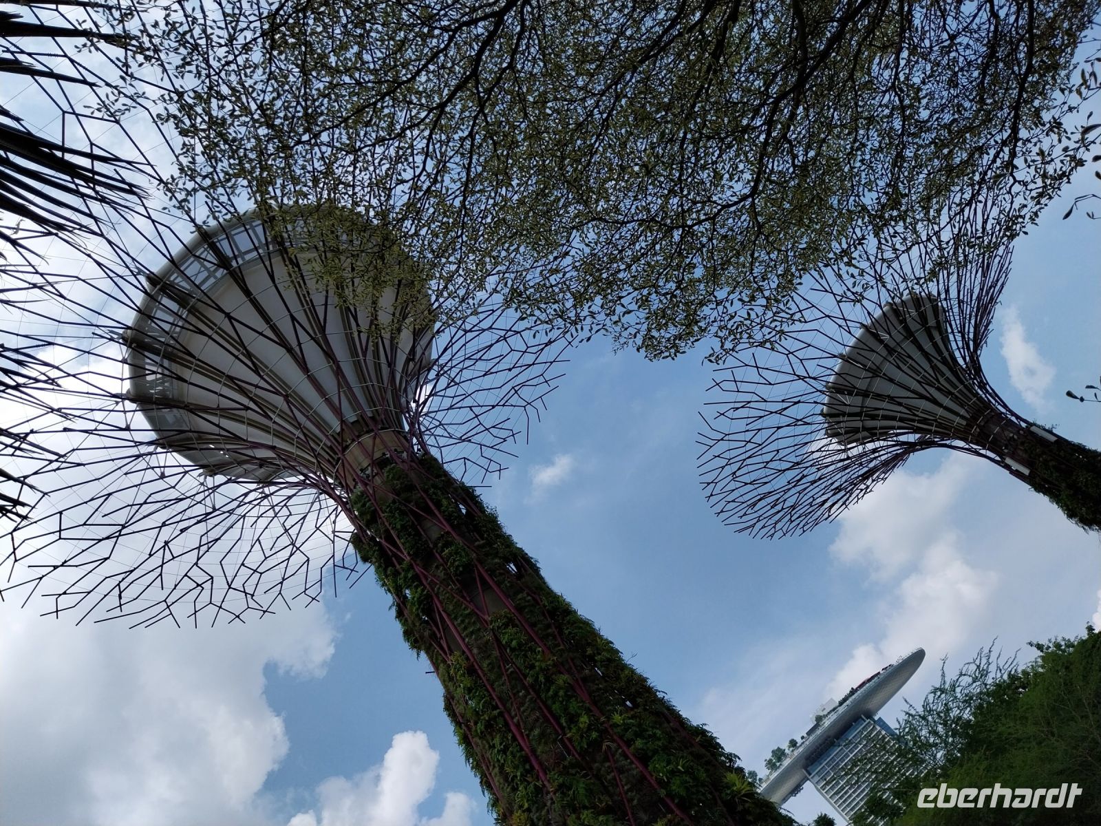 Pünktlich zur Öffnung um 11 Uhr fahren wir zur Aussichtsplattform. Es ist zwar noch etwas diesig. Wir genießen jedoch trotzdem die Aussicht und sehen u. a. auch den Gardens by the Bay, die riesigen Hallen des Flower Domes und Cloud Forests, welche wir im Anschluss noch besuchen.