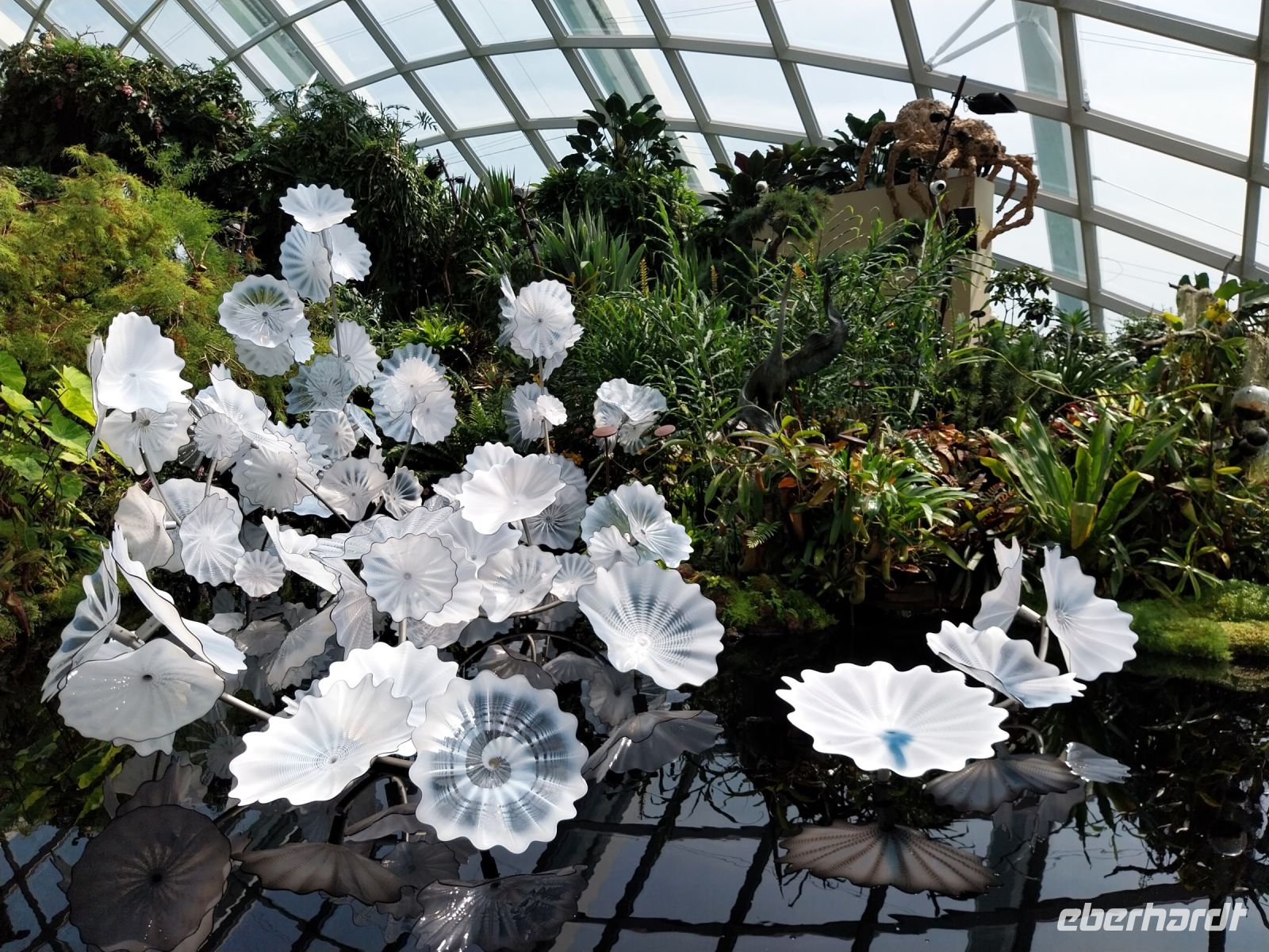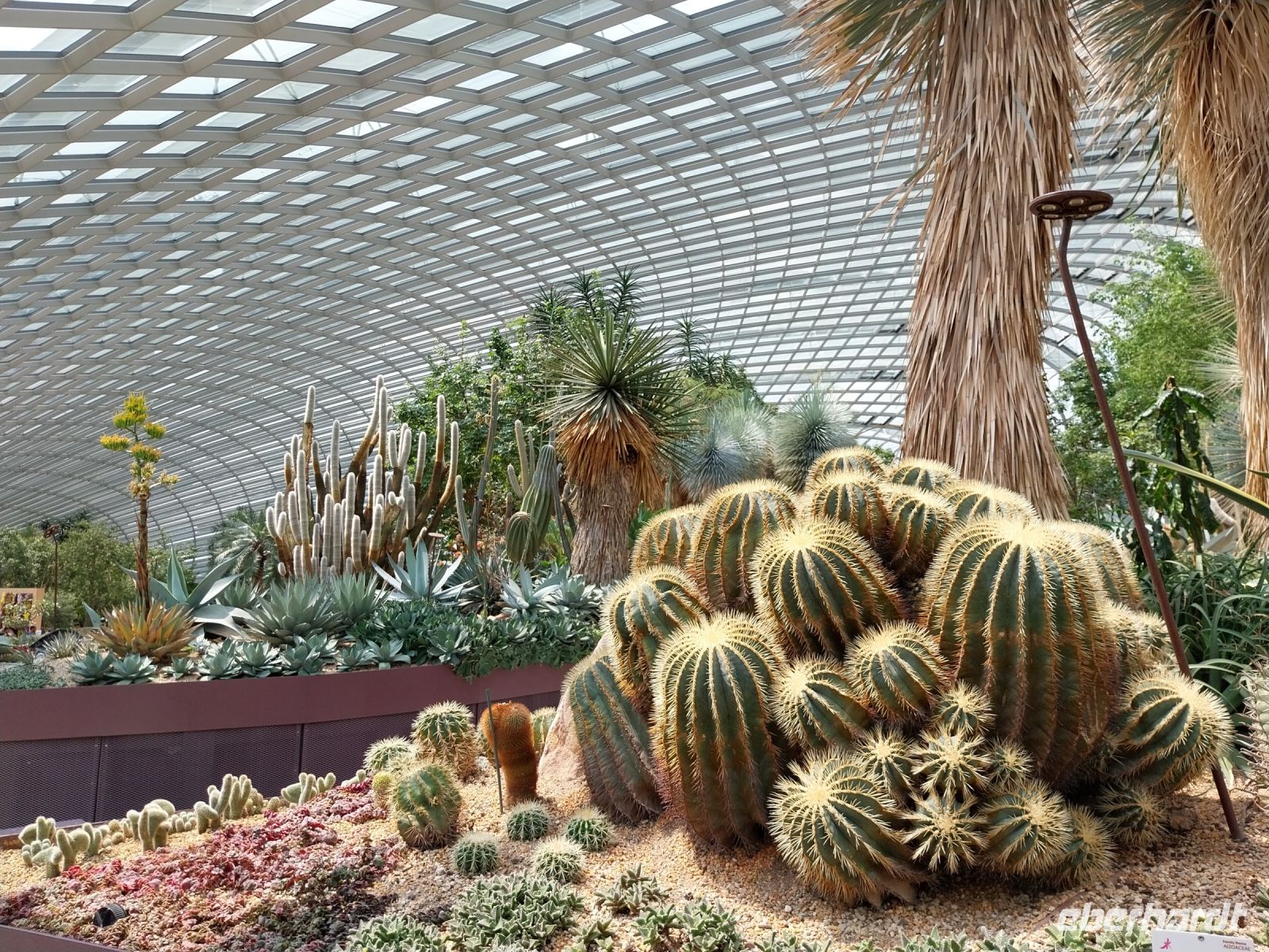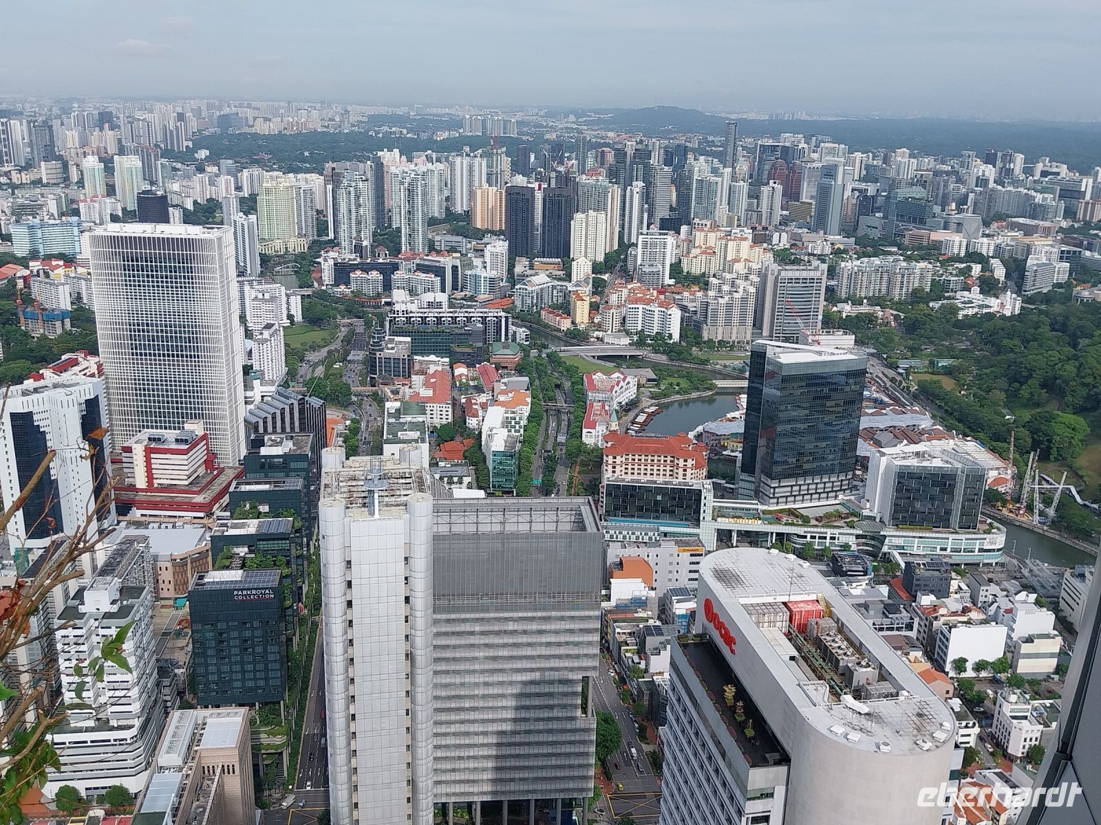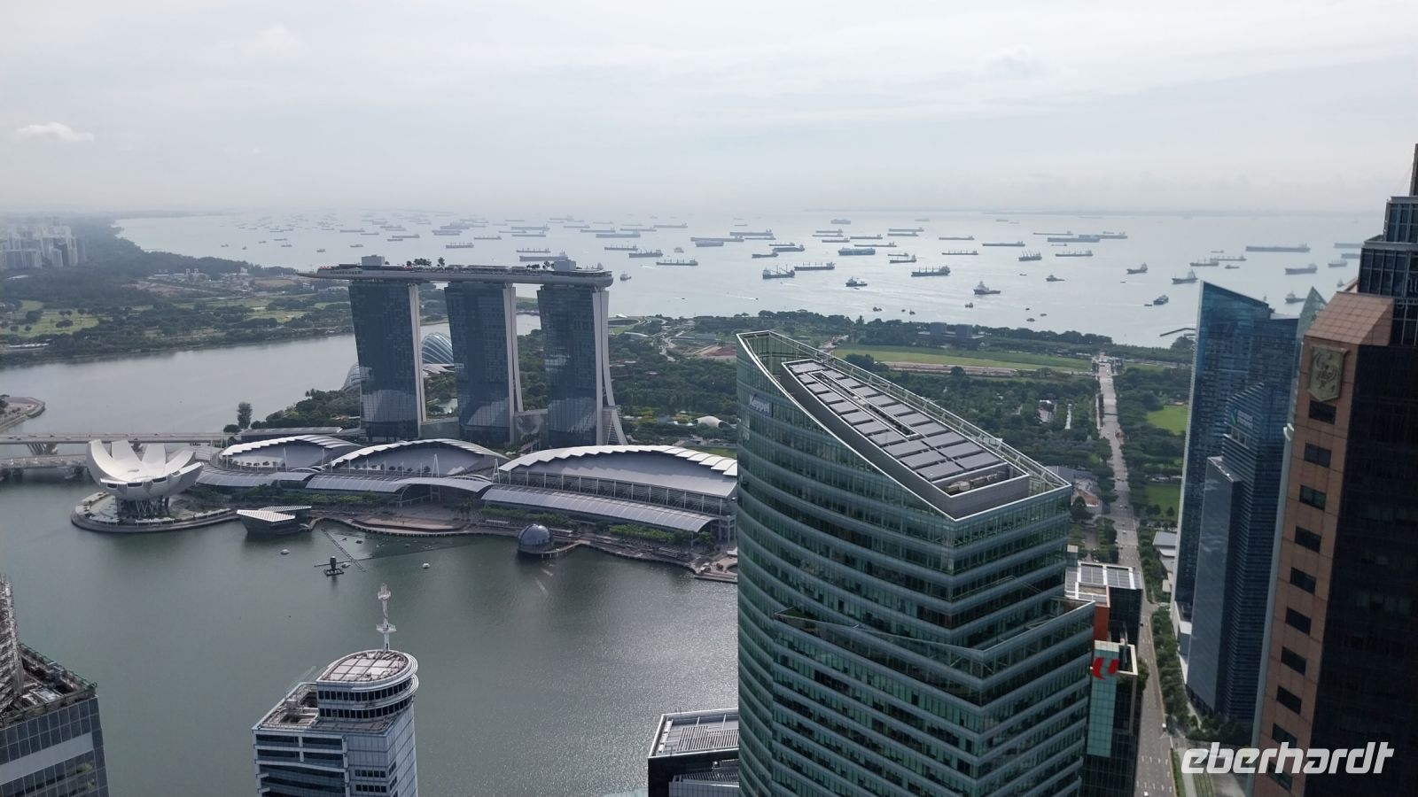 Pünktlich zur Öffnung um 11 Uhr fahren wir zur Aussichtsplattform. Es ist zwar noch etwas diesig. Wir genießen jedoch trotzdem die Aussicht und sehen u. a. auch den Gardens by the Bay, die riesigen Hallen des Flower Domes und Cloud Forests, welche wir im Anschluss noch besuchen.