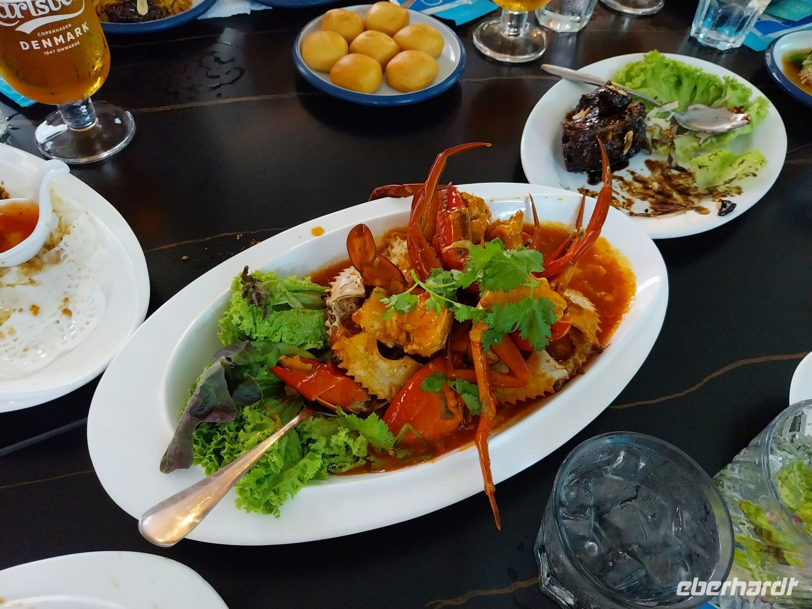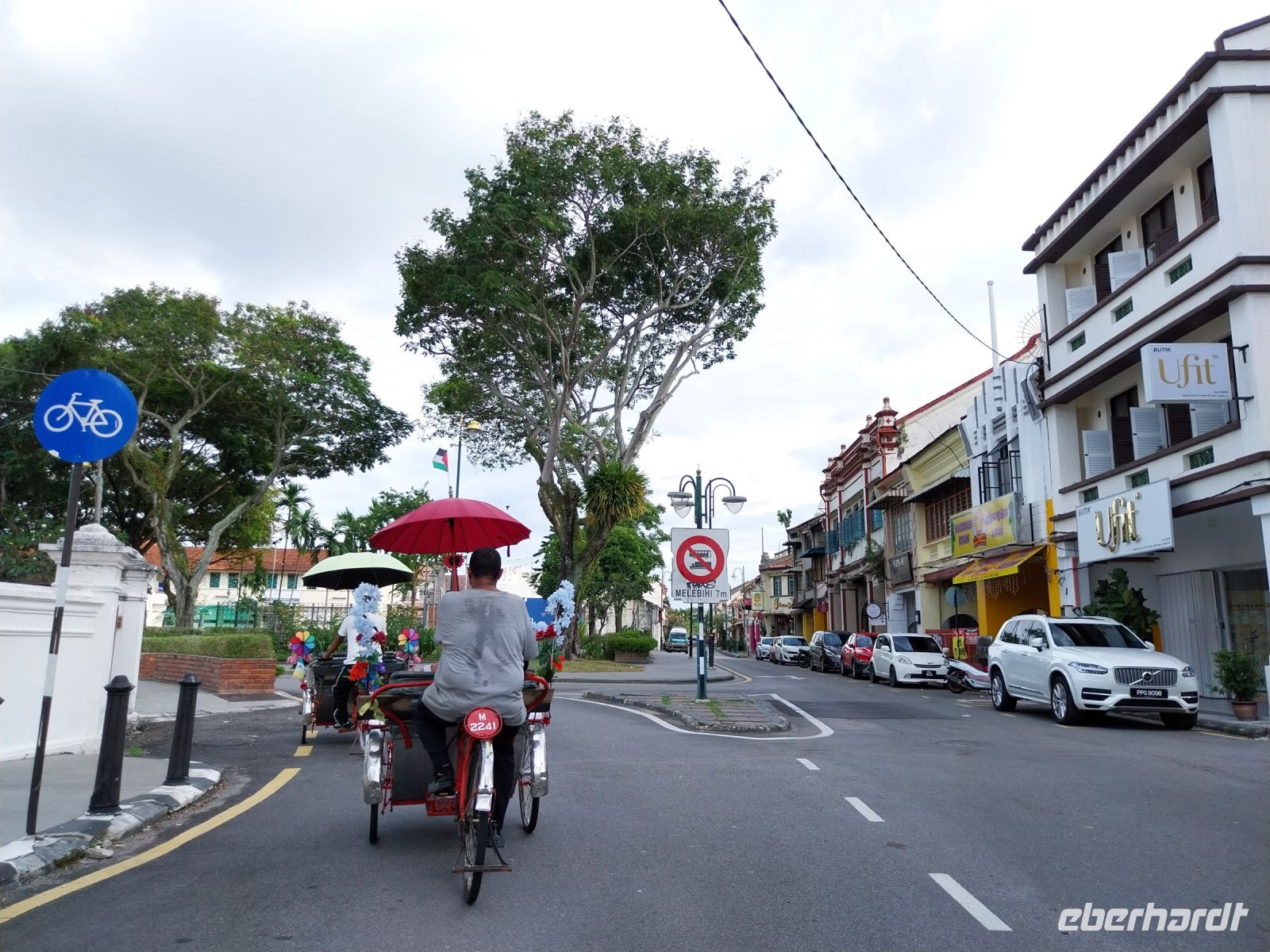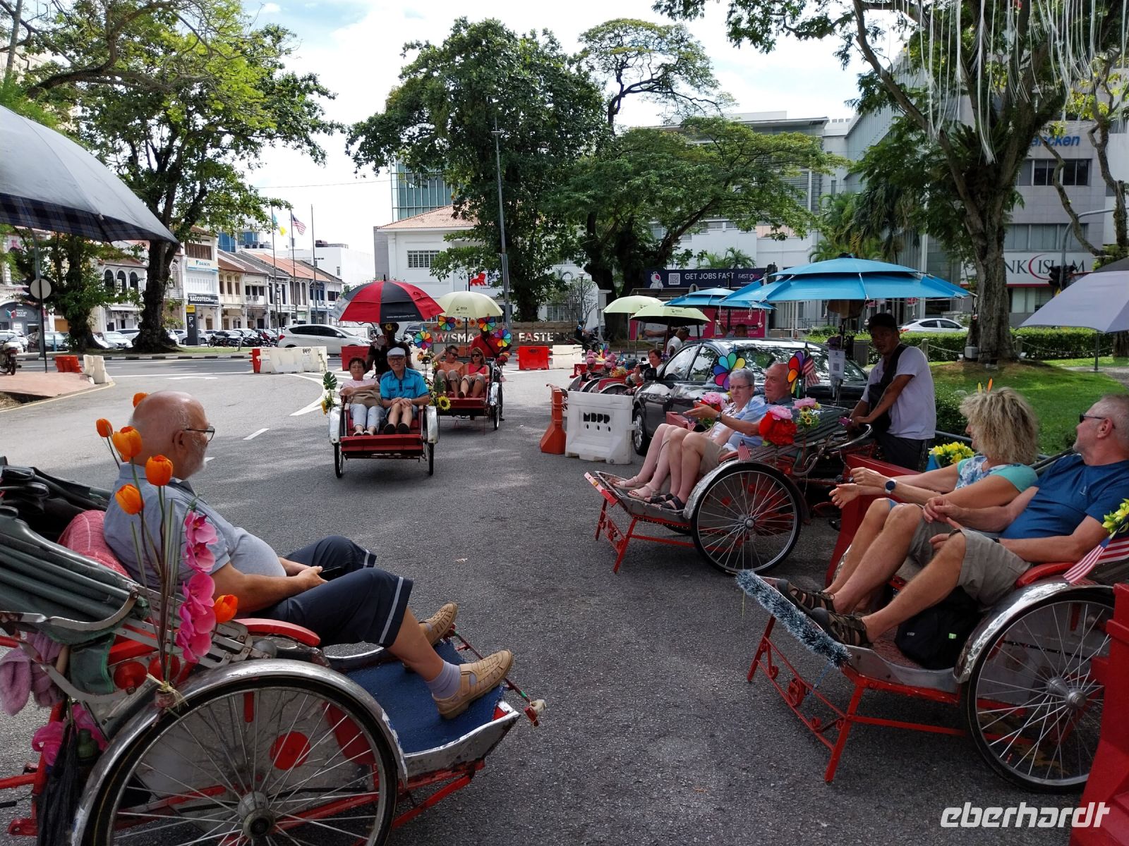 Da heute noch ein Gast seinen Geburtstag feiert, gibt es nach dem Mittagessen leckere Schokoladentorte. Anschließend geht es gut gestärkt auf Rikschafahrt. Wir besichtigen Chew Jetty und staunen über die Schalungen der Stelzen, welche die Häuser über Wasser halten. Wir fahren weiter zum reichverzierten Tempel der Familie Khoo und sehen unterwegs verschiedene Street Art.