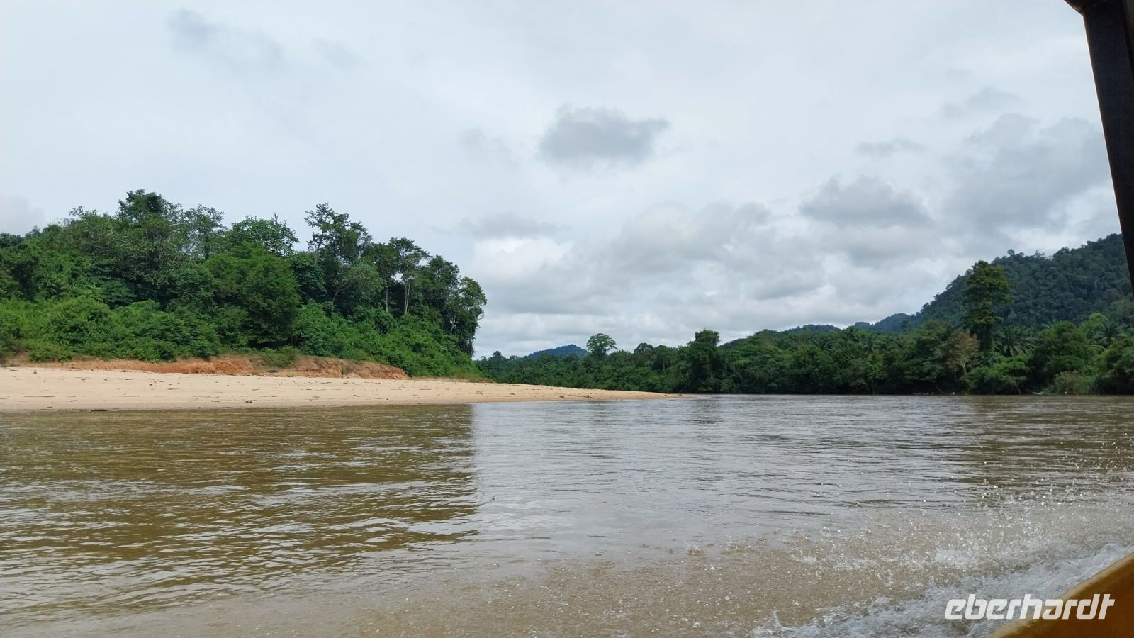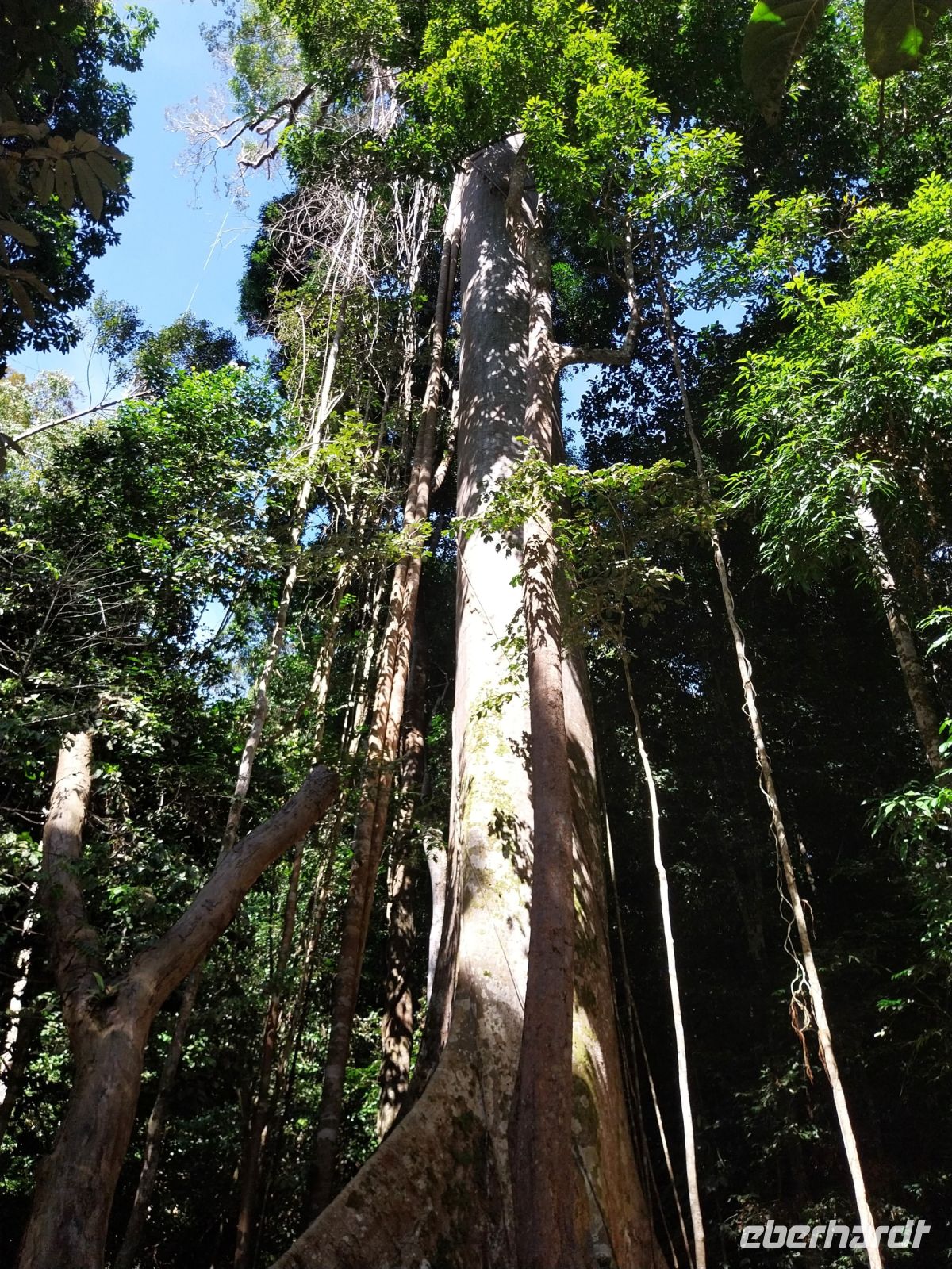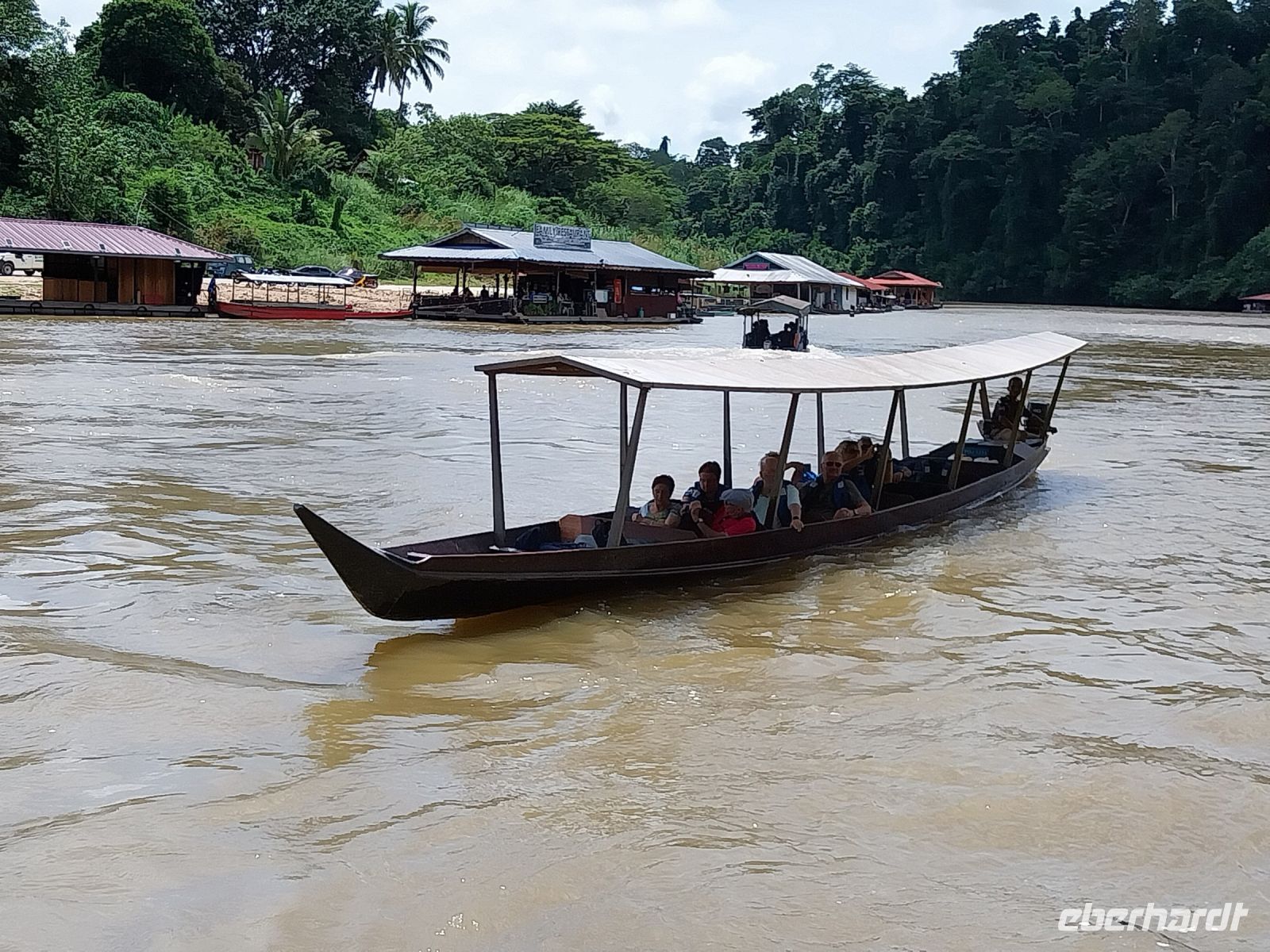 Am Nachmittag unternehmen wir eine Bootsfahrt auf dem Tahan-Fluss. Unterwegs halten wir an einem 450 bis 500 Jahre 70 Meter hohen Baum.