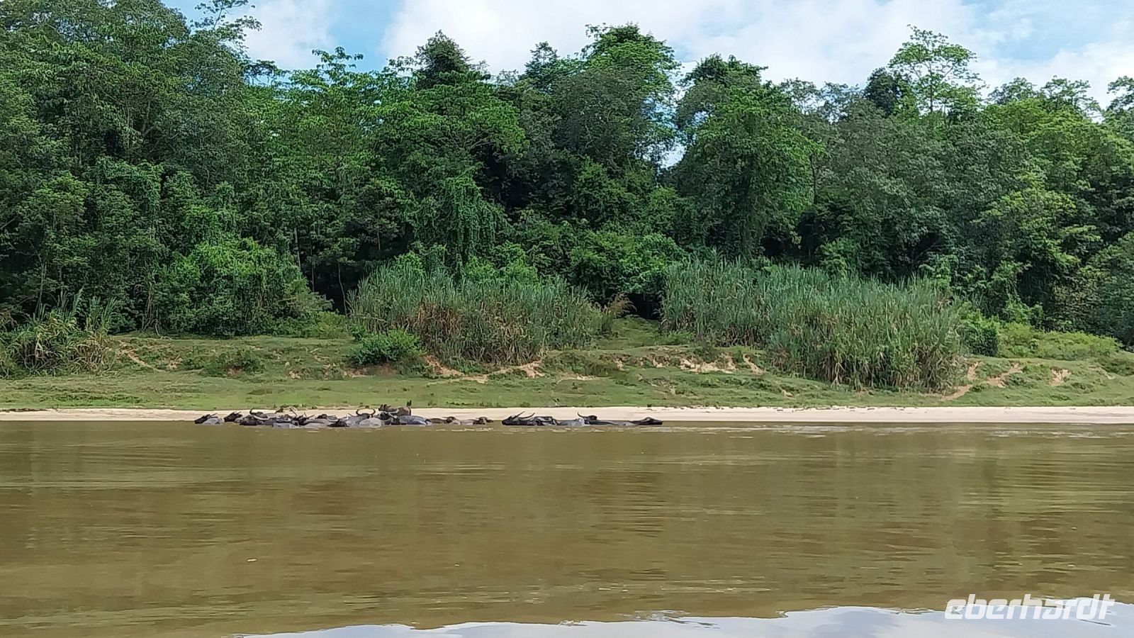 Bereits 6 Uhr morgens werden wir unsanft geweckt und nach dem Frühstück fahren wir mit einem neuen Reisebus zum Taman Negara Nationalpark. Unterwegs sehen wir bei Sonne und klarer Sicht Genting Hills. Eine Hotel- und Casinostadt auf 1800 m Höhe. Wir fahren jedoch weiter nach Labu Sentral, wo wir mit einem Teil unseres Gepäcks zwei Boote besteigen und ca. 75 min über den Fluss Sungai Tembeling zu unserem Hotel fahren. Unterwegs sehen wir viele Wasserbüffel, Reiher, einige kleine Siedlungen und viel Natur.