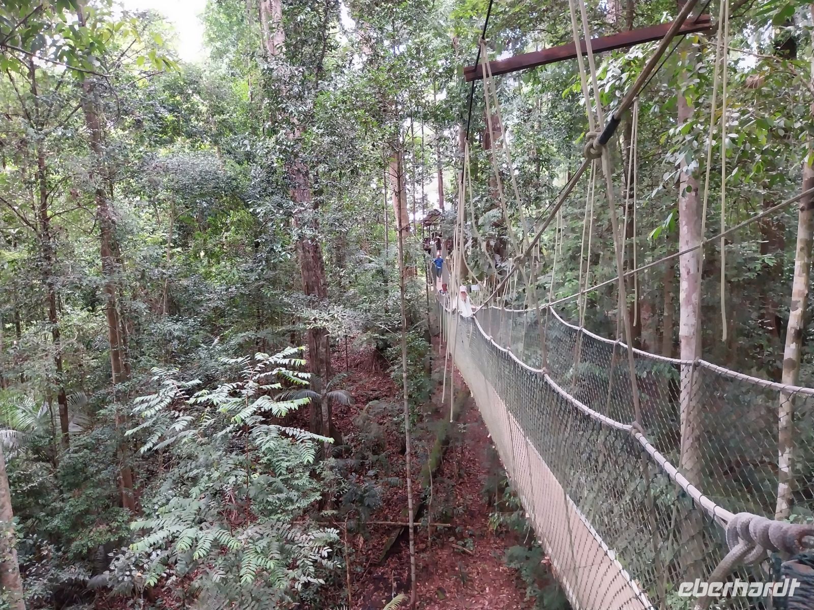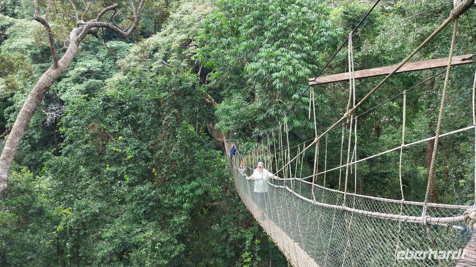 Nach einem kurzen Mittagssnack wandern wir direkt zum Canopy Walk, eines der längsten Hängebrückensysteme der Welt. Durch den Dschungel geht es über Stege und viele Stufen bergauf. Die Anstrengungen haben sich gelohnt und alle Reisegäste genießen letztlich die Aussicht von oben auf die umliegenden Bäume.
