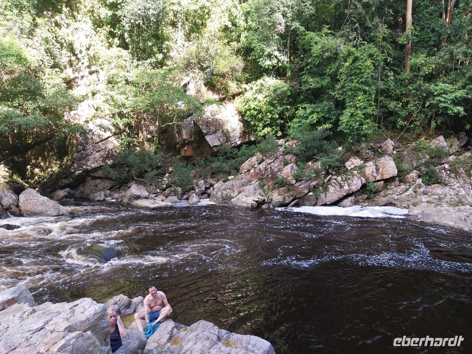 Da das Wasser recht flach ist, haben wir noch eine Wanderung zu einer Badestelle vor uns. Der Weg führt über Stock und Stein, aber alle Gäste schaffen es mit Bravour. Da uns die Anstrengungen des Tages anzusehen waren, konnten wir uns dann im Fluss erfrischen und schwimmen.