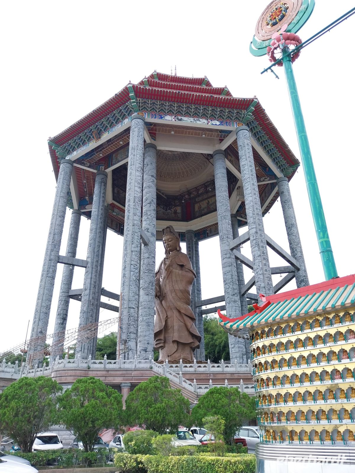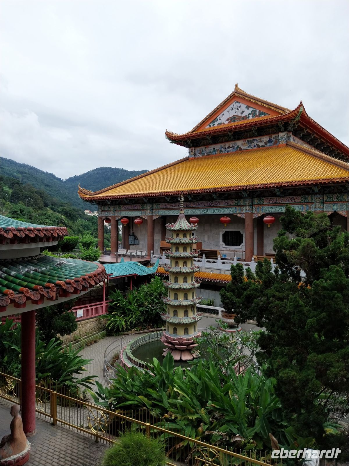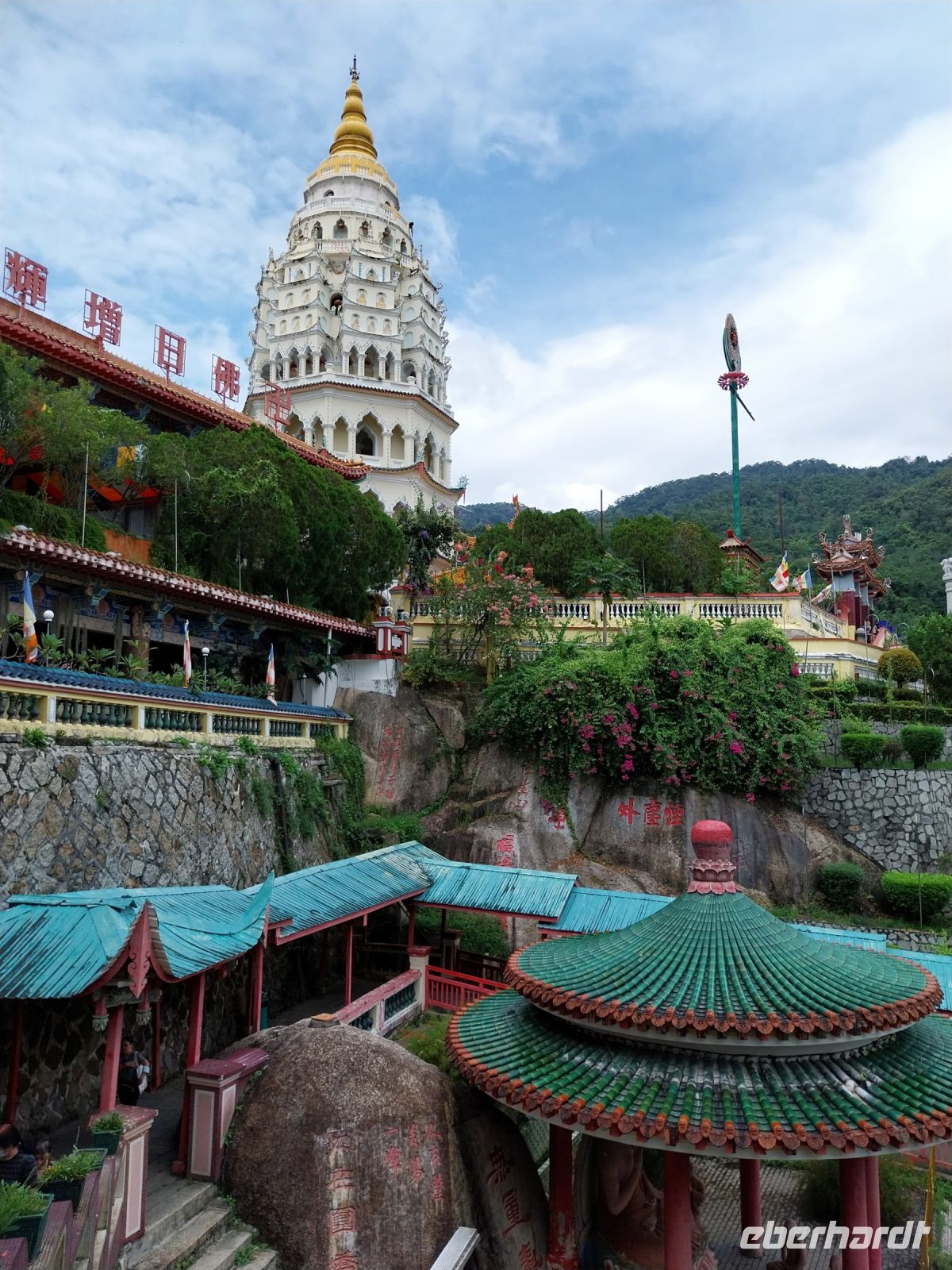 Anschließend fahren wir zum Kek Lok Si-Tempel. Eines der größten Tempel seiner Art in ganz Südostasien. Wir besichtigen die verschiedenen Ebenen und staunen über die Steinmetzarbeiten und die vielen goldenen Buddhas. Da die zweite Bergbahn jedoch defekt ist, herrscht ein wenig Chaos. Per Shuttlebus erreichen wir letztlich trotzdem den obersten Teil und sehen die Göttin der Barmherzigkeit Quan Yin.