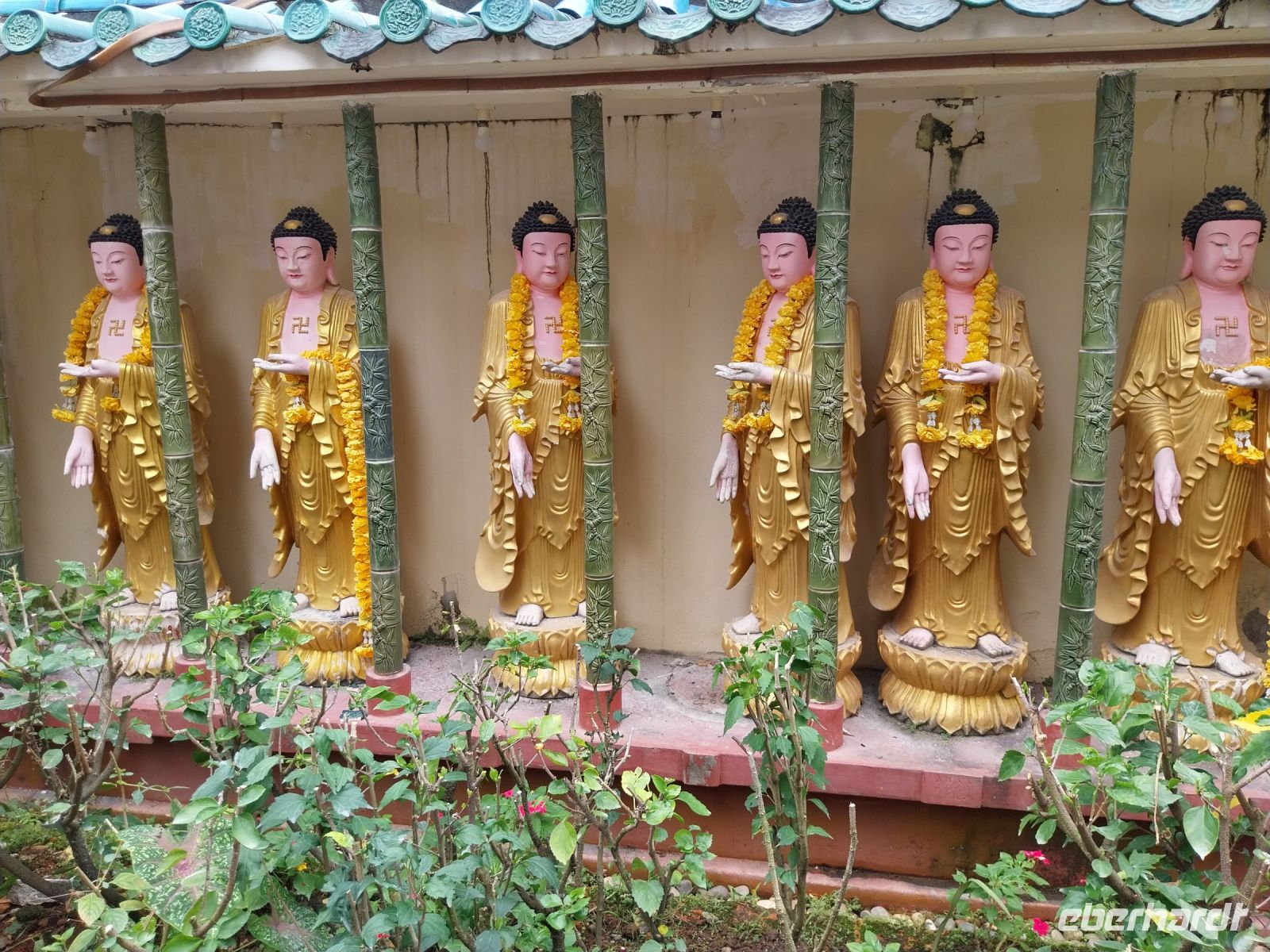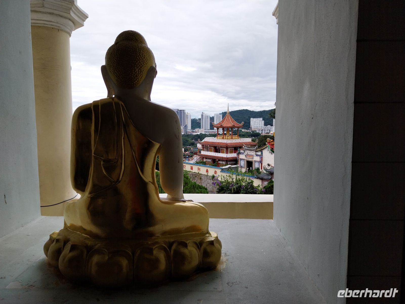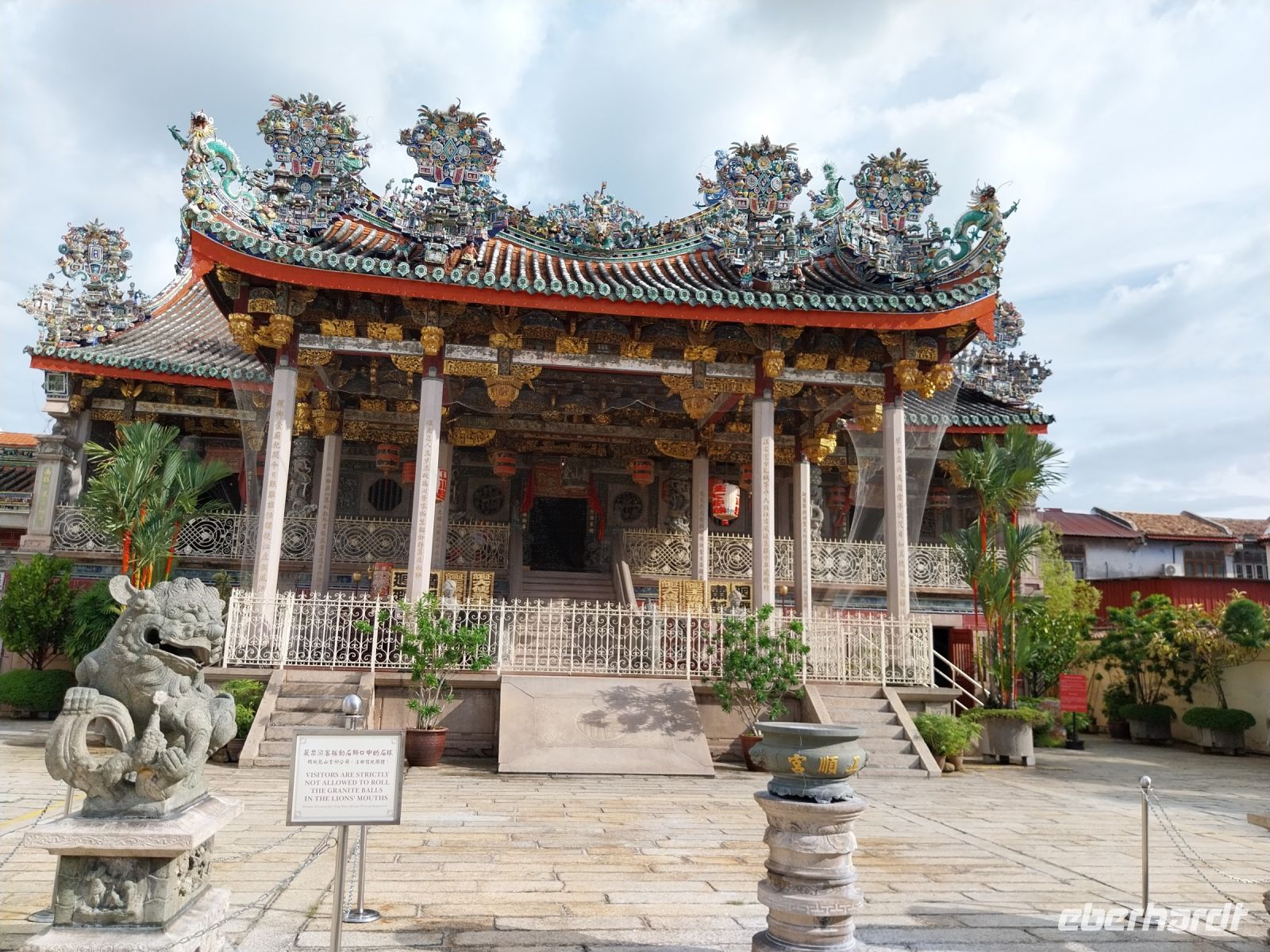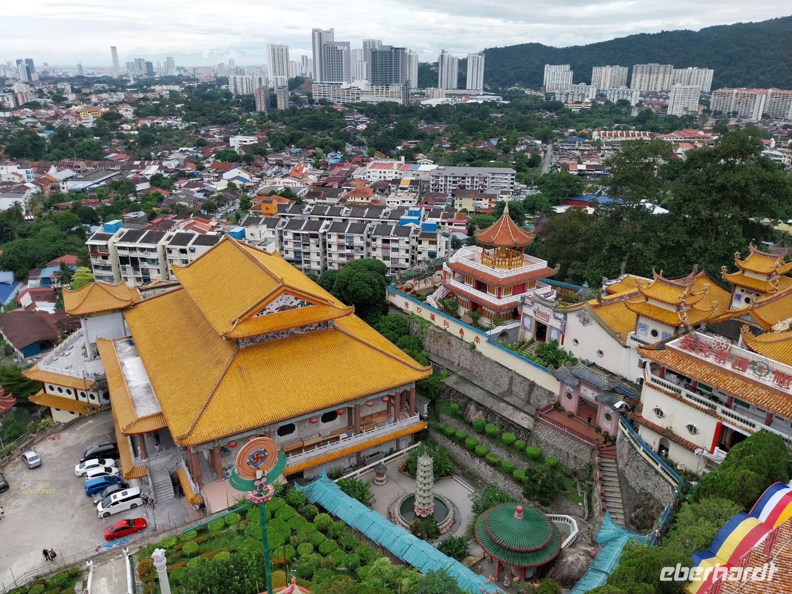 Anschließend fahren wir zum Kek Lok Si-Tempel. Eines der größten Tempel seiner Art in ganz Südostasien. Wir besichtigen die verschiedenen Ebenen und staunen über die Steinmetzarbeiten und die vielen goldenen Buddhas. Da die zweite Bergbahn jedoch defekt ist, herrscht ein wenig Chaos. Per Shuttlebus erreichen wir letztlich trotzdem den obersten Teil und sehen die Göttin der Barmherzigkeit Quan Yin.